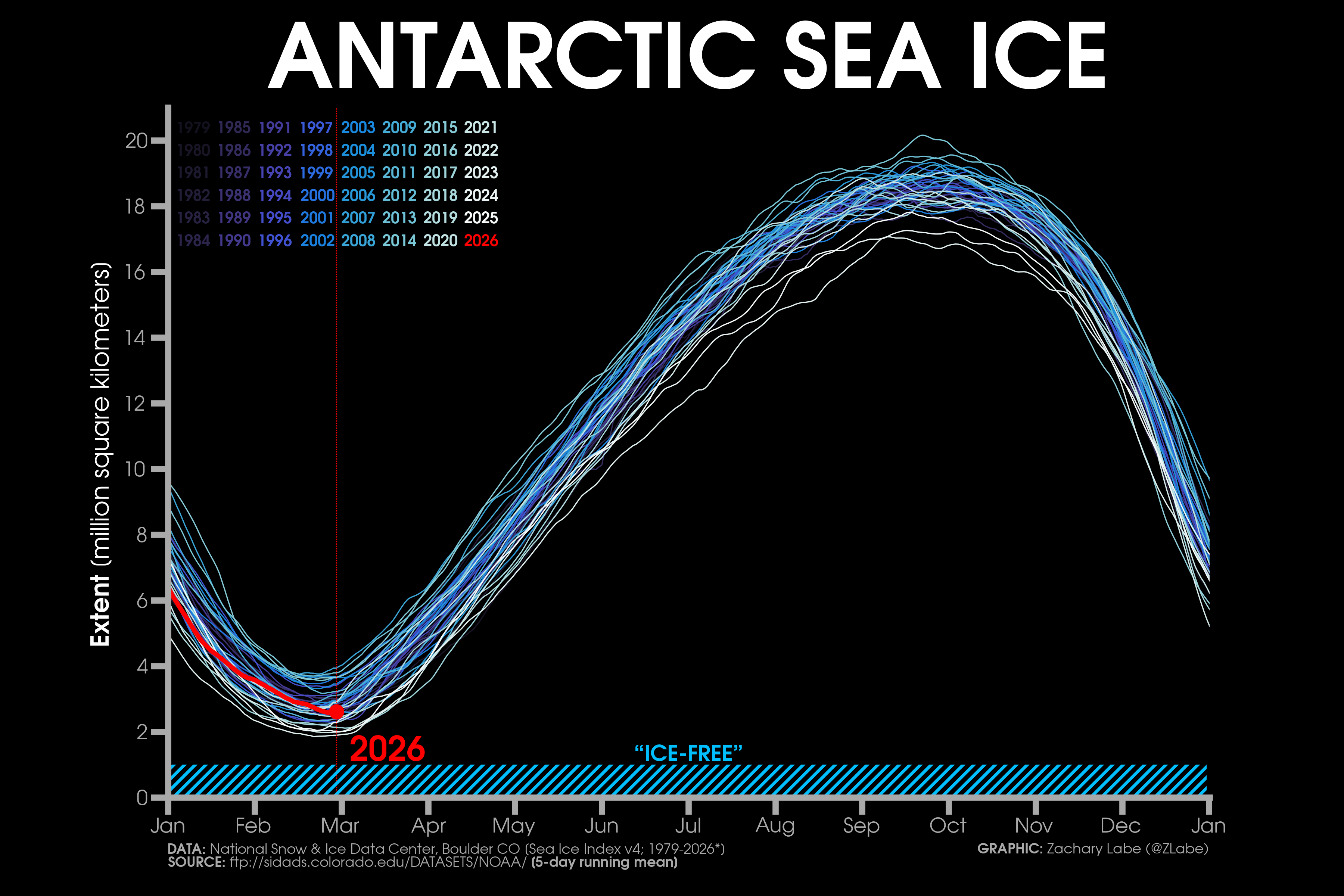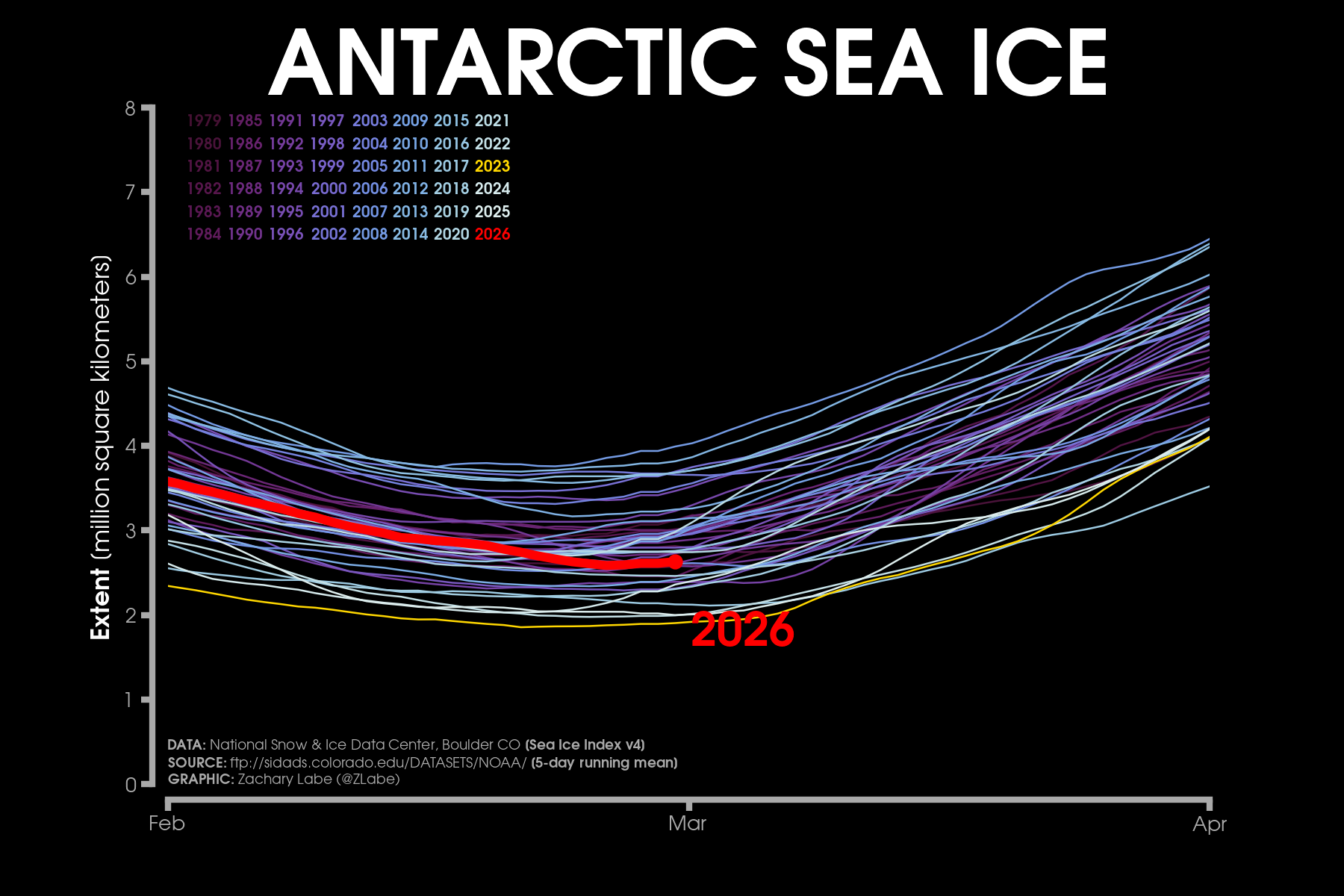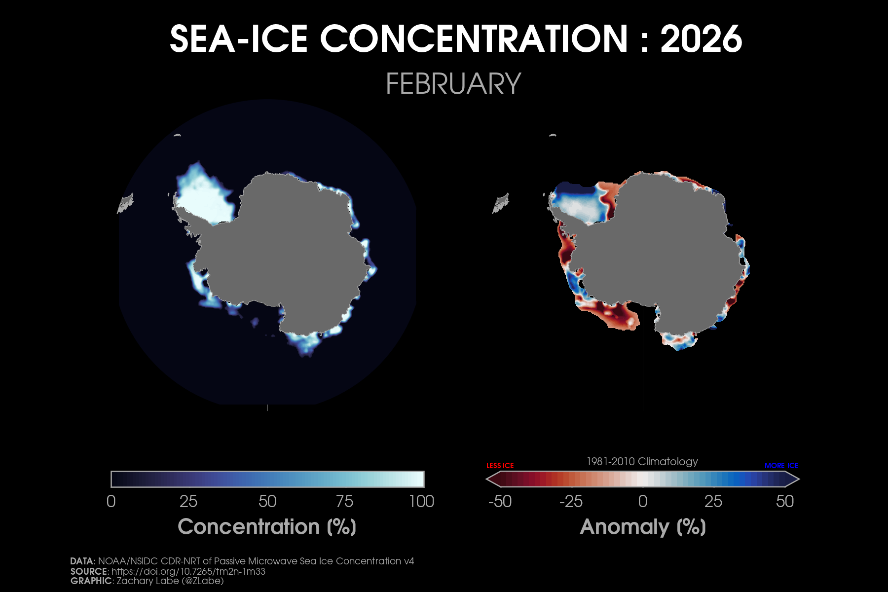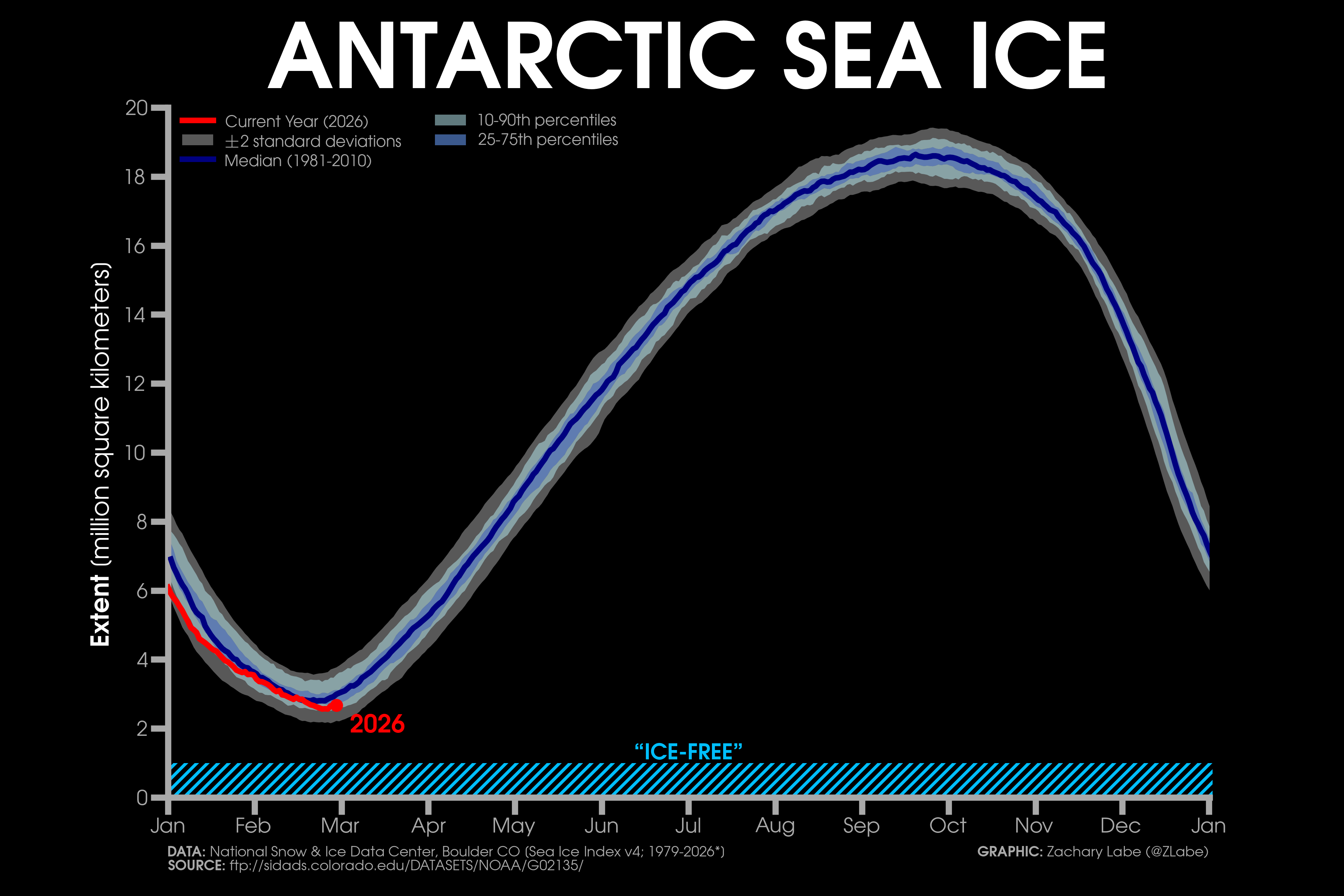 Current Antarctic sea ice extent (NSIDC, DMSP SSM/I-SSMIS F-18 and JAXA AMSR2) in addition to climatology (blue, 1981-2010) and 2 standard deviations from the mean (updated 3/2/2026)Monthly averaged Antarctic sea-ice concentration for February 2026 (left) and its anomalies relative to 1981-2010 (right). Data from NRT NOAA/NSIDC CDR of Passive Microwave Sea Ice Concentration v4 (https://doi.org/10.7265/tm2n-1m33); ice concentration updated with up to a 1-month lag. Graphic created on 3/2/2026.[Special (temporary) graphic to monitor the ongoing record low] Antarctic sea ice extent 3/2/2026).[Special (temporary) graphic to monitor the ongoing record low] Antarctic sea ice extent for each year from 1979 to 2026 (satellite-era; NSIDC, DMSP SSM/I-SSMIS and JAXA AMSR2). 2024 is highlighted with a yellow line. 2026 is shown using a red line (updated 3/2/2026).Antarctic sea ice extent anomalies for each year from 1979 to 2026 (satellite-era; NSIDC, DMSP SSM/I-SSMIS and JAXA AMSR2). Anomalies are calculated using a 5-day running mean from a climatological baseline of 1981-2010. 2023 is shown with a yellow line. 2026 is shown using a red line (updated 3/2/2026).Antarctic sea ice extent anomalies stretching from January 1979 to present day (satellite-era; NSIDC, DMSP SSM/I-SSMIS and JAXA AMSR2). Anomalies are calculated using a 5-day running mean from a climatological baseline of 1981-2010 (updated 3/2/2026).Current regional Antarctic sea ice extents (NSIDC Sea Ice Index v4 : DMSP SSM/I-SSMIS F-18 and JAXA AMSR2) for 2026 (red line) and for each year through the satellite era (blue [1979] to white [2025] lines). A map of the regions can be found at https://nsidc.org/arcticseaicenews/map-of-antarctica/. Graphic updated 3/2/2026.Daily rank for regional Antarctic sea ice extents (NSIDC Sea Ice Index v4 : DMSP SSM/I-SSMIS F-18 and JAXA AMSR2) over the satellite-era (1979-2026). A map of the regions can be found at https://nsidc.org/arcticseaicenews/map-of-antarctica/. A rank of “1” is the lowest on record for a given region. A rank of “48” is the highest sea-ice extent on record for a given region. Graphic is updated for the ranks on 3/2/2026.Current regional Antarctic sea ice extents (NSIDC Sea Ice Index v4; DMSP SSM/I-SSMIS F-18 and JAXA AMSR2) in addition to 2 standard deviations from the 1981-2010 mean (updated 3/2/2026).Current simulated (GIOMAS; Zhang and Rothrock, 2003) sea ice thickness and anomalies (1981-2010 baseline) updated for December 2025. For more information on this ice-ocean reanalysis dataset, see https://tc.copernicus.org/articles/16/1807/2022/.Latest GIOMAS model (Zhang and Rothrock, 2003) simulated sea ice volume (SIV) averaged for the Southern Hemisphere (Antarctic). Volume is averaged for each month from 1979 to 2025. Graphic updated through December 2025.Monthly Antarctic sea ice volume anomalies stretching from January 1979 to December 2025 (GIOMAS; Zhang and Rothrock, 2003). Anomalies are calculated from a climatological baseline of 1981-2010 (updated 1/18/2026).Current simulated (GIOMAS; Zhang and Rothrock, 2003) sea ice thickness averaged over each year from 1979 to 2025. Updated 1/18/2026.Since sea ice thickness observations are sparse, we utilize the GIOMAS model (Zhang and Rothrock, 2003) to visualize sea ice thickness averaged for each year from 1979 to 2025. For more information on this ice-ocean reanalysis dataset, see https://tc.copernicus.org/articles/16/1807/2022/. Updated 1/18/2026.