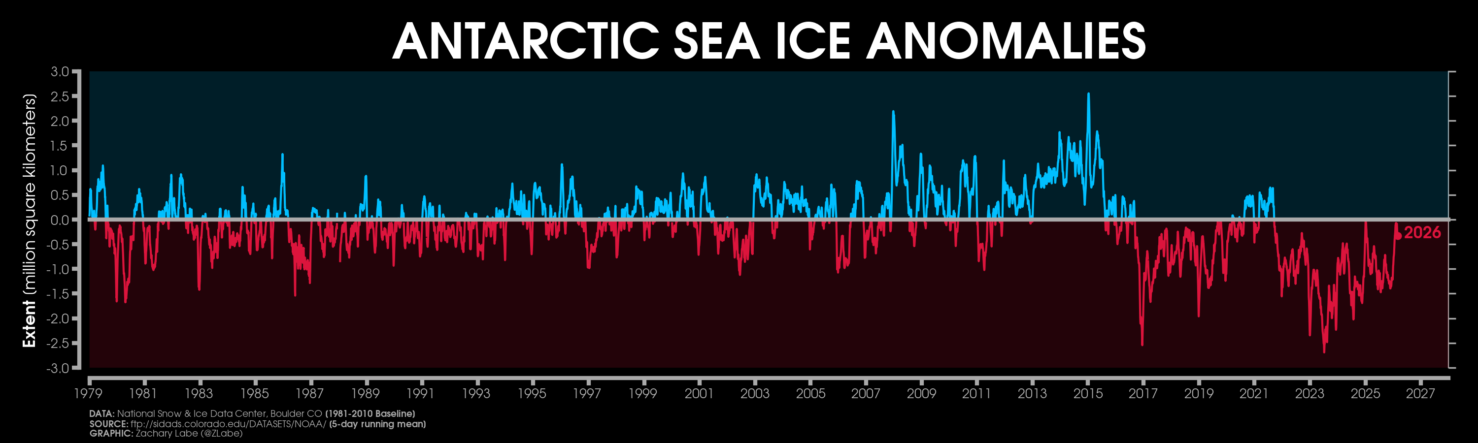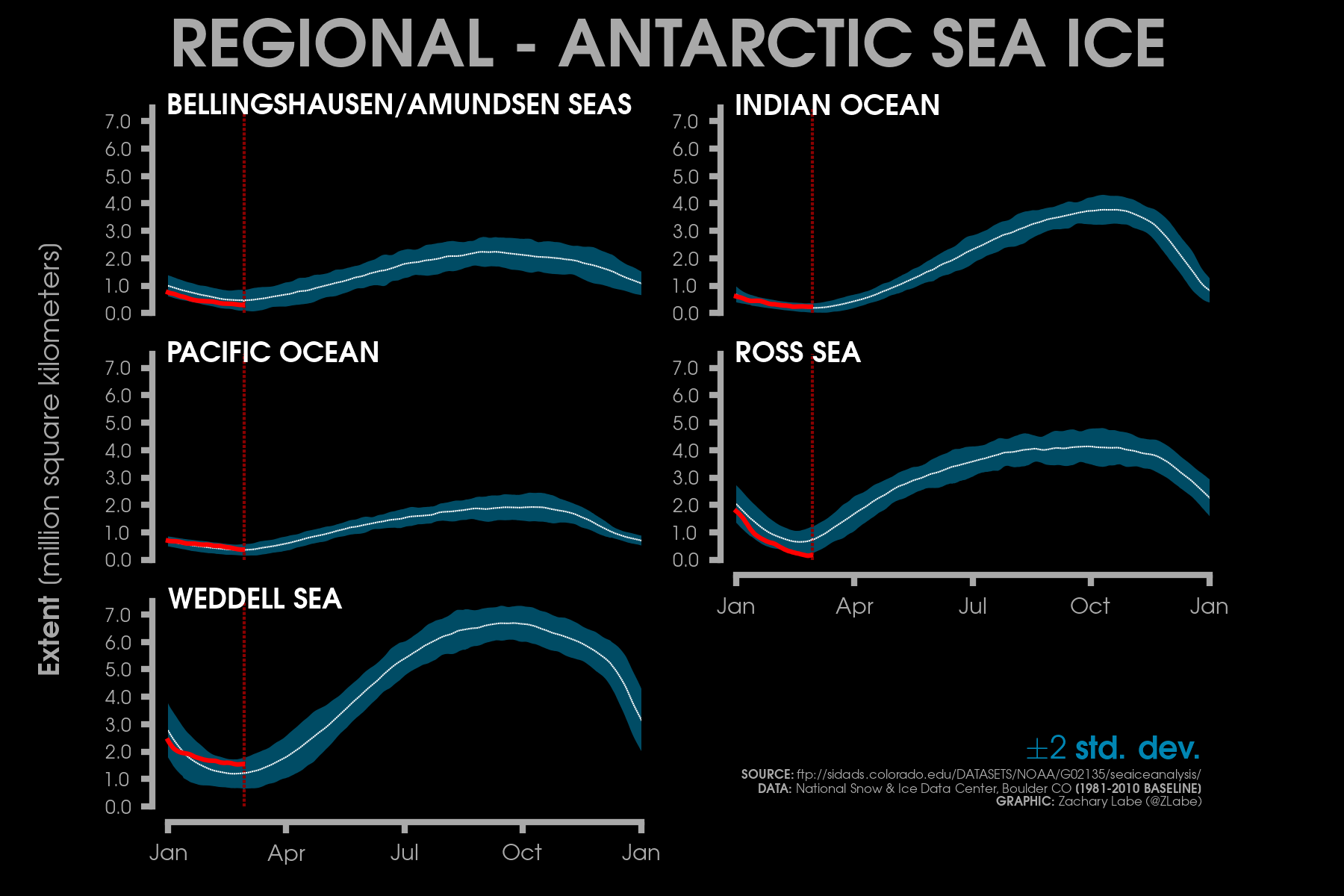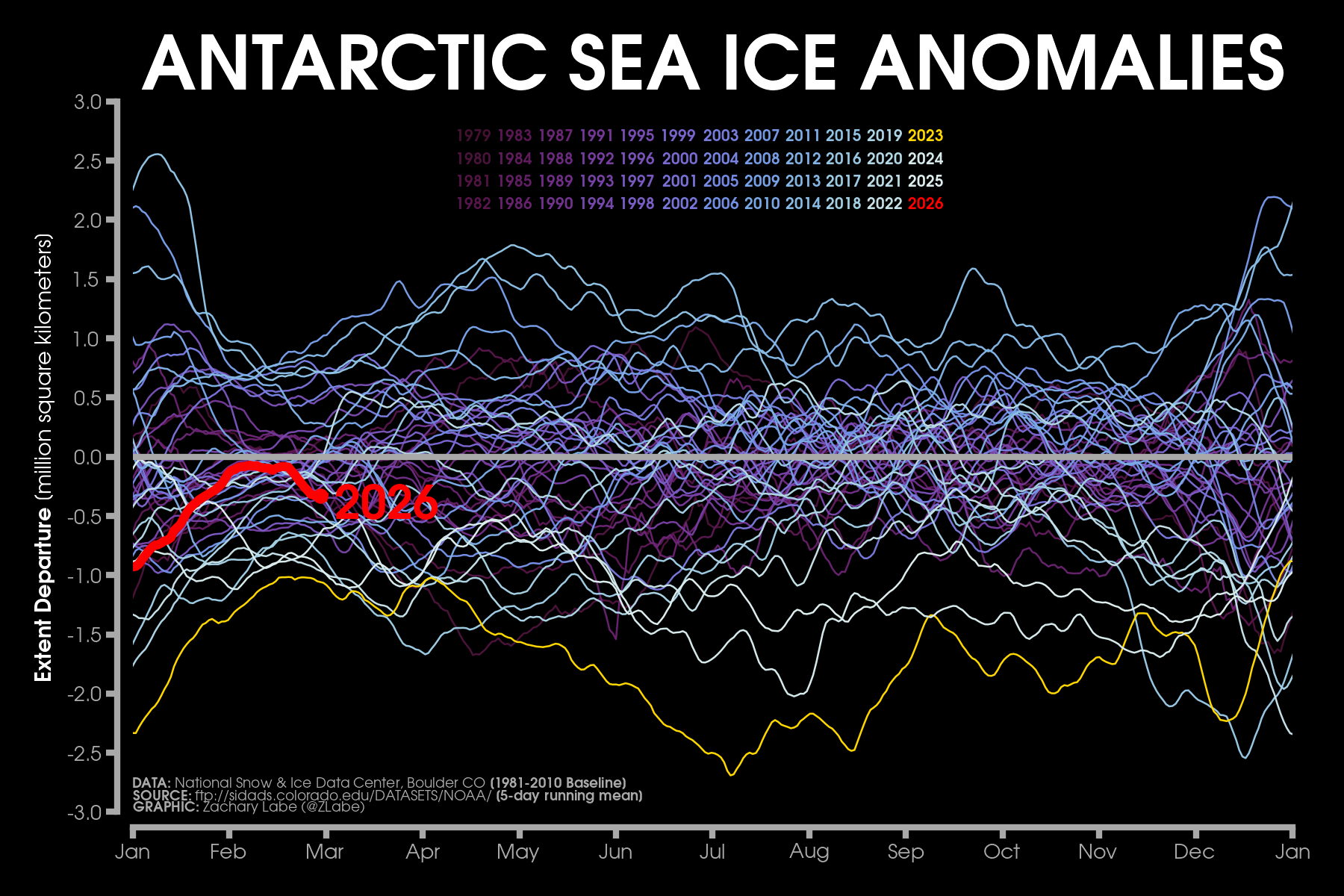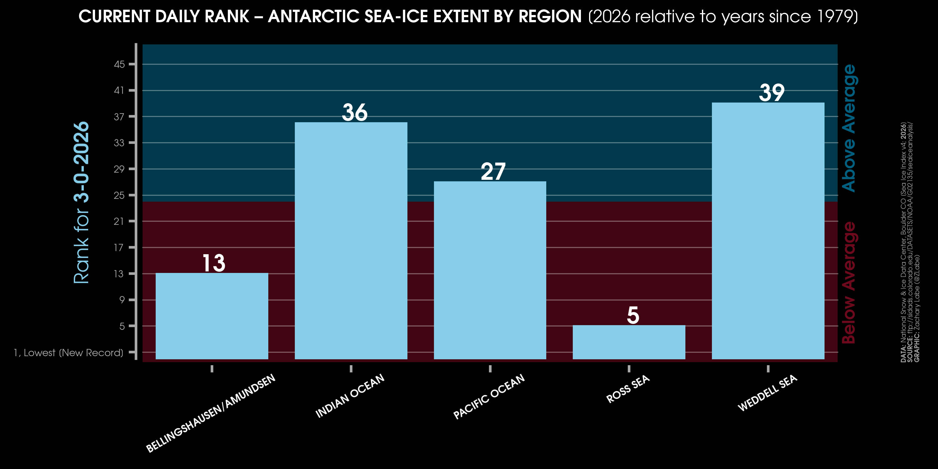 Current Antarctic sea ice extent (NSIDC, DMSP SSM/I-SSMIS F-18 and JAXA AMSR2) in addition to climatology (blue, 1981-2010) and 2 standard deviations from the mean (updated 3/2/2026)Monthly averaged Antarctic sea-ice concentration for February 2026 (left) and its anomalies relative to 1981-2010 (right). Data from NRT NOAA/NSIDC CDR of Passive Microwave Sea Ice Concentration v4 (https://doi.org/10.7265/tm2n-1m33); ice concentration updated with up to a 1-month lag. Graphic created on 3/2/2026.[Special (temporary) graphic to monitor the ongoing record low] Antarctic sea ice extent 3/2/2026).[Special (temporary) graphic to monitor the ongoing record low] Antarctic sea ice extent for each year from 1979 to 2026 (satellite-era; NSIDC, DMSP SSM/I-SSMIS and JAXA AMSR2). 2024 is highlighted with a yellow line. 2026 is shown using a red line (updated 3/2/2026).Antarctic sea ice extent anomalies for each year from 1979 to 2026 (satellite-era; NSIDC, DMSP SSM/I-SSMIS and JAXA AMSR2). Anomalies are calculated using a 5-day running mean from a climatological baseline of 1981-2010. 2023 is shown with a yellow line. 2026 is shown using a red line (updated 3/2/2026).Antarctic sea ice extent anomalies stretching from January 1979 to present day (satellite-era; NSIDC, DMSP SSM/I-SSMIS and JAXA AMSR2). Anomalies are calculated using a 5-day running mean from a climatological baseline of 1981-2010 (updated 3/2/2026).Current regional Antarctic sea ice extents (NSIDC Sea Ice Index v4 : DMSP SSM/I-SSMIS F-18 and JAXA AMSR2) for 2026 (red line) and for each year through the satellite era (blue [1979] to white [2025] lines). A map of the regions can be found at https://nsidc.org/arcticseaicenews/map-of-antarctica/. Graphic updated 3/2/2026.Daily rank for regional Antarctic sea ice extents (NSIDC Sea Ice Index v4 : DMSP SSM/I-SSMIS F-18 and JAXA AMSR2) over the satellite-era (1979-2026). A map of the regions can be found at https://nsidc.org/arcticseaicenews/map-of-antarctica/. A rank of “1” is the lowest on record for a given region. A rank of “48” is the highest sea-ice extent on record for a given region. Graphic is updated for the ranks on 3/2/2026.Current regional Antarctic sea ice extents (NSIDC Sea Ice Index v4; DMSP SSM/I-SSMIS F-18 and JAXA AMSR2) in addition to 2 standard deviations from the 1981-2010 mean (updated 3/2/2026).Current simulated (GIOMAS; Zhang and Rothrock, 2003) sea ice thickness and anomalies (1981-2010 baseline) updated for December 2025. For more information on this ice-ocean reanalysis dataset, see https://tc.copernicus.org/articles/16/1807/2022/.Latest GIOMAS model (Zhang and Rothrock, 2003) simulated sea ice volume (SIV) averaged for the Southern Hemisphere (Antarctic). Volume is averaged for each month from 1979 to 2025. Graphic updated through December 2025.Monthly Antarctic sea ice volume anomalies stretching from January 1979 to December 2025 (GIOMAS; Zhang and Rothrock, 2003). Anomalies are calculated from a climatological baseline of 1981-2010 (updated 1/18/2026).Current simulated (GIOMAS; Zhang and Rothrock, 2003) sea ice thickness averaged over each year from 1979 to 2025. Updated 1/18/2026.Since sea ice thickness observations are sparse, we utilize the GIOMAS model (Zhang and Rothrock, 2003) to visualize sea ice thickness averaged for each year from 1979 to 2025. For more information on this ice-ocean reanalysis dataset, see https://tc.copernicus.org/articles/16/1807/2022/. Updated 1/18/2026.