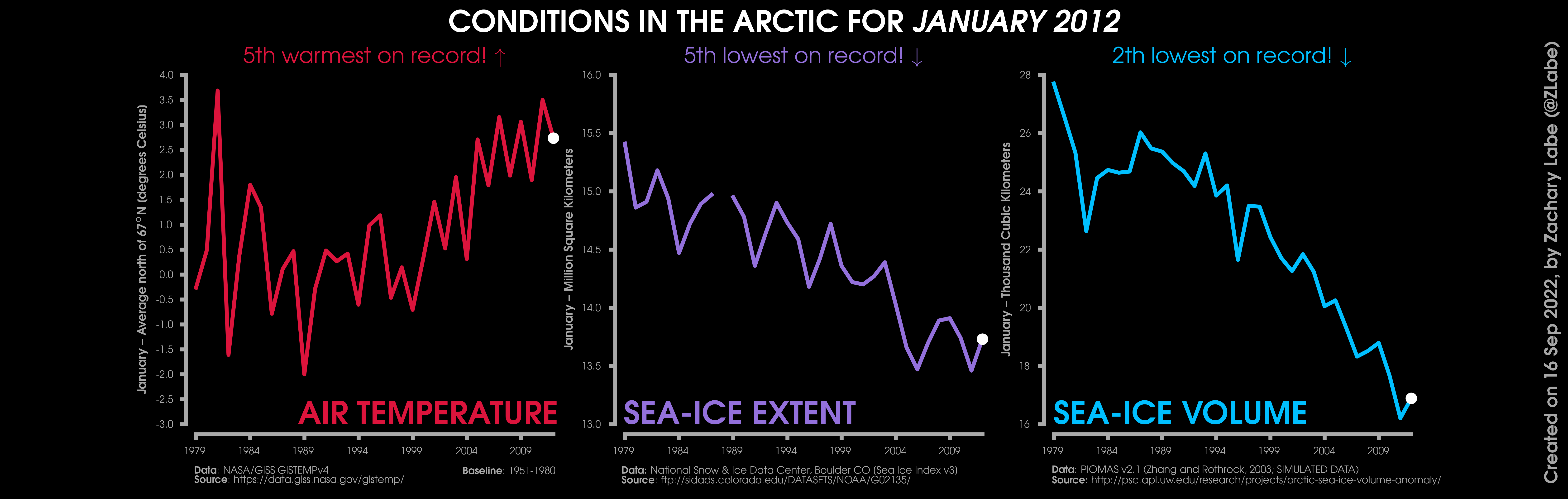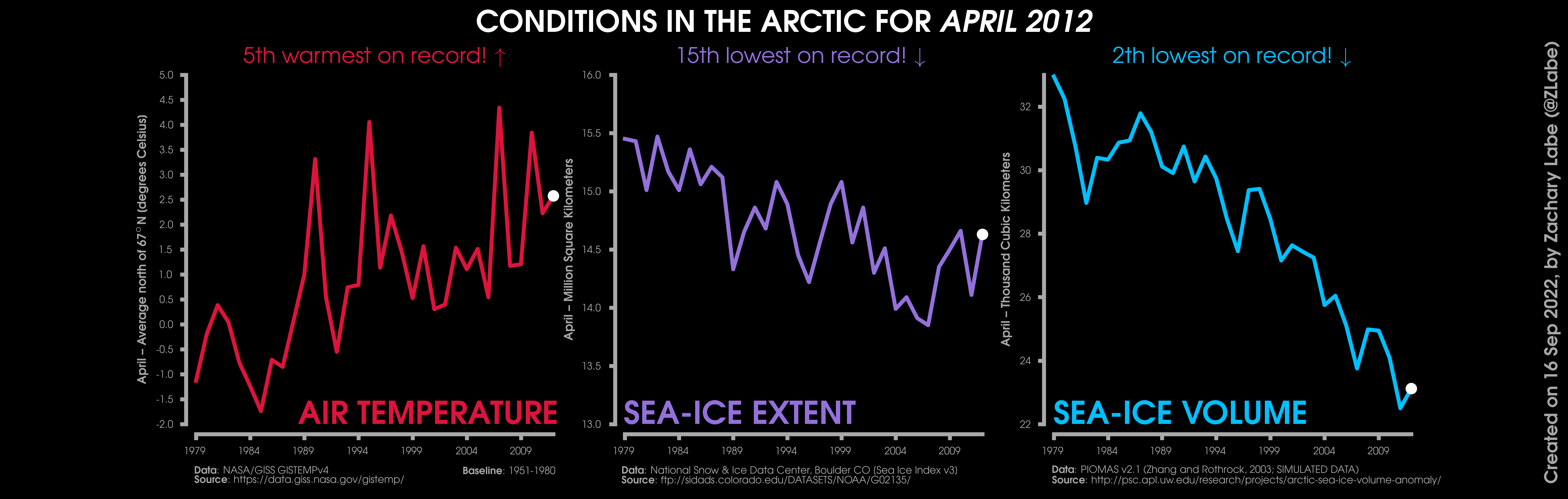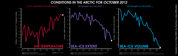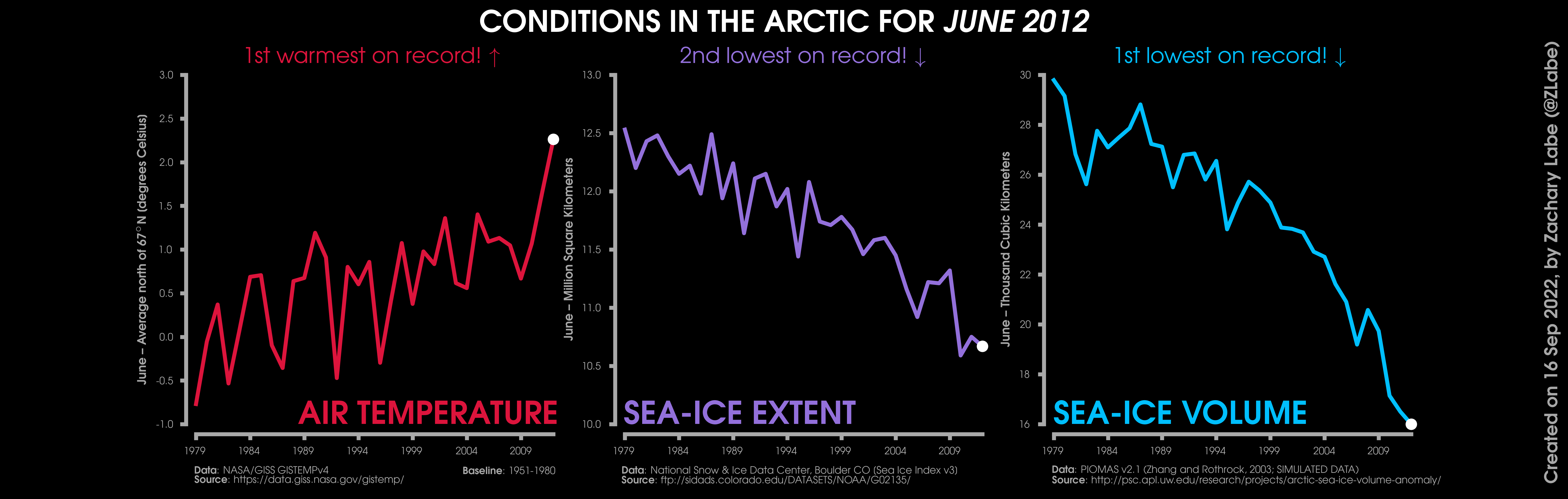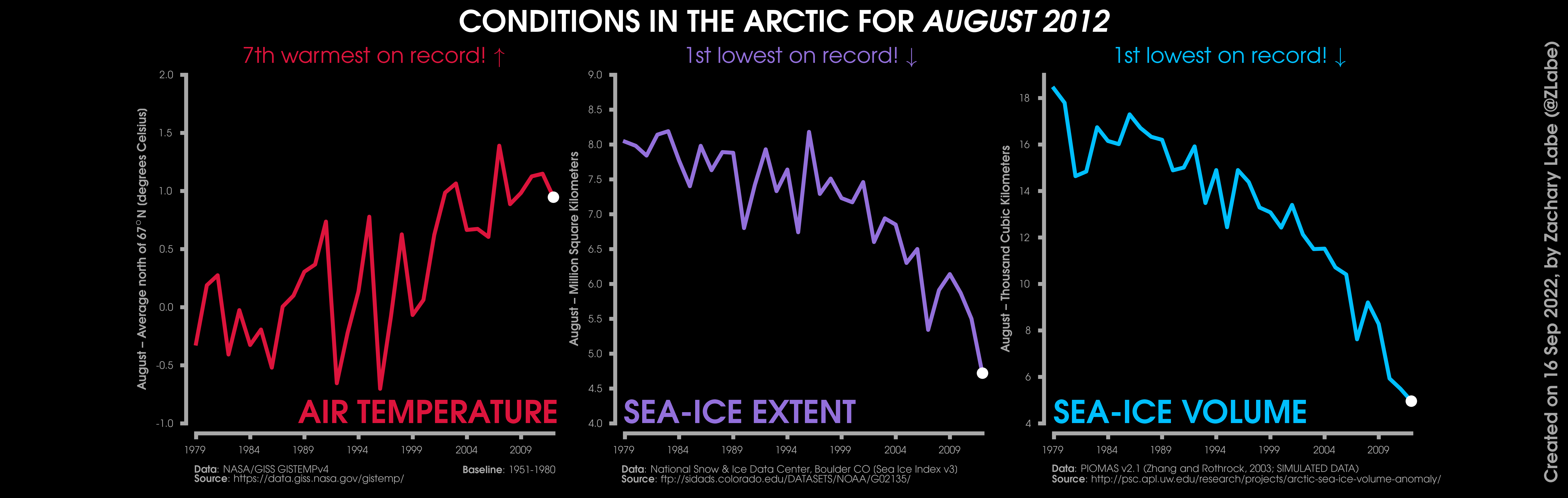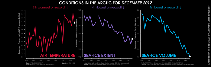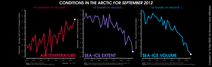 Changes in mean surface air temperature anomalies (GISTEMPv4; 1951-1980 baseline), mean Arctic sea ice extent (NSIDC; Sea Ice Index v3), and mean Arctic sea ice volume (PIOMAS v2.1; Zhang and Rothrock, 2003) over the satellite era. Updated 9/16/2022.
