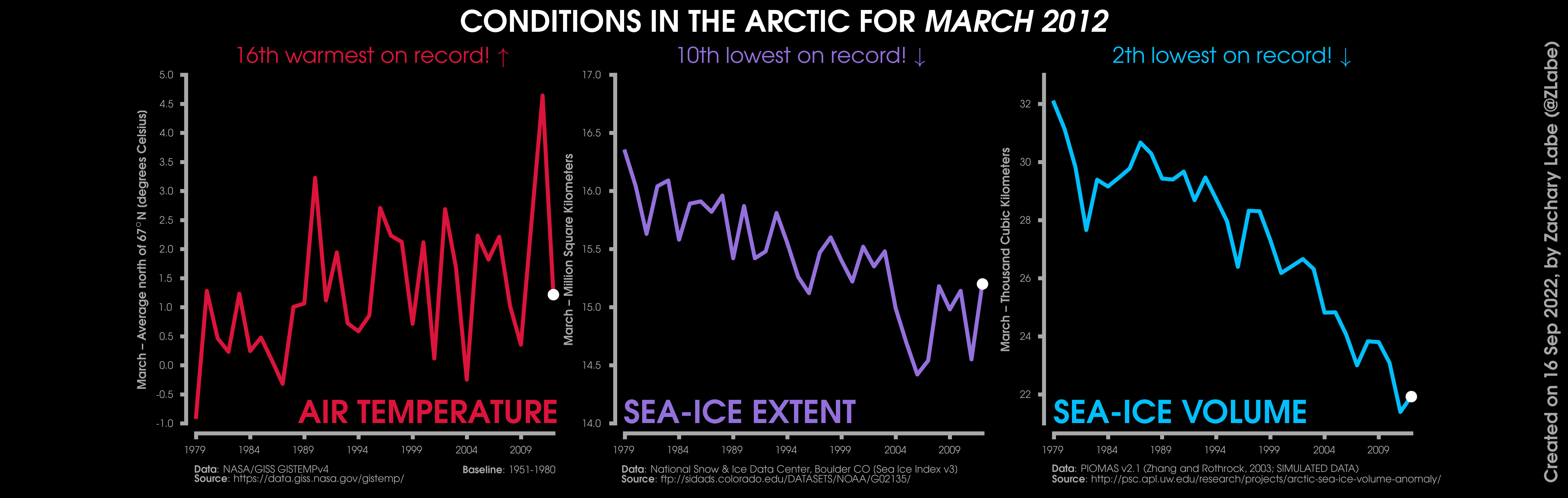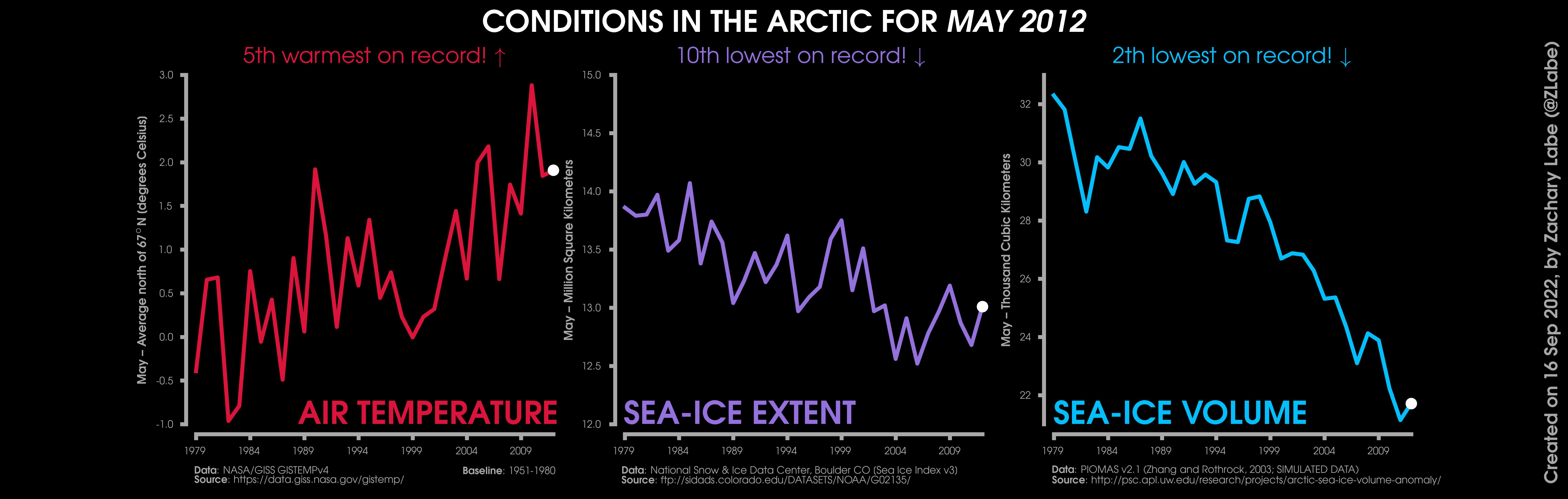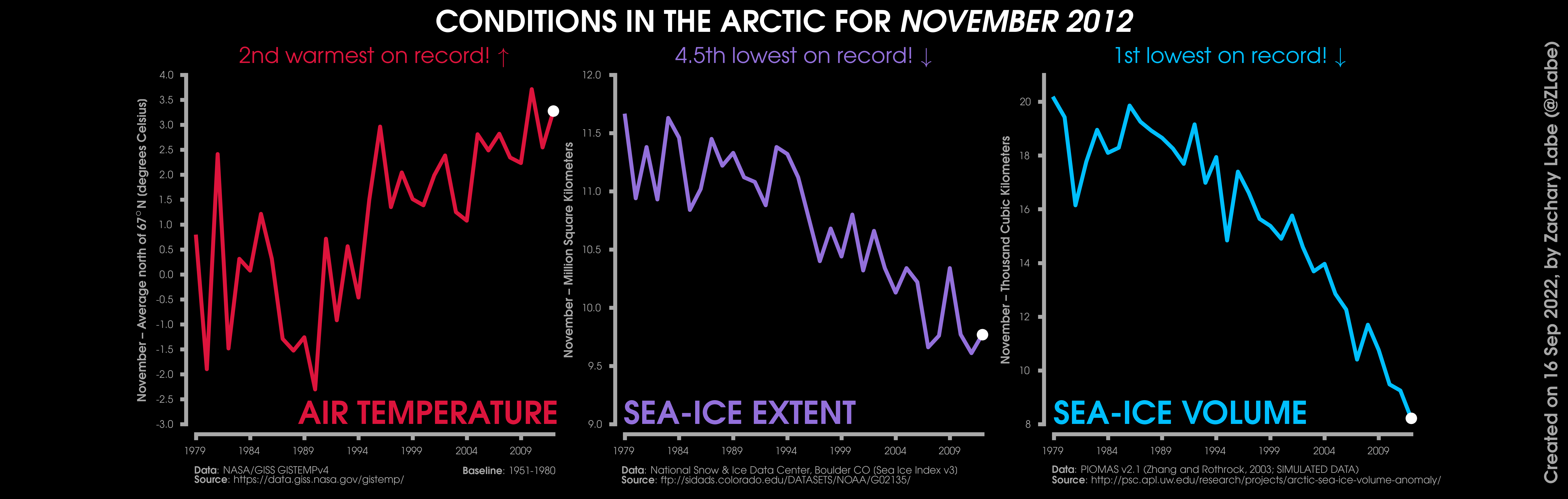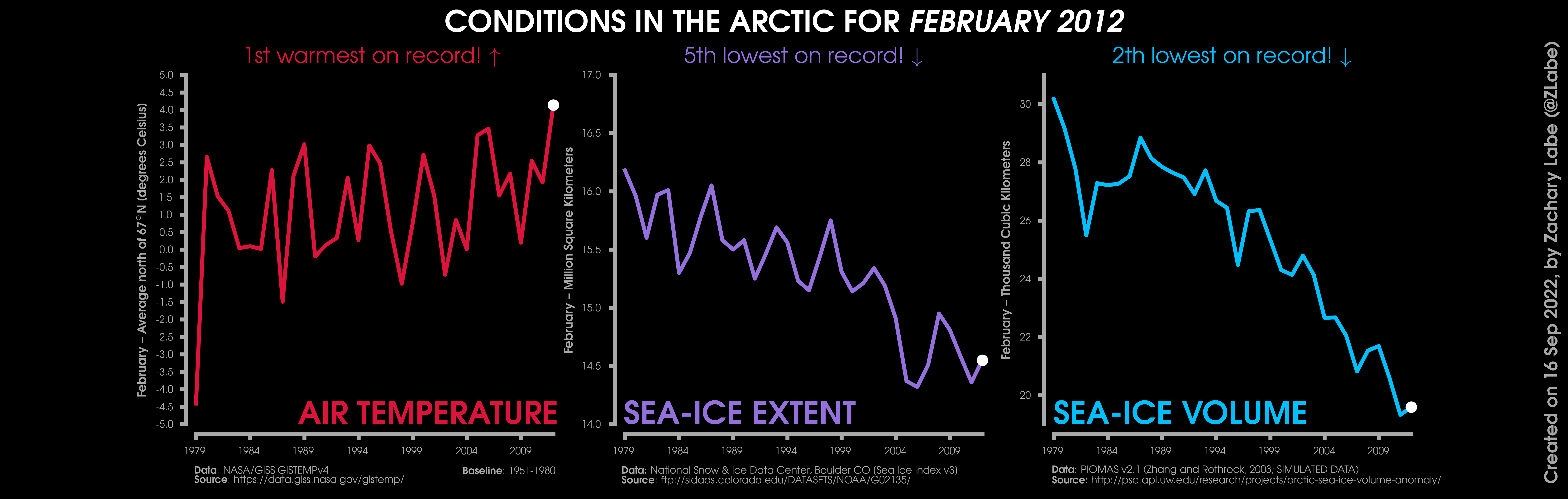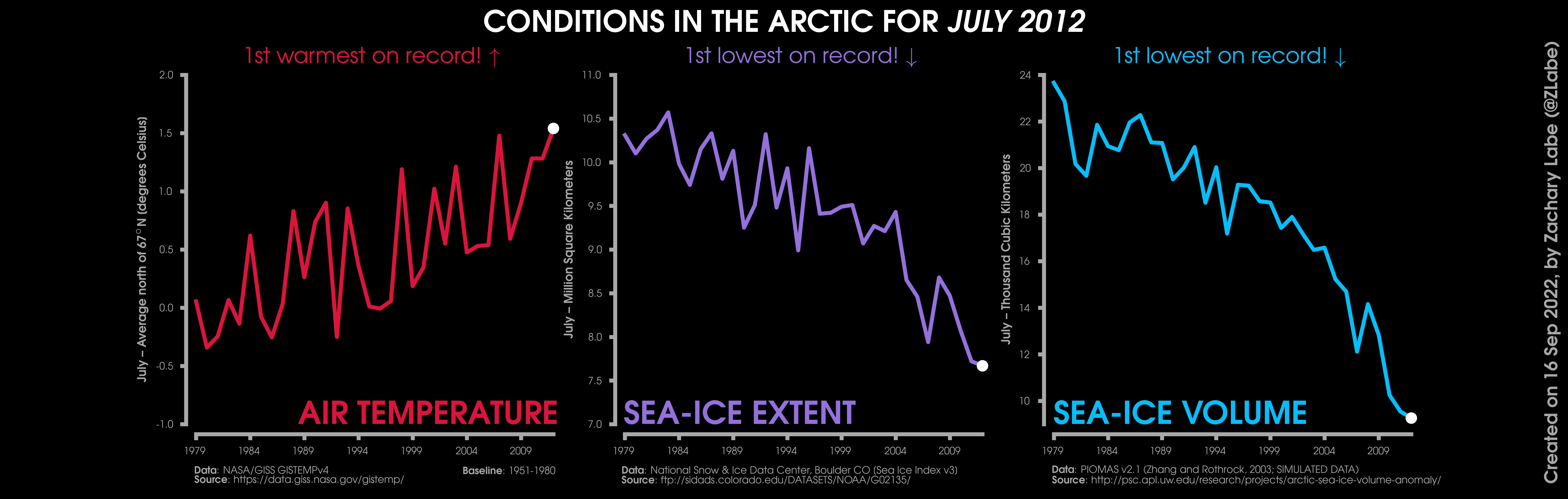 Changes in mean surface air temperature anomalies (GISTEMPv4; 1951-1980 baseline), mean Arctic sea ice extent (NSIDC; Sea Ice Index v3), and mean Arctic sea ice volume (PIOMAS v2.1; Zhang and Rothrock, 2003) over the satellite era. Updated 9/16/2022.