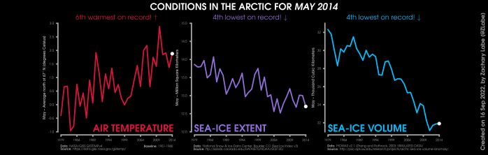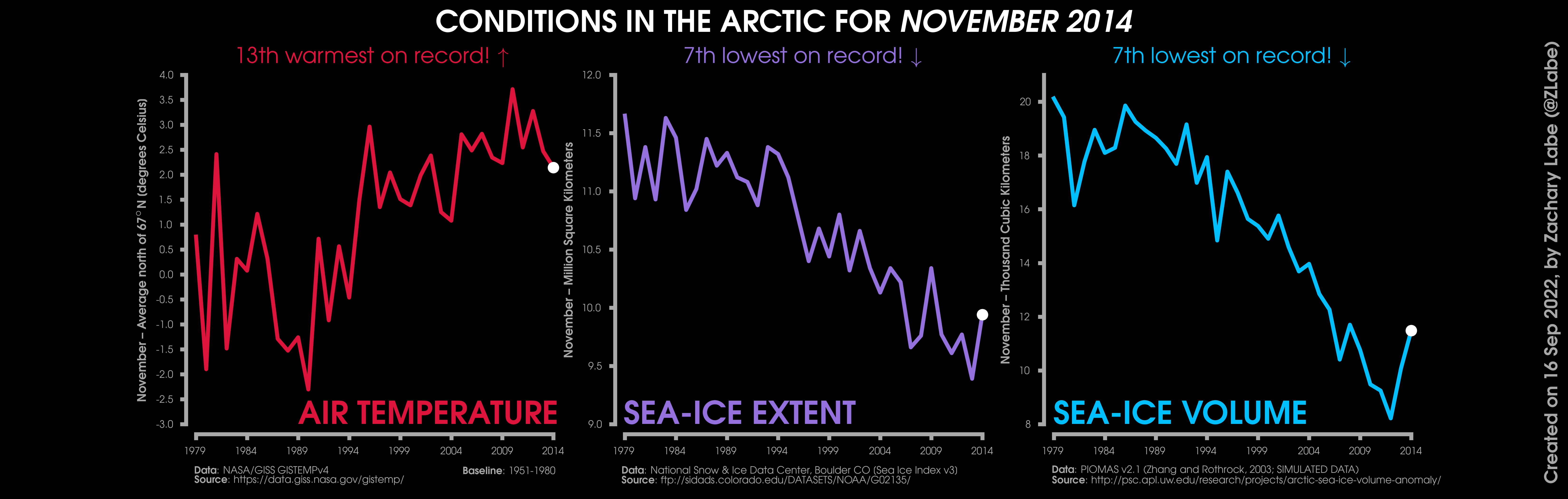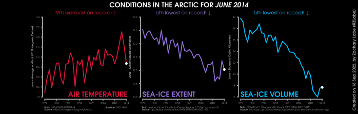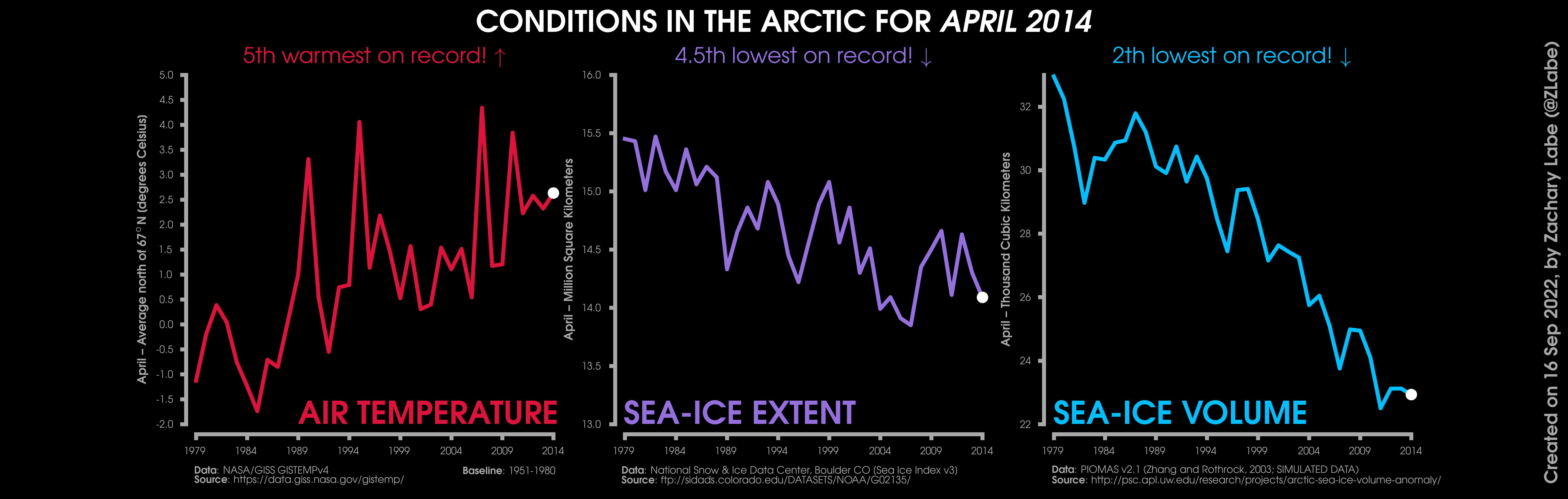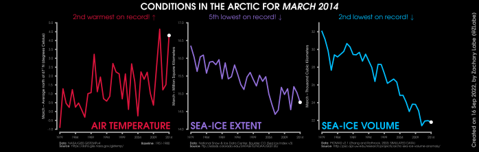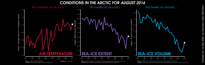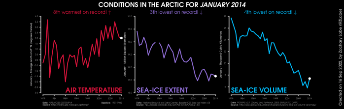 Changes in mean surface air temperature anomalies (GISTEMPv4; 1951-1980 baseline), mean Arctic sea ice extent (NSIDC; Sea Ice Index v3), and mean Arctic sea ice volume (PIOMAS v2.1; Zhang and Rothrock, 2003) over the satellite era. Updated 9/16/2022.