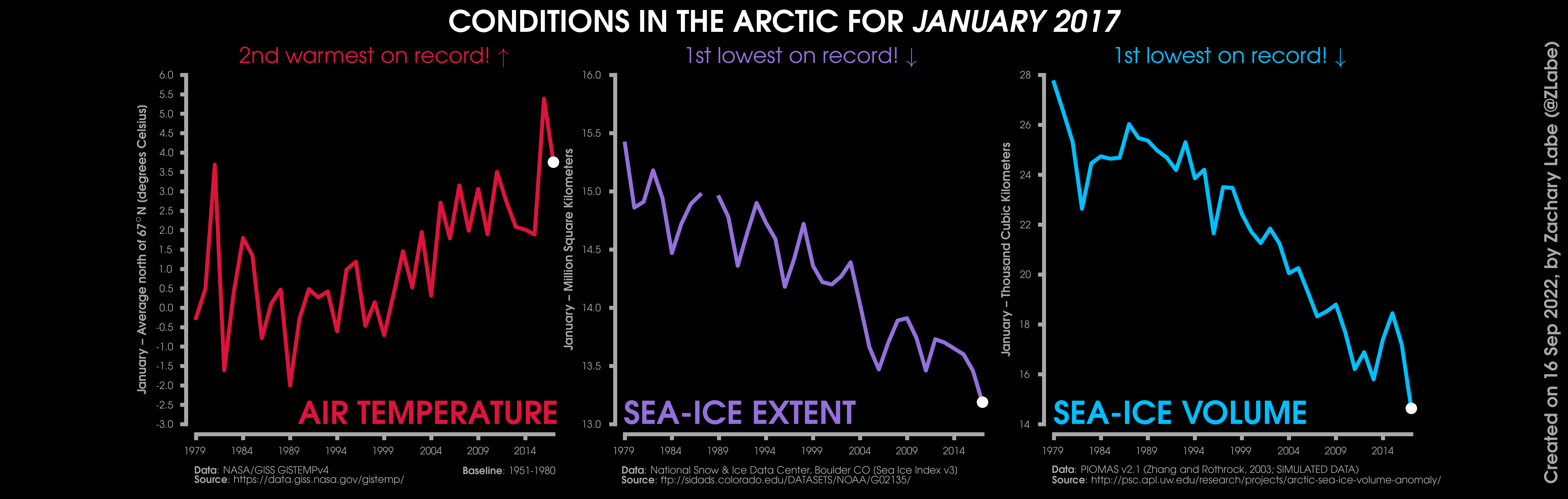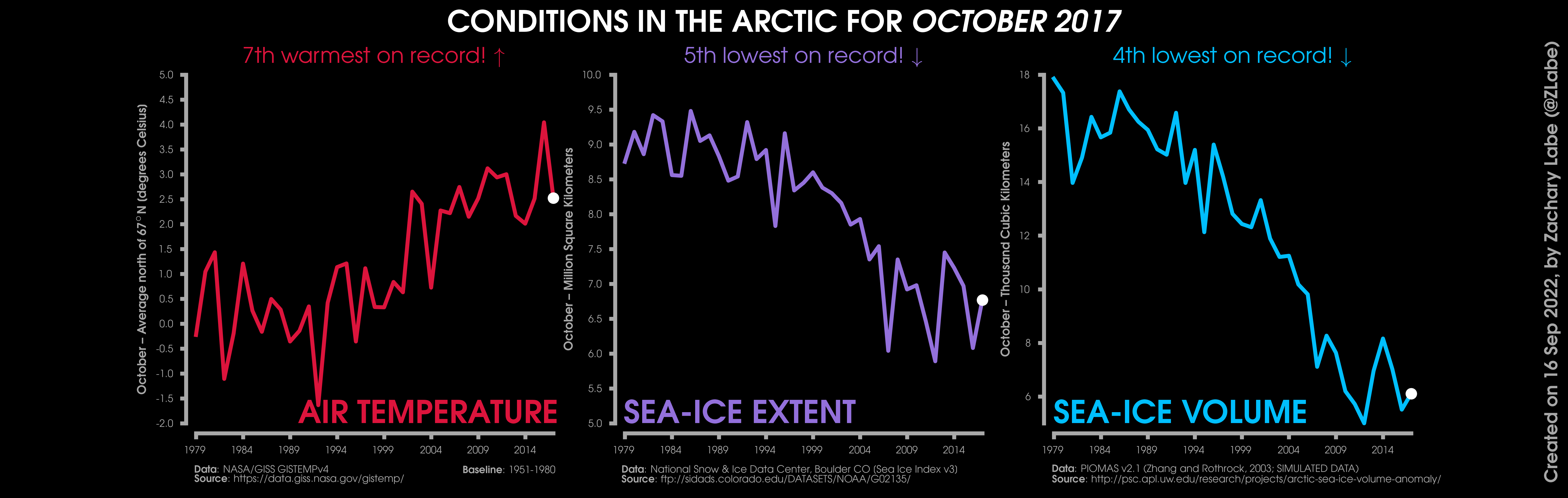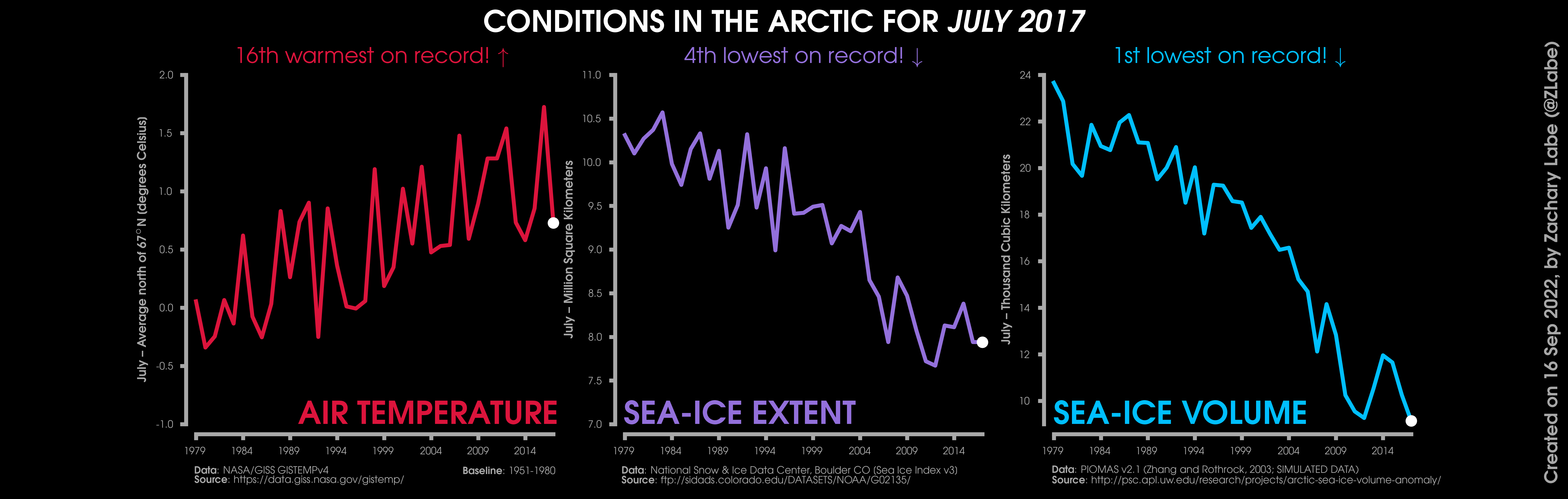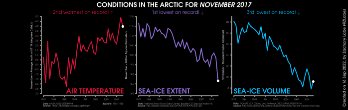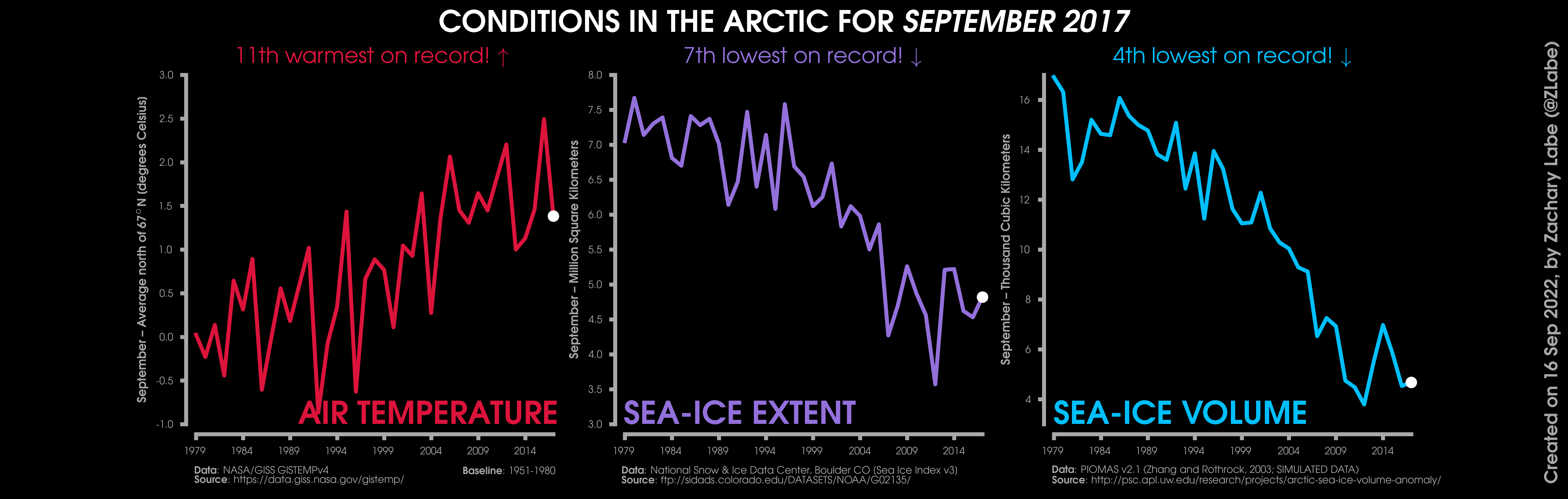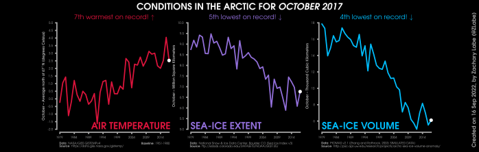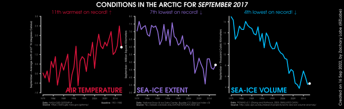 Changes in mean surface air temperature anomalies (GISTEMPv4; 1951-1980 baseline), mean Arctic sea ice extent (NSIDC; Sea Ice Index v3), and mean Arctic sea ice volume (PIOMAS v2.1; Zhang and Rothrock, 2003) over the satellite era. Updated 9/16/2022.