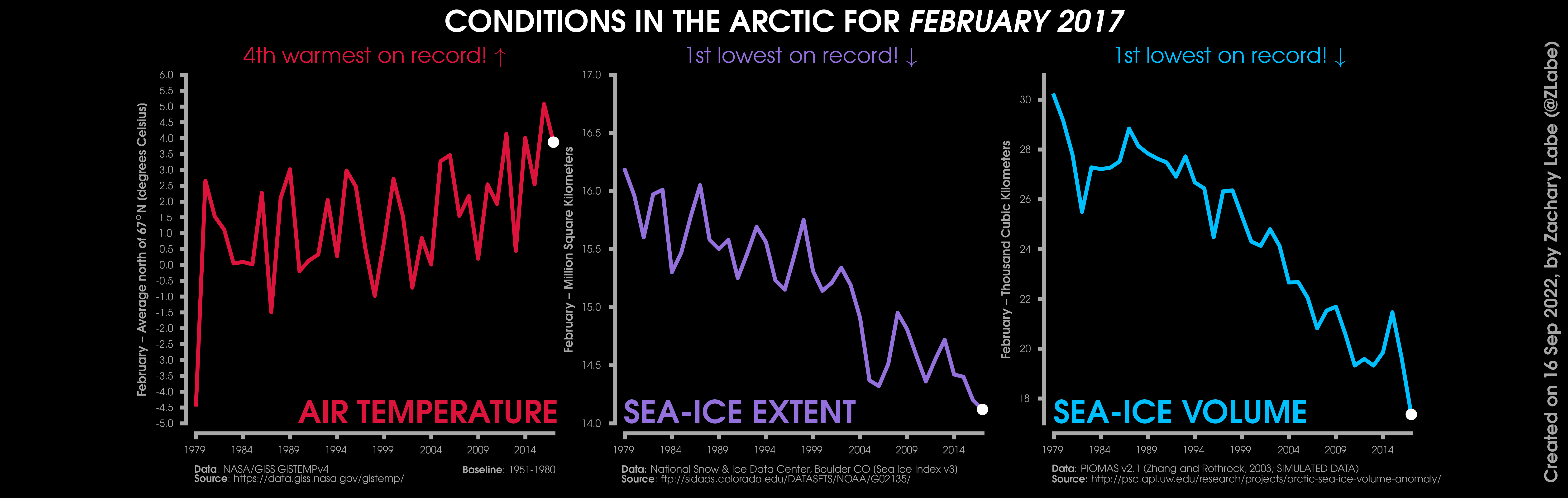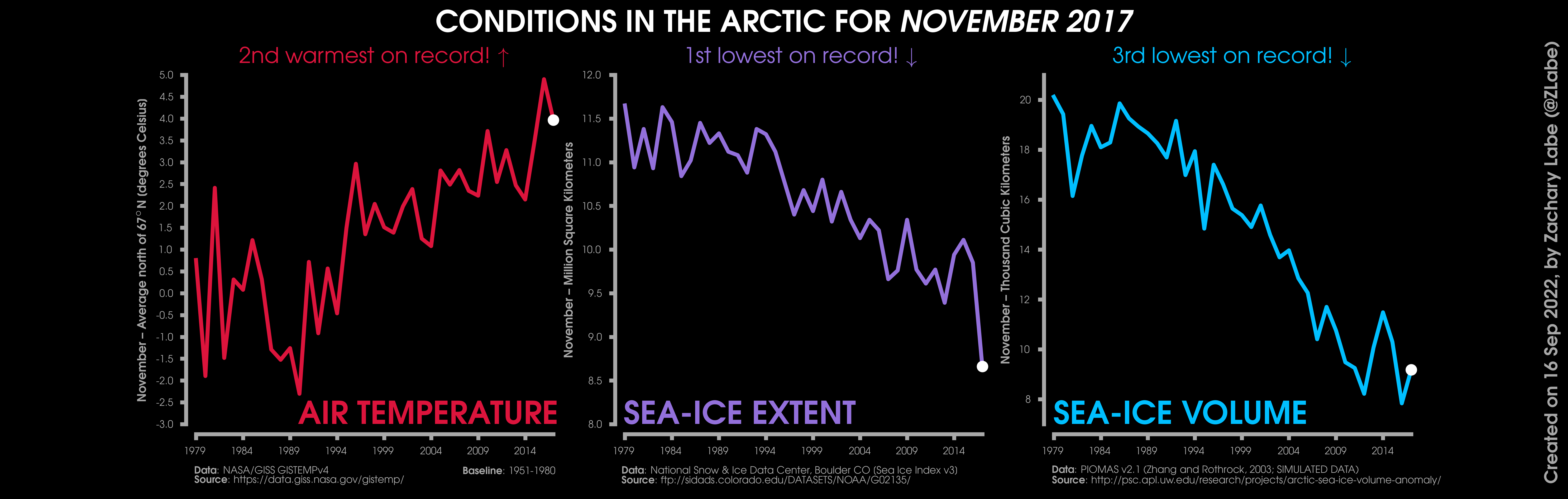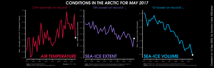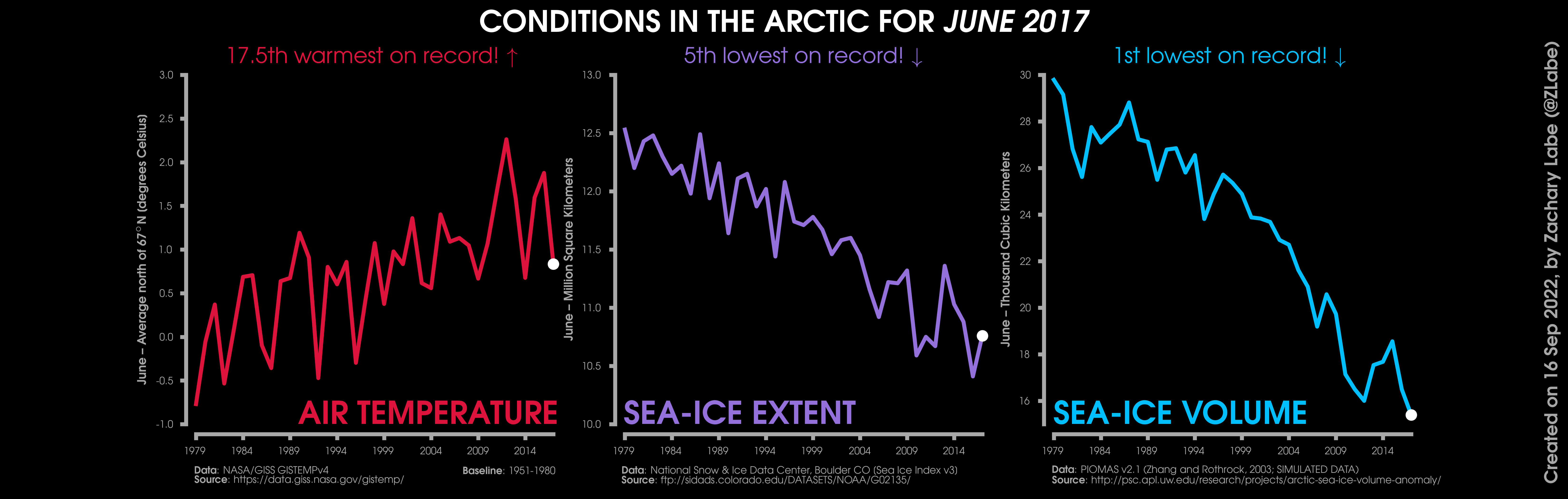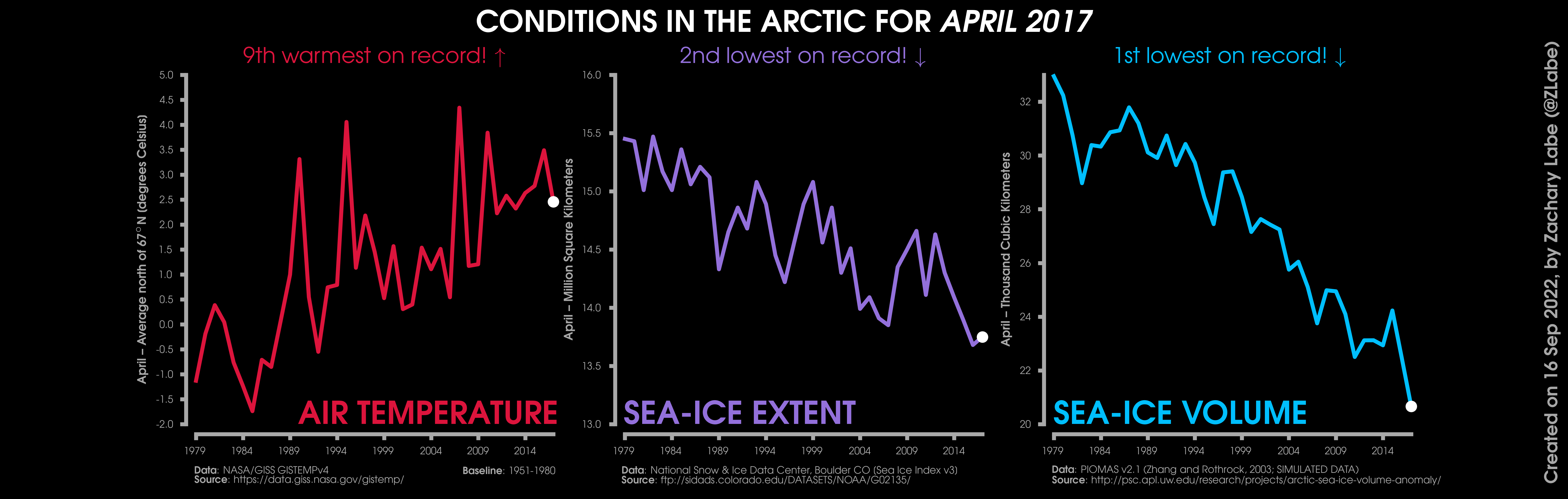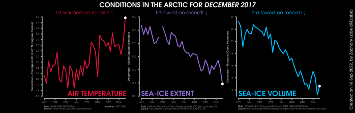 Changes in mean surface air temperature anomalies (GISTEMPv4; 1951-1980 baseline), mean Arctic sea ice extent (NSIDC; Sea Ice Index v3), and mean Arctic sea ice volume (PIOMAS v2.1; Zhang and Rothrock, 2003) over the satellite era. Updated 9/16/2022.