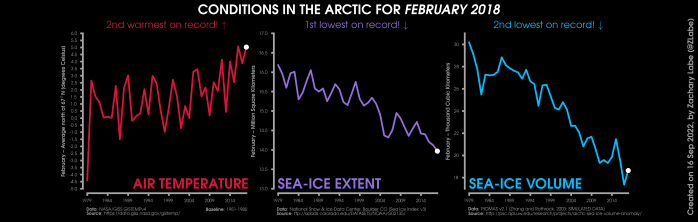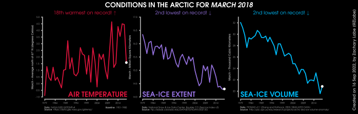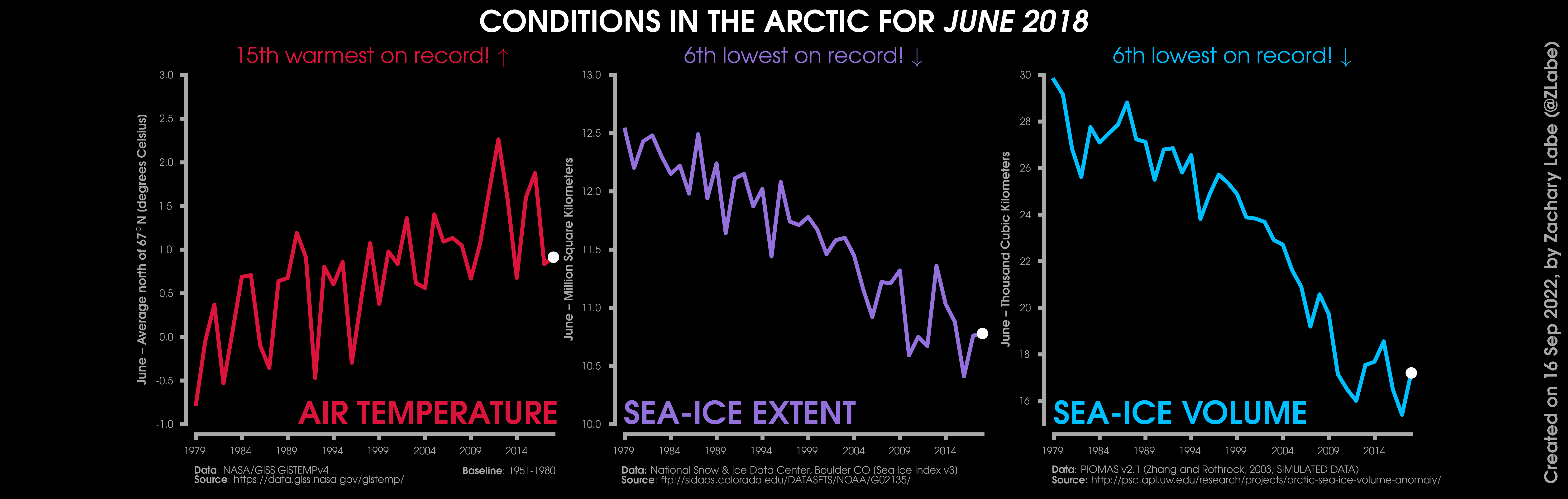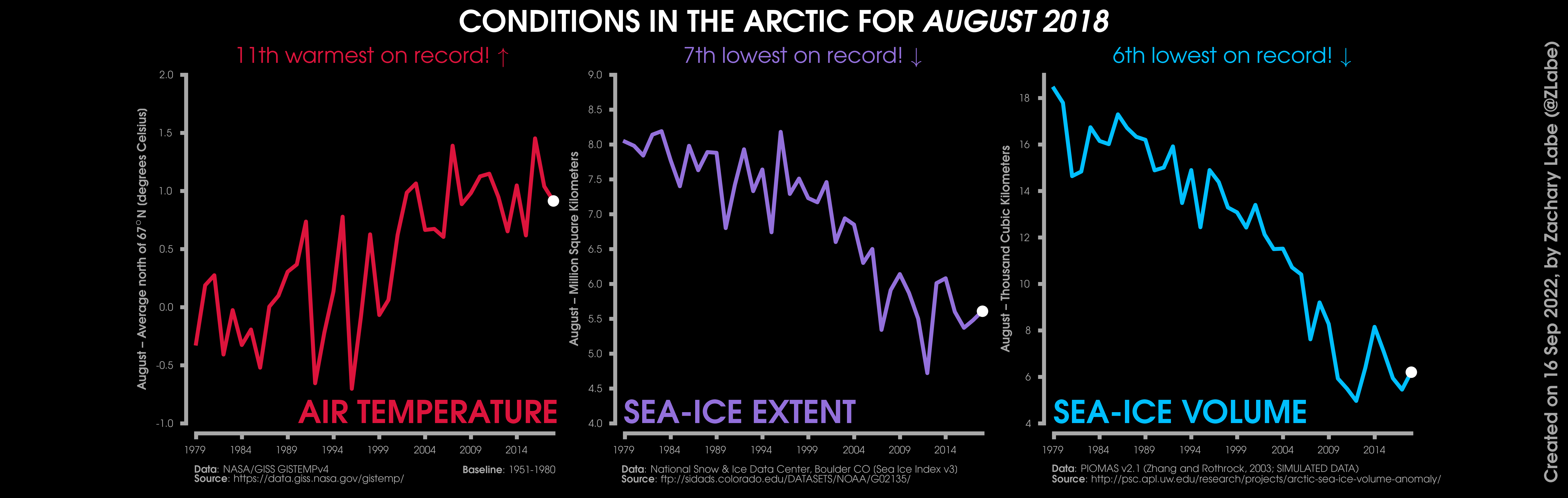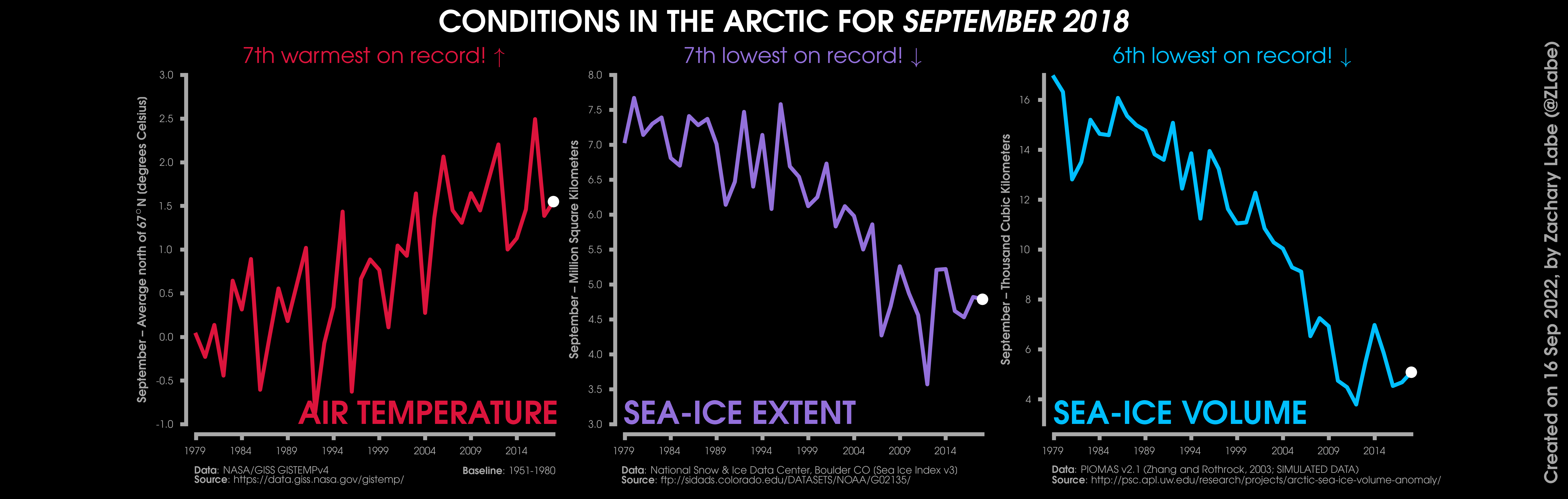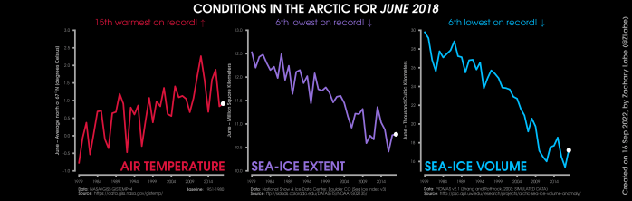 Changes in mean surface air temperature anomalies (GISTEMPv4; 1951-1980 baseline), mean Arctic sea ice extent (NSIDC; Sea Ice Index v3), and mean Arctic sea ice volume (PIOMAS v2.1; Zhang and Rothrock, 2003) over the satellite era. Updated 9/16/2022.