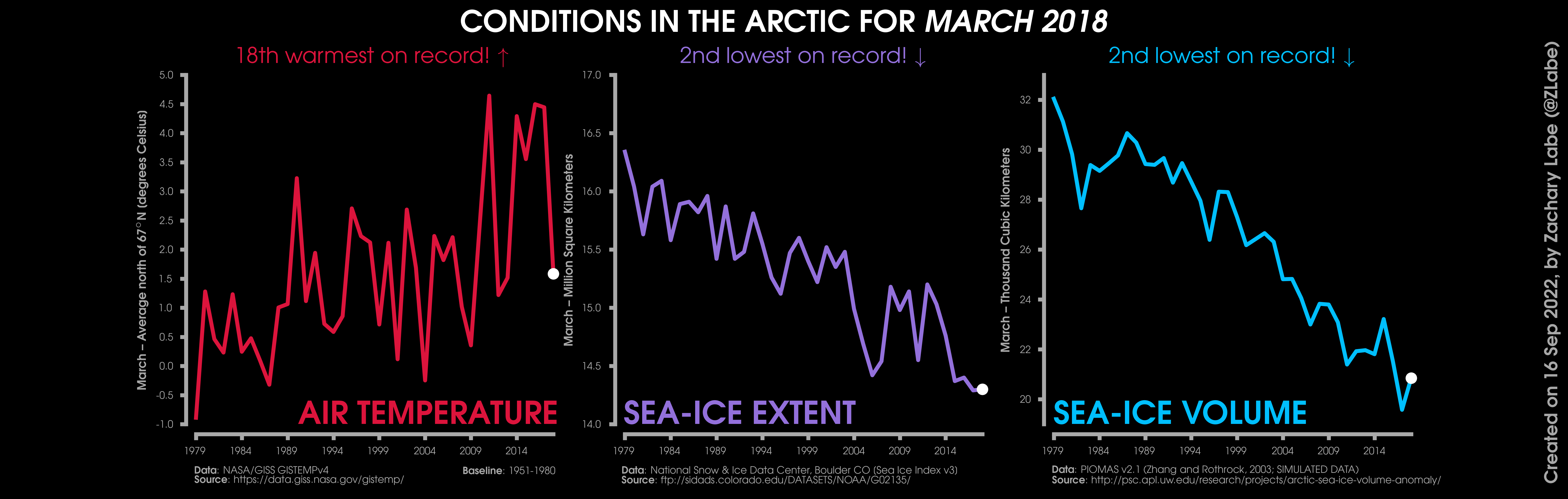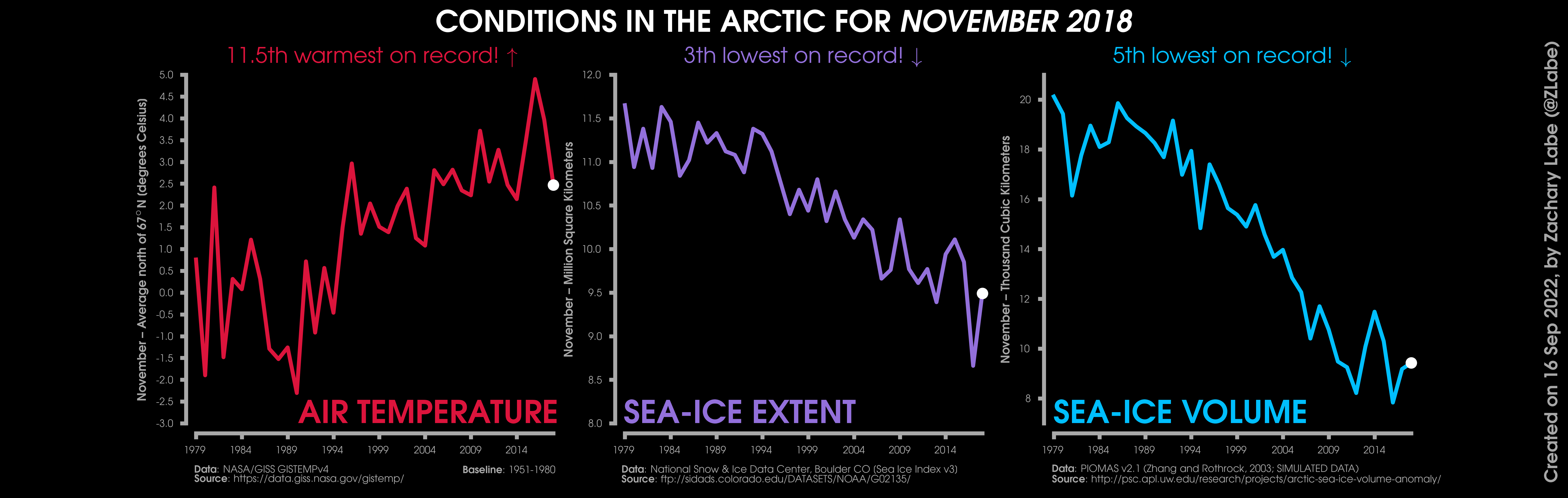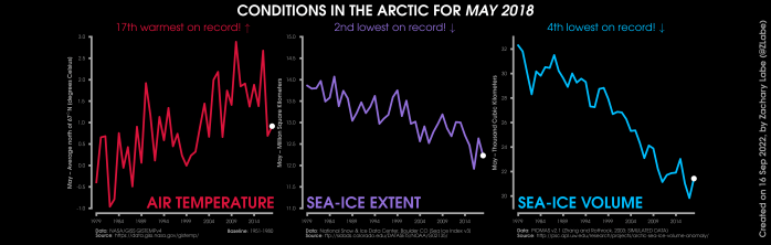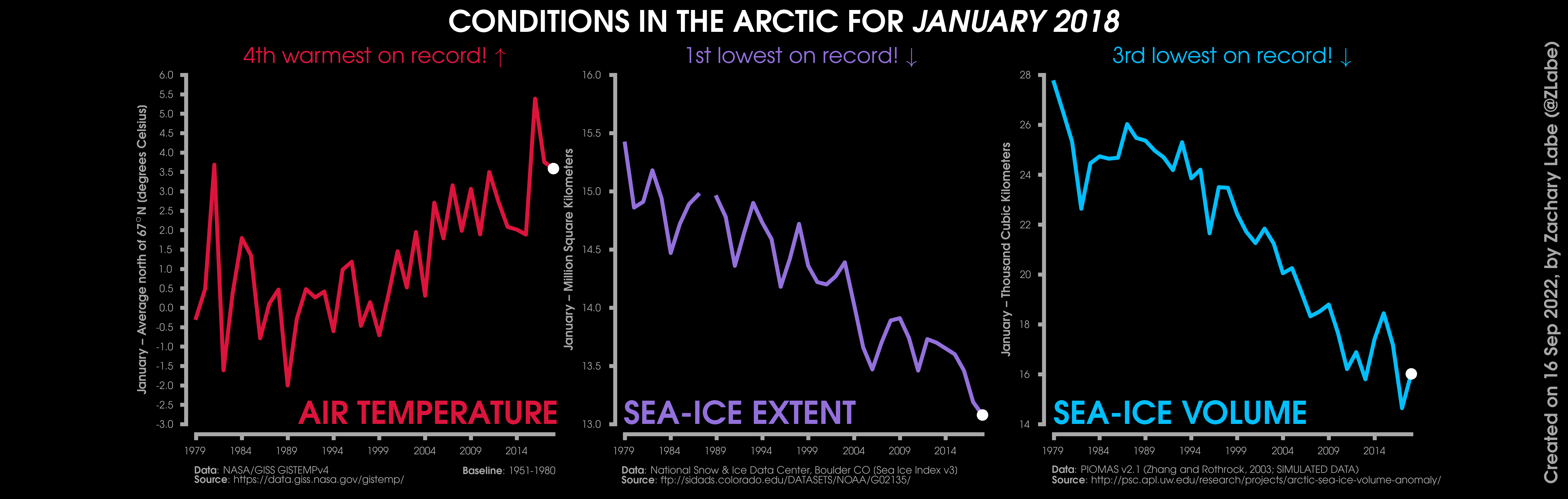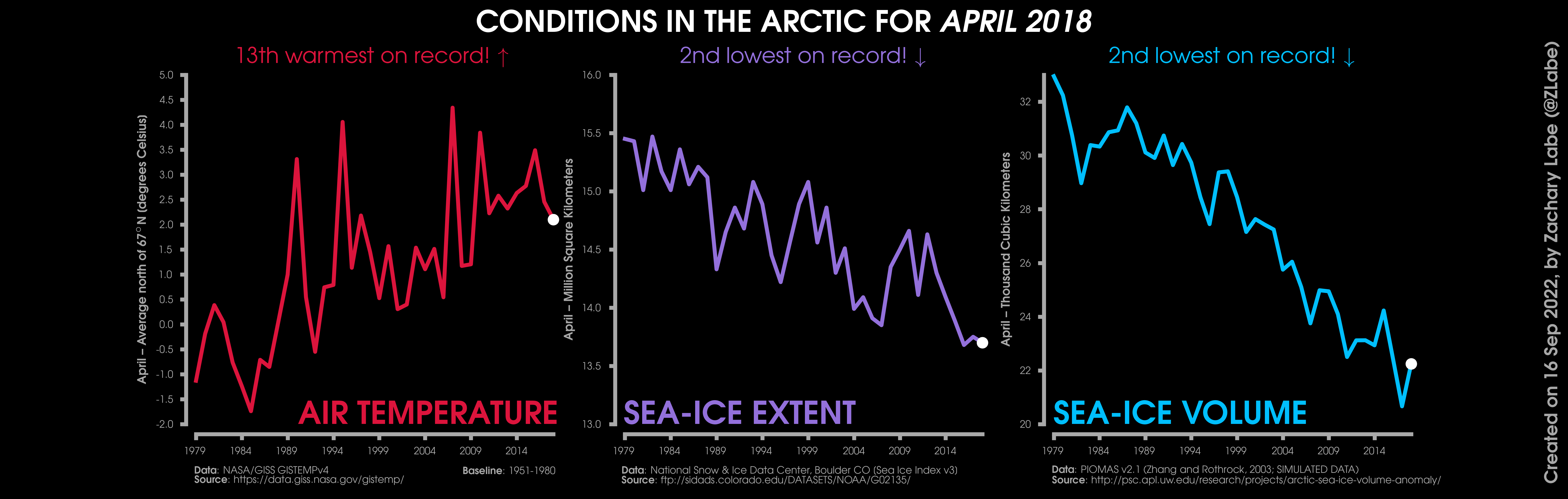 Changes in mean surface air temperature anomalies (GISTEMPv4; 1951-1980 baseline), mean Arctic sea ice extent (NSIDC; Sea Ice Index v3), and mean Arctic sea ice volume (PIOMAS v2.1; Zhang and Rothrock, 2003) over the satellite era. Updated 9/16/2022.