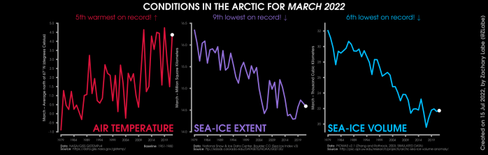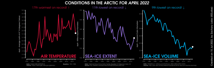 Changes in mean surface air temperature anomalies (GISTEMPv4; 1951-1980 baseline), mean Arctic sea ice extent (NSIDC; Sea Ice Index v3), and mean Arctic sea ice volume (PIOMAS v2.1; Zhang and Rothrock, 2003) over the satellite era. Updated 7/15/2022.