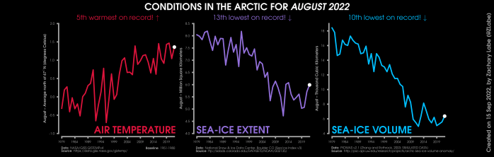 Changes in mean surface air temperature anomalies (GISTEMPv4; 1951-1980 baseline), mean Arctic sea ice extent (NSIDC; Sea Ice Index v3), and mean Arctic sea ice volume (PIOMAS v2.1; Zhang and Rothrock, 2003) over the satellite era. Updated 9/15/2022.