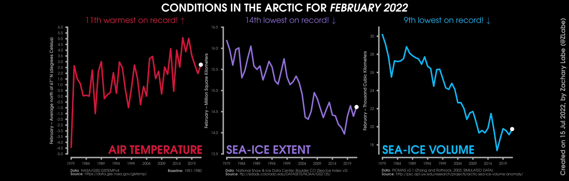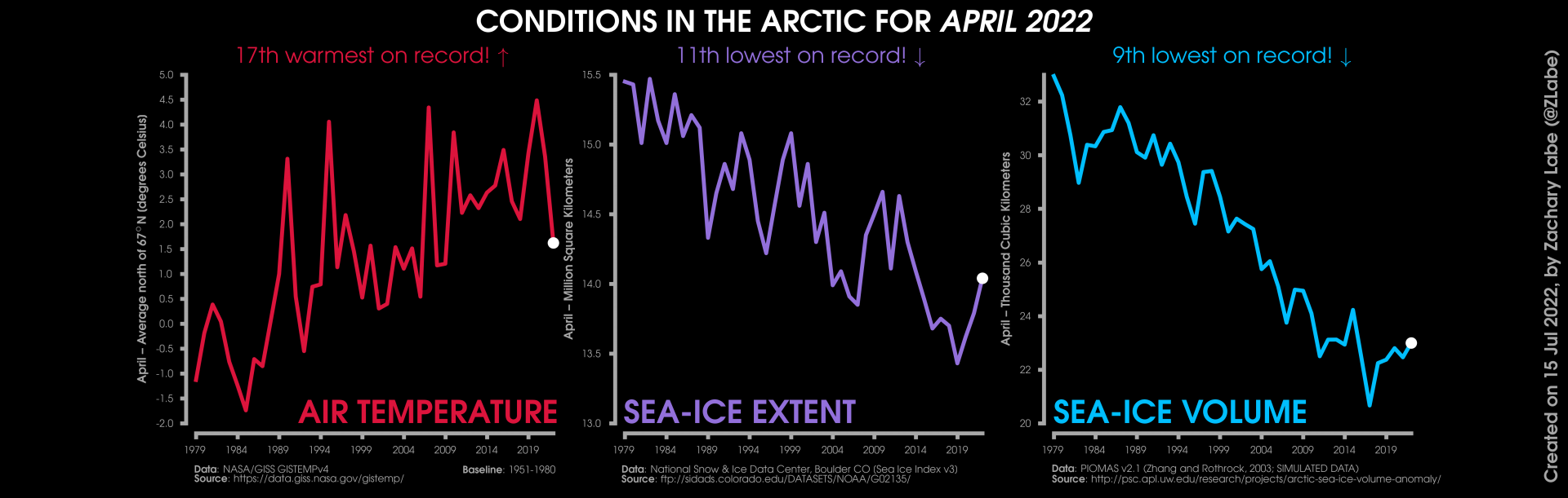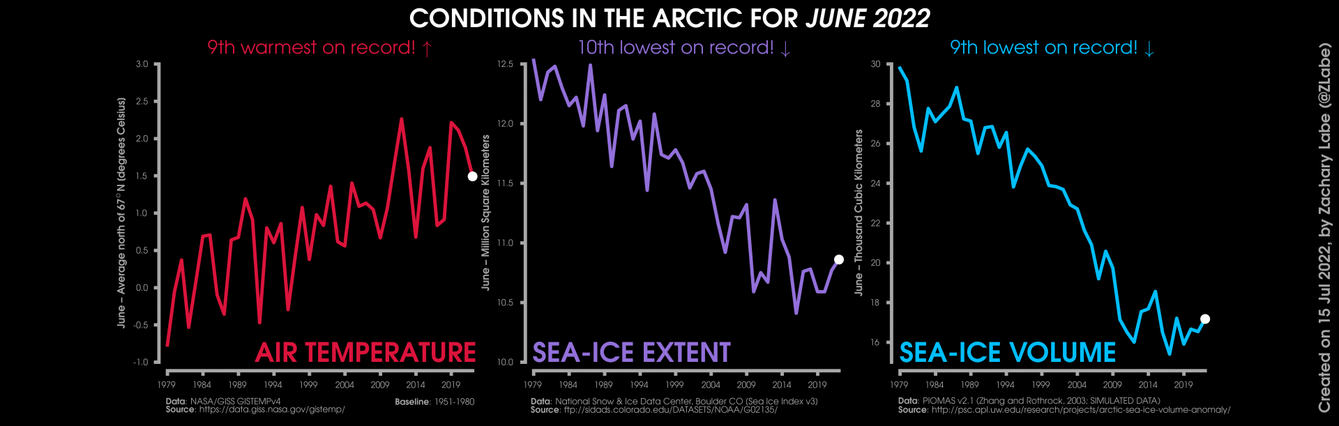 Changes in mean surface air temperature anomalies (GISTEMPv4; 1951-1980 baseline), mean Arctic sea ice extent (NSIDC; Sea Ice Index v3), and mean Arctic sea ice volume (PIOMAS v2.1; Zhang and Rothrock, 2003) over the satellite era. Updated 7/15/2022.