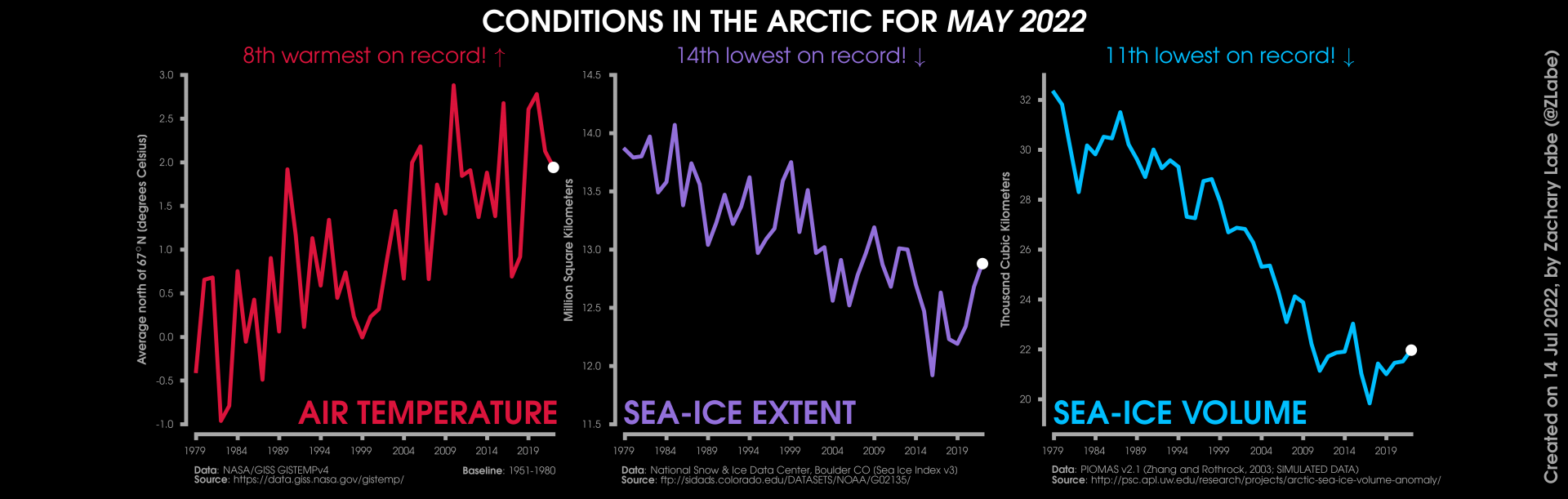 Changes in mean surface air temperature anomalies (GISTEMPv4; 1951-1980 baseline), mean Arctic sea ice extent (NSIDC; Sea Ice Index v3), and mean Arctic sea ice volume (PIOMAS v2.1; Zhang and Rothrock, 2003) over the satellite era. Updated 7/14/2022.