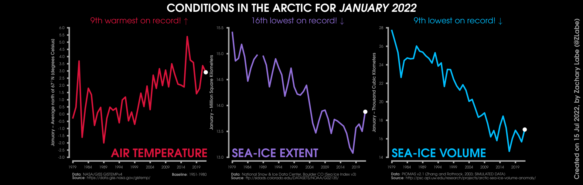 Changes in mean surface air temperature anomalies (GISTEMPv4; 1951-1980 baseline), mean Arctic sea ice extent (NSIDC; Sea Ice Index v3), and mean Arctic sea ice volume (PIOMAS v2.1; Zhang and Rothrock, 2003) over the satellite era. Updated 1/15/2023.