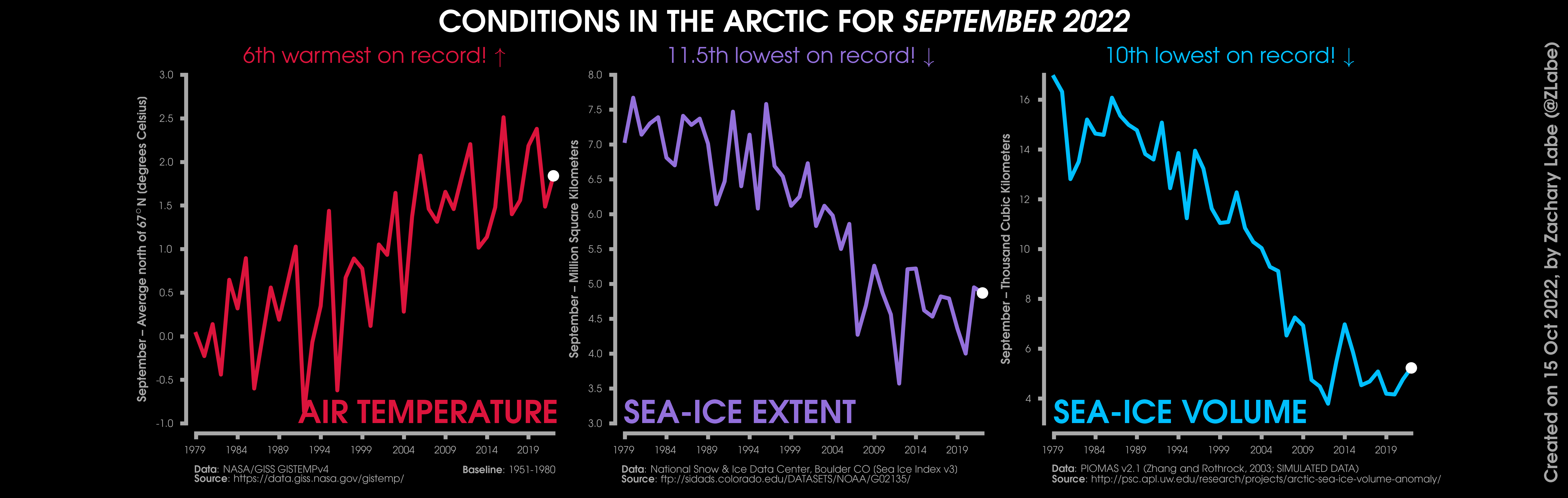 Changes in mean surface air temperature anomalies (GISTEMPv4; 1951-1980 baseline), mean Arctic sea ice extent (NSIDC; Sea Ice Index v3), and mean Arctic sea ice volume (PIOMAS v2.1; Zhang and Rothrock, 2003) over the satellite era. Updated 10/15/2022.