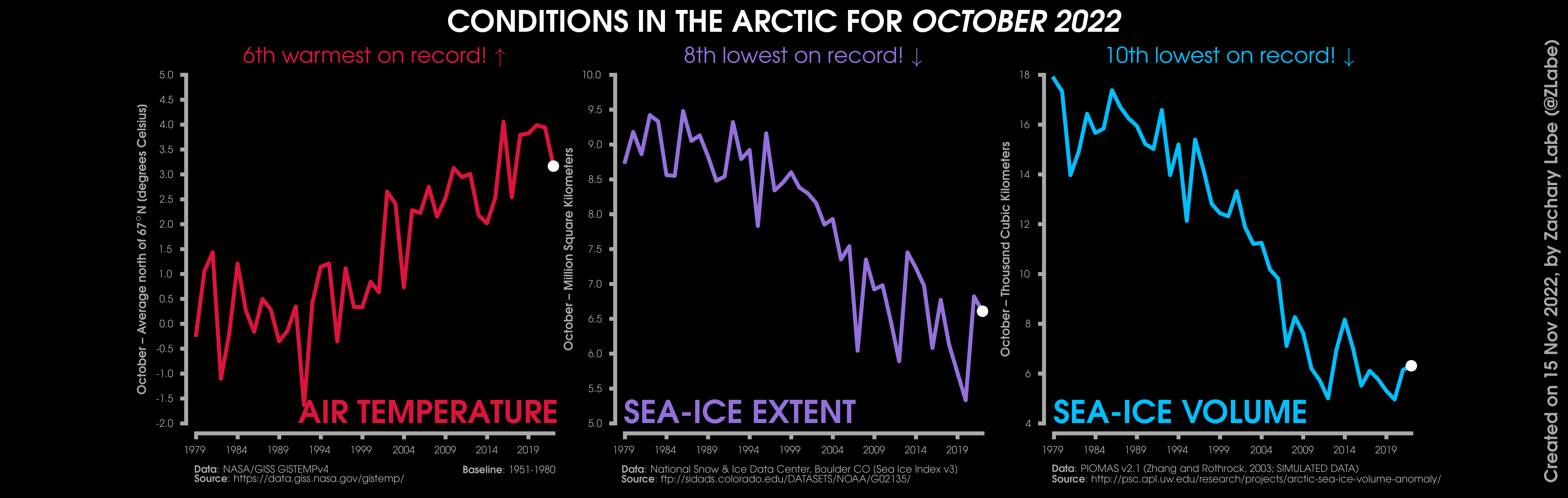 Changes in mean surface air temperature anomalies (GISTEMPv4; 1951-1980 baseline), mean Arctic sea ice extent (NSIDC; Sea Ice Index v3), and mean Arctic sea ice volume (PIOMAS v2.1; Zhang and Rothrock, 2003) over the satellite era. Updated 11/15/2022.
