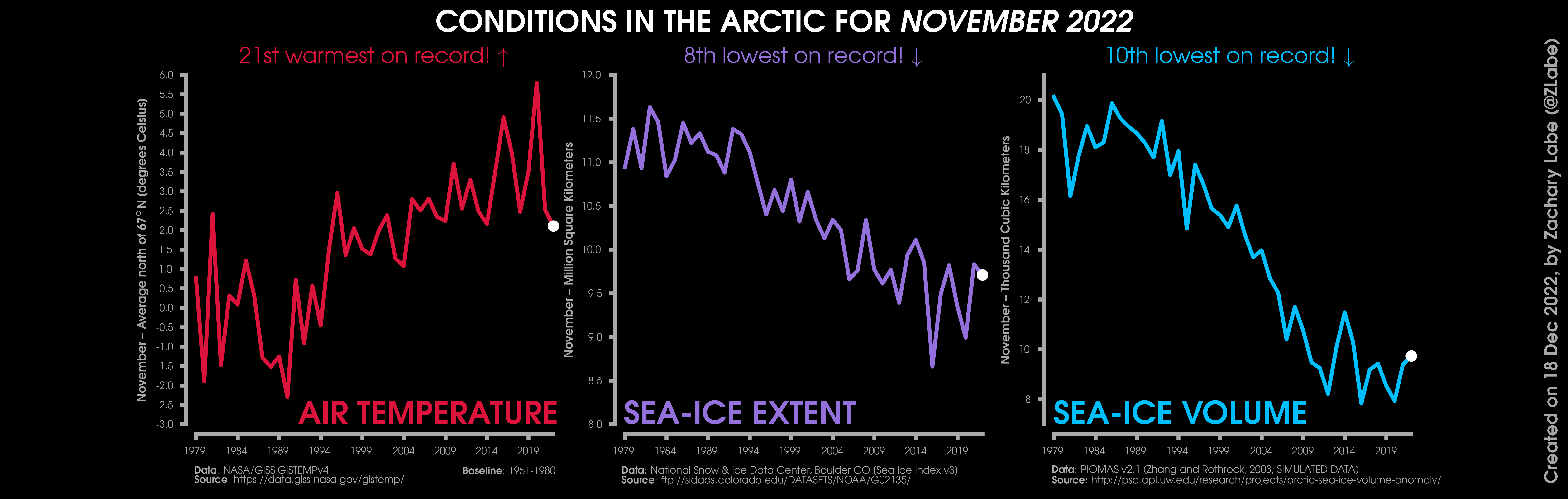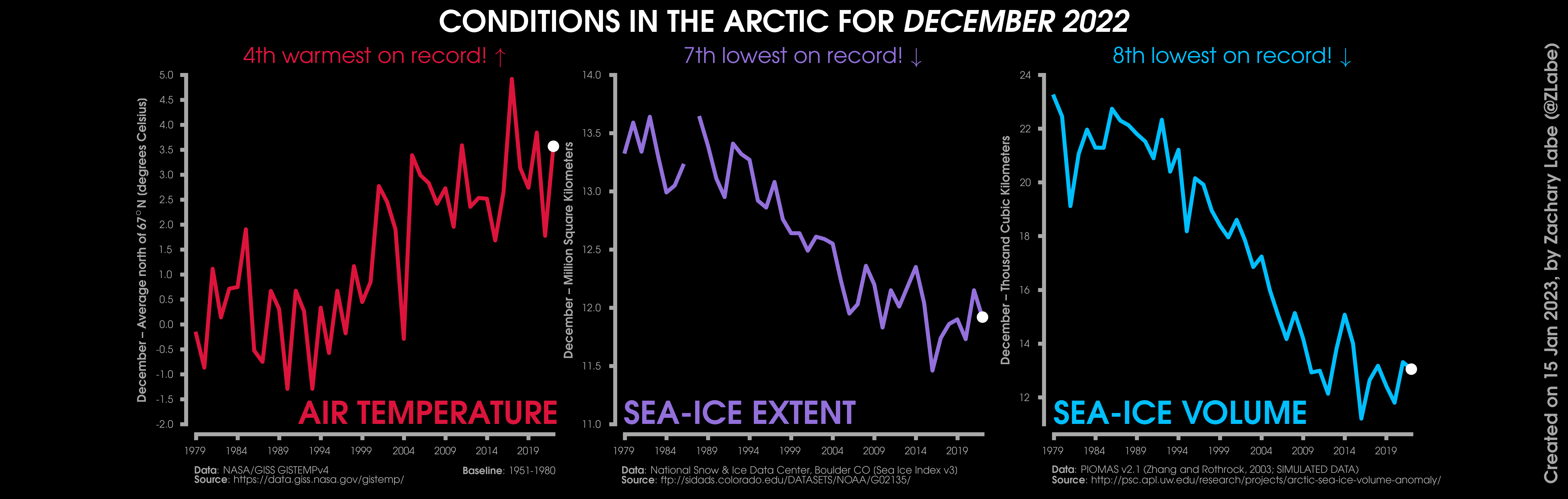 Changes in mean surface air temperature anomalies (GISTEMPv4; 1951-1980 baseline), mean Arctic sea ice extent (NSIDC; Sea Ice Index v3), and mean Arctic sea ice volume (PIOMAS v2.1; Zhang and Rothrock, 2003) over the satellite era. Updated 12/18/2022.