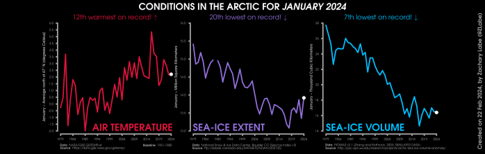 Changes in mean surface air temperature anomalies (GISTEMPv4; 1951-1980 baseline), mean Arctic sea ice extent (NSIDC; Sea Ice Index v3), and mean Arctic sea ice volume (PIOMAS v2.1; Zhang and Rothrock, 2003) over the satellite era. Updated 2/22/2024.