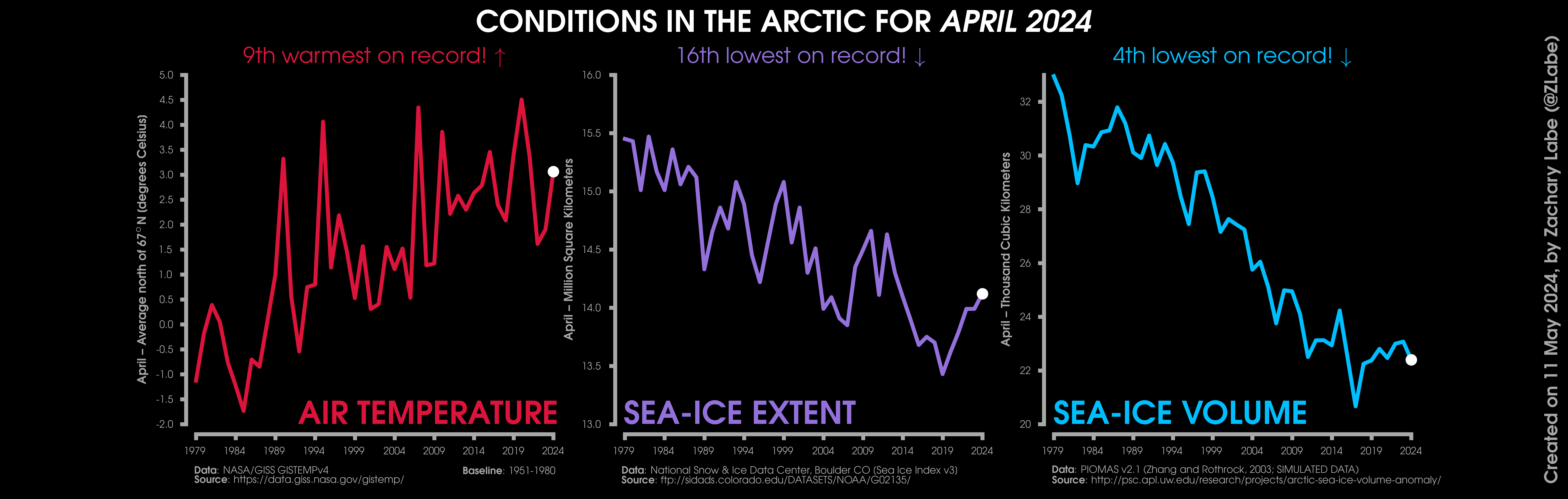 Changes in mean surface air temperature anomalies (GISTEMPv4; 1951-1980 baseline), mean Arctic sea ice extent (NSIDC; Sea Ice Index v3), and mean Arctic sea ice volume (PIOMAS v2.1; Zhang and Rothrock, 2003) over the satellite era. Updated 4/24/2024.