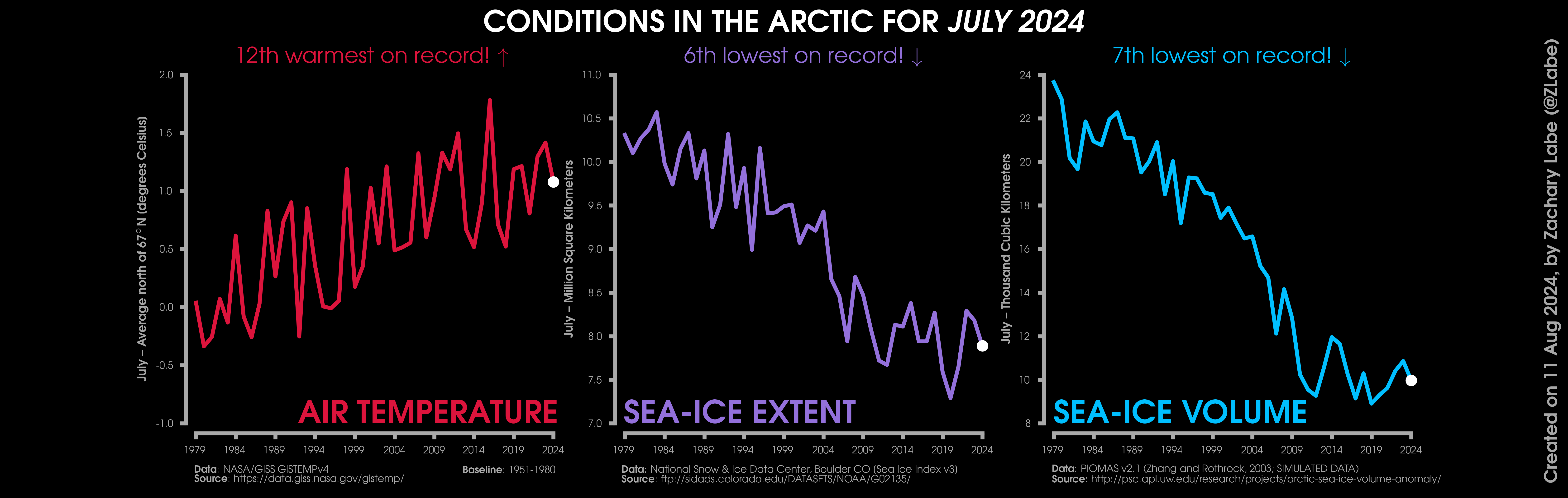 Changes in mean surface air temperature anomalies (GISTEMPv4; 1951-1980 baseline), mean Arctic sea ice extent (NSIDC; Sea Ice Index v3), and mean Arctic sea ice volume (PIOMAS v2.1; Zhang and Rothrock, 2003) over the satellite era. Updated 8/11/2024.