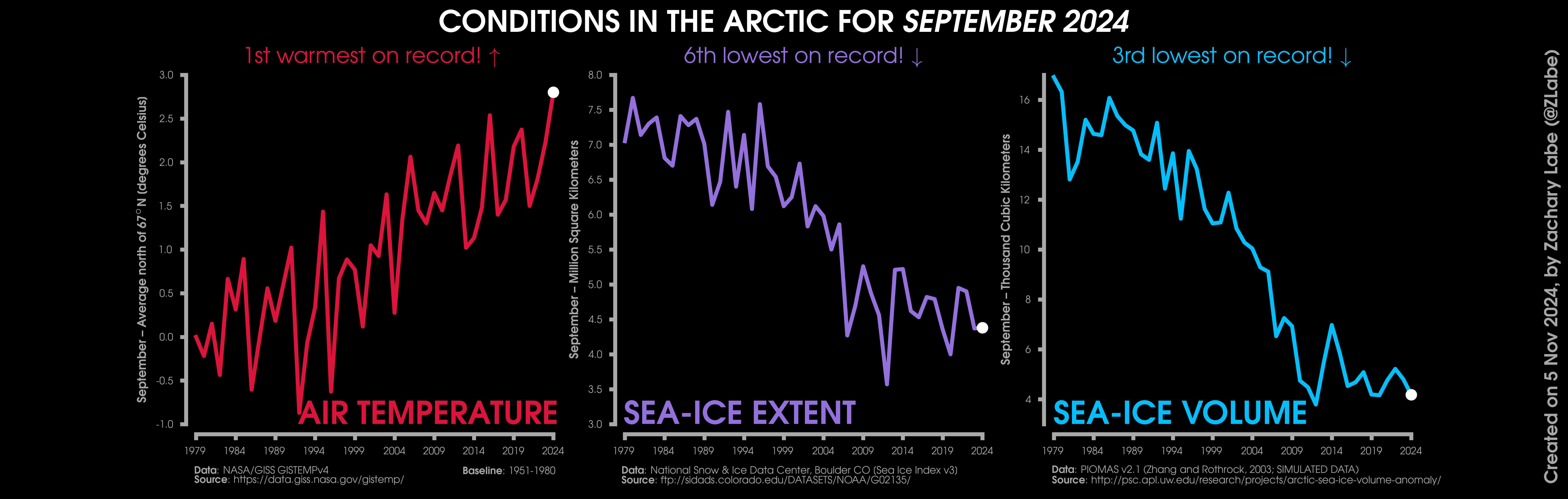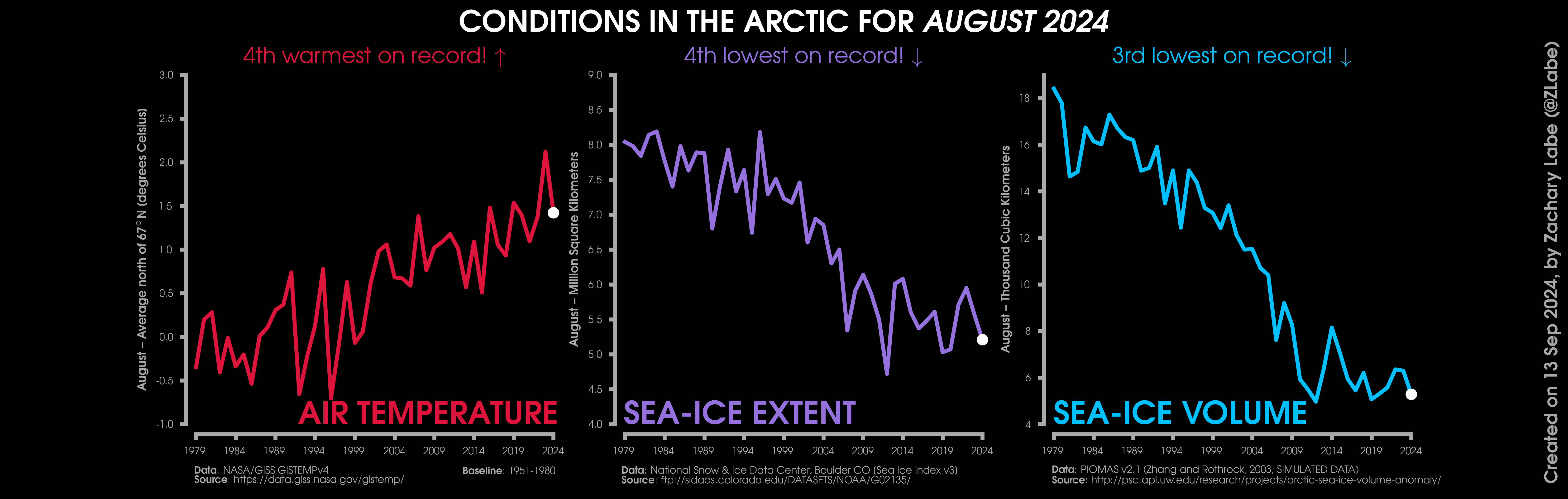 Changes in mean surface air temperature anomalies (GISTEMPv4; 1951-1980 baseline), mean Arctic sea ice extent (NSIDC; Sea Ice Index v3), and mean Arctic sea ice volume (PIOMAS v2.1; Zhang and Rothrock, 2003) over the satellite era. Updated 9/13/2024.