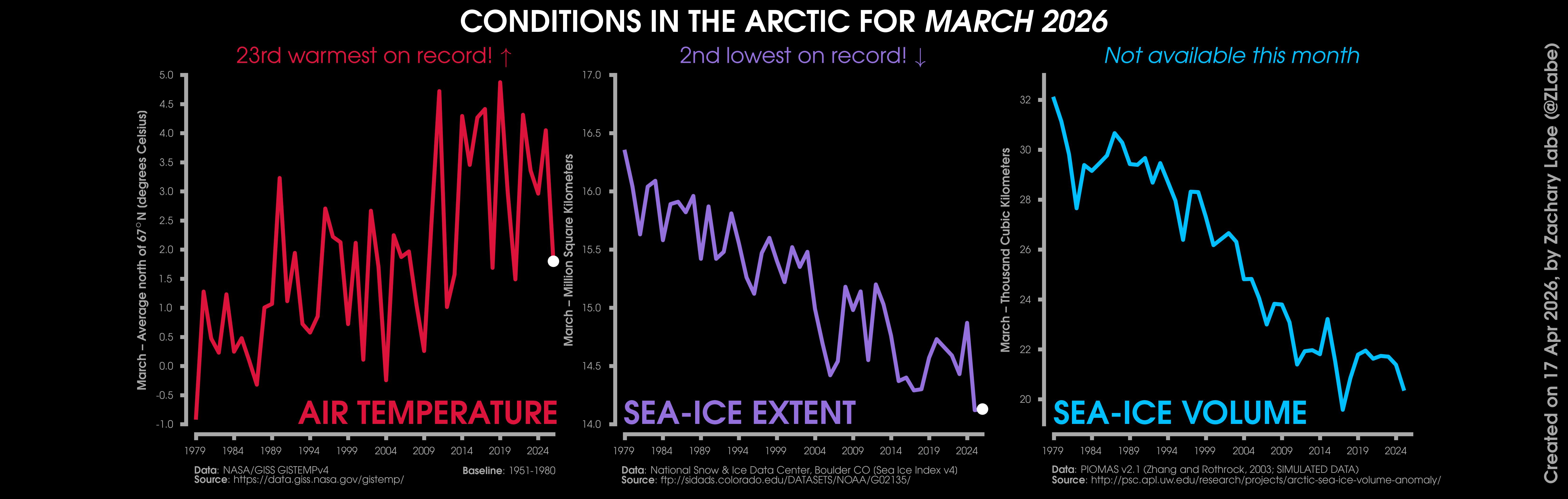 Changes in mean surface air temperature anomalies (GISTEMPv4; 1951-1980 baseline), mean Arctic sea ice extent (NSIDC; Sea Ice Index v4), and mean Arctic sea ice volume (PIOMAS v2.1; Zhang and Rothrock, 2003) over the satellite era. Updated 4/17/2026.