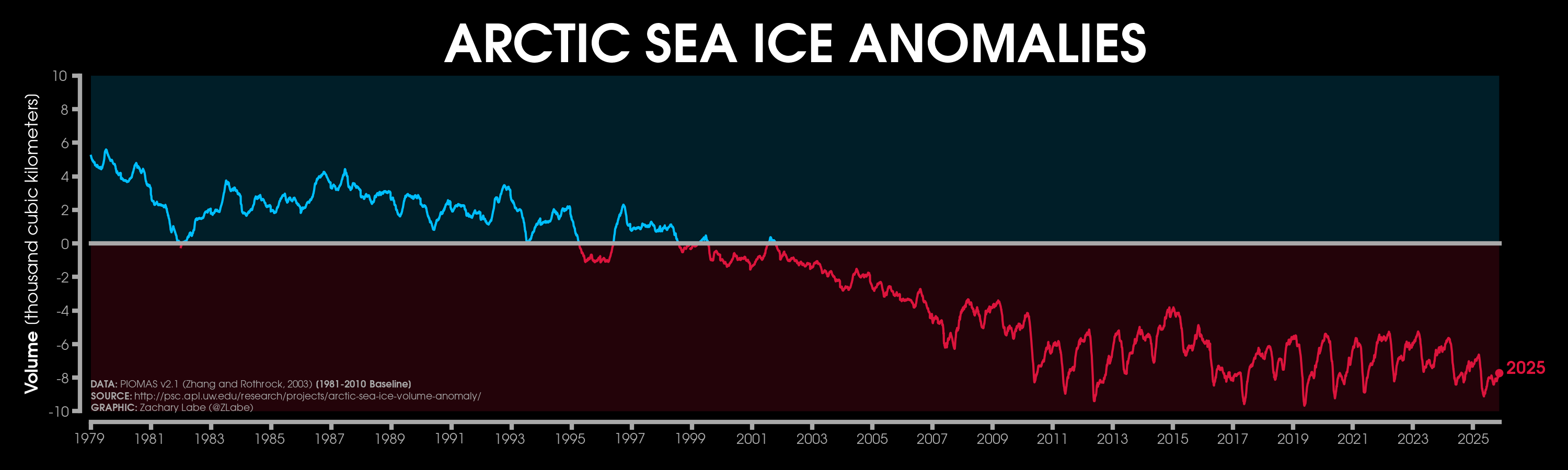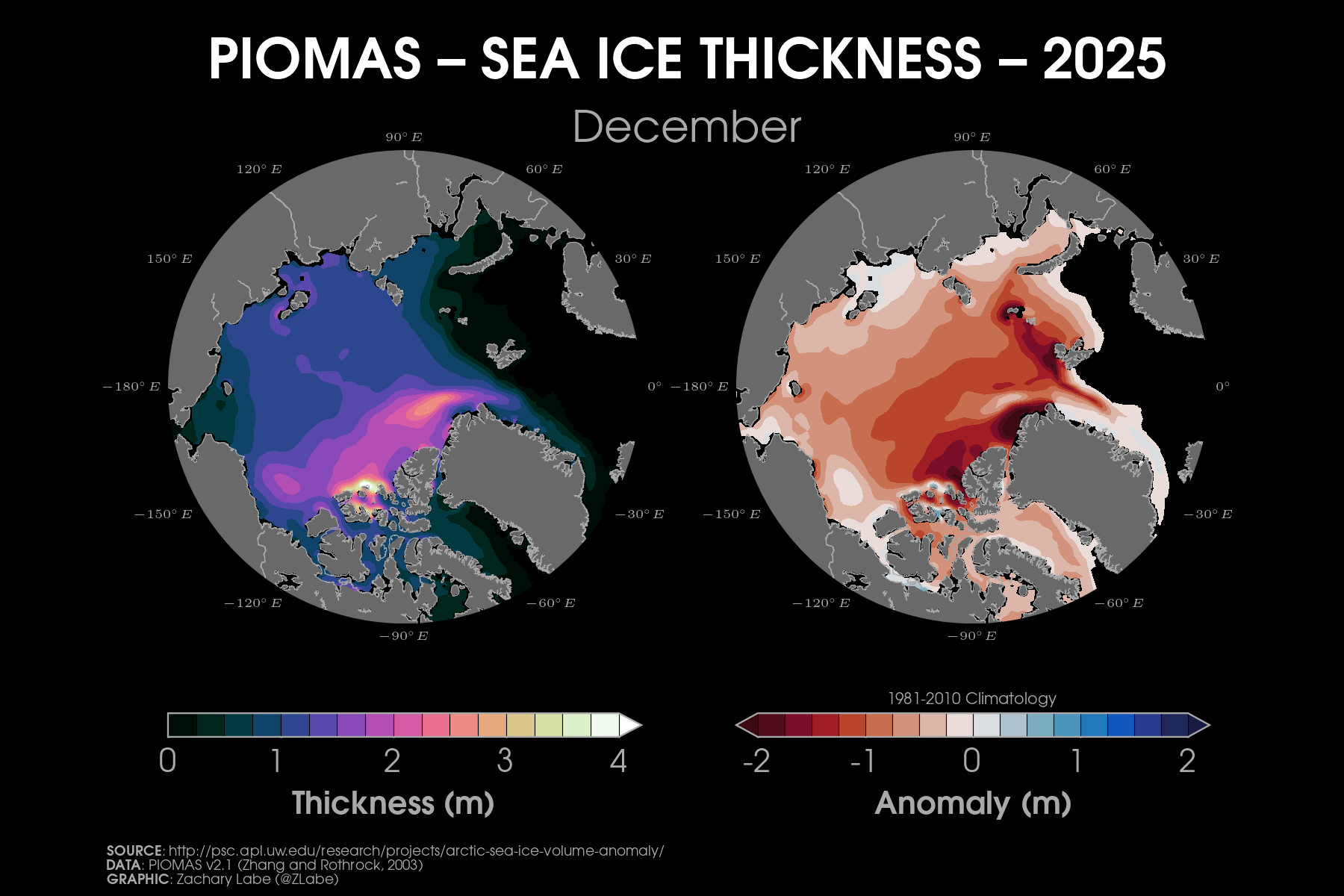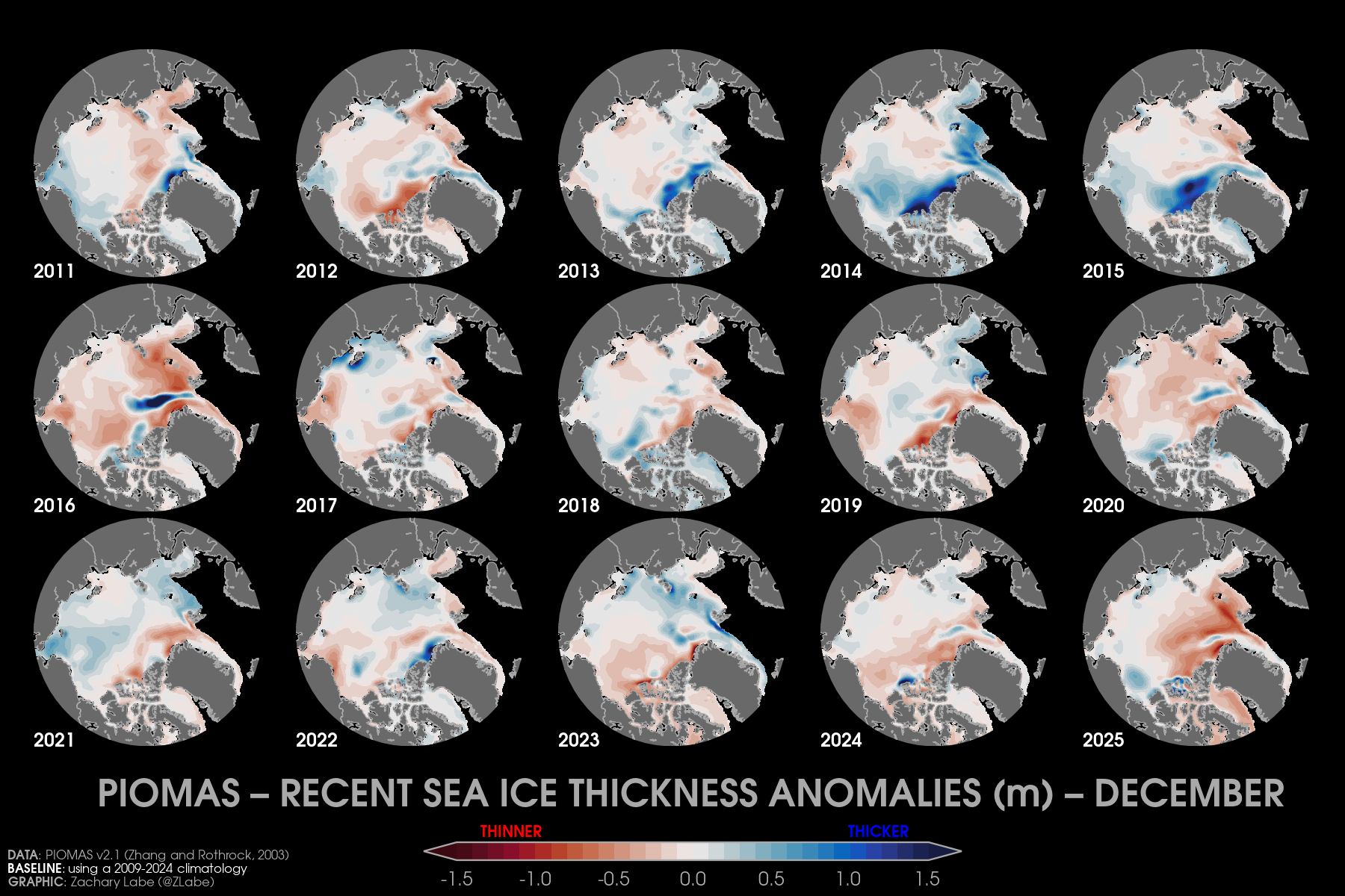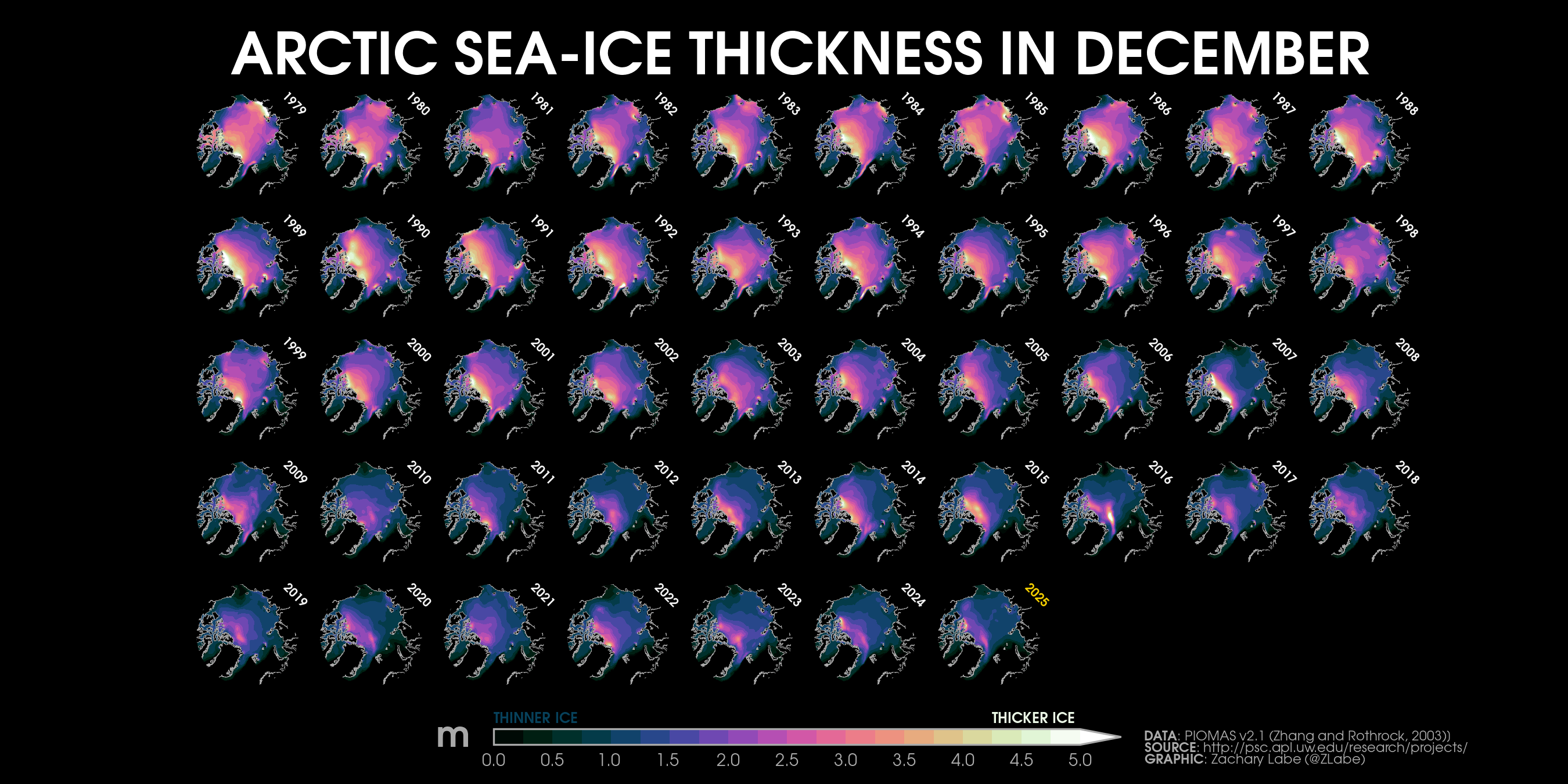 Trends in sea ice thickness/volume are another important indicator of Arctic climate change. While sea ice thickness observations are sparse, here we utilize the ocean and sea ice model, PIOMAS (Zhang and Rothrock, 2003), to visualize December sea ice thickness and volume from 1979 to 2025. Updated for December 2025.Current simulated (PIOMAS; Zhang and Rothrock, 2003) sea ice thickness and anomalies (1981-2010 baseline) updated for December 2025.Simulated (PIOMAS; Zhang and Rothrock, 2003) sea ice thickness anomalies for each December from 2011 to 2025. Note that anomalies are calculated using a recent baseline of 2009-2024, which is a period of substantial Arctic sea-ice loss.Current one month change in simulated (PIOMAS; Zhang and Rothrock, 2003) sea ice thickness from November 2025 to December 2025. Updated 1/4/2026.Current Arctic sea ice thickness derived from weekly sea ice thickness maps based on CryoSat-2/Sentinel-3/SMOS data fusion (Level 4, Version 3.0; Ricker et al. 2017) and its difference compared to the previous year. This graphic will only be updated during winter months (October-April), which is when satellite estimates of sea ice thickness are available. Updated for January 11-17, 2026.Current Arctic sea ice thickness (interpolated and smoothed field) derived from ICESat-2 (L4 Monthly Gridded Sea Ice Thickness, Version 4; Petty et al. 2025) and its difference compared to the previous year. This graphic will only be updated during winter months (September-April), which is when satellite estimates of sea ice thickness are available. Updated for April 2025. Graphic produced on 1/11/2026.Current simulated (PIOMAS; Zhang and Rothrock, 2003) sea ice thickness for every December from 1979 to 2025. Updated 1/4/2026.Latest PIOMAS (model; Zhang and Rothrock, 2003) sea ice volume (SIV) across the Arctic (updated for December 2025).Latest PIOMAS (Zhang and Rothrock, 2003) simulated sea ice volume (SIV) across the Arctic (updated through December 2025).Latest PIOMAS (Zhang and Rothrock, 2003) simulated sea ice thickness (SIT) across the Arctic (updated through December 2025).Time series showing Arctic sea-ice volume for every December from 1901 to 2010 using PIOMAS-20C and from 1979 to 2025 using PIOMAS-v2.1. Thin dashed lines using a lowess smoothing fit are shown for each ice-ocean reanalysis dataset. Graphic updated 1/6/2026.Trends in sea ice thickness are another important indicator of Arctic climate change. While sea ice thickness observations are sparse, here we utilize the ocean and sea ice model, PIOMAS (Zhang and Rothrock, 2003), to visualize mean monthly sea ice thickness from 1979 to 2025. Updated through December 2025.Mean Arctic sea-ice thickness for each month from January 2011 to December 2024 from CryoSat-2 (ESA CCI Climate Data Record (CDRv2), ESA CCI Interim Climate Data Record (ICDRv3)). Satellite-derived observations of sea-ice thickness are not available during the melt season. Figure itself was updated April 2025.Trends in sea ice thickness/volume are another important indicator of Arctic climate change. While sea ice thickness observations are sparse, here we utilize the ocean and sea ice model, PIOMAS (Zhang and Rothrock, 2003), to visualize December sea ice thickness from 1979 to 2025. Sea ice less than 1.5 meters is masked out (black) to emphasize the loss of thicker, older ice. Updated through December 2025.Daily Arctic sea ice volume anomalies stretching from 1 January 1979 to 31 December 2025 (PIOMAS; Zhang and Rothrock, 2003). Anomalies are calculated from a climatological baseline of 1981-2010 (updated 1/6/2026).Changes in the annual maximum and minimum of daily Arctic sea-ice volume simulated from PIOMAS (Zhang and Rothrock, 2003). Trends are calculated using a linear least squares fit for the white dashed lines between 1979 and 2025. Graphic updated 12/6/2025.Daily Arctic sea ice thickness (PIOMASv2.1; Zhang and Rothrock, 2003) from 1 January 1979 through 31 December 2025.Daily Arctic sea ice thickness anomalies (PIOMASv2.1; Zhang and Rothrock, 2003) from 1 January 1979 through 31 December 2025. Anomalies are calculated from an averaged 1981-2010 baseline.Daily Arctic sea ice thickness anomalies (PIOMASv2.1; Zhang and Rothrock, 2003) from 1 January 1979 through 31 December 2025. Data are standardized using a 1979-2025 baseline.Arctic sea ice volume rankings (1 = lowest, 47 = highest) from the Pan-Arctic Ice Ocean Modeling and Assimilation System (PIOMAS v2.1, Zhang and Rothrock, 2003). Figured updated through December 2025. Graphic is modified from Labe et al. [2018]. Graphic updated on 1/6/2026.