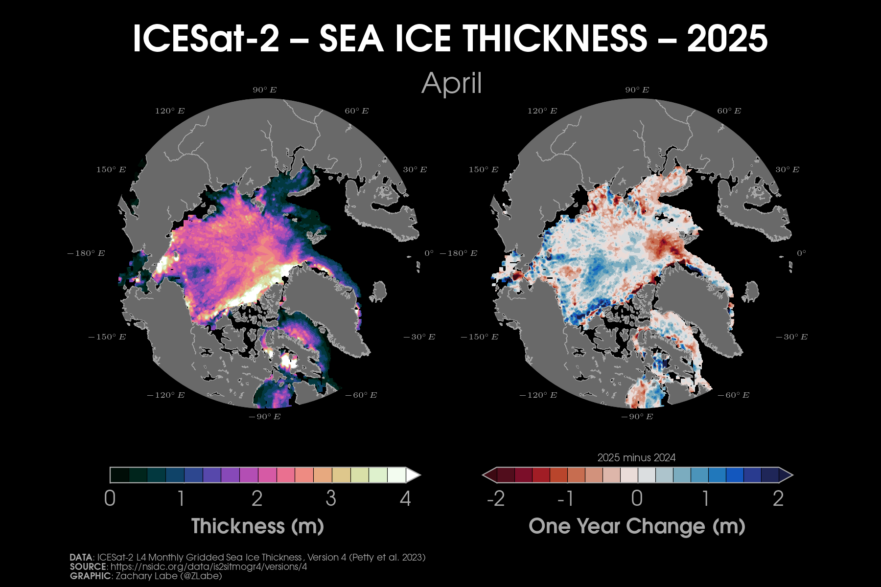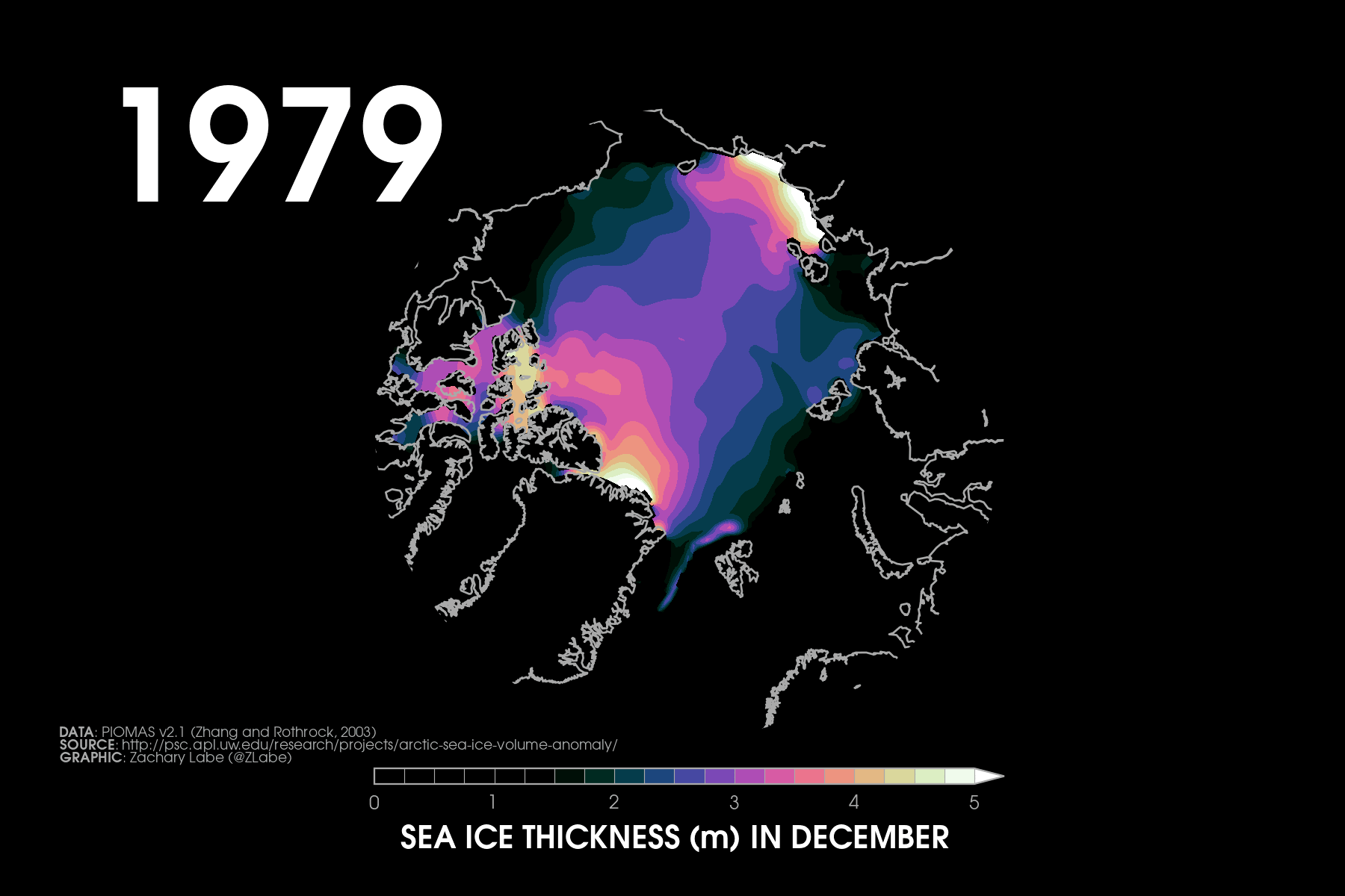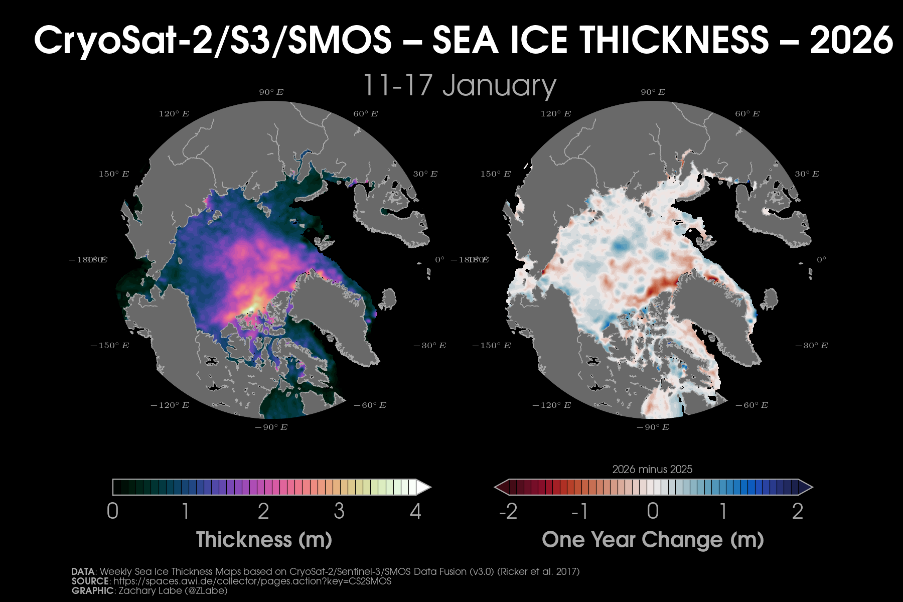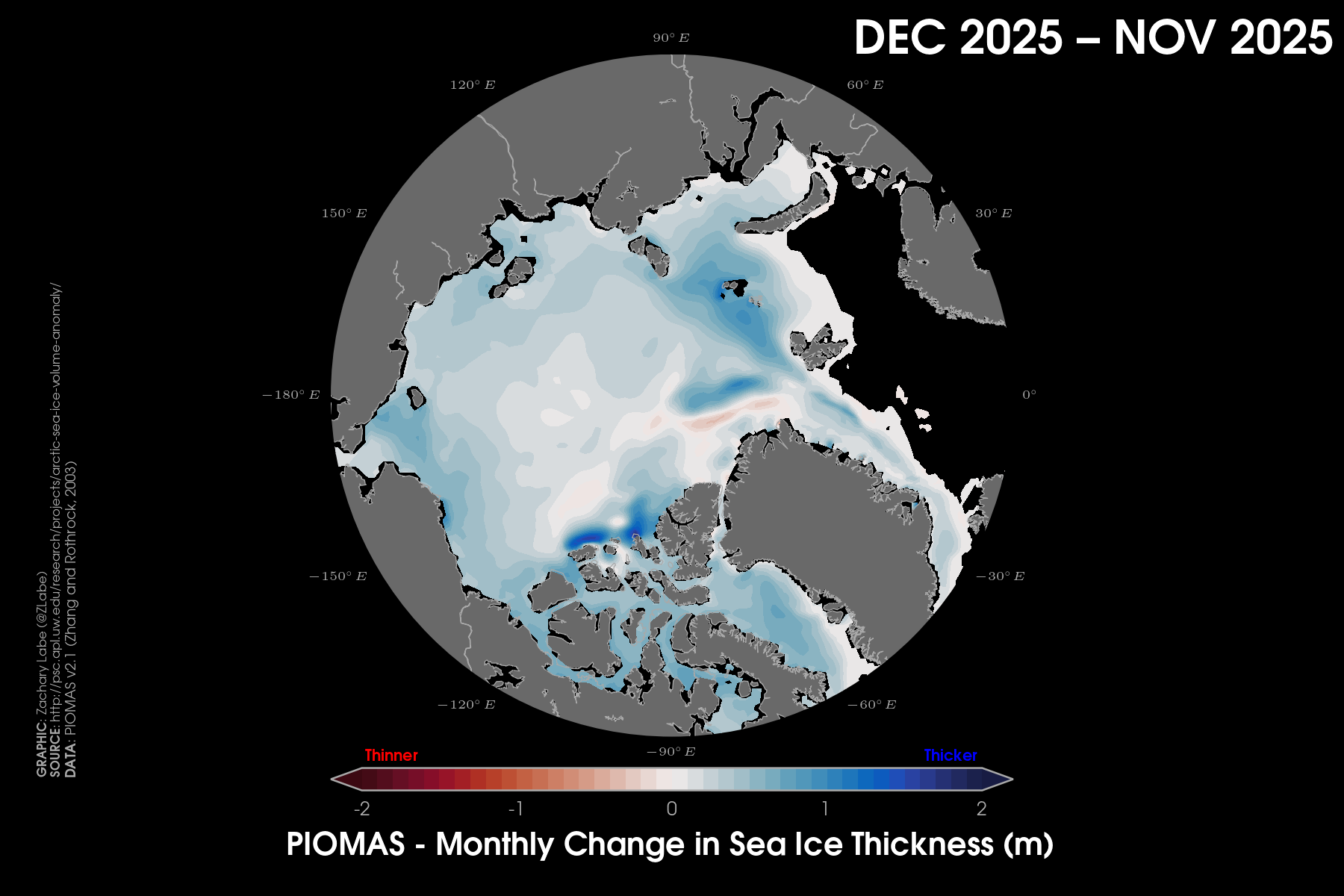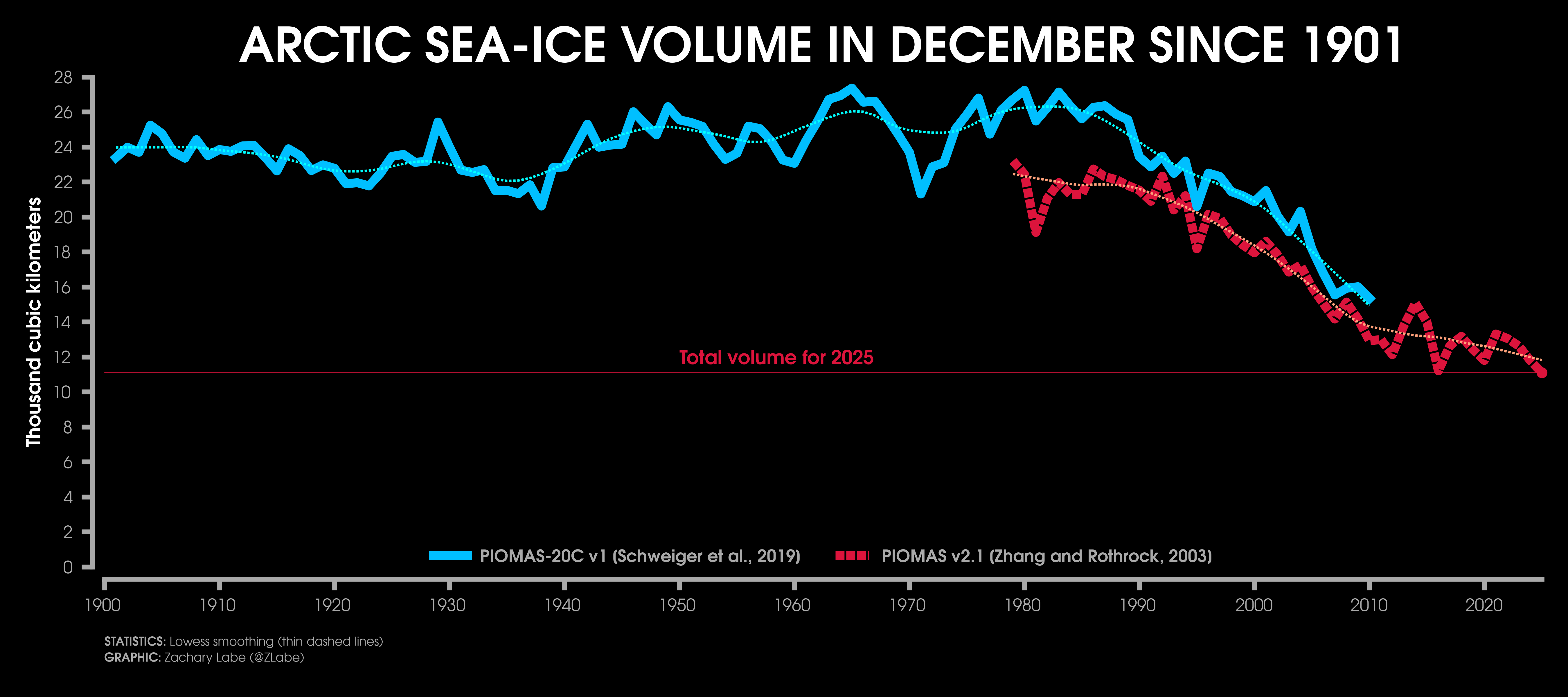 Trends in sea ice thickness/volume are another important indicator of Arctic climate change. While sea ice thickness observations are sparse, here we utilize the ocean and sea ice model, PIOMAS (Zhang and Rothrock, 2003), to visualize December sea ice thickness and volume from 1979 to 2025. Updated for December 2025.Current simulated (PIOMAS; Zhang and Rothrock, 2003) sea ice thickness and anomalies (1981-2010 baseline) updated for December 2025.Simulated (PIOMAS; Zhang and Rothrock, 2003) sea ice thickness anomalies for each December from 2011 to 2025. Note that anomalies are calculated using a recent baseline of 2009-2024, which is a period of substantial Arctic sea-ice loss.Current one month change in simulated (PIOMAS; Zhang and Rothrock, 2003) sea ice thickness from November 2025 to December 2025. Updated 1/4/2026.Current Arctic sea ice thickness derived from weekly sea ice thickness maps based on CryoSat-2/Sentinel-3/SMOS data fusion (Level 4, Version 3.0; Ricker et al. 2017) and its difference compared to the previous year. This graphic will only be updated during winter months (October-April), which is when satellite estimates of sea ice thickness are available. Updated for January 11-17, 2026.Current Arctic sea ice thickness (interpolated and smoothed field) derived from ICESat-2 (L4 Monthly Gridded Sea Ice Thickness, Version 4; Petty et al. 2025) and its difference compared to the previous year. This graphic will only be updated during winter months (September-April), which is when satellite estimates of sea ice thickness are available. Updated for April 2025. Graphic produced on 1/11/2026.Current simulated (PIOMAS; Zhang and Rothrock, 2003) sea ice thickness for every December from 1979 to 2025. Updated 1/4/2026.Latest PIOMAS (model; Zhang and Rothrock, 2003) sea ice volume (SIV) across the Arctic (updated for December 2025).Latest PIOMAS (Zhang and Rothrock, 2003) simulated sea ice volume (SIV) across the Arctic (updated through December 2025).Latest PIOMAS (Zhang and Rothrock, 2003) simulated sea ice thickness (SIT) across the Arctic (updated through December 2025).Time series showing Arctic sea-ice volume for every December from 1901 to 2010 using PIOMAS-20C and from 1979 to 2025 using PIOMAS-v2.1. Thin dashed lines using a lowess smoothing fit are shown for each ice-ocean reanalysis dataset. Graphic updated 1/6/2026.Trends in sea ice thickness are another important indicator of Arctic climate change. While sea ice thickness observations are sparse, here we utilize the ocean and sea ice model, PIOMAS (Zhang and Rothrock, 2003), to visualize mean monthly sea ice thickness from 1979 to 2025. Updated through December 2025.Mean Arctic sea-ice thickness for each month from January 2011 to December 2024 from CryoSat-2 (ESA CCI Climate Data Record (CDRv2), ESA CCI Interim Climate Data Record (ICDRv3)). Satellite-derived observations of sea-ice thickness are not available during the melt season. Figure itself was updated April 2025.Trends in sea ice thickness/volume are another important indicator of Arctic climate change. While sea ice thickness observations are sparse, here we utilize the ocean and sea ice model, PIOMAS (Zhang and Rothrock, 2003), to visualize December sea ice thickness from 1979 to 2025. Sea ice less than 1.5 meters is masked out (black) to emphasize the loss of thicker, older ice. Updated through December 2025.Daily Arctic sea ice volume anomalies stretching from 1 January 1979 to 31 December 2025 (PIOMAS; Zhang and Rothrock, 2003). Anomalies are calculated from a climatological baseline of 1981-2010 (updated 1/6/2026).Changes in the annual maximum and minimum of daily Arctic sea-ice volume simulated from PIOMAS (Zhang and Rothrock, 2003). Trends are calculated using a linear least squares fit for the white dashed lines between 1979 and 2025. Graphic updated 12/6/2025.Daily Arctic sea ice thickness (PIOMASv2.1; Zhang and Rothrock, 2003) from 1 January 1979 through 31 December 2025.Daily Arctic sea ice thickness anomalies (PIOMASv2.1; Zhang and Rothrock, 2003) from 1 January 1979 through 31 December 2025. Anomalies are calculated from an averaged 1981-2010 baseline.Daily Arctic sea ice thickness anomalies (PIOMASv2.1; Zhang and Rothrock, 2003) from 1 January 1979 through 31 December 2025. Data are standardized using a 1979-2025 baseline.Arctic sea ice volume rankings (1 = lowest, 47 = highest) from the Pan-Arctic Ice Ocean Modeling and Assimilation System (PIOMAS v2.1, Zhang and Rothrock, 2003). Figured updated through December 2025. Graphic is modified from Labe et al. [2018]. Graphic updated on 1/6/2026.