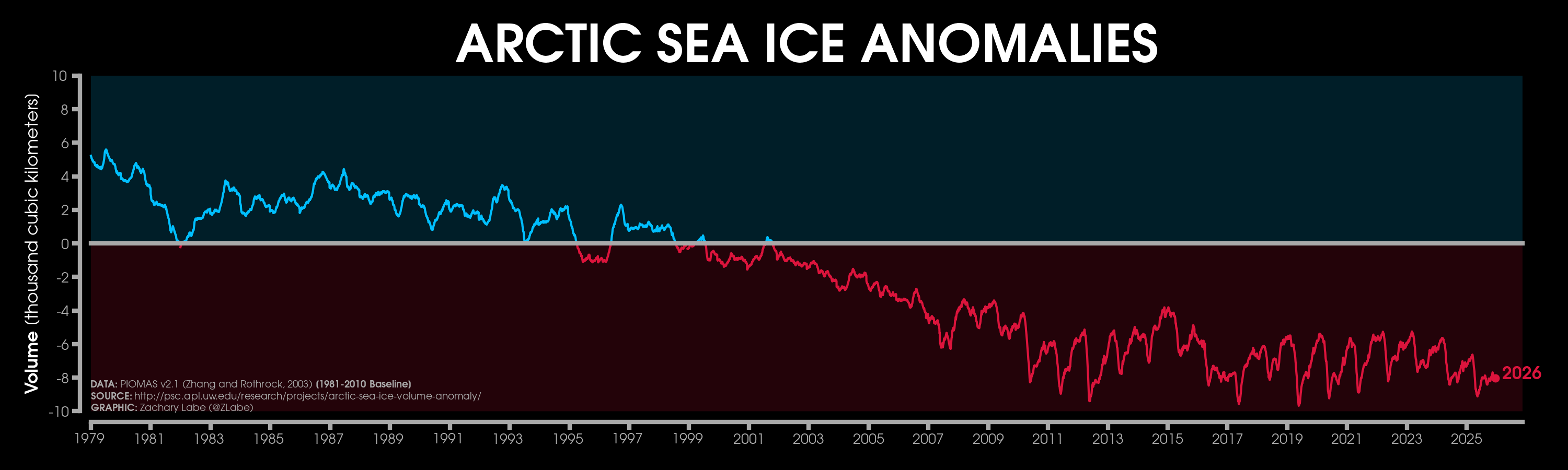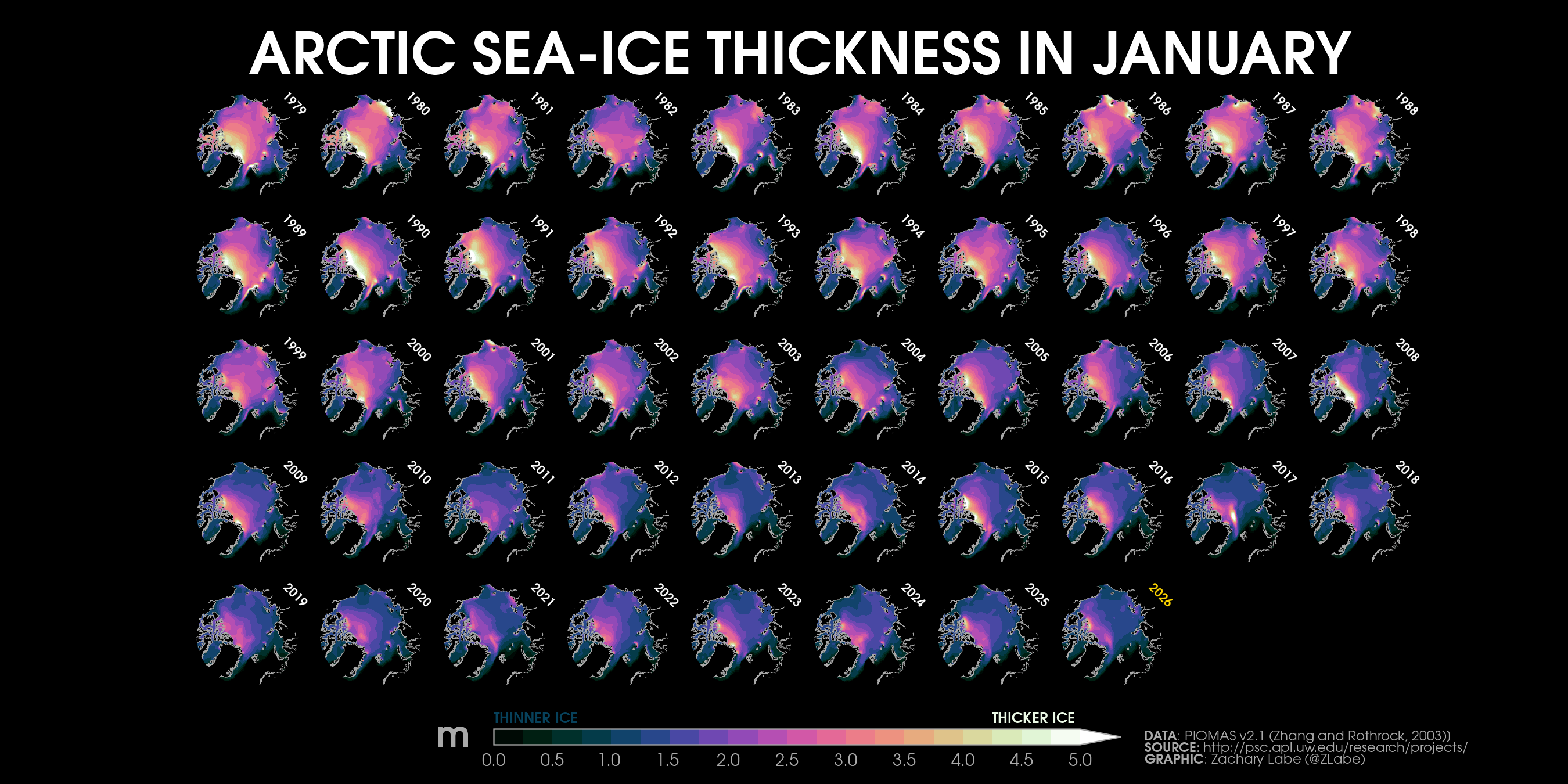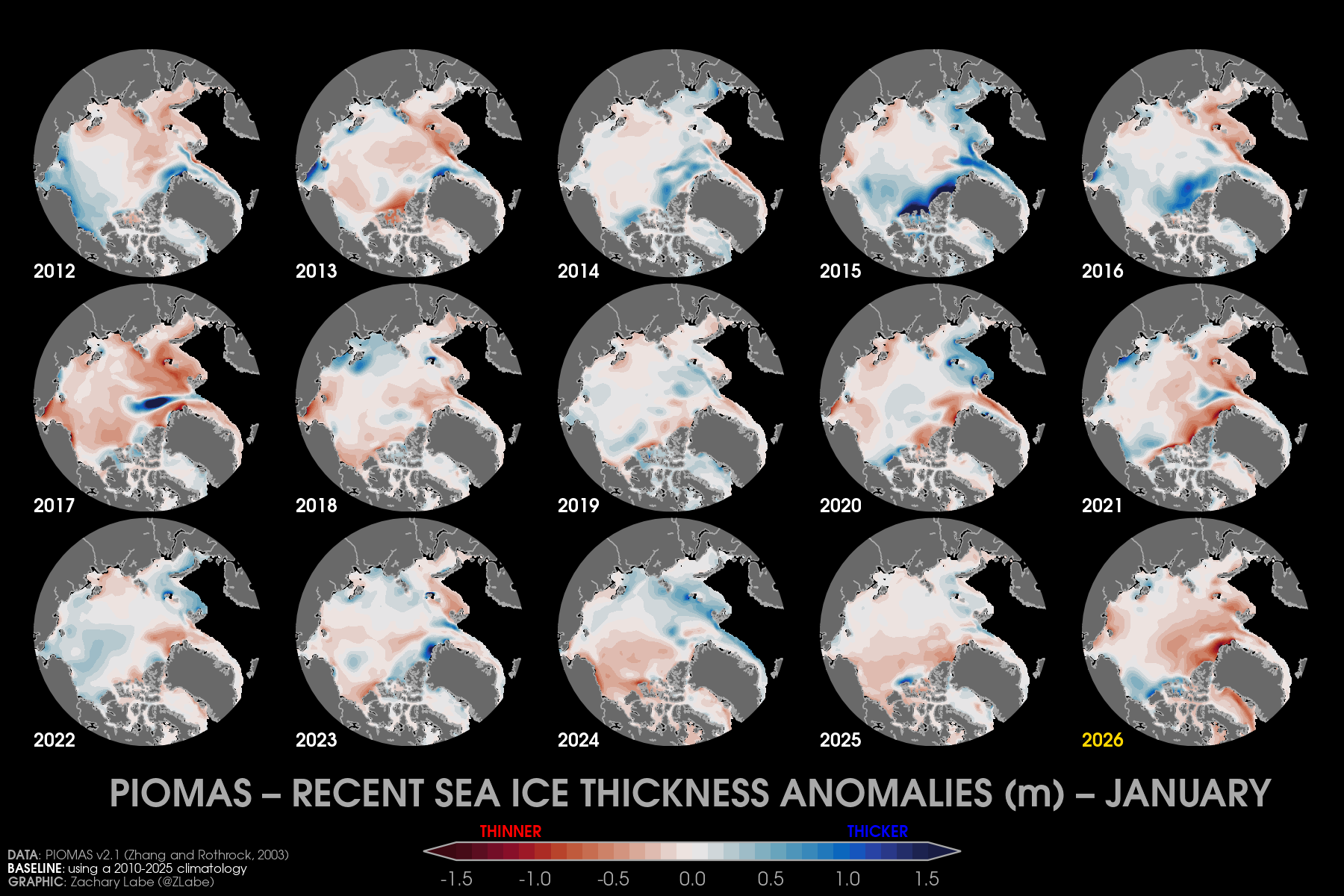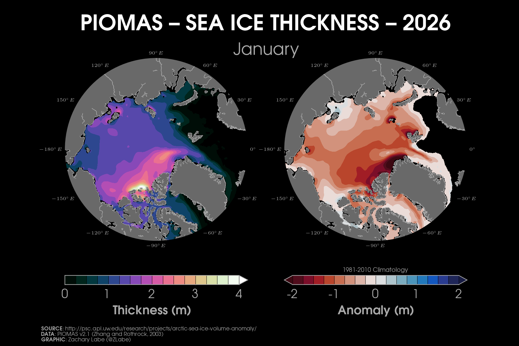 Trends in sea ice thickness/volume are another important indicator of Arctic climate change. While sea ice thickness observations are sparse, here we utilize the ocean and sea ice model, PIOMAS (Zhang and Rothrock, 2003), to visualize January sea ice thickness and volume from 1979 to 2026. Updated for January 2026.Current simulated (PIOMAS; Zhang and Rothrock, 2003) sea ice thickness and anomalies (1981-2010 baseline) updated for January 2026.Simulated (PIOMAS; Zhang and Rothrock, 2003) sea ice thickness anomalies for each January from 2012 to 2026. Note that anomalies are calculated using a recent baseline of 2010-2025, which is a period of substantial Arctic sea-ice loss.Current one month change in simulated (PIOMAS; Zhang and Rothrock, 2003) sea ice thickness from December 2025 to January 2026. Updated 2/7/2026.Current Arctic sea ice thickness derived from weekly sea ice thickness maps based on CryoSat-2/Sentinel-3/SMOS data fusion (Level 4, Version 3.0; Ricker et al. 2017) and its difference compared to the previous year. This graphic will only be updated during winter months (October-April), which is when satellite estimates of sea ice thickness are available. Updated for February 1-7, 2026.Current Arctic sea ice thickness (interpolated and smoothed field) derived from ICESat-2 (L4 Monthly Gridded Sea Ice Thickness, Version 4; Petty et al. 2025) and its difference compared to the previous year. This graphic will only be updated during winter months (September-April), which is when satellite estimates of sea ice thickness are available. Updated for April 2025. Graphic produced on 1/11/2026.Current simulated (PIOMAS; Zhang and Rothrock, 2003) sea ice thickness for every January from 1979 to 2026. Updated 2/7/2026.Latest PIOMAS (model; Zhang and Rothrock, 2003) sea ice volume (SIV) across the Arctic (updated for January 2026).Latest PIOMAS (Zhang and Rothrock, 2003) simulated sea ice volume (SIV) across the Arctic (updated through January 2026).Latest PIOMAS (Zhang and Rothrock, 2003) simulated sea ice thickness (SIT) across the Arctic (updated through January 2026).Time series showing Arctic sea-ice volume for every December from 1901 to 2010 using PIOMAS-20C and from 1979 to 2026 using PIOMAS-v2.1. Thin dashed lines using a lowess smoothing fit are shown for each ice-ocean reanalysis dataset. Graphic updated 2/9/2026.Trends in sea ice thickness are another important indicator of Arctic climate change. While sea ice thickness observations are sparse, here we utilize the ocean and sea ice model, PIOMAS (Zhang and Rothrock, 2003), to visualize mean monthly sea ice thickness from 1979 to 2026. Updated through January 2026.Mean Arctic sea-ice thickness for each month from January 2011 to December 2024 from CryoSat-2 (ESA CCI Climate Data Record (CDRv2), ESA CCI Interim Climate Data Record (ICDRv3)). Satellite-derived observations of sea-ice thickness are not available during the melt season. Figure itself was updated April 2025.Trends in sea ice thickness/volume are another important indicator of Arctic climate change. While sea ice thickness observations are sparse, here we utilize the ocean and sea ice model, PIOMAS (Zhang and Rothrock, 2003), to visualize January sea ice thickness from 1979 to 2026. Sea ice less than 1.5 meters is masked out (black) to emphasize the loss of thicker, older ice. Updated through January 2026.Daily Arctic sea ice volume anomalies stretching from 1 January 1979 to 31 January 2026 (PIOMAS; Zhang and Rothrock, 2003). Anomalies are calculated from a climatological baseline of 1981-2010 (updated 2/9/2026).Changes in the annual maximum and minimum of daily Arctic sea-ice volume simulated from PIOMAS (Zhang and Rothrock, 2003). Trends are calculated using a linear least squares fit for the white dashed lines between 1979 and 2025. Graphic updated 12/6/2025.Daily Arctic sea ice thickness (PIOMASv2.1; Zhang and Rothrock, 2003) from 1 January 1979 through 31 December 2025.Daily Arctic sea ice thickness anomalies (PIOMASv2.1; Zhang and Rothrock, 2003) from 1 January 1979 through 31 December 2025. Anomalies are calculated from an averaged 1981-2010 baseline.Daily Arctic sea ice thickness anomalies (PIOMASv2.1; Zhang and Rothrock, 2003) from 1 January 1979 through 31 December 2025. Data are standardized using a 1979-2025 baseline.Arctic sea ice volume rankings (1 = lowest, 47 = highest) from the Pan-Arctic Ice Ocean Modeling and Assimilation System (PIOMAS v2.1, Zhang and Rothrock, 2003). Figured updated through December 2025. Graphic is modified from Labe et al. [2018]. Graphic updated on 1/6/2026.