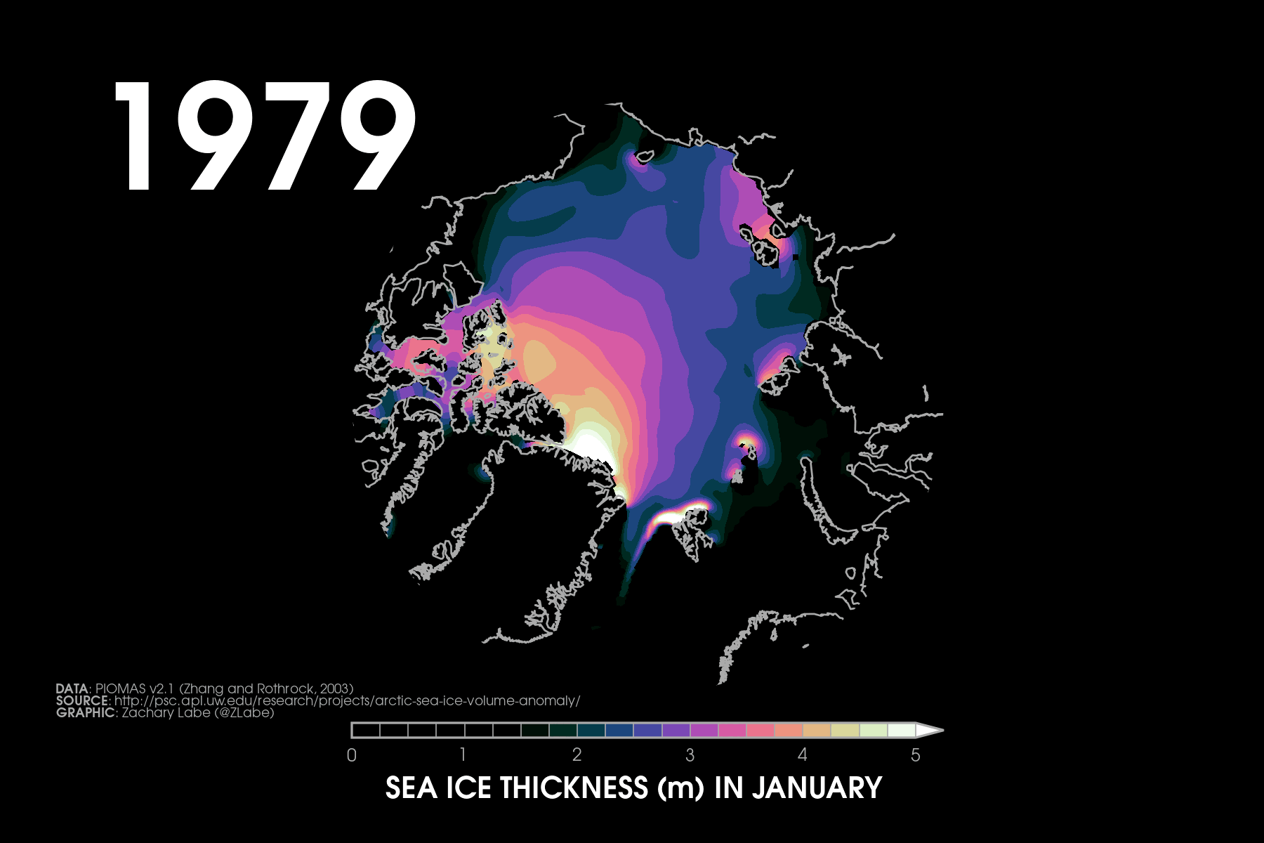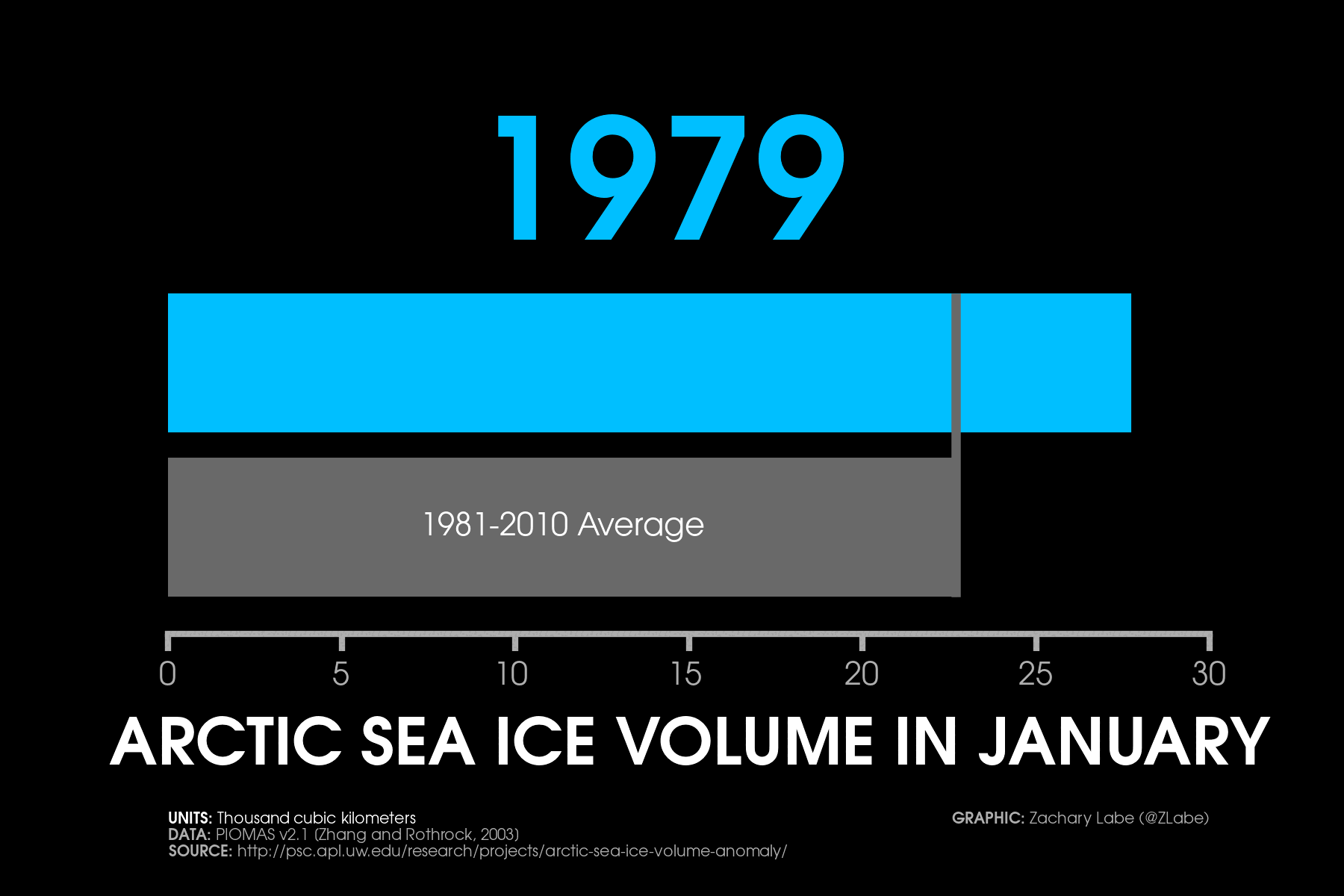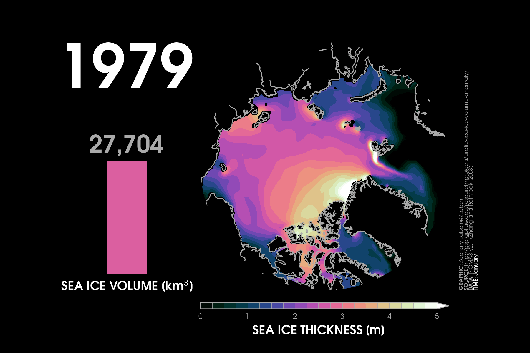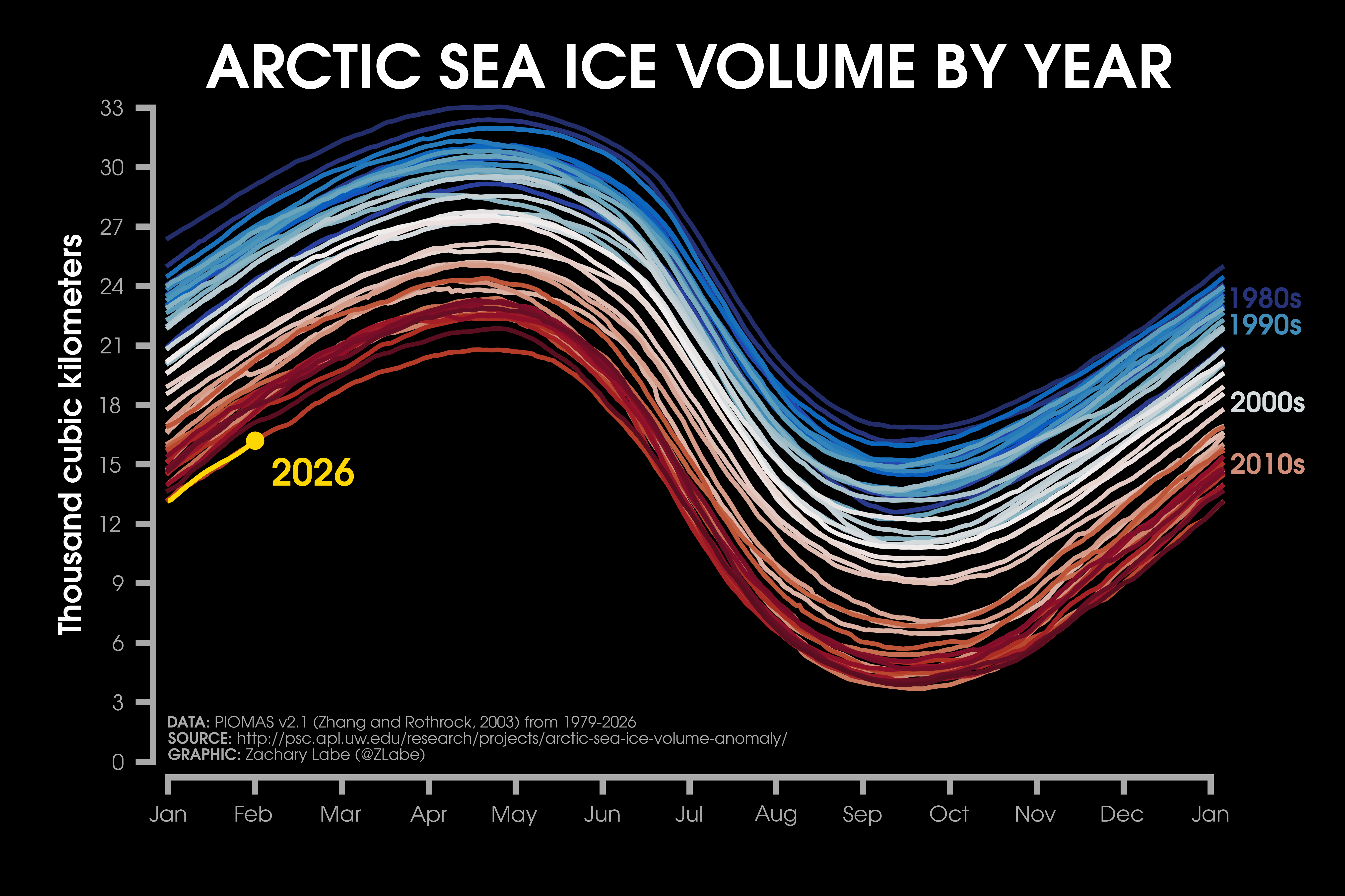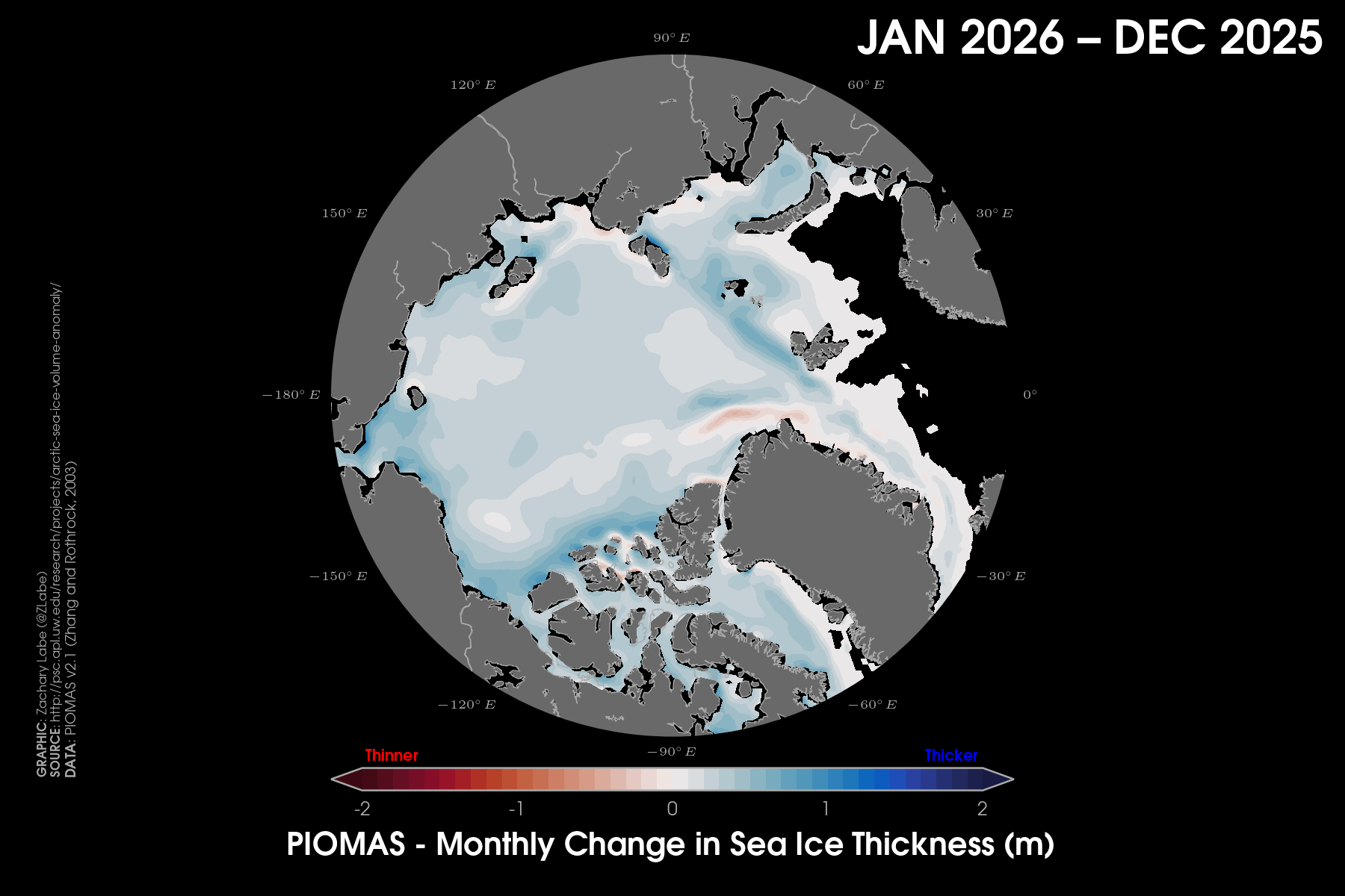 Trends in sea ice thickness/volume are another important indicator of Arctic climate change. While sea ice thickness observations are sparse, here we utilize the ocean and sea ice model, PIOMAS (Zhang and Rothrock, 2003), to visualize January sea ice thickness and volume from 1979 to 2026. Updated for January 2026.Current simulated (PIOMAS; Zhang and Rothrock, 2003) sea ice thickness and anomalies (1981-2010 baseline) updated for January 2026.Simulated (PIOMAS; Zhang and Rothrock, 2003) sea ice thickness anomalies for each January from 2012 to 2026. Note that anomalies are calculated using a recent baseline of 2010-2025, which is a period of substantial Arctic sea-ice loss.Current one month change in simulated (PIOMAS; Zhang and Rothrock, 2003) sea ice thickness from December 2025 to January 2026. Updated 2/7/2026.Current Arctic sea ice thickness derived from weekly sea ice thickness maps based on CryoSat-2/Sentinel-3/SMOS data fusion (Level 4, Version 3.0; Ricker et al. 2017) and its difference compared to the previous year. This graphic will only be updated during winter months (October-April), which is when satellite estimates of sea ice thickness are available. Updated for February 1-7, 2026.Current Arctic sea ice thickness (interpolated and smoothed field) derived from ICESat-2 (L4 Monthly Gridded Sea Ice Thickness, Version 4; Petty et al. 2025) and its difference compared to the previous year. This graphic will only be updated during winter months (September-April), which is when satellite estimates of sea ice thickness are available. Updated for April 2025. Graphic produced on 1/11/2026.Current simulated (PIOMAS; Zhang and Rothrock, 2003) sea ice thickness for every January from 1979 to 2026. Updated 2/7/2026.Latest PIOMAS (model; Zhang and Rothrock, 2003) sea ice volume (SIV) across the Arctic (updated for January 2026).Latest PIOMAS (Zhang and Rothrock, 2003) simulated sea ice volume (SIV) across the Arctic (updated through January 2026).Latest PIOMAS (Zhang and Rothrock, 2003) simulated sea ice thickness (SIT) across the Arctic (updated through January 2026).Time series showing Arctic sea-ice volume for every December from 1901 to 2010 using PIOMAS-20C and from 1979 to 2026 using PIOMAS-v2.1. Thin dashed lines using a lowess smoothing fit are shown for each ice-ocean reanalysis dataset. Graphic updated 2/9/2026.Trends in sea ice thickness are another important indicator of Arctic climate change. While sea ice thickness observations are sparse, here we utilize the ocean and sea ice model, PIOMAS (Zhang and Rothrock, 2003), to visualize mean monthly sea ice thickness from 1979 to 2026. Updated through January 2026.Mean Arctic sea-ice thickness for each month from January 2011 to December 2024 from CryoSat-2 (ESA CCI Climate Data Record (CDRv2), ESA CCI Interim Climate Data Record (ICDRv3)). Satellite-derived observations of sea-ice thickness are not available during the melt season. Figure itself was updated April 2025.Trends in sea ice thickness/volume are another important indicator of Arctic climate change. While sea ice thickness observations are sparse, here we utilize the ocean and sea ice model, PIOMAS (Zhang and Rothrock, 2003), to visualize January sea ice thickness from 1979 to 2026. Sea ice less than 1.5 meters is masked out (black) to emphasize the loss of thicker, older ice. Updated through January 2026.Daily Arctic sea ice volume anomalies stretching from 1 January 1979 to 31 January 2026 (PIOMAS; Zhang and Rothrock, 2003). Anomalies are calculated from a climatological baseline of 1981-2010 (updated 2/9/2026).Changes in the annual maximum and minimum of daily Arctic sea-ice volume simulated from PIOMAS (Zhang and Rothrock, 2003). Trends are calculated using a linear least squares fit for the white dashed lines between 1979 and 2025. Graphic updated 12/6/2025.Daily Arctic sea ice thickness (PIOMASv2.1; Zhang and Rothrock, 2003) from 1 January 1979 through 31 December 2025.Daily Arctic sea ice thickness anomalies (PIOMASv2.1; Zhang and Rothrock, 2003) from 1 January 1979 through 31 December 2025. Anomalies are calculated from an averaged 1981-2010 baseline.Daily Arctic sea ice thickness anomalies (PIOMASv2.1; Zhang and Rothrock, 2003) from 1 January 1979 through 31 December 2025. Data are standardized using a 1979-2025 baseline.Arctic sea ice volume rankings (1 = lowest, 47 = highest) from the Pan-Arctic Ice Ocean Modeling and Assimilation System (PIOMAS v2.1, Zhang and Rothrock, 2003). Figured updated through December 2025. Graphic is modified from Labe et al. [2018]. Graphic updated on 1/6/2026.