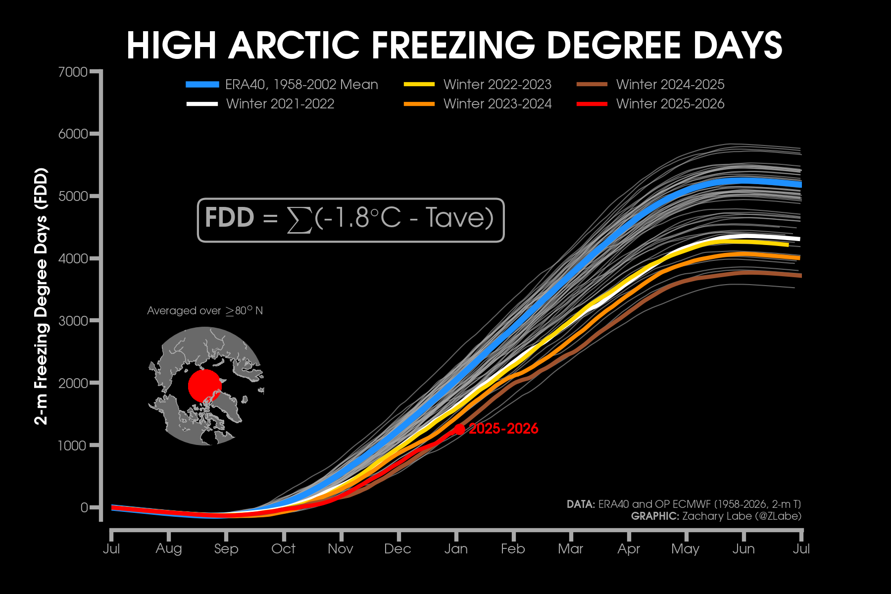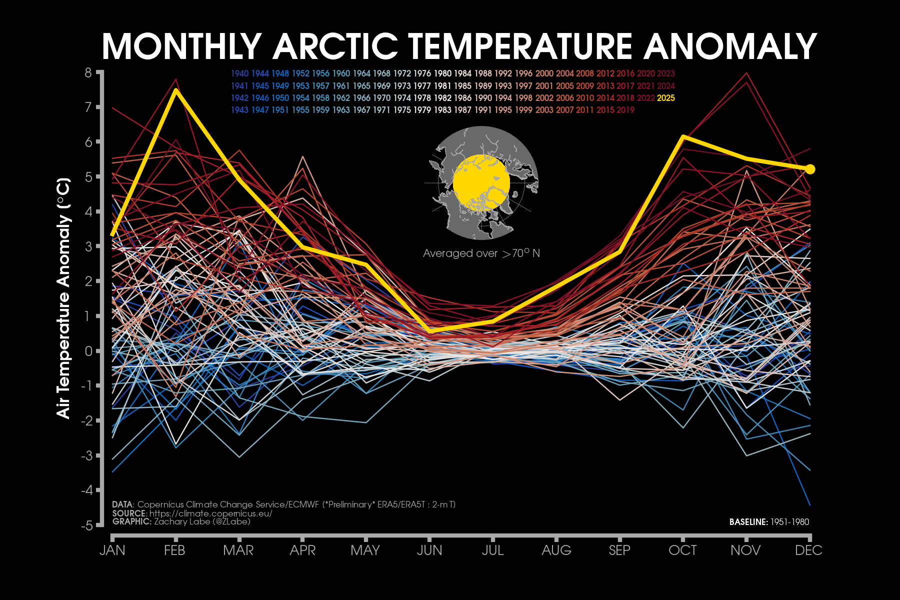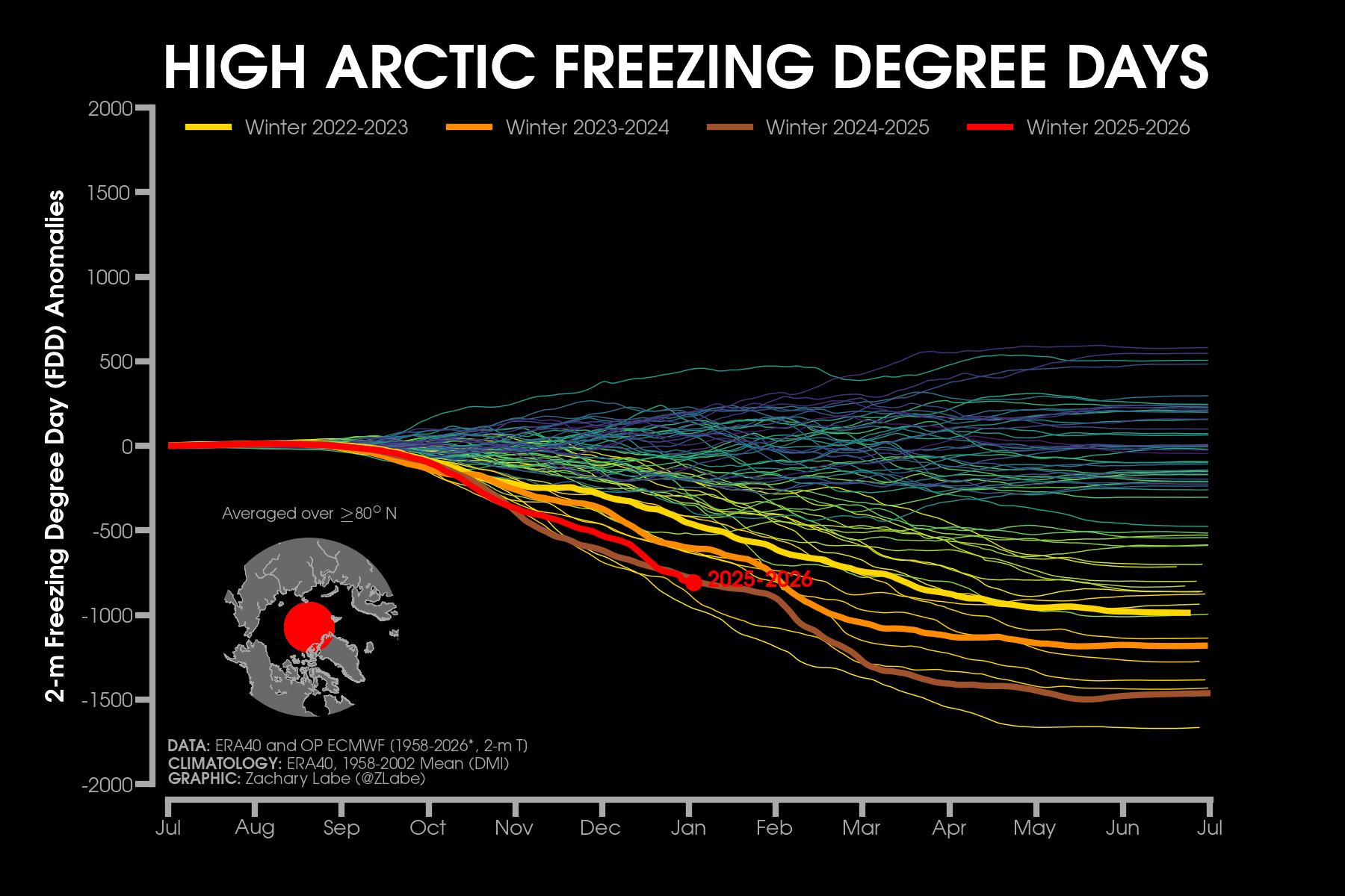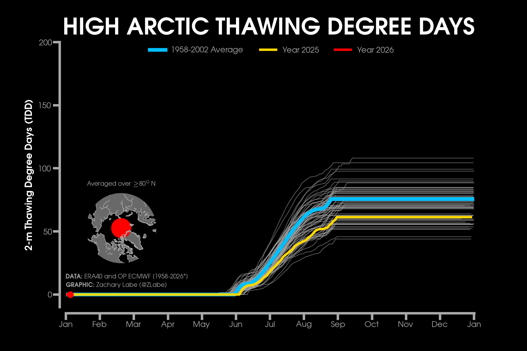Monthly 2-m air temperatures for the Arctic using ERA5 reanalysis (area averaged north of 70°N). Individual years from 1940-2024 are shown by the sequential blue to white lines. 2025 is indicated by the red line. Due to preliminary data from ERA5T (for 2025), this graphic will be updated at a 1-month lag. Updated through December 2025.Monthly 2-m air temperature anomalies for the Arctic using ERA5 reanalysis (area averaged north of 70°N). Individual years from 1940-2024 are shown by the sequential blue to red lines. 2025 is indicated by the yellow line. Due to preliminary data from ERA5T (for 2025), this graphic will be updated at a 1-month lag. Anomalies are calculated from a 1951-1980 climate baseline. Updated through December 2025.2025’s monthly 2-m air temperature anomalies for six regions in the Arctic using ERA5 reanalysis. Shading indicates the maximum and minimum temperature anomalies for each month over the 1940-2024 period of record. Due to preliminary data from ERA5T (for 2025), this graphic will be updated at a 1-month lag. Anomalies are calculated from a 1951-1980 climate baseline. Updated through December 2025.Monthly mean near-surface air temperatures and anomalies for December 2025 in the Arctic. Anomalies are computed relative to a 1981-2010 baseline. Data is from ERA5 reanalysis.Monthly temperature anomalies from ERA5 reanalysis of 2-m air temperatures in the Arctic using definitions latitudinal definitions for 2025. Anomalies are computed relative to a climatological baseline of 1981-2010. Figure is updated through December 2025.Daily 2 m surface air temperature for the Arctic averaged above 80°N. Individual years from 1958-2025 are shown by the sequential blue/purple to yellow lines. 2026 is indicated by the red line. ERA40 has been applied for the 1958-2002 climatology (white line), while the operational ECMWF is used for the current year. This figure is modified from the Danish Meteorological Institute with more information available at http://ocean.dmi.dk/arctic/meant80n.uk.php.Total freezing degree days (FDD) in the Arctic (80°N+) calculated from ERA40 and ECMWF. Data modified from http://ocean.dmi.dk/arctic/meant80n.uk.php (DMI) and updated through 2026. FDD are summed over the differences from the freezing point of sea water (-1.8°C).Total freezing degree days (FDD) anomalies in the Arctic (80°N+) calculated from ERA40 and ECMWF. Data modified from http://ocean.dmi.dk/arctic/meant80n.uk.php (DMI) and updated through 2026. FDD are summed over the differences from the freezing point of sea water (-1.8°C). Anomalies are calculated from the ERA40 1958-2002 mean.Total thawing degree days (TDD) in the Arctic (80°N+) calculated from ERA40 and ECMWF. Data modified from http://ocean.dmi.dk/arctic/meant80n.uk.php (DMI) and updated through 2026. TDD are summed over the differences above the freezing point of sea water (-1.8°C).Annual average 2-m temperature anomalies in the Arctic (67°N+) for various reanalysis data sets. Anomalies are calculated from a 1981-2010 baseline. NCEP/NCAR (R1) is available from 1948 to 2024 at https://www.esrl.noaa.gov/psd/data/gridded/data.ncep.reanalysis.html. NCEP-DOE (R2) is available from 1979 to 2024 at https://www.esrl.noaa.gov/psd/data/gridded/data.ncep.reanalysis2.html. CFSR data is available from 1979 to 2024 at https://rda.ucar.edu/datasets/ds093.1/. MERRA-2 is available from 1980 to 2024 at https://gmao.gsfc.nasa.gov/reanalysis/MERRA-2/. JRA-55 is available from 1958 to 2023 at http://jra.kishou.go.jp/JRA-55/index_en.html. ERA-Interim (ERAi) is available from 1979 to 2018 at https://www.ecmwf.int/en/research/climate-reanalysis/era-interim. ERA5 is available from 1979-2024 at https://apps.ecmwf.int/data-catalogues/era5/. Tools including the NOAA/ESRL Physical Sciences Division Web-based Reanalysis Intercomparison Tool: Monthly/Seasonal Time Series (WRIT) have been used for the construction of this plot. Analysis will updated as annual data becomes available. Additional reanalysis data sets will also be added with time. Graphic was last updated on 2/2/2025.Annual average surface/2-m temperature anomalies in the Arctic (67°N+) for various reanalysis data sets. Anomalies are calculated from a 1981-2010 baseline. GISS Surface Temperature Analysis (GISTEMP) is available from 1880 to 2024 at https://data.giss.nasa.gov/gistemp/. Berkeley Earth Surface Temperature (Berkeley) is available from 1850 to 2024 at http://berkeleyearth.org/data/. NOAA Merged Land Ocean Global Surface Temperature Analysis (NOAAGlobalTemp) is available from 1850 to 2024 at https://www.ncei.noaa.gov/products/land-based-station/noaa-global-temp. Twentieth Century Reanalysis (20CRv2c) is available from 1851 to 2014 at https://www.esrl.noaa.gov/psd/data/gridded/data.20thC_ReanV2c.pressure.html. NOAA-CIRES-DOE Twentieth Century Reanalysis (20CRv3) is available from 1836 to 2015 at https://www.esrl.noaa.gov/psd/data/gridded/data.20thC_ReanV3.html. ERA-20C is available from 1900 to 2010 at http://apps.ecmwf.int/datasets/data/era20c-daily/levtype=sfc/type=an/. JRA-55 is available from 1958 to 2023 at http://jra.kishou.go.jp/JRA-55/index_en.html. ERA5 is available from 1979-2024 at https://apps.ecmwf.int/data-catalogues/era5/. Tools including the NOAA/ESRL Physical Sciences Division Web-based Reanalysis Intercomparison Tool: Monthly/Seasonal Time Series (WRIT) were used for the construction of this plot. Analysis will be updated as annual data becomes available. Graphic was last updated on 2/9/2025.Annual mean surface air temperature anomalies for the Arctic (67-90°N) and for the Global average (90°S-90°N) from 1950 to 2024. Linear trend lines (dashed) are also shown over the 1990 to 2024 period. GISS Surface Temperature Analysis (GISTEMPv4) is available from 1880 to 2024 at https://data.giss.nasa.gov/gistemp/. Tools including the NOAA/ESRL Physical Sciences Division Web-based Reanalysis Intercomparison Tool: Monthly/Seasonal Time Series (WRIT) have been used f