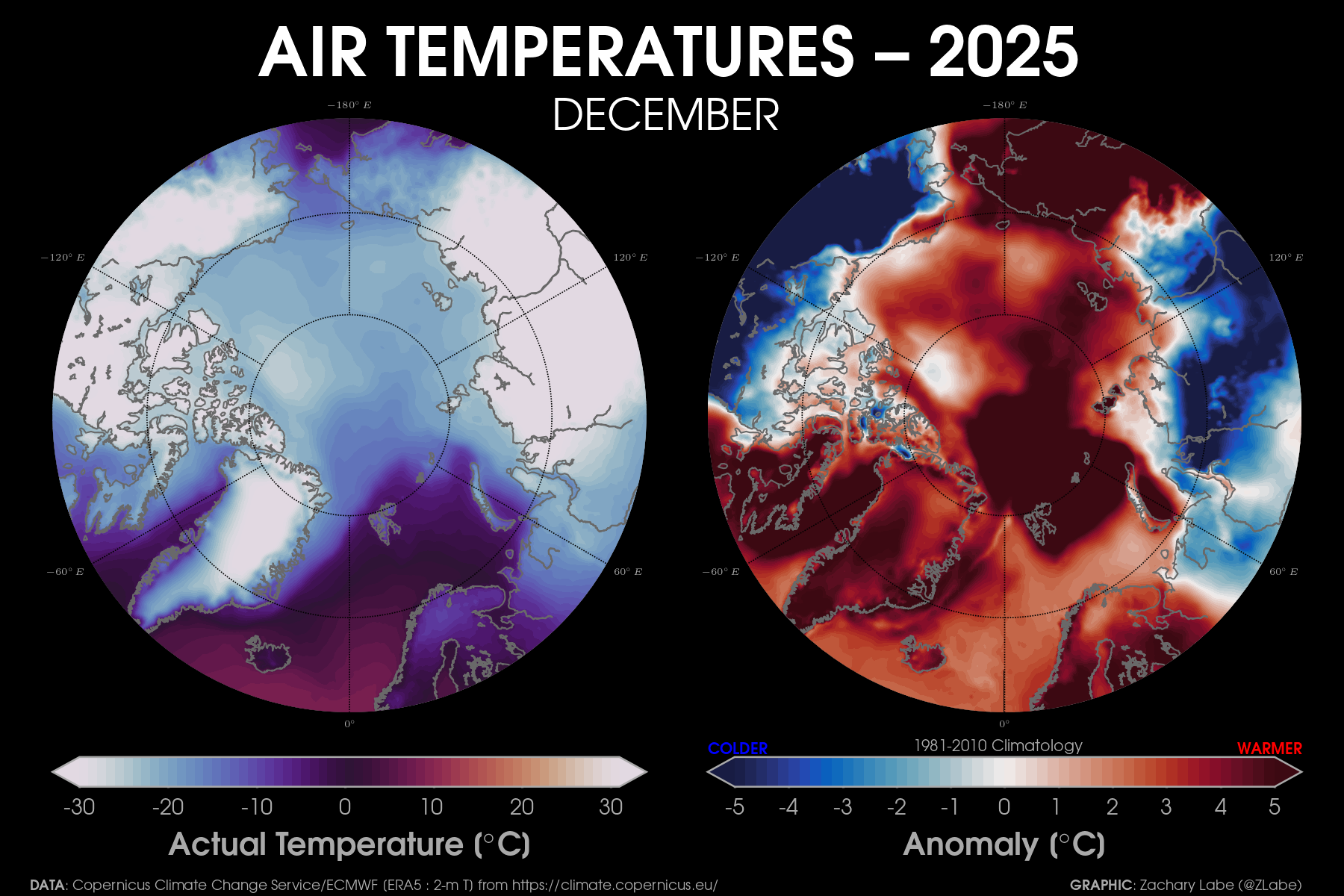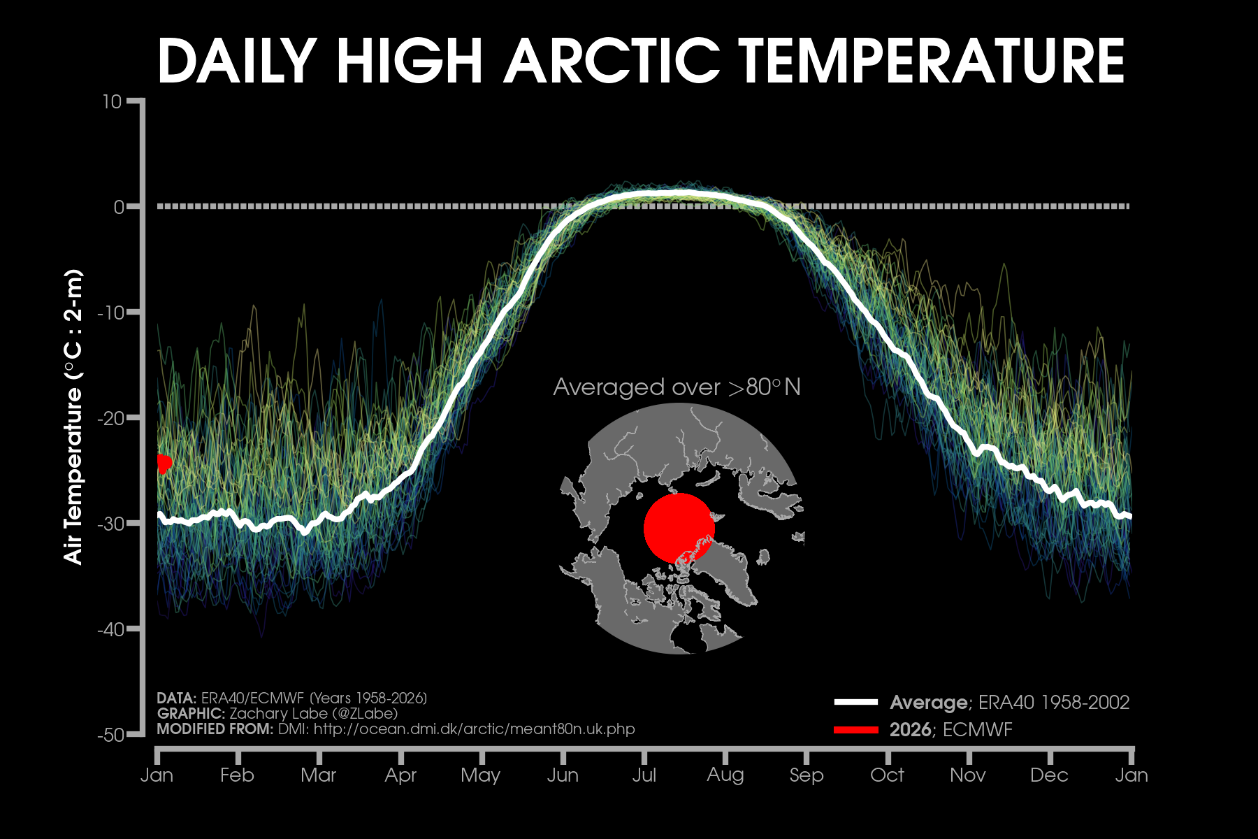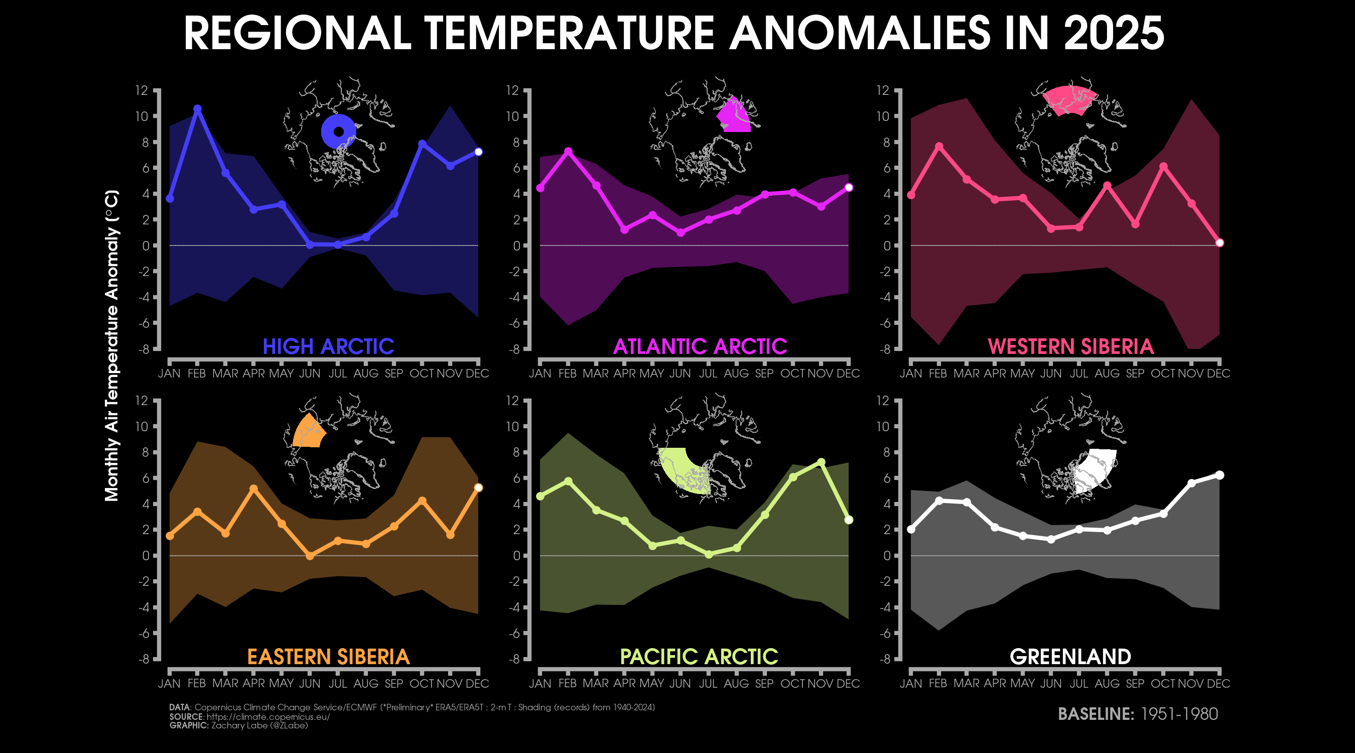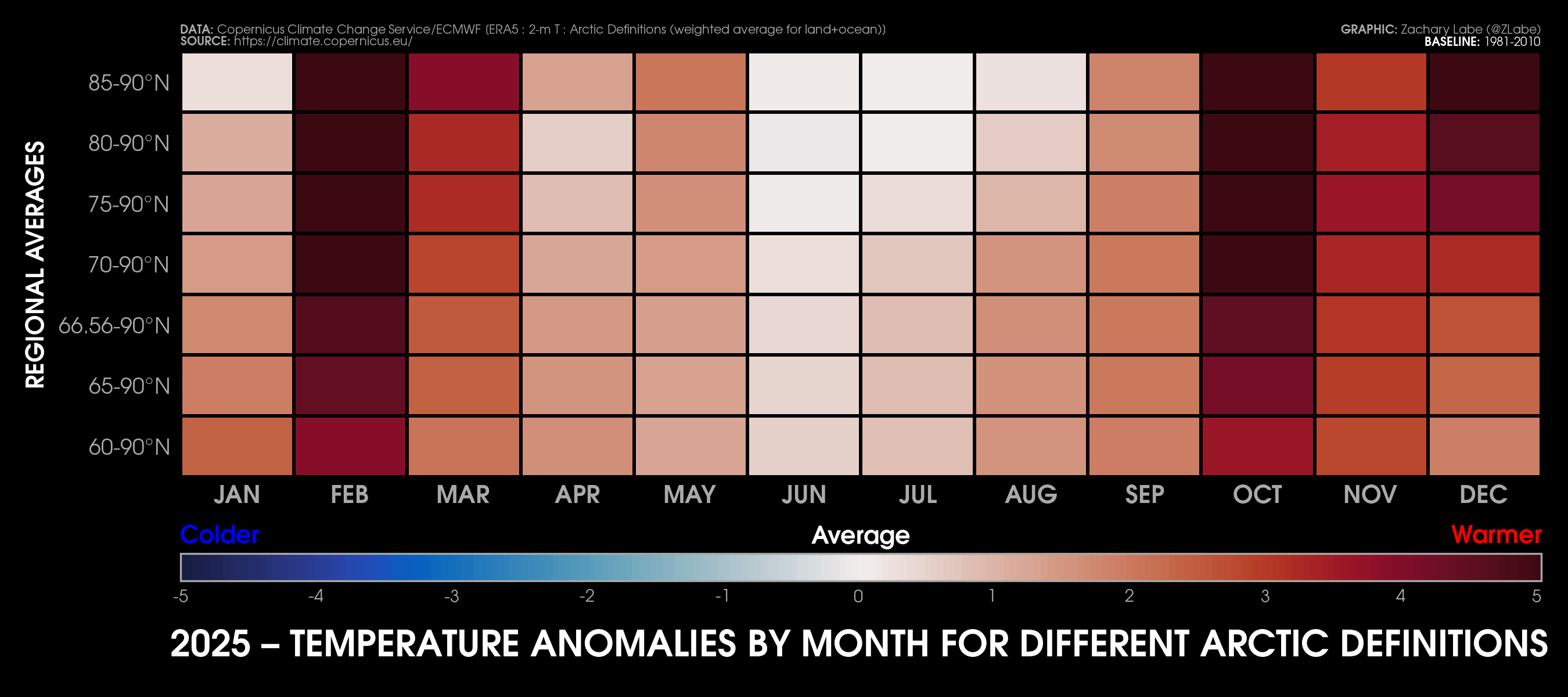 Monthly 2-m air temperatures for the Arctic using ERA5 reanalysis (area averaged north of 70°N). Individual years from 1940-2024 are shown by the sequential blue to white lines. 2025 is indicated by the red line. Due to preliminary data from ERA5T (for 2025), this graphic will be updated at a 1-month lag. Updated through December 2025.Monthly 2-m air temperature anomalies for the Arctic using ERA5 reanalysis (area averaged north of 70°N). Individual years from 1940-2024 are shown by the sequential blue to red lines. 2025 is indicated by the yellow line. Due to preliminary data from ERA5T (for 2025), this graphic will be updated at a 1-month lag. Anomalies are calculated from a 1951-1980 climate baseline. Updated through December 2025.2025’s monthly 2-m air temperature anomalies for six regions in the Arctic using ERA5 reanalysis. Shading indicates the maximum and minimum temperature anomalies for each month over the 1940-2024 period of record. Due to preliminary data from ERA5T (for 2025), this graphic will be updated at a 1-month lag. Anomalies are calculated from a 1951-1980 climate baseline. Updated through December 2025.Monthly mean near-surface air temperatures and anomalies for December 2025 in the Arctic. Anomalies are computed relative to a 1981-2010 baseline. Data is from ERA5 reanalysis.Monthly temperature anomalies from ERA5 reanalysis of 2-m air temperatures in the Arctic using definitions latitudinal definitions for 2025. Anomalies are computed relative to a climatological baseline of 1981-2010. Figure is updated through December 2025.Daily 2 m surface air temperature for the Arctic averaged above 80°N. Individual years from 1958-2025 are shown by the sequential blue/purple to yellow lines. 2026 is indicated by the red line. ERA40 has been applied for the 1958-2002 climatology (white line), while the operational ECMWF is used for the current year. This figure is modified from the Danish Meteorological Institute with more information available at http://ocean.dmi.dk/arctic/meant80n.uk.php.Total freezing degree days (FDD) in the Arctic (80°N+) calculated from ERA40 and ECMWF. Data modified from http://ocean.dmi.dk/arctic/meant80n.uk.php (DMI) and updated through 2026. FDD are summed over the differences from the freezing point of sea water (-1.8°C).Total freezing degree days (FDD) anomalies in the Arctic (80°N+) calculated from ERA40 and ECMWF. Data modified from http://ocean.dmi.dk/arctic/meant80n.uk.php (DMI) and updated through 2026. FDD are summed over the differences from the freezing point of sea water (-1.8°C). Anomalies are calculated from the ERA40 1958-2002 mean.Total thawing degree days (TDD) in the Arctic (80°N+) calculated from ERA40 and ECMWF. Data modified from http://ocean.dmi.dk/arctic/meant80n.uk.php (DMI) and updated through 2026. TDD are summed over the differences above the freezing point of sea water (-1.8°C).Annual average 2-m temperature anomalies in the Arctic (67°N+) for various reanalysis data sets. Anomalies are calculated from a 1981-2010 baseline. NCEP/NCAR (R1) is available from 1948 to 2024 at https://www.esrl.noaa.gov/psd/data/gridded/data.ncep.reanalysis.html. NCEP-DOE (R2) is available from 1979 to 2024 at https://www.esrl.noaa.gov/psd/data/gridded/data.ncep.reanalysis2.html. CFSR data is available from 1979 to 2024 at https://rda.ucar.edu/datasets/ds093.1/. MERRA-2 is available from 1980 to 2024 at https://gmao.gsfc.nasa.gov/reanalysis/MERRA-2/. JRA-55 is available from 1958 to 2023 at http://jra.kishou.go.jp/JRA-55/index_en.html. ERA-Interim (ERAi) is available from 1979 to 2018 at https://www.ecmwf.int/en/research/climate-reanalysis/era-interim. ERA5 is available from 1979-2024 at https://apps.ecmwf.int/data-catalogues/era5/. Tools including the NOAA/ESRL Physical Sciences Division Web-based Reanalysis Intercomparison Tool: Monthly/Seasonal Time Series (WRIT) have been used for the construction of this plot. Analysis will updated as annual data becomes available. Additional reanalysis data sets will also be added with time. Graphic was last updated on 2/2/2025.Annual average surface/2-m temperature anomalies in the Arctic (67°N+) for various reanalysis data sets. Anomalies are calculated from a 1981-2010 baseline. GISS Surface Temperature Analysis (GISTEMP) is available from 1880 to 2024 at https://data.giss.nasa.gov/gistemp/. Berkeley Earth Surface Temperature (Berkeley) is available from 1850 to 2024 at http://berkeleyearth.org/data/. NOAA Merged Land Ocean Global Surface Temperature Analysis (NOAAGlobalTemp) is available from 1850 to 2024 at https://www.ncei.noaa.gov/products/land-based-station/noaa-global-temp. Twentieth Century Reanalysis (20CRv2c) is available from 1851 to 2014 at https://www.esrl.noaa.gov/psd/data/gridded/data.20thC_ReanV2c.pressure.html. NOAA-CIRES-DOE Twentieth Century Reanalysis (20CRv3) is available from 1836 to 2015 at https://www.esrl.noaa.gov/psd/data/gridded/data.20thC_ReanV3.html. ERA-20C is available from 1900 to 2010 at http://apps.ecmwf.int/datasets/data/era20c-daily/levtype=sfc/type=an/. JRA-55 is available from 1958 to 2023 at http://jra.kishou.go.jp/JRA-55/index_en.html. ERA5 is available from 1979-2024 at https://apps.ecmwf.int/data-catalogues/era5/. Tools including the NOAA/ESRL Physical Sciences Division Web-based Reanalysis Intercomparison Tool: Monthly/Seasonal Time Series (WRIT) were used for the construction of this plot. Analysis will be updated as annual data becomes available. Graphic was last updated on 2/9/2025.Annual mean surface air temperature anomalies for the Arctic (67-90°N) and for the Global average (90°S-90°N) from 1950 to 2024. Linear trend lines (dashed) are also shown over the 1990 to 2024 period. GISS Surface Temperature Analysis (GISTEMPv4) is available from 1880 to 2024 at https://data.giss.nasa.gov/gistemp/. Tools including the NOAA/ESRL Physical Sciences Division Web-based Reanalysis Intercomparison Tool: Monthly/Seasonal Time Series (WRIT) have been used f