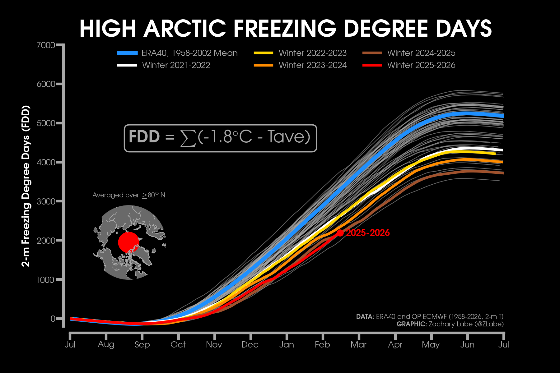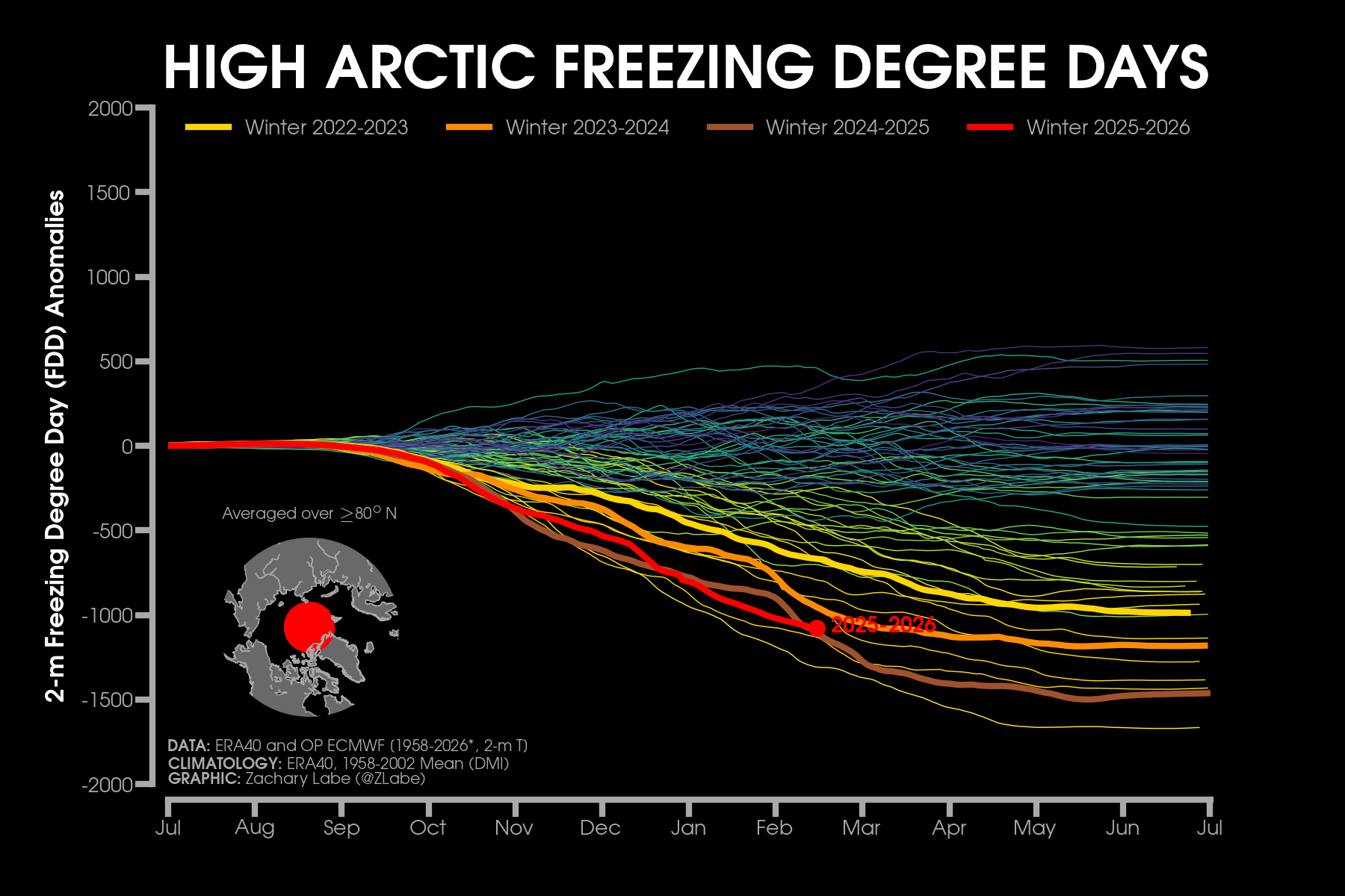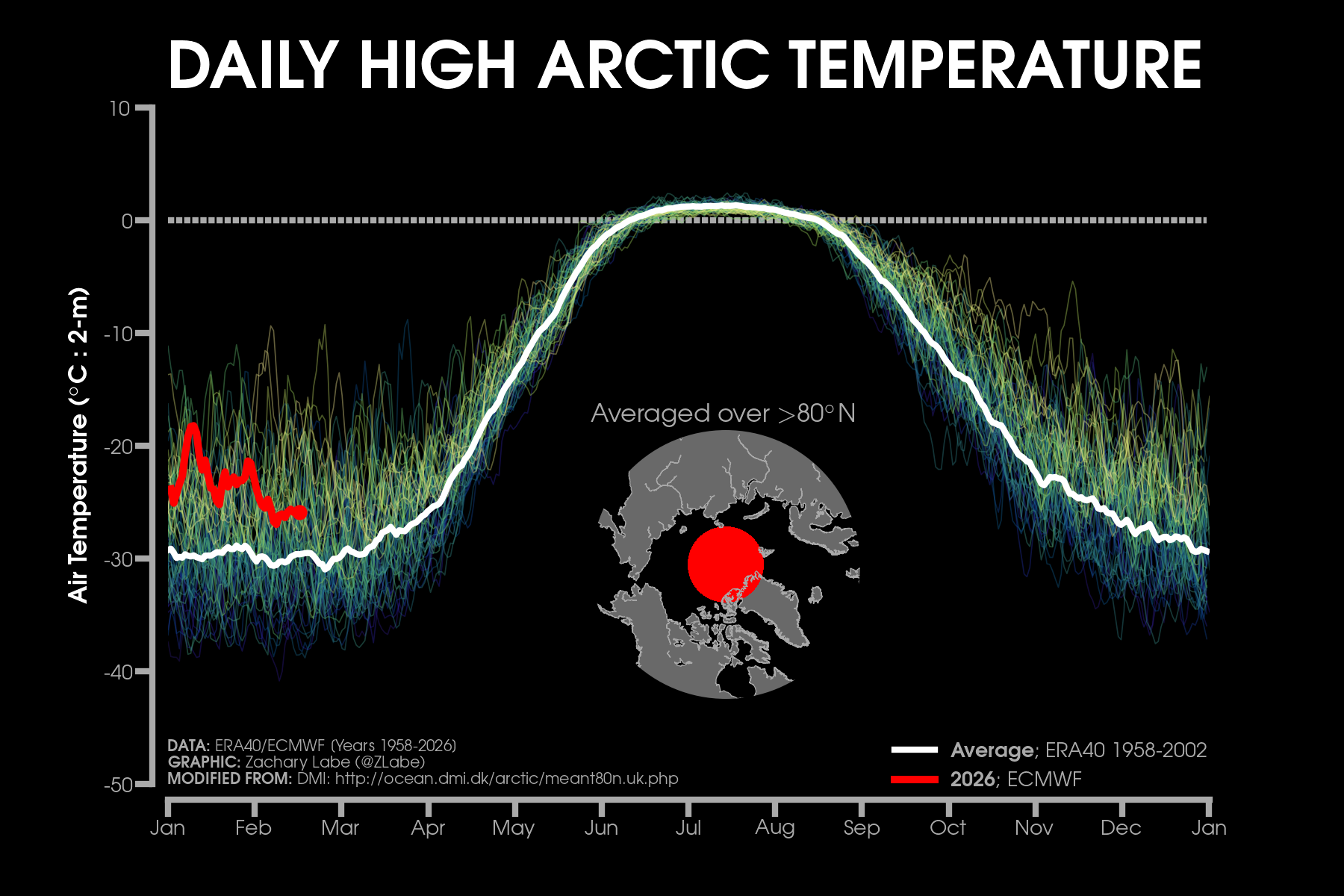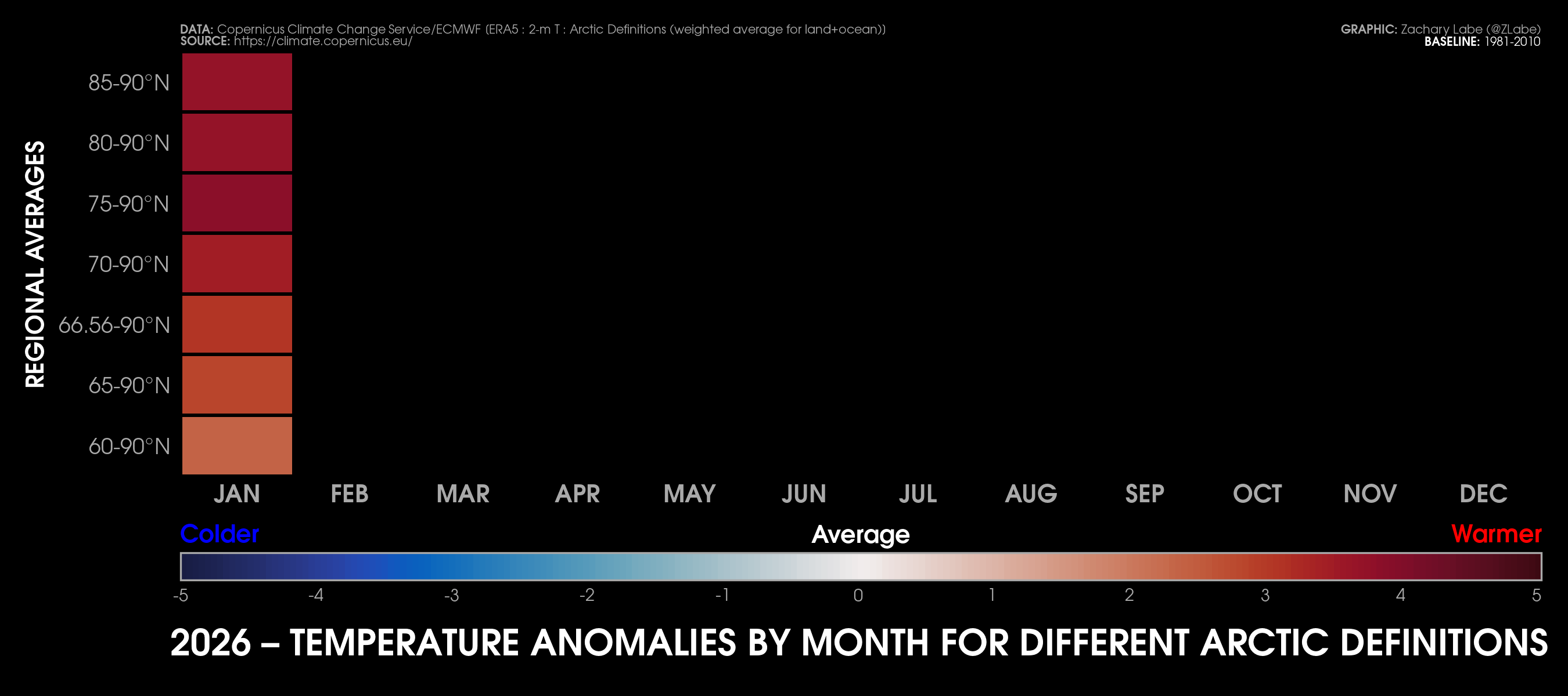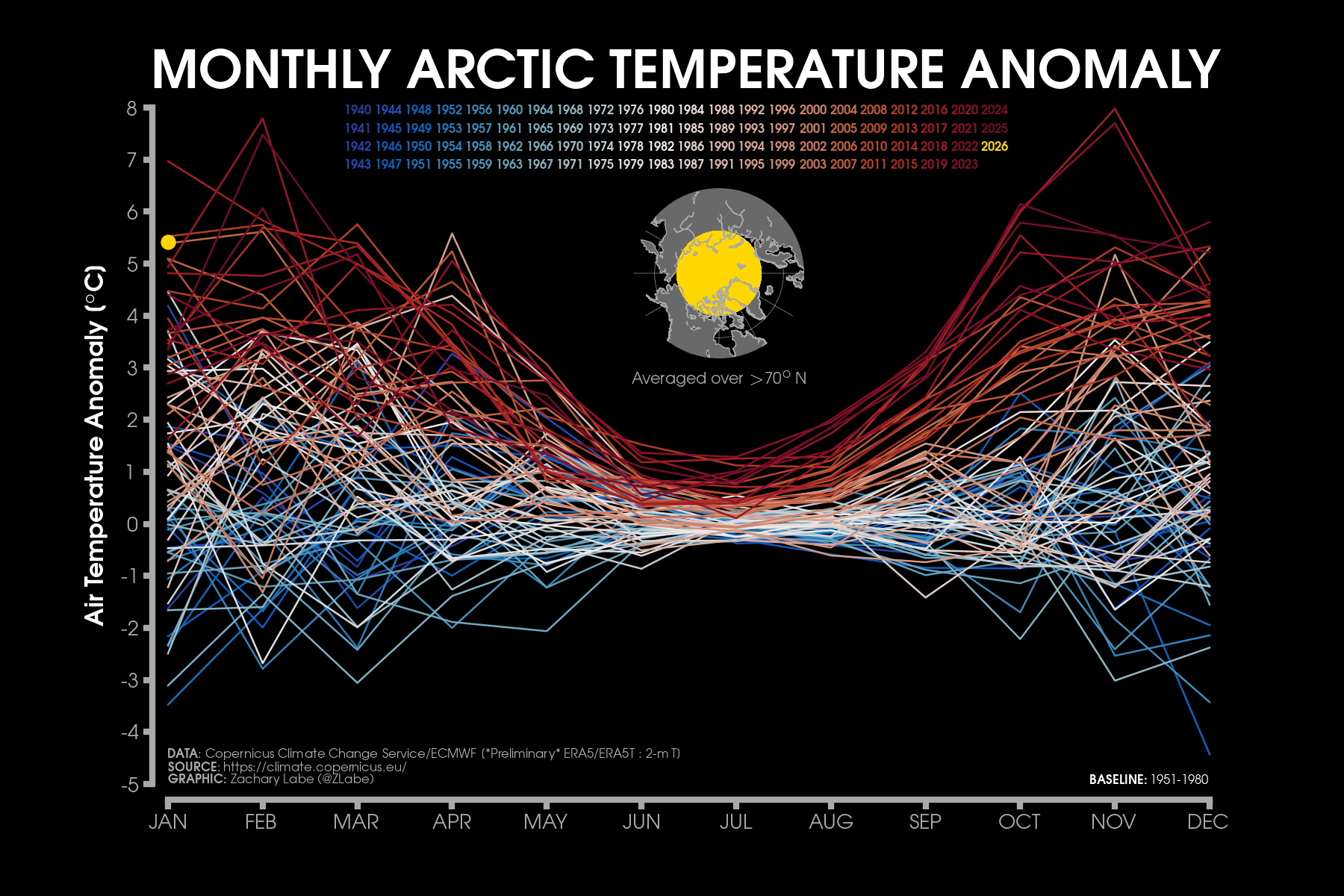 Monthly 2-m air temperatures for the Arctic using ERA5 reanalysis (area averaged north of 70°N). Individual years from 1940-2025 are shown by the sequential blue to white lines. 2026 is indicated by the red line. Due to preliminary data from ERA5T (for 2026), this graphic will be updated at a 1-month lag. Updated through January 2026.Monthly 2-m air temperature anomalies for the Arctic using ERA5 reanalysis (area averaged north of 70°N). Individual years from 1940-2025 are shown by the sequential blue to red lines. 2026 is indicated by the yellow line. Due to preliminary data from ERA5T (for 2026), this graphic will be updated at a 1-month lag. Anomalies are calculated from a 1951-1980 climate baseline. Updated through January 2026.2026’s monthly 2-m air temperature anomalies for six regions in the Arctic using ERA5 reanalysis. Shading indicates the maximum and minimum temperature anomalies for each month over the 1940-2025 period of record. Due to preliminary data from ERA5T (for 2026), this graphic will be updated at a 1-month lag. Anomalies are calculated from a 1951-1980 climate baseline. Updated through January 2026.Monthly mean near-surface air temperatures and anomalies for January 2026 in the Arctic. Anomalies are computed relative to a 1981-2010 baseline. Data is from ERA5 reanalysis.Monthly temperature anomalies from ERA5 reanalysis of 2-m air temperatures in the Arctic using definitions latitudinal definitions for 2026. Anomalies are computed relative to a climatological baseline of 1981-2010. Figure is updated through January 2026.Daily 2 m surface air temperature for the Arctic averaged above 80°N. Individual years from 1958-2025 are shown by the sequential blue/purple to yellow lines. 2026 is indicated by the red line. ERA40 has been applied for the 1958-2002 climatology (white line), while the operational ECMWF is used for the current year. This figure is modified from the Danish Meteorological Institute with more information available at http://ocean.dmi.dk/arctic/meant80n.uk.php.Total freezing degree days (FDD) in the Arctic (80°N+) calculated from ERA40 and ECMWF. Data modified from http://ocean.dmi.dk/arctic/meant80n.uk.php (DMI) and updated through 2026. FDD are summed over the differences from the freezing point of sea water (-1.8°C).Total freezing degree days (FDD) anomalies in the Arctic (80°N+) calculated from ERA40 and ECMWF. Data modified from http://ocean.dmi.dk/arctic/meant80n.uk.php (DMI) and updated through 2026. FDD are summed over the differences from the freezing point of sea water (-1.8°C). Anomalies are calculated from the ERA40 1958-2002 mean.Total thawing degree days (TDD) in the Arctic (80°N+) calculated from ERA40 and ECMWF. Data modified from http://ocean.dmi.dk/arctic/meant80n.uk.php (DMI) and updated through 2026. TDD are summed over the differences above the freezing point of sea water (-1.8°C).Annual average 2-m temperature anomalies in the Arctic (67°N+) for various reanalysis data sets. Anomalies are calculated from a 1981-2010 baseline. NCEP/NCAR (R1) is available from 1948 to 2024 at https://www.esrl.noaa.gov/psd/data/gridded/data.ncep.reanalysis.html. NCEP-DOE (R2) is available from 1979 to 2024 at https://www.esrl.noaa.gov/psd/data/gridded/data.ncep.reanalysis2.html. CFSR data is available from 1979 to 2024 at https://rda.ucar.edu/datasets/ds093.1/. MERRA-2 is available from 1980 to 2024 at https://gmao.gsfc.nasa.gov/reanalysis/MERRA-2/. JRA-55 is available from 1958 to 2023 at http://jra.kishou.go.jp/JRA-55/index_en.html. ERA-Interim (ERAi) is available from 1979 to 2018 at https://www.ecmwf.int/en/research/climate-reanalysis/era-interim. ERA5 is available from 1979-2024 at https://apps.ecmwf.int/data-catalogues/era5/. Tools including the NOAA/ESRL Physical Sciences Division Web-based Reanalysis Intercomparison Tool: Monthly/Seasonal Time Series (WRIT) have been used for the construction of this plot. Analysis will updated as annual data becomes available. Additional reanalysis data sets will also be added with time. Graphic was last updated on 2/2/2025.Annual average surface/2-m temperature anomalies in the Arctic (67°N+) for various reanalysis data sets. Anomalies are calculated from a 1981-2010 baseline. GISS Surface Temperature Analysis (GISTEMP) is available from 1880 to 2025 at https://data.giss.nasa.gov/gistemp/. Berkeley Earth Surface Temperature (Berkeley) is available from 1850 to 2024 at http://berkeleyearth.org/data/. NOAA Merged Land Ocean Global Surface Temperature Analysis (NOAAGlobalTemp) is available from 1850 to 2025 at https://www.ncei.noaa.gov/products/land-based-station/noaa-global-temp. Twentieth Century Reanalysis (20CRv2c) is available from 1851 to 2014 at https://www.esrl.noaa.gov/psd/data/gridded/data.20thC_ReanV2c.pressure.html. NOAA-CIRES-DOE Twentieth Century Reanalysis (20CRv3) is available from 1836 to 2015 at https://www.esrl.noaa.gov/psd/data/gridded/data.20thC_ReanV3.html. ERA-20C is available from 1900 to 2010 at http://apps.ecmwf.int/datasets/data/era20c-daily/levtype=sfc/type=an/. JRA-55 is available from 1958 to 2023 at http://jra.kishou.go.jp/JRA-55/index_en.html. ERA5 is available from 1979-2025 at https://apps.ecmwf.int/data-catalogues/era5/. Tools including the NOAA Physical Sciences Laboratory Web-based Reanalysis Intercomparison Tool: Monthly/Seasonal Time Series (WRIT) were used for the construction of this plot. Analysis will be updated as annual data becomes available. Graphic was last updated on 2/9/2026.Annual mean surface air temperature anomalies for the Arctic (67-90°N) and for the Global average (90°S-90°N) from 1950 to 2025. Linear trend lines (dashed) are also shown over the 1990 to 2025 period. GISS Surface Temperature Analysis (GISTEMPv4) is available from 1880 to 2025 at https://data.giss.nasa.gov/gistemp/. Tools including the NOAA/ESRL Physical Sciences Division Web-based Reanalysis Intercomparison Tool: Monthly/Seasonal Time Series (WRIT) have been used for the c