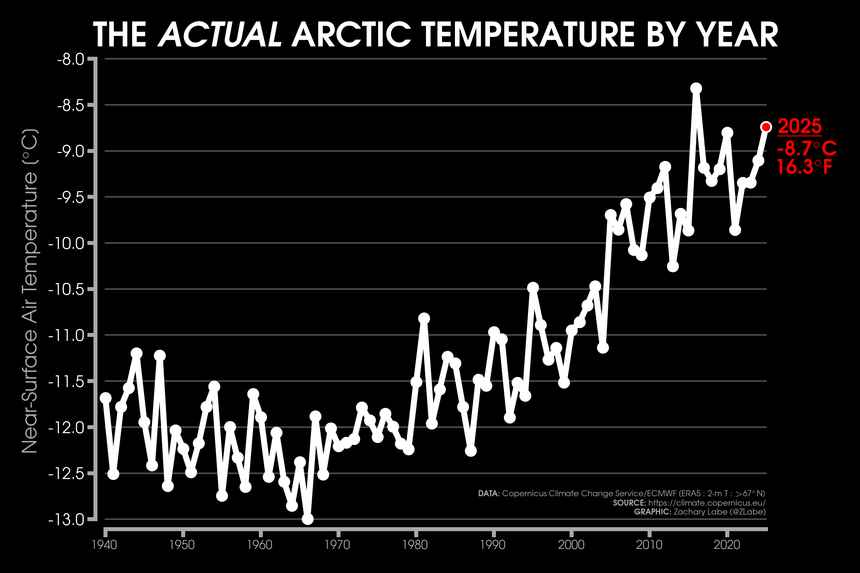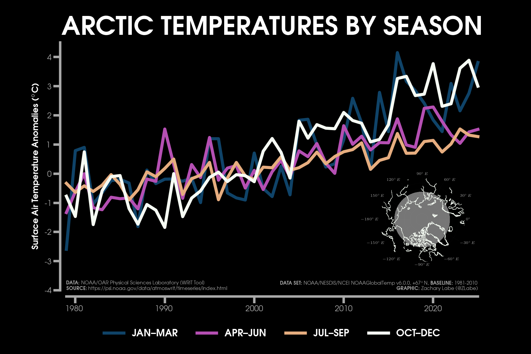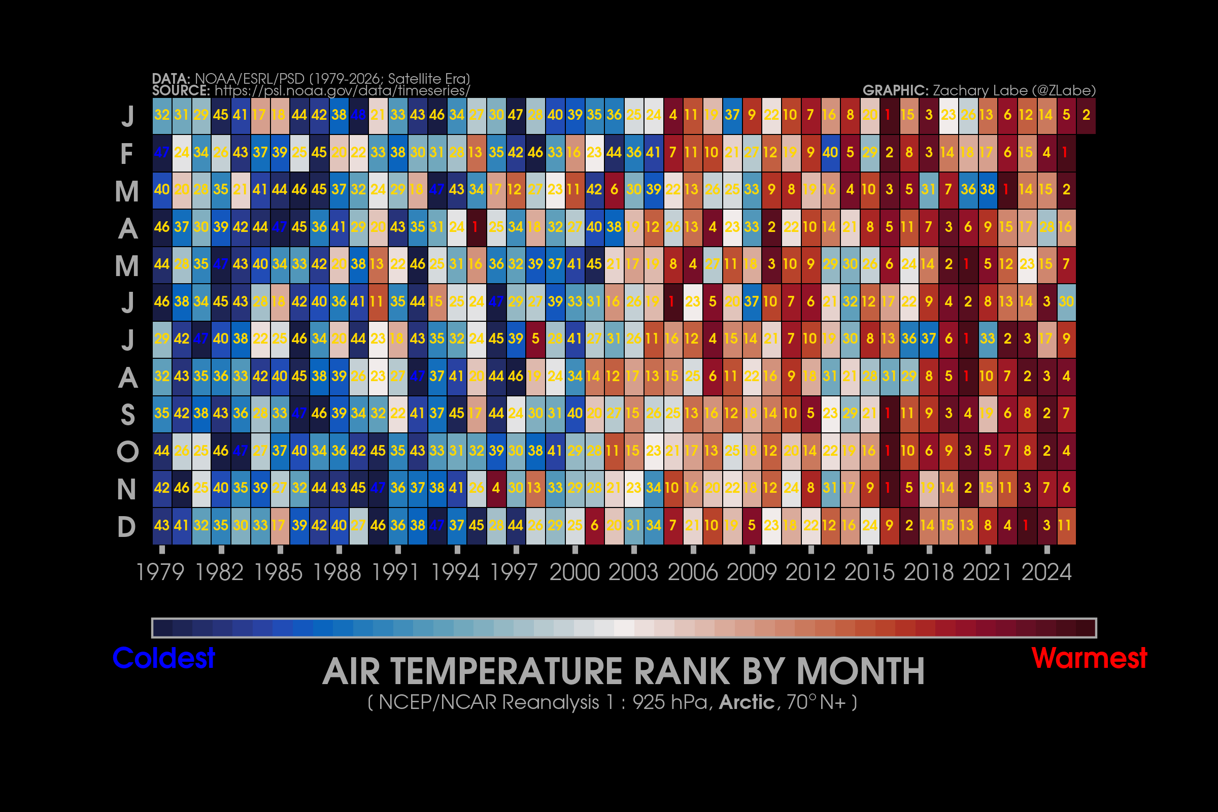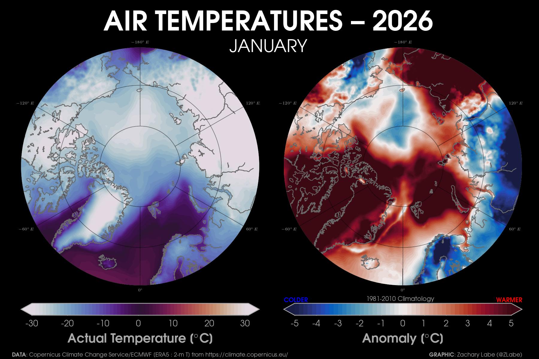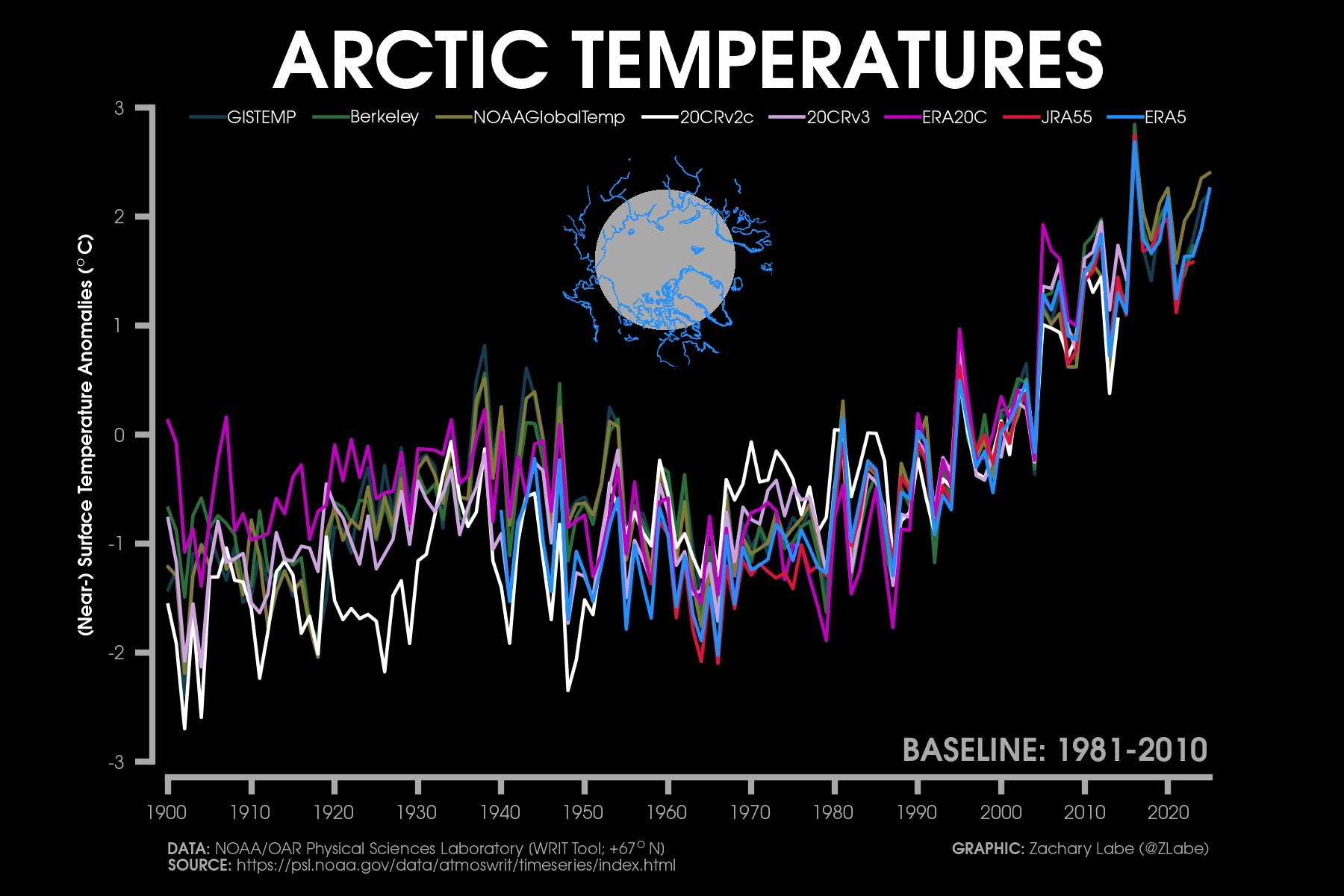 Monthly 2-m air temperatures for the Arctic using ERA5 reanalysis (area averaged north of 70°N). Individual years from 1940-2025 are shown by the sequential blue to white lines. 2026 is indicated by the red line. Due to preliminary data from ERA5T (for 2026), this graphic will be updated at a 1-month lag. Updated through January 2026.Monthly 2-m air temperature anomalies for the Arctic using ERA5 reanalysis (area averaged north of 70°N). Individual years from 1940-2025 are shown by the sequential blue to red lines. 2026 is indicated by the yellow line. Due to preliminary data from ERA5T (for 2026), this graphic will be updated at a 1-month lag. Anomalies are calculated from a 1951-1980 climate baseline. Updated through January 2026.2026’s monthly 2-m air temperature anomalies for six regions in the Arctic using ERA5 reanalysis. Shading indicates the maximum and minimum temperature anomalies for each month over the 1940-2025 period of record. Due to preliminary data from ERA5T (for 2026), this graphic will be updated at a 1-month lag. Anomalies are calculated from a 1951-1980 climate baseline. Updated through January 2026.Monthly mean near-surface air temperatures and anomalies for January 2026 in the Arctic. Anomalies are computed relative to a 1981-2010 baseline. Data is from ERA5 reanalysis.Monthly temperature anomalies from ERA5 reanalysis of 2-m air temperatures in the Arctic using definitions latitudinal definitions for 2026. Anomalies are computed relative to a climatological baseline of 1981-2010. Figure is updated through January 2026.Daily 2 m surface air temperature for the Arctic averaged above 80°N. Individual years from 1958-2025 are shown by the sequential blue/purple to yellow lines. 2026 is indicated by the red line. ERA40 has been applied for the 1958-2002 climatology (white line), while the operational ECMWF is used for the current year. This figure is modified from the Danish Meteorological Institute with more information available at http://ocean.dmi.dk/arctic/meant80n.uk.php.Total freezing degree days (FDD) in the Arctic (80°N+) calculated from ERA40 and ECMWF. Data modified from http://ocean.dmi.dk/arctic/meant80n.uk.php (DMI) and updated through 2026. FDD are summed over the differences from the freezing point of sea water (-1.8°C).Total freezing degree days (FDD) anomalies in the Arctic (80°N+) calculated from ERA40 and ECMWF. Data modified from http://ocean.dmi.dk/arctic/meant80n.uk.php (DMI) and updated through 2026. FDD are summed over the differences from the freezing point of sea water (-1.8°C). Anomalies are calculated from the ERA40 1958-2002 mean.Total thawing degree days (TDD) in the Arctic (80°N+) calculated from ERA40 and ECMWF. Data modified from http://ocean.dmi.dk/arctic/meant80n.uk.php (DMI) and updated through 2026. TDD are summed over the differences above the freezing point of sea water (-1.8°C).Annual average 2-m temperature anomalies in the Arctic (67°N+) for various reanalysis data sets. Anomalies are calculated from a 1981-2010 baseline. NCEP/NCAR (R1) is available from 1948 to 2024 at https://www.esrl.noaa.gov/psd/data/gridded/data.ncep.reanalysis.html. NCEP-DOE (R2) is available from 1979 to 2024 at https://www.esrl.noaa.gov/psd/data/gridded/data.ncep.reanalysis2.html. CFSR data is available from 1979 to 2024 at https://rda.ucar.edu/datasets/ds093.1/. MERRA-2 is available from 1980 to 2024 at https://gmao.gsfc.nasa.gov/reanalysis/MERRA-2/. JRA-55 is available from 1958 to 2023 at http://jra.kishou.go.jp/JRA-55/index_en.html. ERA-Interim (ERAi) is available from 1979 to 2018 at https://www.ecmwf.int/en/research/climate-reanalysis/era-interim. ERA5 is available from 1979-2024 at https://apps.ecmwf.int/data-catalogues/era5/. Tools including the NOAA/ESRL Physical Sciences Division Web-based Reanalysis Intercomparison Tool: Monthly/Seasonal Time Series (WRIT) have been used for the construction of this plot. Analysis will updated as annual data becomes available. Additional reanalysis data sets will also be added with time. Graphic was last updated on 2/2/2025.Annual average surface/2-m temperature anomalies in the Arctic (67°N+) for various reanalysis data sets. Anomalies are calculated from a 1981-2010 baseline. GISS Surface Temperature Analysis (GISTEMP) is available from 1880 to 2025 at https://data.giss.nasa.gov/gistemp/. Berkeley Earth Surface Temperature (Berkeley) is available from 1850 to 2024 at http://berkeleyearth.org/data/. NOAA Merged Land Ocean Global Surface Temperature Analysis (NOAAGlobalTemp) is available from 1850 to 2025 at https://www.ncei.noaa.gov/products/land-based-station/noaa-global-temp. Twentieth Century Reanalysis (20CRv2c) is available from 1851 to 2014 at https://www.esrl.noaa.gov/psd/data/gridded/data.20thC_ReanV2c.pressure.html. NOAA-CIRES-DOE Twentieth Century Reanalysis (20CRv3) is available from 1836 to 2015 at https://www.esrl.noaa.gov/psd/data/gridded/data.20thC_ReanV3.html. ERA-20C is available from 1900 to 2010 at http://apps.ecmwf.int/datasets/data/era20c-daily/levtype=sfc/type=an/. JRA-55 is available from 1958 to 2023 at http://jra.kishou.go.jp/JRA-55/index_en.html. ERA5 is available from 1979-2025 at https://apps.ecmwf.int/data-catalogues/era5/. Tools including the NOAA Physical Sciences Laboratory Web-based Reanalysis Intercomparison Tool: Monthly/Seasonal Time Series (WRIT) were used for the construction of this plot. Analysis will be updated as annual data becomes available. Graphic was last updated on 2/9/2026.Annual mean surface air temperature anomalies for the Arctic (67-90°N) and for the Global average (90°S-90°N) from 1950 to 2025. Linear trend lines (dashed) are also shown over the 1990 to 2025 period. GISS Surface Temperature Analysis (GISTEMPv4) is available from 1880 to 2025 at https://data.giss.nasa.gov/gistemp/. Tools including the NOAA/ESRL Physical Sciences Division Web-based Reanalysis Intercomparison Tool: Monthly/Seasonal Time Series (WRIT) have been used for the c