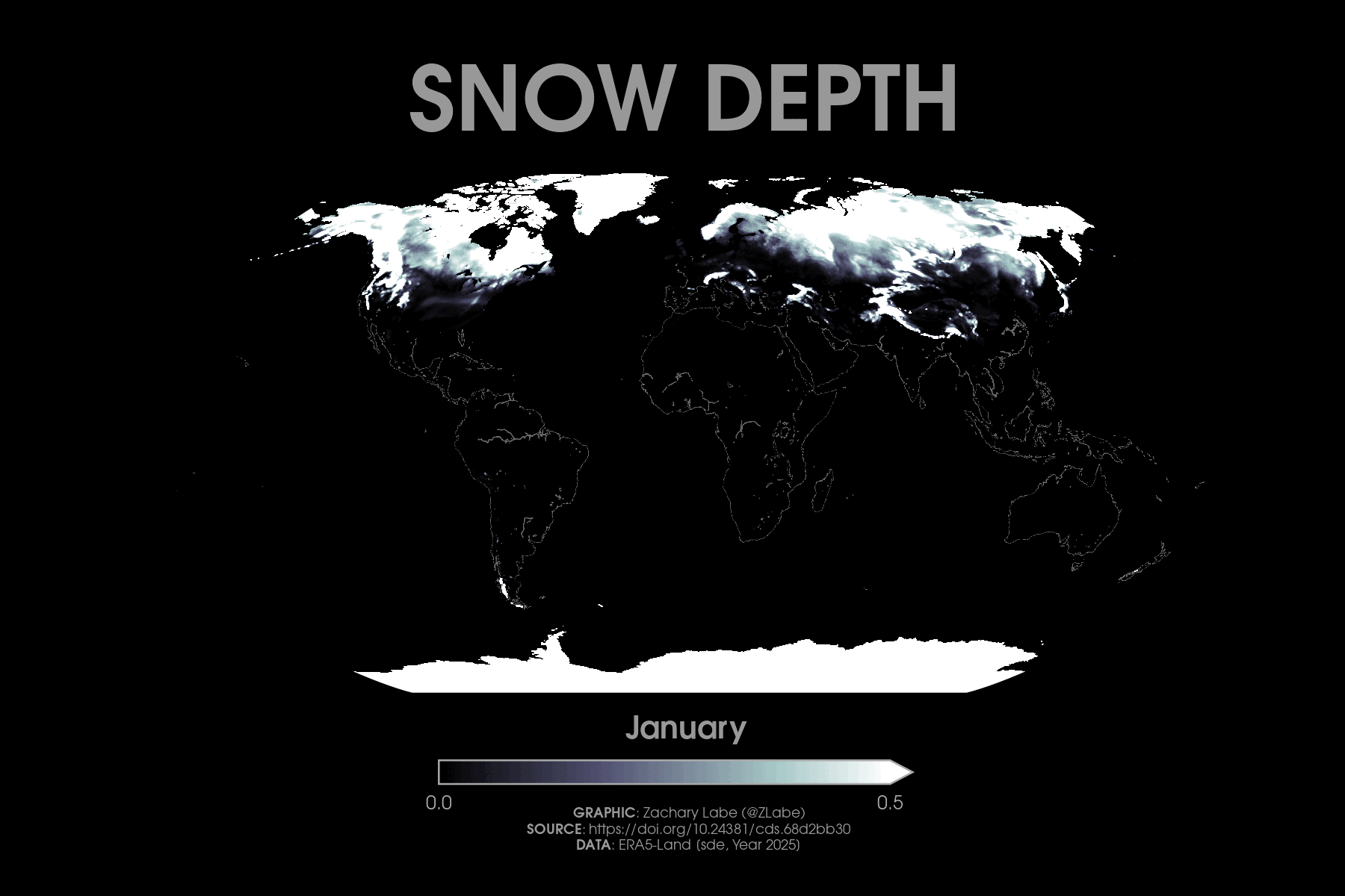 My current entry features an animation showing monthly mean snow depth from the ERA5‑Land reanalysis during 2025 (January through December). This dataset is closely related to the standard ERA5 reanalysis produced by ECMWF, but it focuses specifically on land surface conditions at a higher spatial resolution of 0.1° by 0.1° (latitude by longitude) (~9 km). That finer grid helps better resolve coastlines, topography, and other important land surface characteristics. I’m using a sequential color scheme here (“bone” from matplotlib), with the scale saturating at 0.5 meters to emphasize variability at lower latitudes where snow depths are generally much smaller compared with places like the Greenland Ice Sheet and the Antarctic Ice Sheet. I also intentionally reduced the contrast for continents and coastlines, so the focus stays on the seasonal cycle of snowpack, particularly the differences between the Northern and Southern Hemispheres. There are also some interesting regions where snow persists year-round outside of the major ice sheets, though you can still see summer melt even across parts of western Greenland. Keep in mind that this shows monthly means, so it does not capture short-lived synoptic events where snowfall may have occurred for only a day or two.