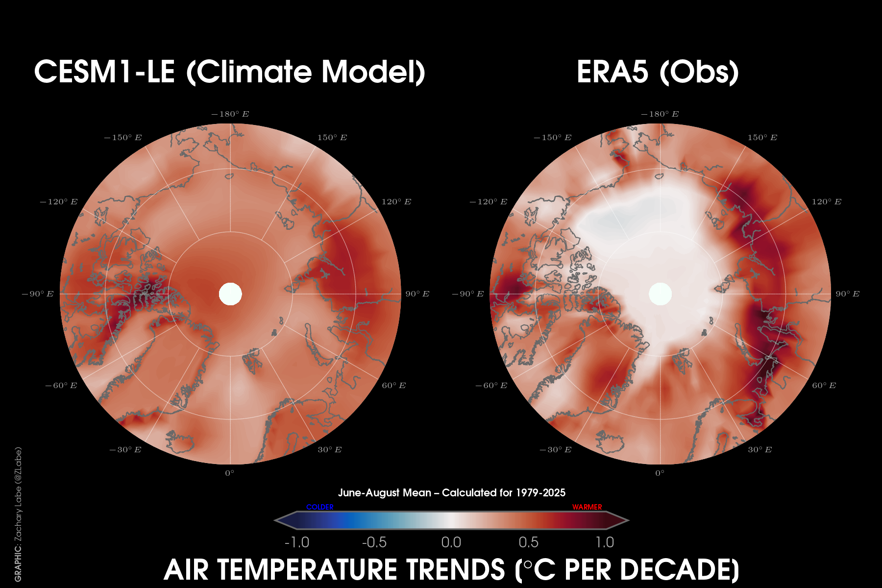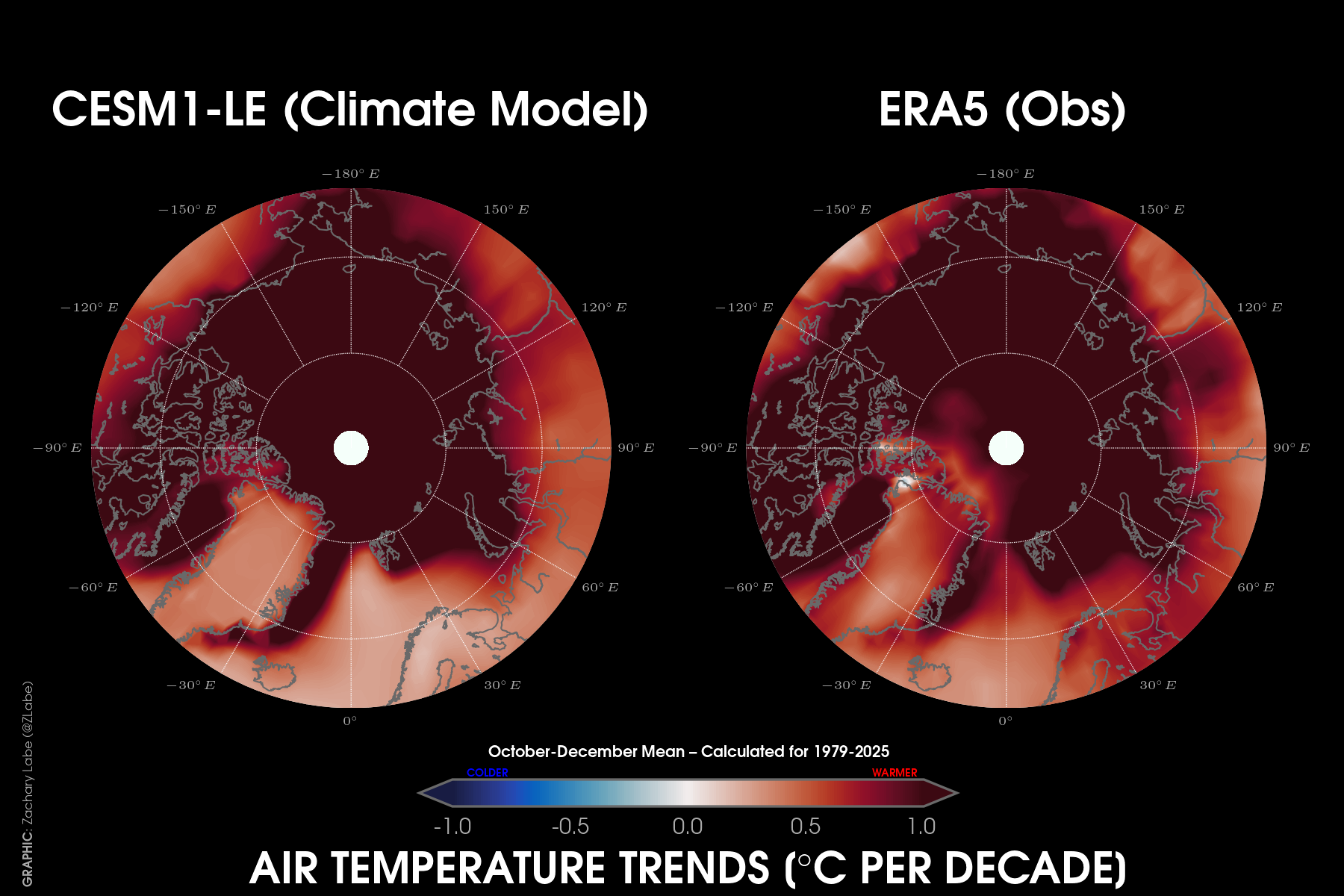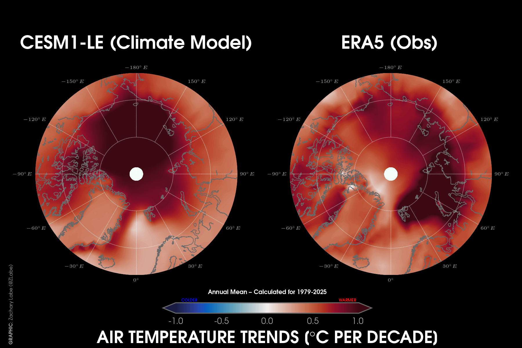 Annual mean near surface temperatures (2-m height; °C) anomalies averaged over the Arctic (north of 65°N latitude) from 1950 to 2025 using observations from the European Centre for Medium-Range Weather Forecasts ERA5 (solid red line) and the National Oceanic and Atmospheric Administration/Cooperative Institute for Research in Environmental Sciences/Department of Energy Twentieth Century Reanalysis (20CR) version 3 (20CRv3; dashed blue line). Note that 20CRv3 is only available from 1950 to 2015. Dark gray shading shows the 5th-95th percentiles of T2M anomalies in the Arctic across 7 global climate model large ensembles from the entire multi-model large ensemble archive (MMLEA) through 2099. Light gray shading shows the 25th-75th percentiles of T2M anomalies in the Arctic across the entire MMLEA through 2099. The white line denotes the multi-model ensemble mean. All climate models are forced with CMIP5 historical forcing from 1950 to 2005 and an extreme high emissions scenario (RCP8.5) from 2006 to 2099. These figures are adapted from Labe and Barnes (2022, ESS). The climate models include: Canadian Earth System Model Large Ensemble (CanESM2; 50 ensemble members), Max Planck Institute Grand Ensemble (MPI; 50 ensemble members), Commonwealth Scientific and Industrial Research Organization Large Ensemble (CSIRO-MK3.6; 30 ensemble members), EC-Earth Consortium Large Ensemble (EC-Earth; 16 ensemble members), Geophysical Fluid Dynamics Laboratory Large Ensemble (GFDL-CM3; 20 ensemble members), Geophysical Fluid Dynamics Laboratory Earth System Model Large Ensemble (GFDL ESM2M; 30 ensemble members), and the Community Earth System Model Large Ensemble Community Project (LENS; 40 ensemble members). All anomalies are computed in respect to their 1981 to 2010 climatology.Same data as above, but only for 1950 to 2050. Each climate model ensemble member is shown with a thin white line.Same data as above, but only for 1950 to 2025.Same data as above, but calculated for each season (January to March, April to June, July to September, and October to December) from 1950 to 2050.Annual-mean near-surface temperature trends from 1979 to 2025 for the ensemble mean of the CESM1 Large Ensemble (RCP8.5 scenario) (left) and ERA5 reanalysis (right). In other words, this is the climate change signal only in one climate model. In reality, internal variability will contribute to more spatial variability in temperature trends (as found in observations).Mean June to August near-surface temperature trends from 1979 to 2025 for the ensemble mean of the CESM1 Large Ensemble (RCP8.5 scenario) (left) and ERA5 reanalysis (right). In other words, this is the climate change signal only in one climate model. In reality, internal variability will contribute to more spatial variability in temperature trends (as found in observations).Mean October to December near-surface temperature trends from 1979 to 2025 for the ensemble mean of the CESM1 Large Ensemble (RCP8.5 scenario) (left) and ERA5 reanalysis (right). In other words, this is the climate change signal only in one climate model. In reality, internal variability will contribute to more spatial variability in temperature trends (as found in observations).