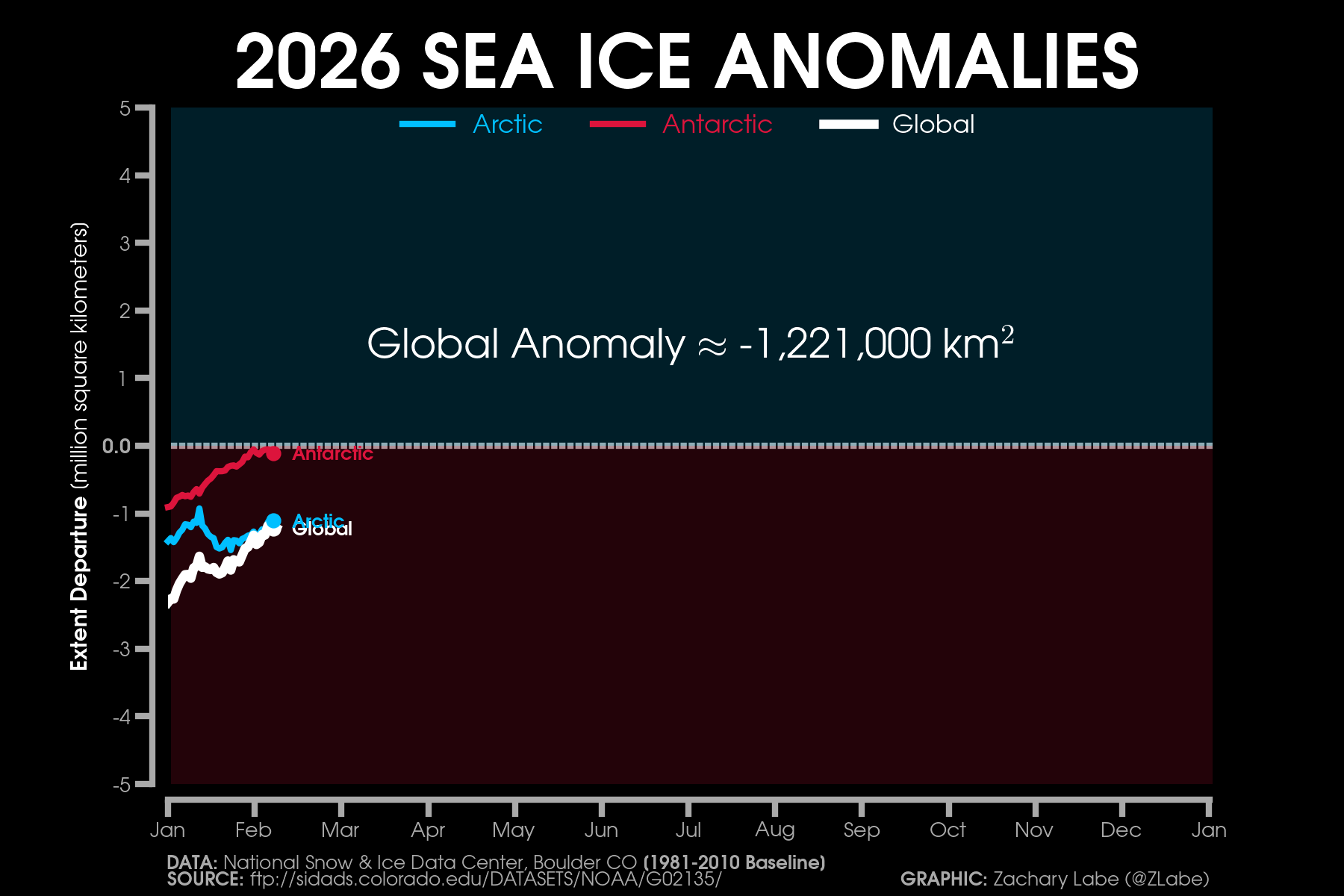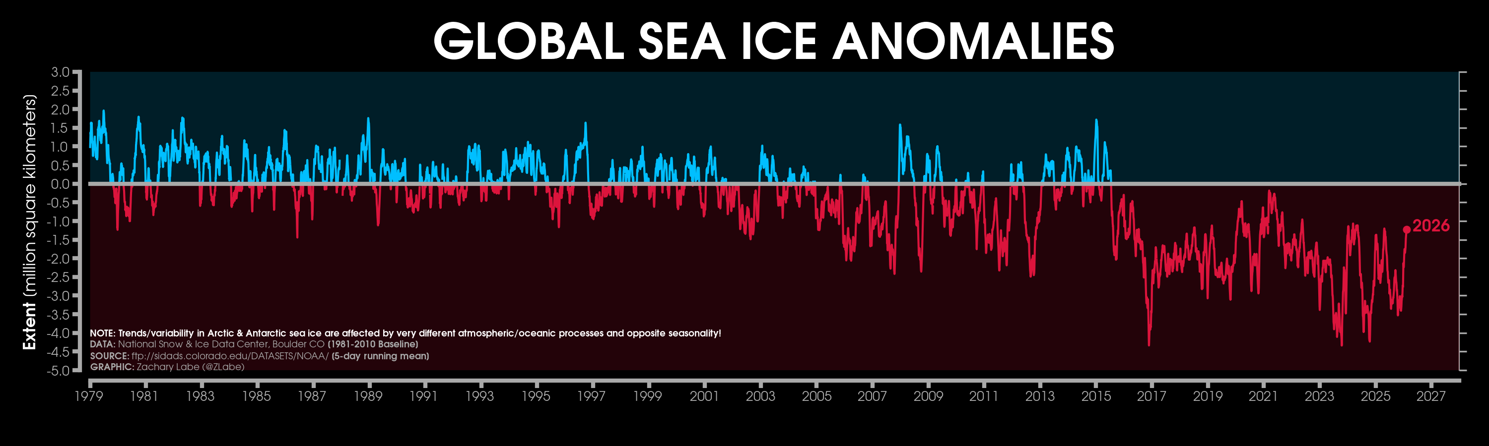 NOTE: Trends and variability in Arctic and Antarctic sea ice are affected by very different atmospheric/oceanic/ice processes and are in opposite seasons! Caution is advised for assessing any statistics of global sea ice levels (i.e., combined Arctic and Antarctic). Their individual seasonal cycles can be found on my Arctic and Antarctic sea ice pages.
