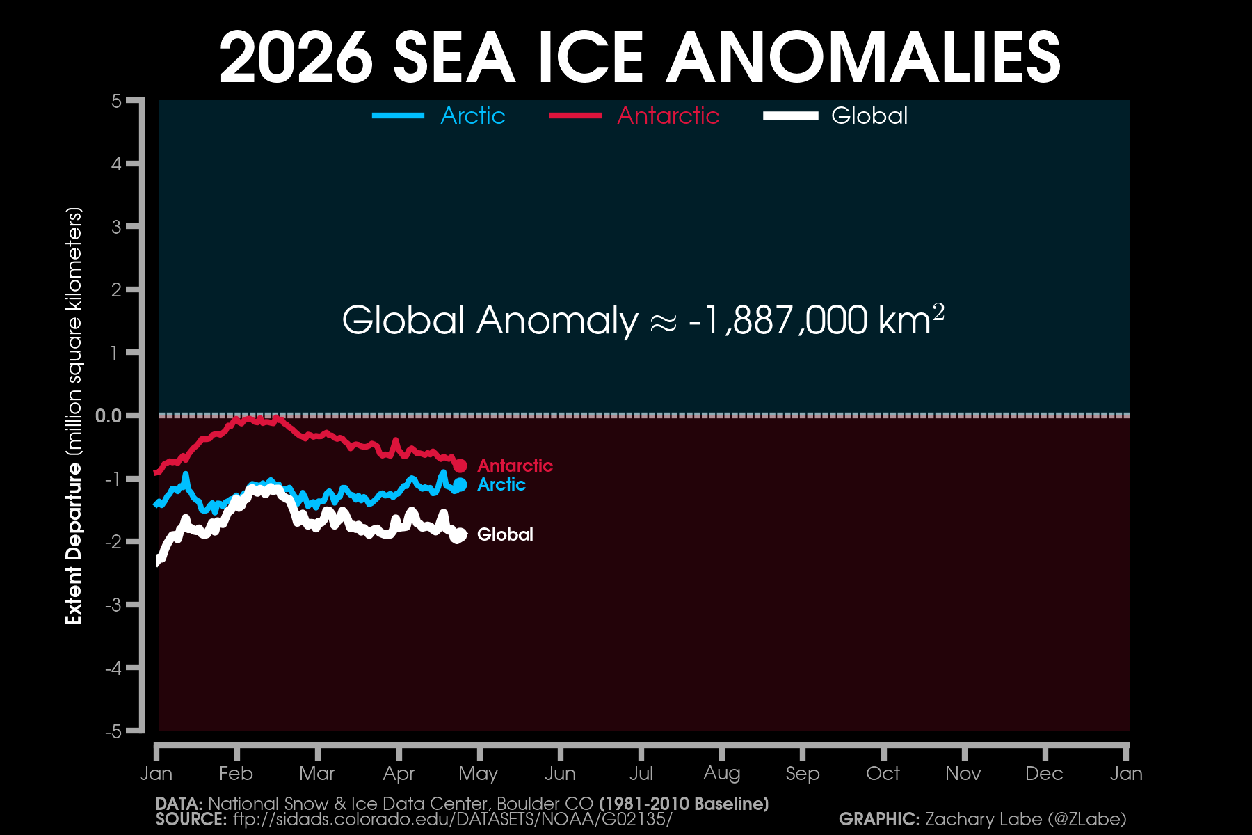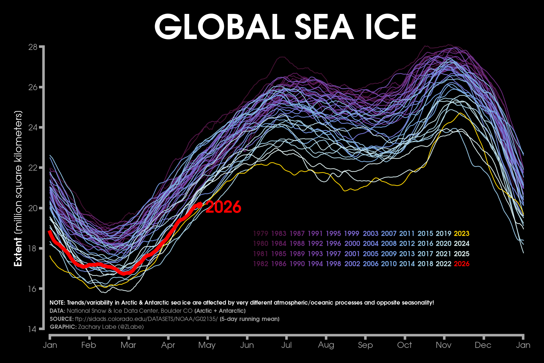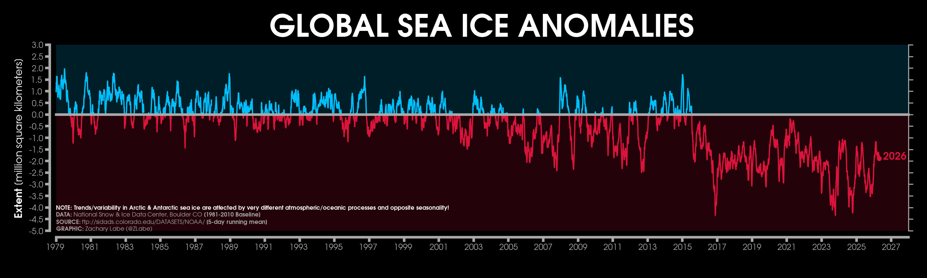 NOTE: Trends and variability in Arctic and Antarctic sea ice are affected by very different atmospheric/oceanic/ice processes and are in opposite seasons! Caution is advised for assessing any statistics of global sea ice levels (i.e., combined Arctic and Antarctic). Their individual seasonal cycles can be found on my Arctic and Antarctic sea ice pages.