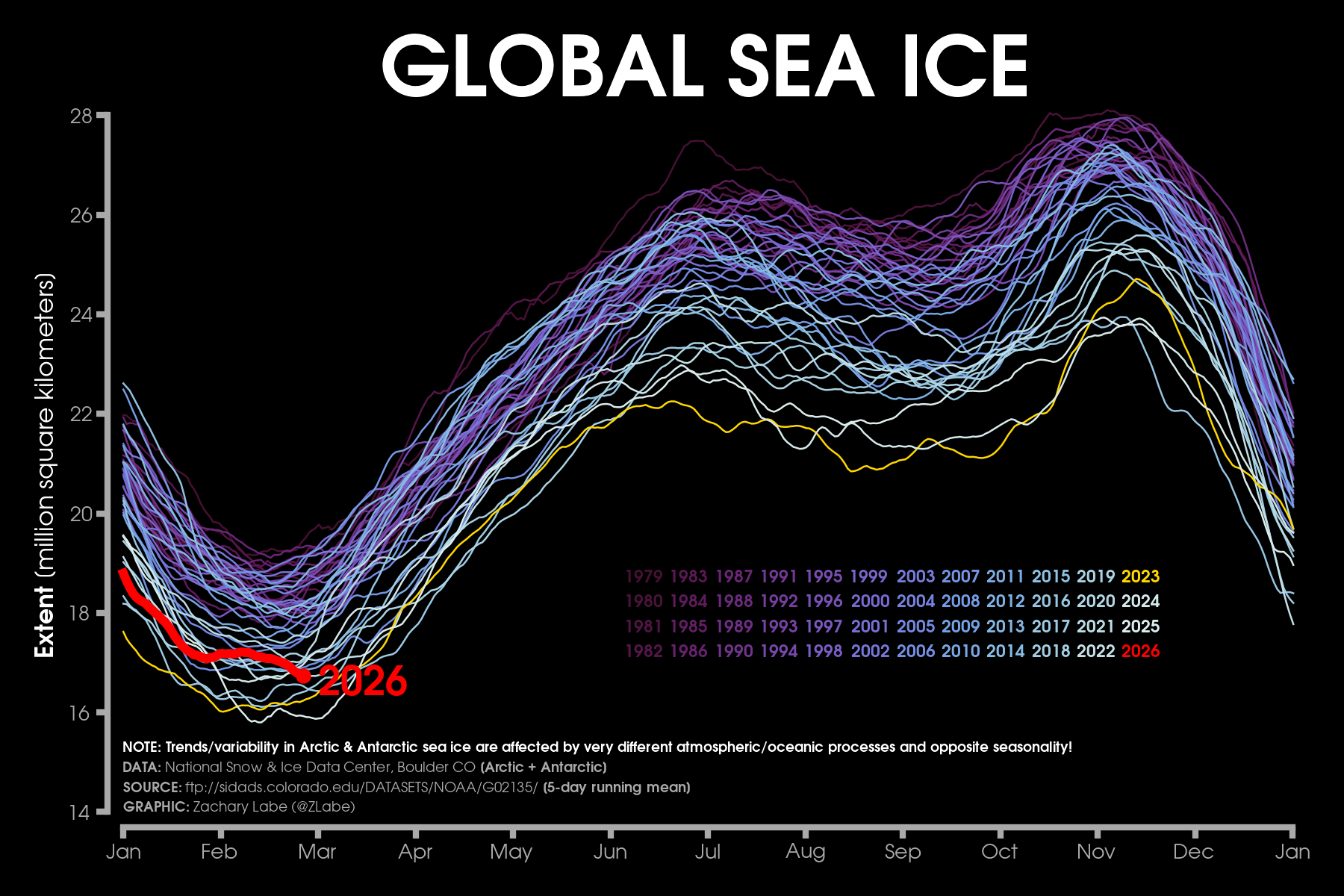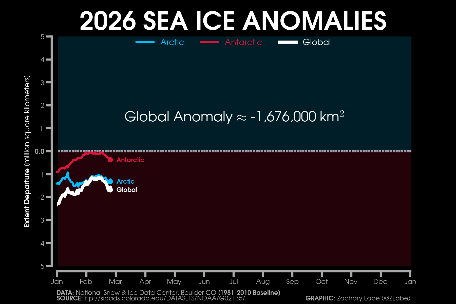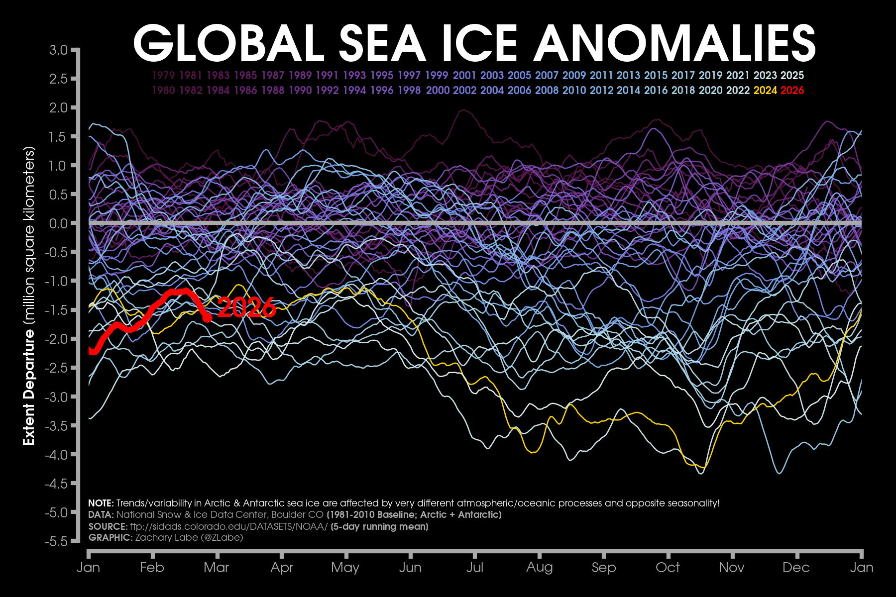 NOTE: Trends and variability in Arctic and Antarctic sea ice are affected by very different atmospheric/oceanic/ice processes and are in opposite seasons! Caution is advised for assessing any statistics of global sea ice levels (i.e., combined Arctic and Antarctic). Their individual seasonal cycles can be found on my Arctic and Antarctic sea ice pages.