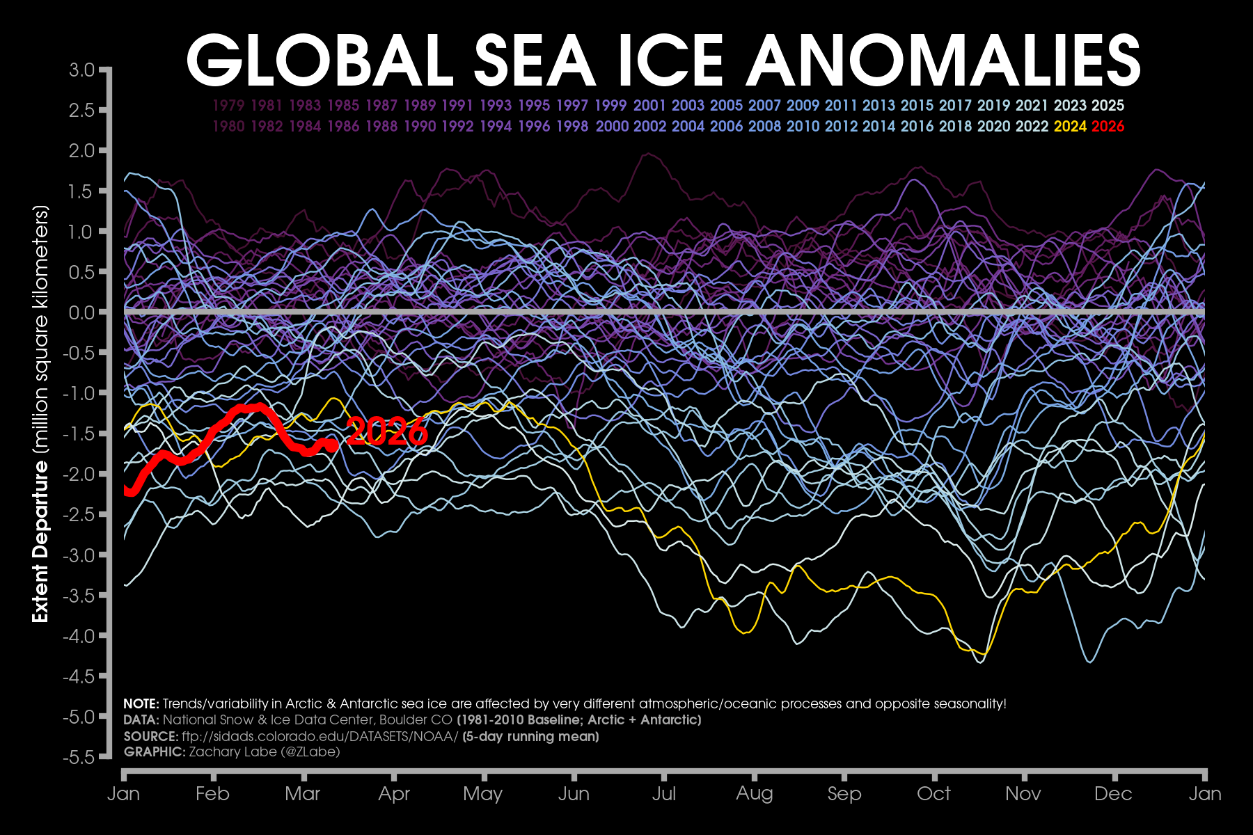 Global sea ice extent anomalies (Arctic + Antarctic) for each year from 1979 to 2026 (satellite-era; NSIDC, DMSP SSM/I-SSMIS and JAXA AMSR2). Anomalies are calculated using a 5-day running mean from a climatological baseline of 1981-2010. 2024 is shown with a yellow line. 2026 is shown using a red line (updated 3/13/2026).