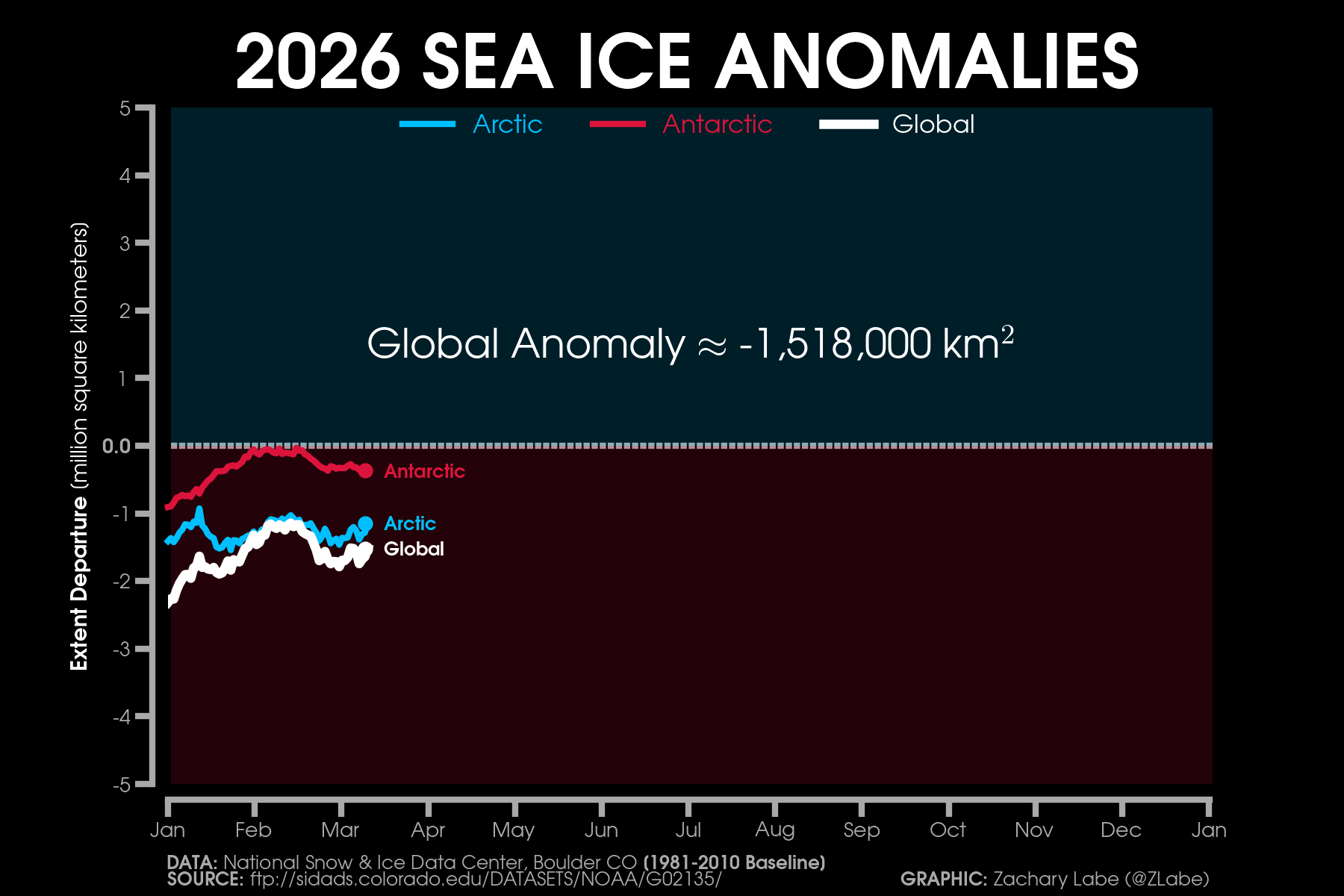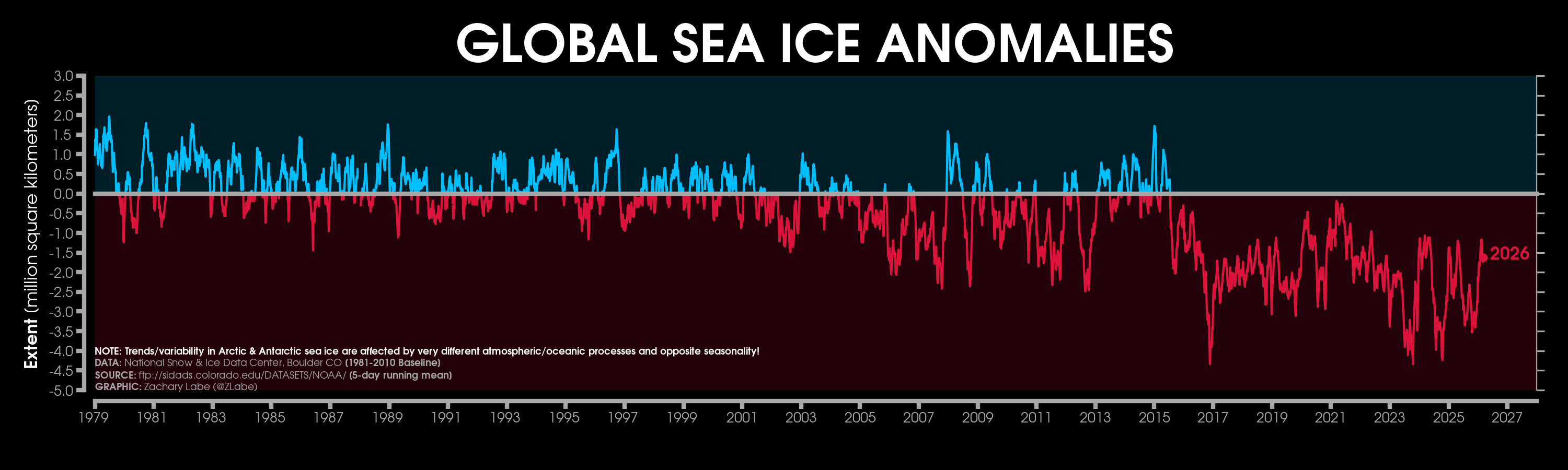 Global (Arctic + Antarctic) sea ice extent anomalies stretching from January 1979 to present day (satellite-era; NSIDC, DMSP SSM/I-SSMIS and JAXA AMSR2). Anomalies are calculated using a 5-day running mean from a climatological baseline of 1981-2010 (updated 3/13/2026).