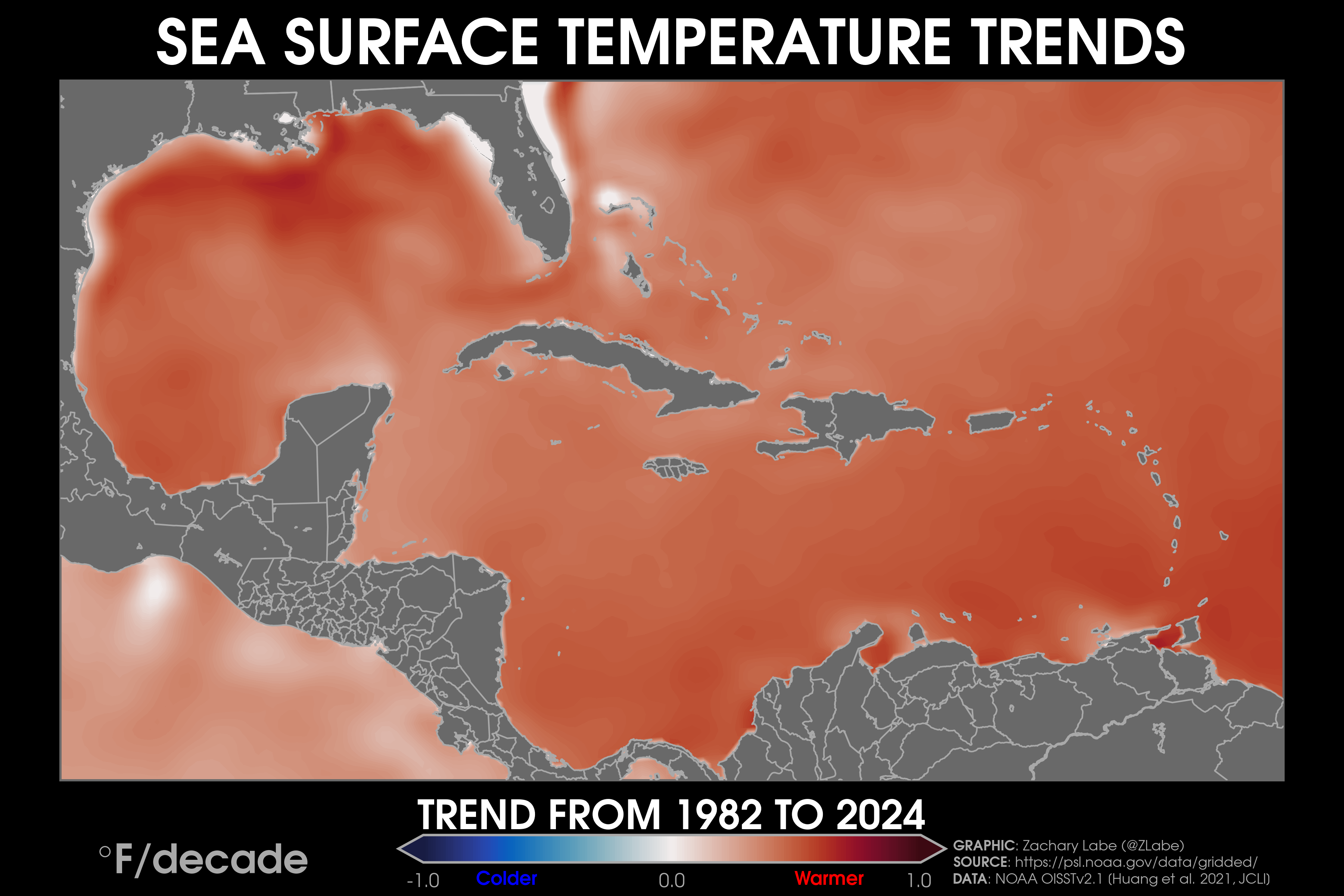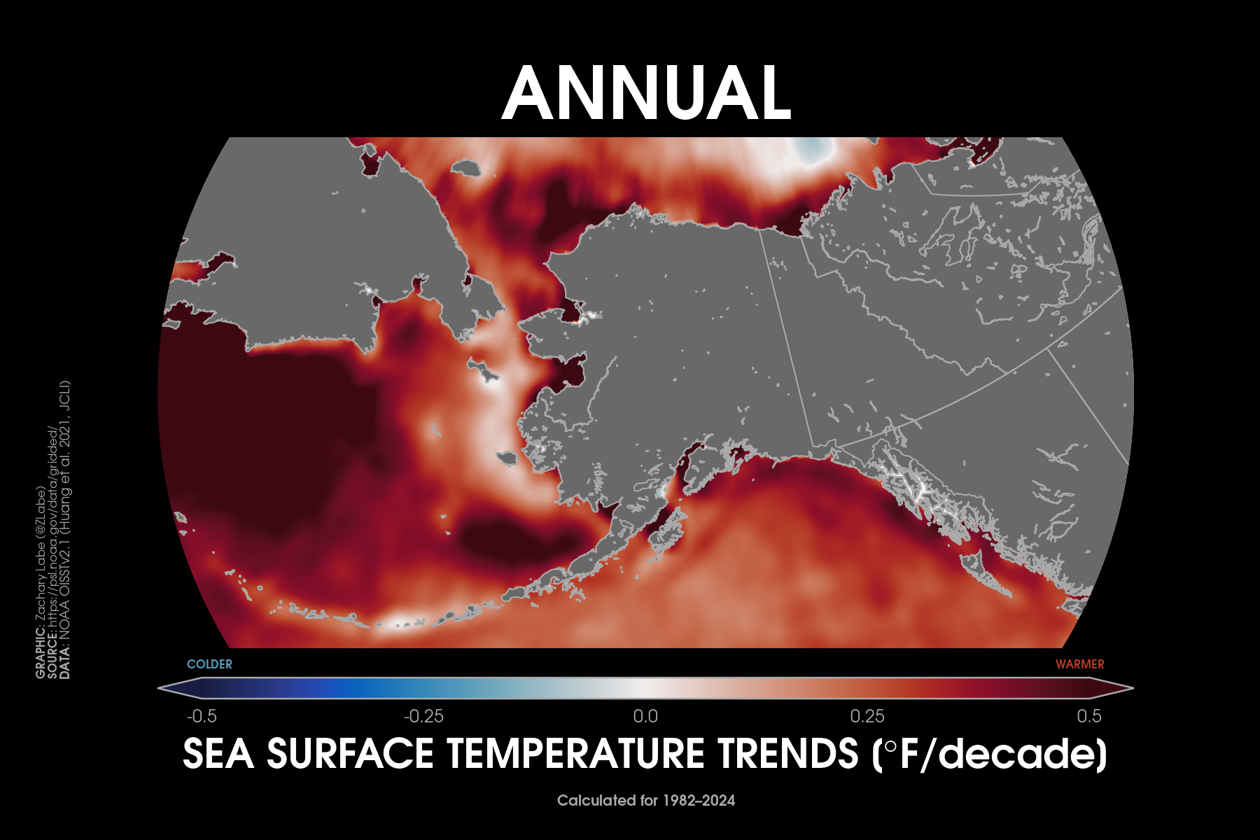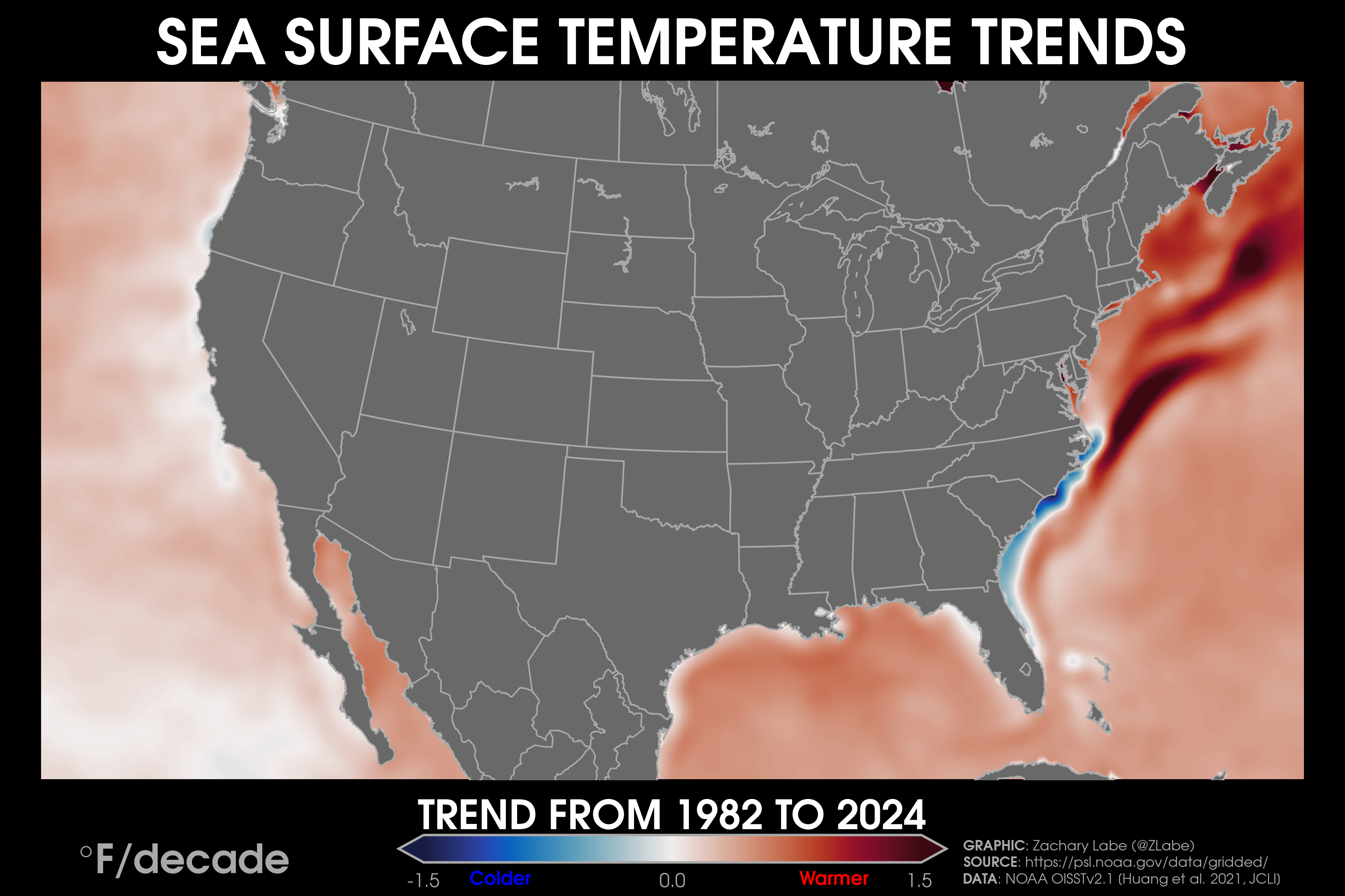 Sea Surface Temperature TrendsDecadal trends in annual mean sea surface temperatures around the contiguous United States from 1979 to 2024. Data are from NOAA Optimum Interpolation Sea Surface Temperature V2.1 (OISSTv21) (https://psl.noaa.gov/data/gridded/data.noaa.oisst.v2.highres.html). Graphic was updated on 7/19/2025.Animation of annual mean sea surface temperature anomalies around the contiguous United States (CONUS) for each year from 1982 to 2024. Data are from NOAA Optimum Interpolation Sea Surface Temperature V2.1 (OISSTv21) (https://psl.noaa.gov/data/gridded/data.noaa.oisst.v2.highres.html). Graphic was updated on 8/1/2025.Decadal trends in annual mean sea surface temperatures around Alaska from 1979 to 2024. Data are from NOAA Optimum Interpolation Sea Surface Temperature V2.1 (OISSTv21) (https://psl.noaa.gov/data/gridded/data.noaa.oisst.v2.highres.html). Graphic was updated on 7/19/2025.Decadal trends in annual mean sea surface temperatures around Hawaii from 1979 to 2024. Data are from NOAA Optimum Interpolation Sea Surface Temperature V2.1 (OISSTv21) (https://psl.noaa.gov/data/gridded/data.noaa.oisst.v2.highres.html). Graphic was updated on 7/19/2025.Decadal trends in annual mean sea surface temperatures around the Caribbean Sea from 1979 to 2024. Data are from NOAA Optimum Interpolation Sea Surface Temperature V2.1 (OISSTv21) (https://psl.noaa.gov/data/gridded/data.noaa.oisst.v2.highres.html). Graphic was updated on 7/19/2025.