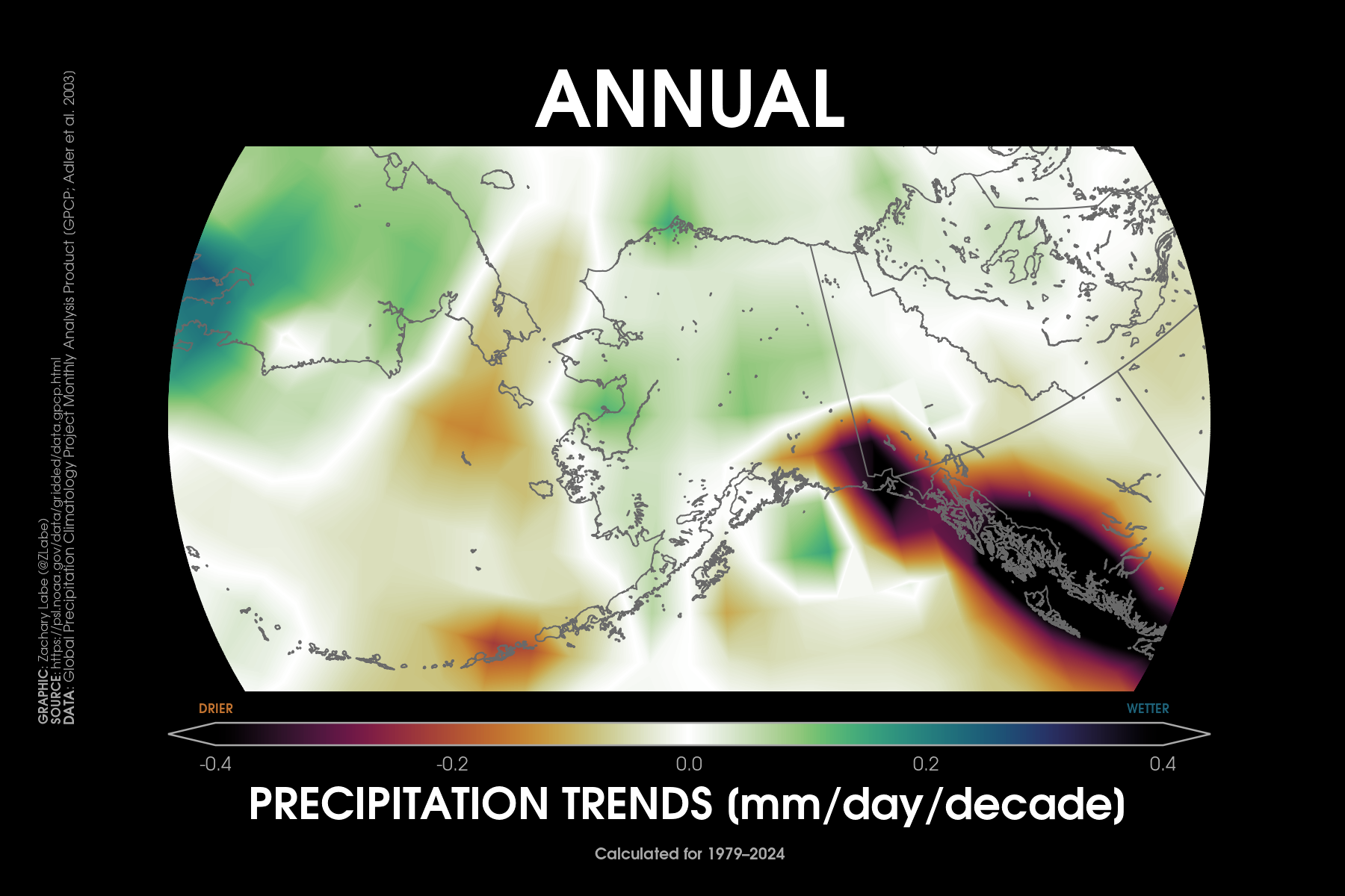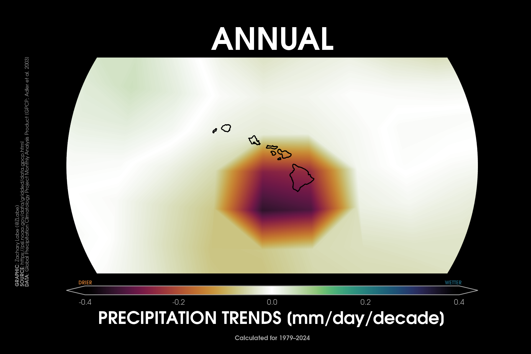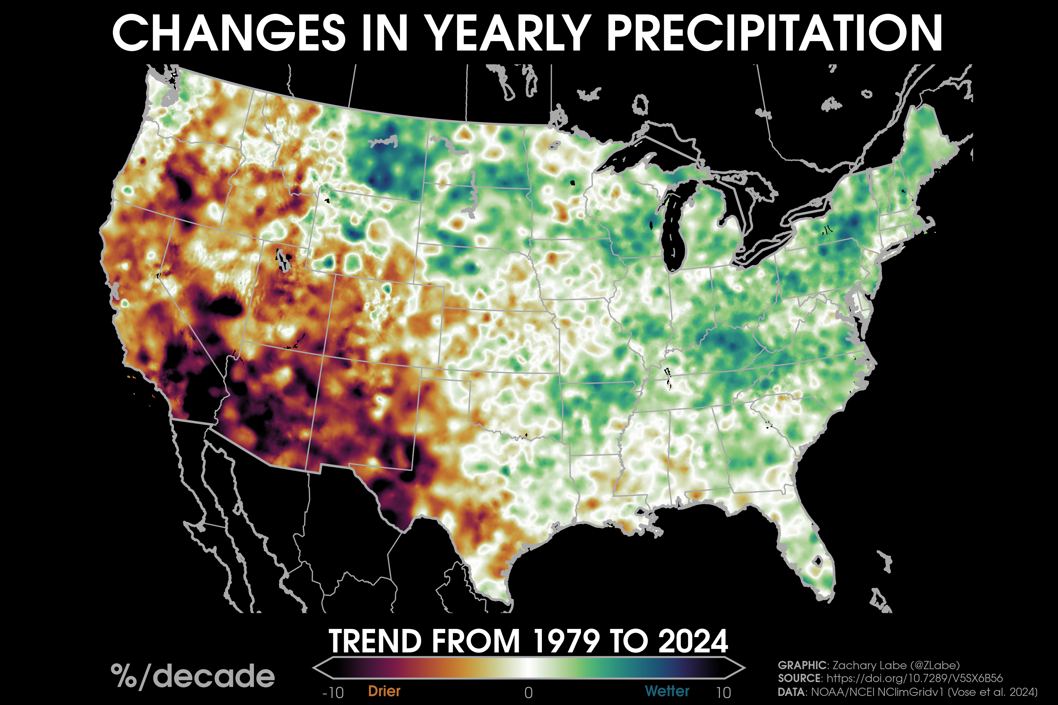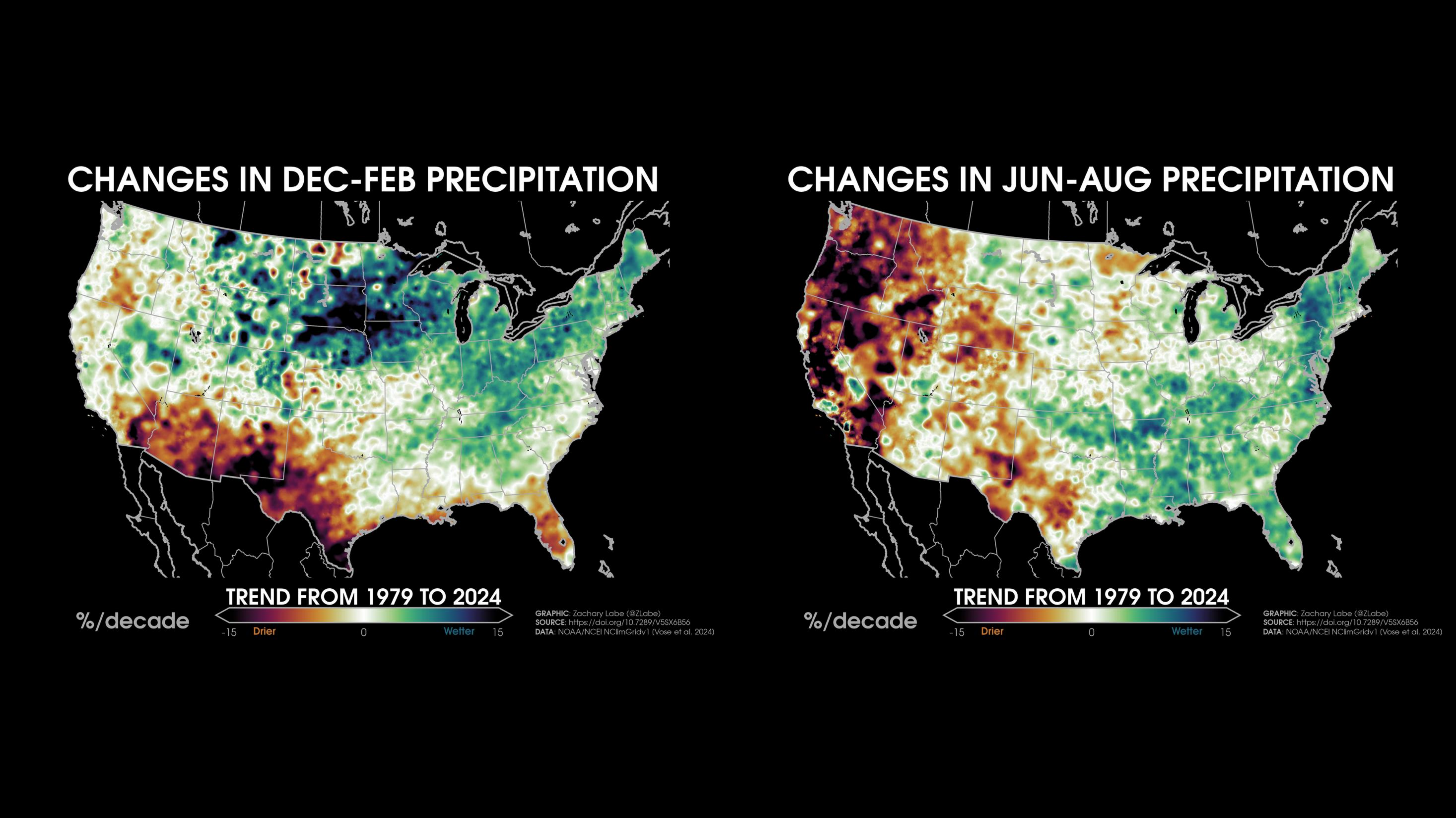 Precipitation TrendsTrends (% per decade) in annual mean precipitation over the contiguous United States (CONUS) from 1979 to 2024. Data is provided by NOAA/NCEI NClimGrid (https://doi.org/10.7289/V5SX6B56). Graphic was updated on 7/6/2025.Decadal trends (linear) in annual mean precipitation around Alaska from 1979 to 2024. Data are from GPCP (https://psl.noaa.gov/data/gridded/data.gpcp.html). Caution that there is large uncertainty in historical precipitation data, such as for the trends around southeastern Alaska. Graphic was updated on 7/8/2025.Decadal trends (linear) in annual mean precipitation around Hawaii from 1979 to 2024. Data are from GPCP (https://psl.noaa.gov/data/gridded/data.gpcp.html). Caution that there is larger uncertainty in observational precipitation data. Graphic was updated on 7/10/2025.Trends (% per decade) in winter (December-January-February; left) and summer (June-July-August; right) precipitation over the contiguous United States (CONUS) from 1979 to 2024. Data is provided by NOAA/NCEI NClimGrid (https://doi.org/10.7289/V5SX6B56). Graphic was updated on 7/20/2025.