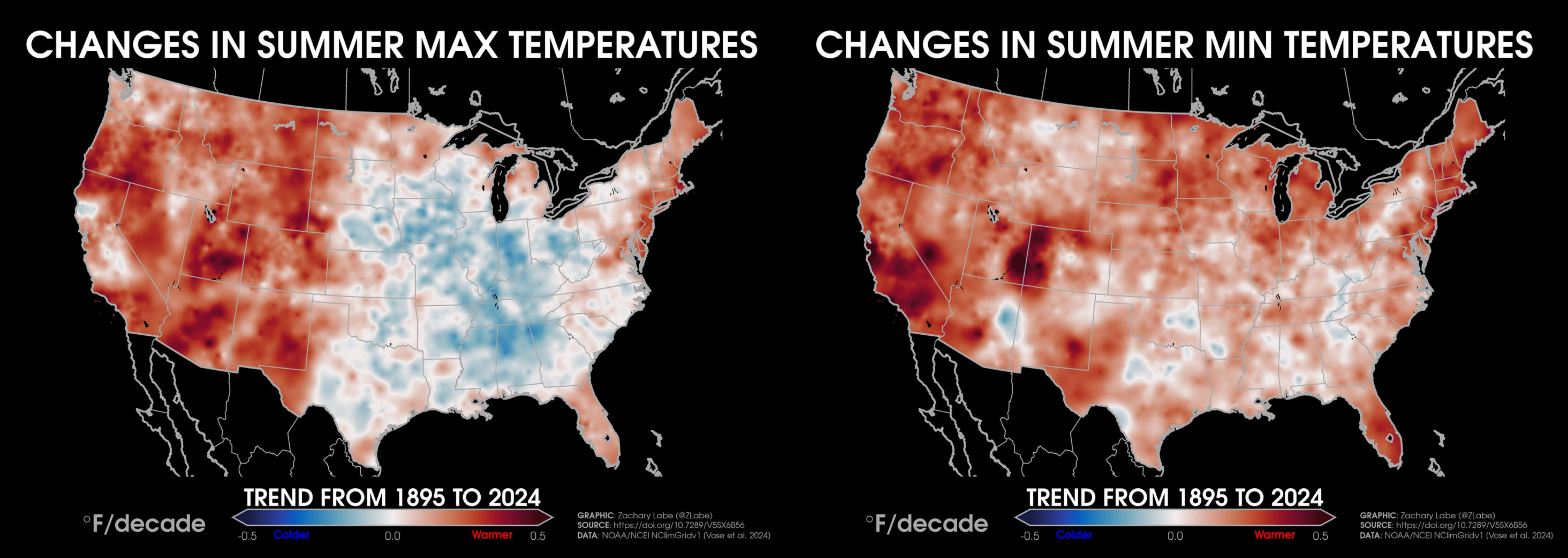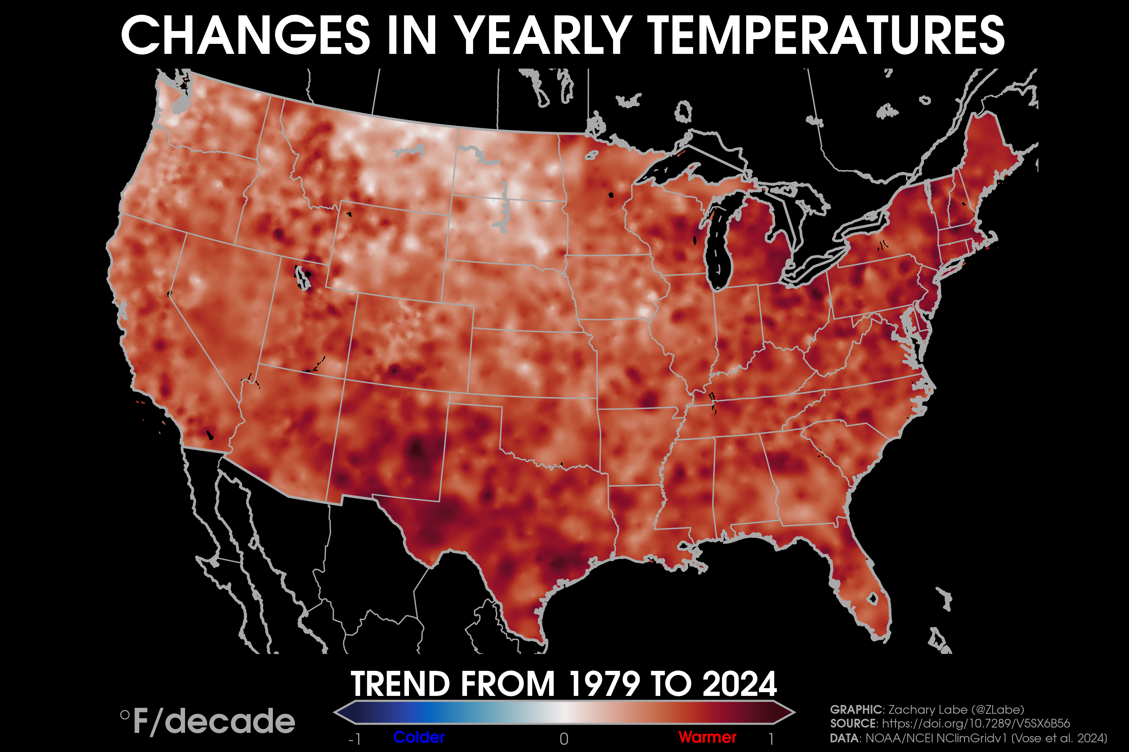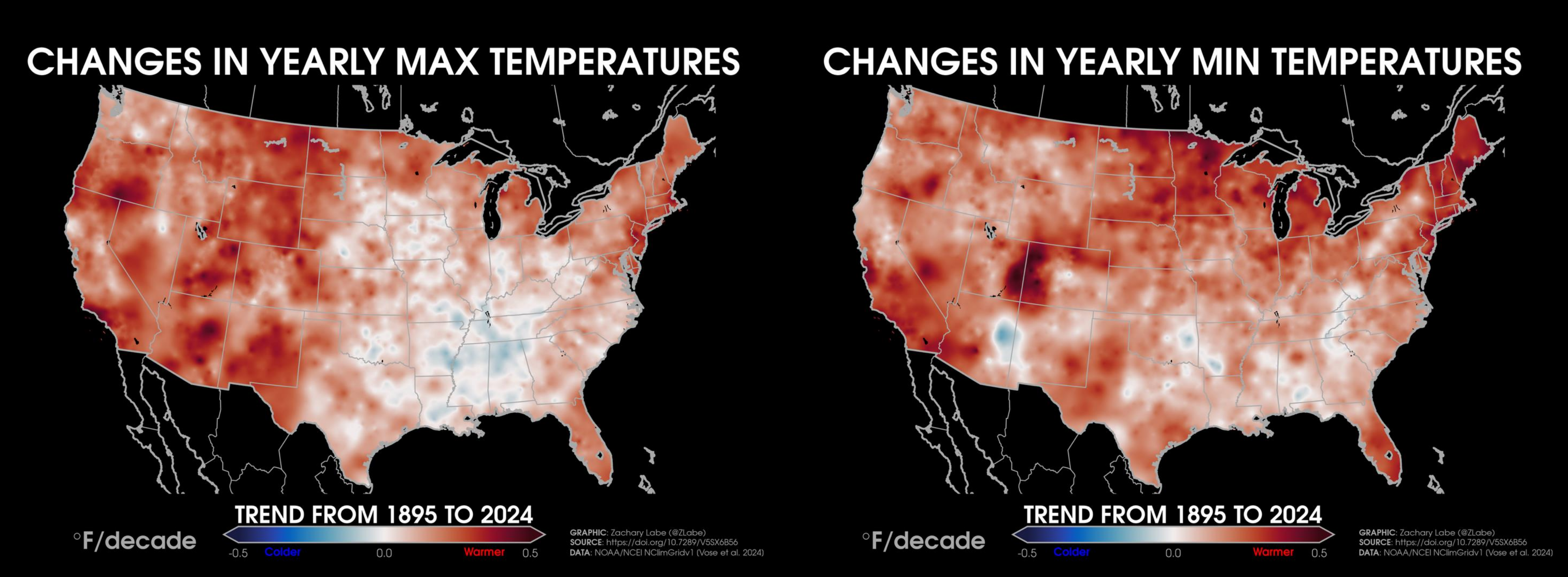 Temperature TrendsTrends (°F per decade) in annual mean surface air temperatures over the contiguous United States (CONUS) from 1979 to 2024. Data is provided by NOAA/NCEI NClimGrid (https://doi.org/10.7289/V5SX6B56). Graphic was updated on 7/6/2025.Animation of annual mean near-surface temperature anomalies across the contiguous United States (CONUS) for each year from 1940 to 2024. Data is from ERA5 (https://cds.climate.copernicus.eu/datasets). Anomalies are calculated relative to a 1951 to 1980 climate baseline. Graphic was updated on 7/26/2025.Temperature anomalies averaged for each decade since 1985 across the contiguous United States region. Anomalies are computed relative to a 1981-2010 climate reference period. Data is from ERA5 reanalysis (https://doi.org/10.24381/cds.f17050d7). Graphic was updated on 7/19/2025.Trends (°F per decade) in annual mean “maximum” (left; MAX) surface air temperatures and annual mean “minimum” (right; MIN) surface air temperatures over the contiguous United States (CONUS) from 1895 to 2024. Data is provided by NOAA/NCEI NClimGrid (https://doi.org/10.7289/V5SX6B56). Graphic was updated on 7/6/2025.Trends (°F per decade) in summer (June-July-August) “maximum” (left; MAX) surface air temperatures and summer mean “minimum” (right; MIN) surface air temperatures over the contiguous United States (CONUS) from 1895 to 2024. Data is provided by NOAA/NCEI NClimGrid (https://doi.org/10.7289/V5SX6B56). Graphic was updated on 8/10/2025.Trends (°F per decade) in winter (December-January-February) “maximum” (left; MAX) surface air temperatures and winter mean “minimum” (right; MIN) surface air temperatures over the contiguous United States (CONUS) from 1895 to 2024. Data is provided by NOAA/NCEI NClimGrid (https://doi.org/10.7289/V5SX6B56). Graphic was updated on 8/10/2025.Decadal trends in annual mean surface air temperatures over the region of Alaska from 1979 to 2024. Data are from NOAAGlobalTemp v6.0.0 (https://www.ncei.noaa.gov/products/land-based-station/noaa-global-temp). Graphic was updated on 7/19/2025.Decadal trends in annual mean surface air temperatures around Hawaii from 1979 to 2024. Data are from NOAAGlobalTemp v6.0.0 (https://www.ncei.noaa.gov/products/land-based-station/noaa-global-temp). Graphic was updated on 7/19/2025.