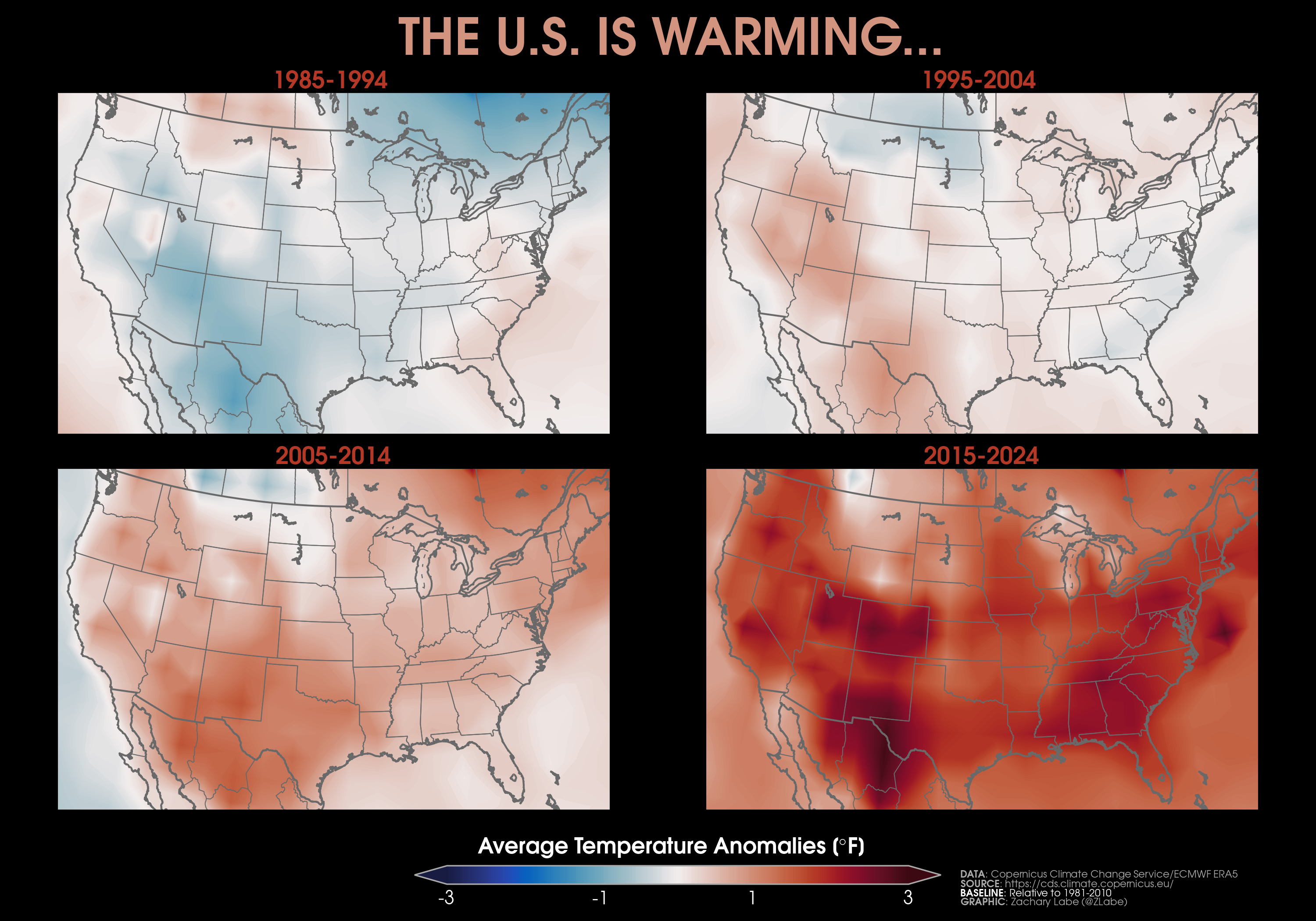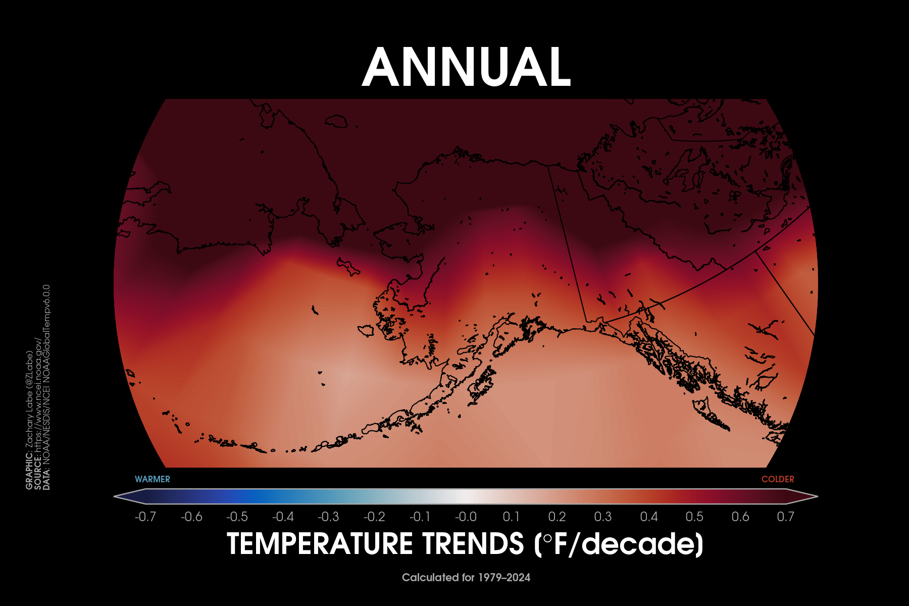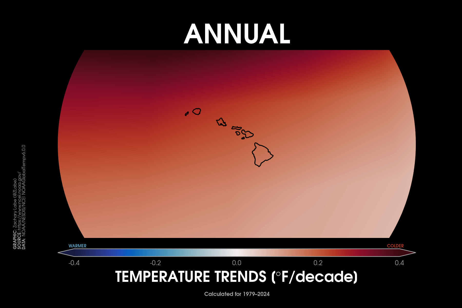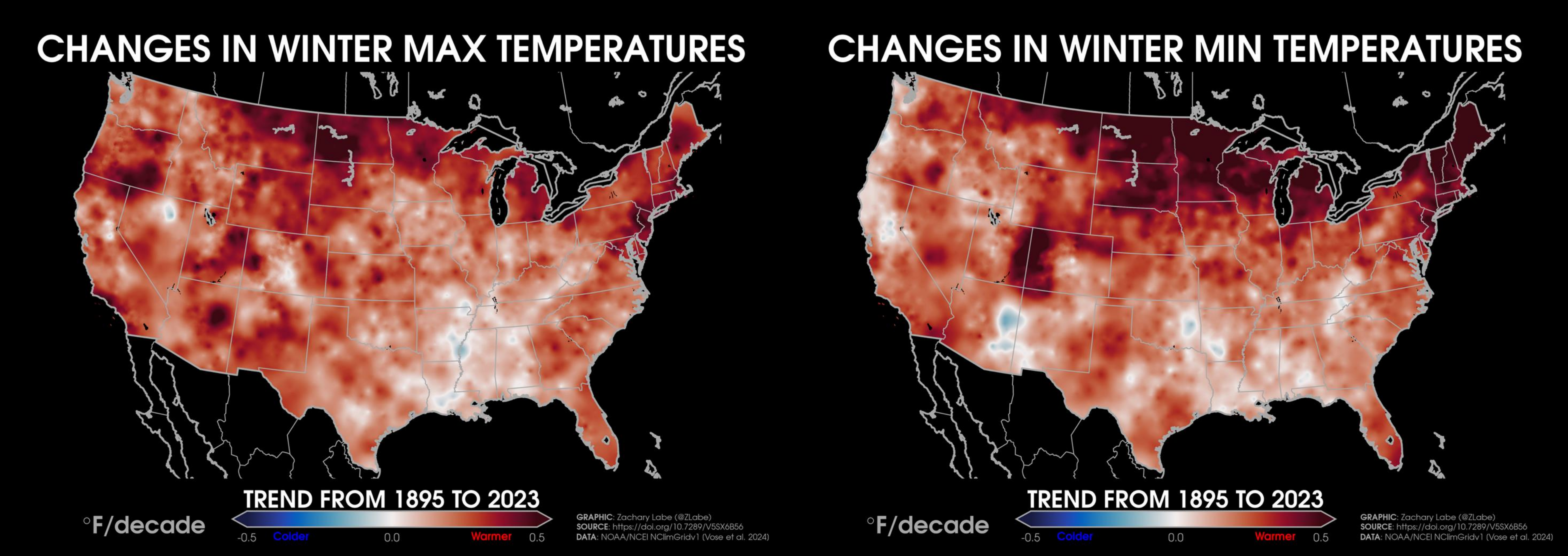 Temperature TrendsTrends (°F per decade) in annual mean surface air temperatures over the contiguous United States (CONUS) from 1979 to 2024. Data is provided by NOAA/NCEI NClimGrid (https://doi.org/10.7289/V5SX6B56). Graphic was updated on 7/6/2025.Animation of annual mean near-surface temperature anomalies across the contiguous United States (CONUS) for each year from 1940 to 2024. Data is from ERA5 (https://cds.climate.copernicus.eu/datasets). Anomalies are calculated relative to a 1951 to 1980 climate baseline. Graphic was updated on 7/26/2025.Temperature anomalies averaged for each decade since 1985 across the contiguous United States region. Anomalies are computed relative to a 1981-2010 climate reference period. Data is from ERA5 reanalysis (https://doi.org/10.24381/cds.f17050d7). Graphic was updated on 7/19/2025.Trends (°F per decade) in annual mean “maximum” (left; MAX) surface air temperatures and annual mean “minimum” (right; MIN) surface air temperatures over the contiguous United States (CONUS) from 1895 to 2024. Data is provided by NOAA/NCEI NClimGrid (https://doi.org/10.7289/V5SX6B56). Graphic was updated on 7/6/2025.Trends (°F per decade) in summer (June-July-August) “maximum” (left; MAX) surface air temperatures and summer mean “minimum” (right; MIN) surface air temperatures over the contiguous United States (CONUS) from 1895 to 2024. Data is provided by NOAA/NCEI NClimGrid (https://doi.org/10.7289/V5SX6B56). Graphic was updated on 8/10/2025.Trends (°F per decade) in winter (December-January-February) “maximum” (left; MAX) surface air temperatures and winter mean “minimum” (right; MIN) surface air temperatures over the contiguous United States (CONUS) from 1895 to 2024. Data is provided by NOAA/NCEI NClimGrid (https://doi.org/10.7289/V5SX6B56). Graphic was updated on 8/10/2025.Decadal trends in annual mean surface air temperatures over the region of Alaska from 1979 to 2024. Data are from NOAAGlobalTemp v6.0.0 (https://www.ncei.noaa.gov/products/land-based-station/noaa-global-temp). Graphic was updated on 7/19/2025.Decadal trends in annual mean surface air temperatures around Hawaii from 1979 to 2024. Data are from NOAAGlobalTemp v6.0.0 (https://www.ncei.noaa.gov/products/land-based-station/noaa-global-temp). Graphic was updated on 7/19/2025.