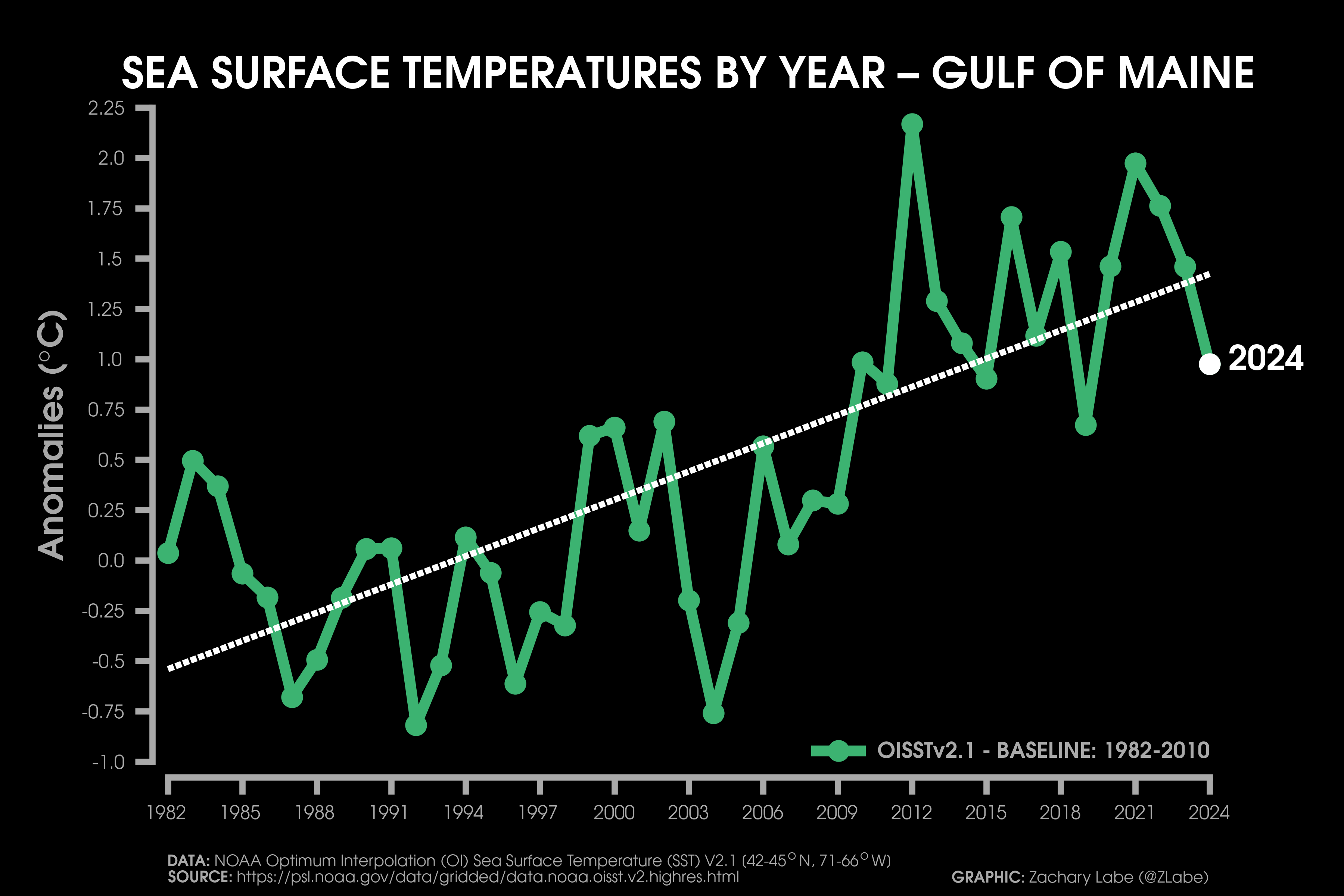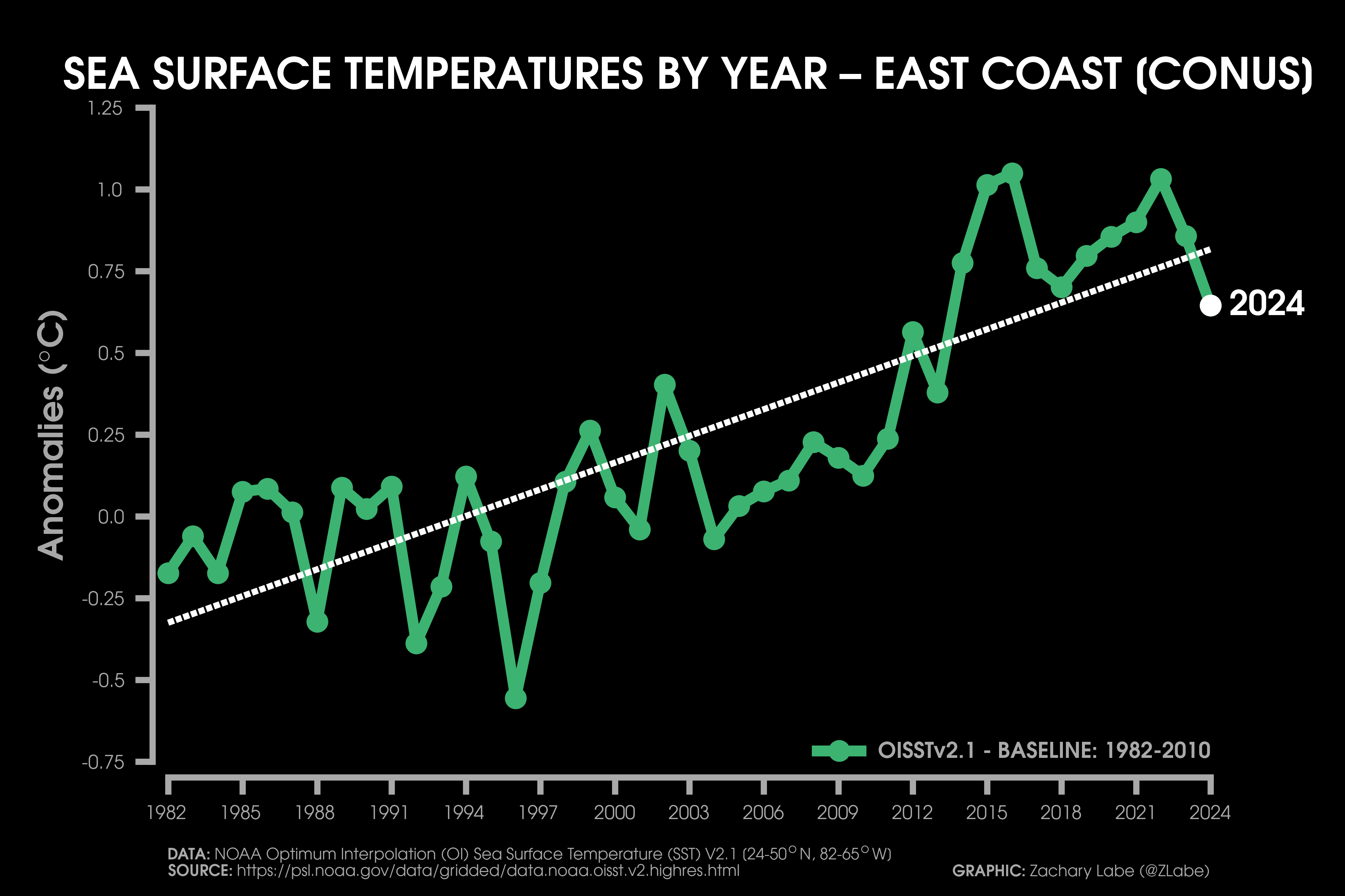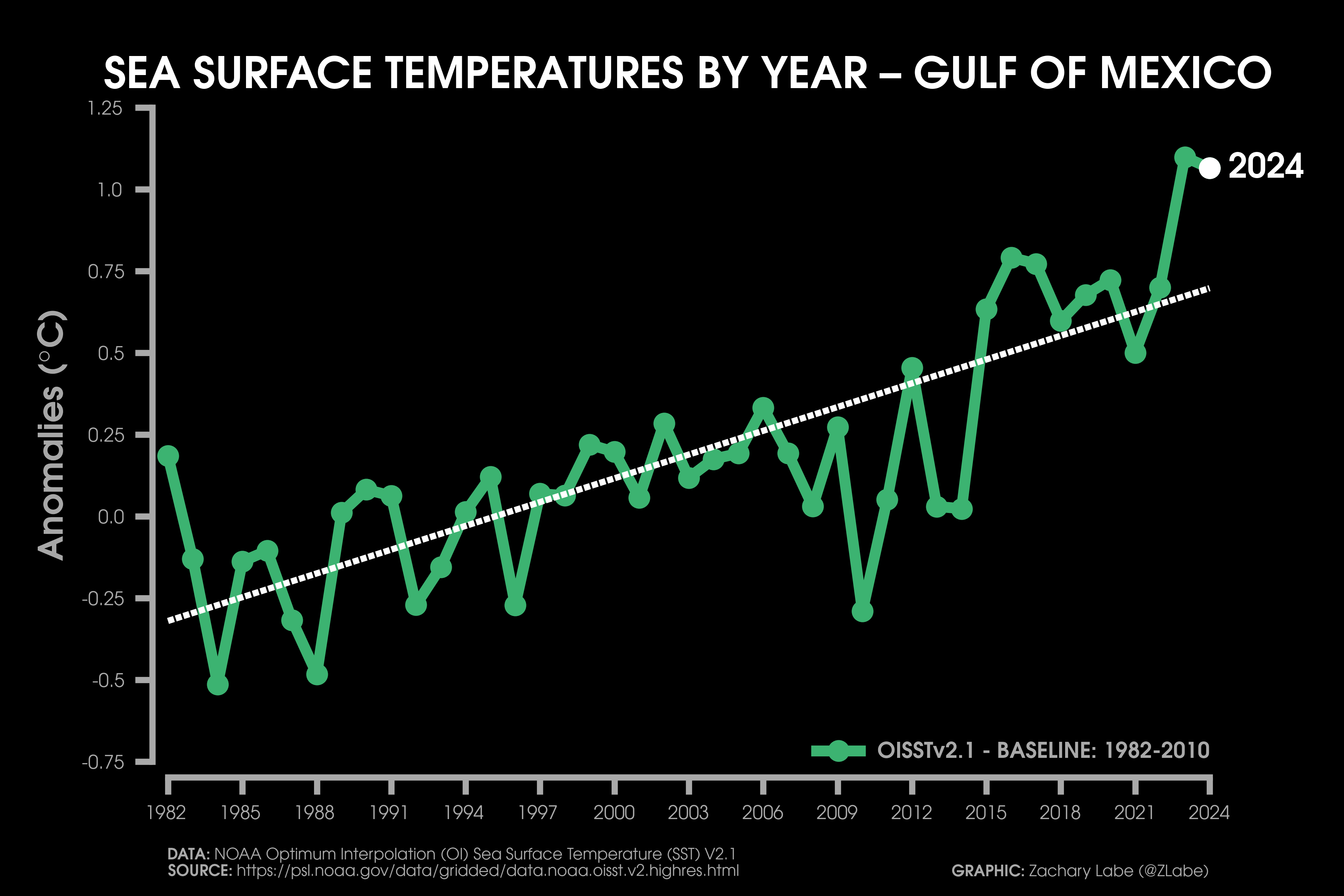 Sea Surface Temperature Time SeriesLine graph showing the annual mean sea surface temperature anomaly for each year from 1982 to 2024 for the Gulf of Mexico. Anomalies are calculated relative to a 1982-2010 reference period. Data is from NOAA Optimum Interpolation Sea Surface Temperature (V2.1; OISSTv21; https://psl.noaa.gov/data/gridded/data.noaa.oisst.v2.highres.html). The linear least squares trend line is also displayed over this period. Graphic was updated on 7/11/2025.Line graph showing the annual mean sea surface temperature anomaly for each year from 1982 to 2024 for the Caribbean Sea. Anomalies are calculated relative to a 1982-2010 reference period. Data is from NOAA Optimum Interpolation Sea Surface Temperature (V2.1; OISSTv21; https://psl.noaa.gov/data/gridded/data.noaa.oisst.v2.highres.html). The linear least squares trend line is also displayed over this period. Graphic was updated on 7/15/2025.Line graph showing the annual mean sea surface temperature anomaly for each year from 1982 to 2024 for around the East Coast of the contiguous United States (CONUS). Anomalies are calculated relative to a 1982-2010 reference period. Data is from NOAA Optimum Interpolation Sea Surface Temperature (V2.1; OISSTv21; https://psl.noaa.gov/data/gridded/data.noaa.oisst.v2.highres.html). The linear least squares trend line is also displayed over this period. Graphic was updated on 7/13/2025.Line graph showing the annual mean sea surface temperature anomaly for each year from 1982 to 2024 for around the West Coast of the contiguous United States (CONUS). Anomalies are calculated relative to a 1982-2010 reference period. Data is from NOAA Optimum Interpolation Sea Surface Temperature (V2.1; OISSTv21; https://psl.noaa.gov/data/gridded/data.noaa.oisst.v2.highres.html). The linear least squares trend line is also displayed over this period. Graphic was updated on 7/14/2025.Line graph showing the annual mean sea surface temperature anomaly for each year from 1982 to 2024 for the Gulf of Maine. Anomalies are calculated relative to a 1982-2010 reference period. Data is from NOAA Optimum Interpolation Sea Surface Temperature (V2.1; OISSTv21; https://psl.noaa.gov/data/gridded/data.noaa.oisst.v2.highres.html). The linear least squares trend line is also displayed over this period. Graphic was updated on 7/12/2025.Line graph showing the annual mean sea surface temperature anomaly for each year from 1982 to 2024 for the Gulf of Alaska. Anomalies are calculated relative to a 1982-2010 reference period. Data is from NOAA Optimum Interpolation Sea Surface Temperature (V2.1; OISSTv21; https://psl.noaa.gov/data/gridded/data.noaa.oisst.v2.highres.html). The linear least squares trend line is also displayed over this period. Graphic was updated on 7/12/2025.Line graph showing the annual mean sea surface temperature anomaly for each year from 1982 to 2024 for the Bering Sea. Anomalies are calculated relative to a 1982-2010 reference period. Data is from NOAA Optimum Interpolation Sea Surface Temperature (V2.1; OISSTv21; https://psl.noaa.gov/data/gridded/data.noaa.oisst.v2.highres.html). The linear least squares trend line is also displayed over this period. Graphic was updated on 7/12/2025.
