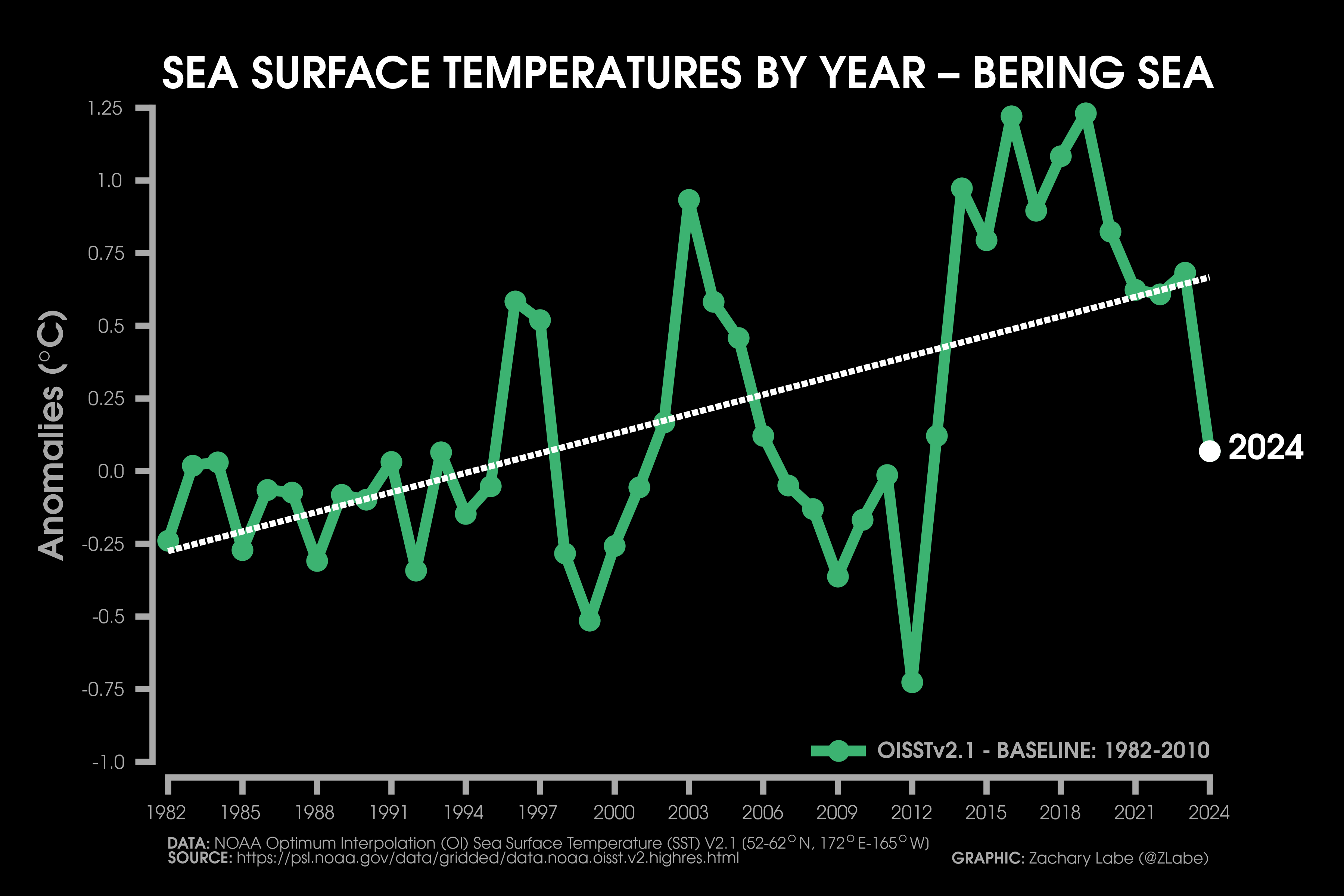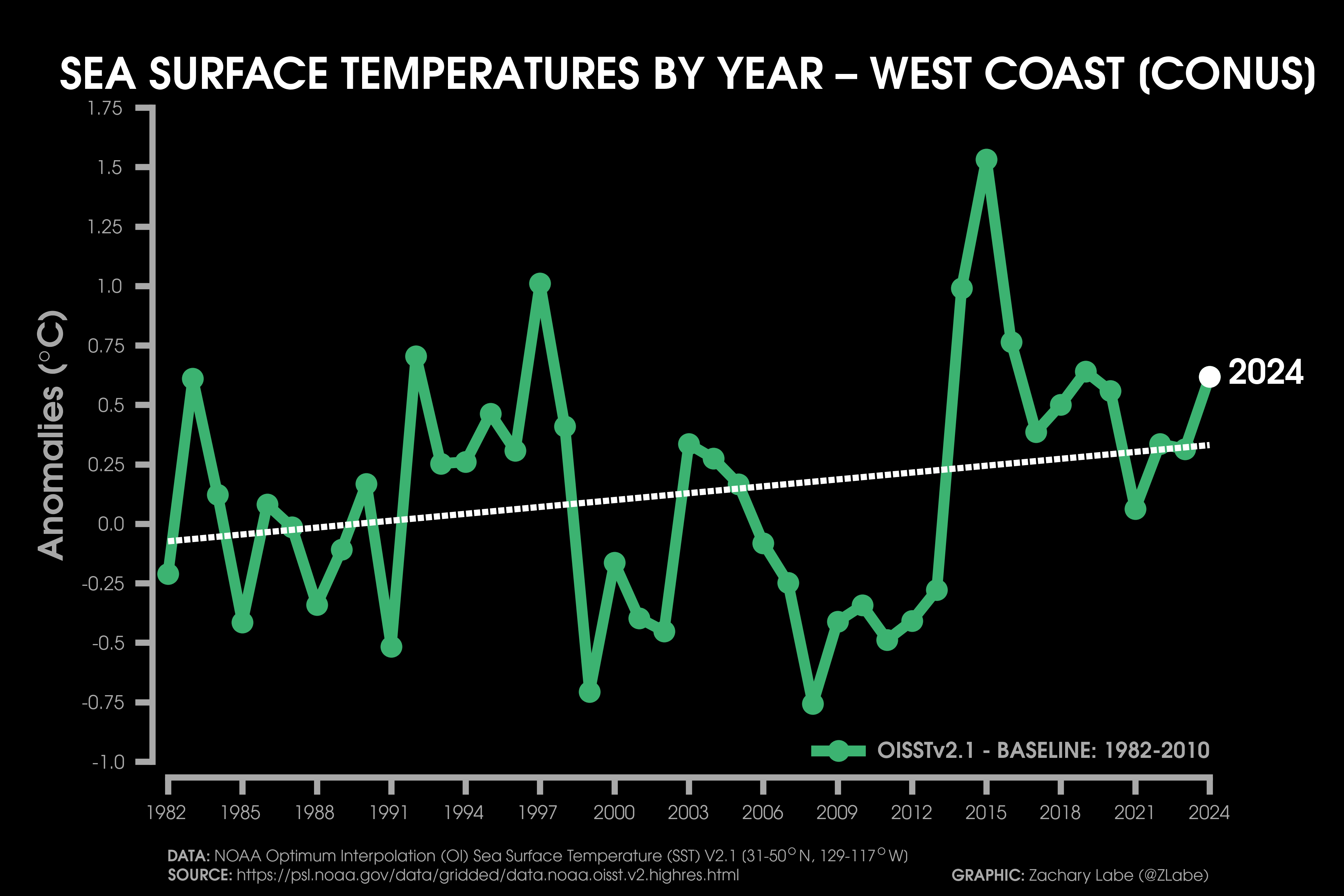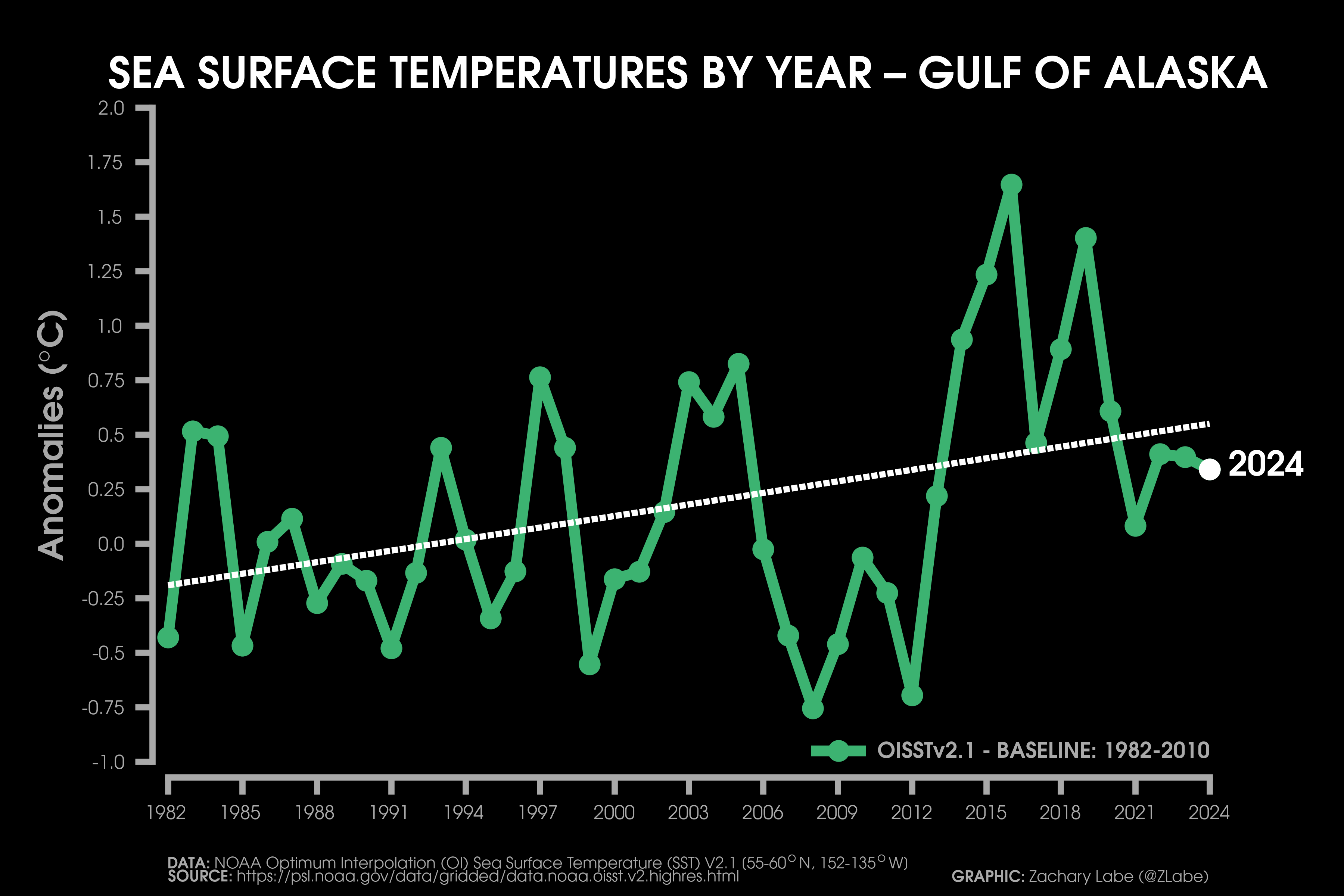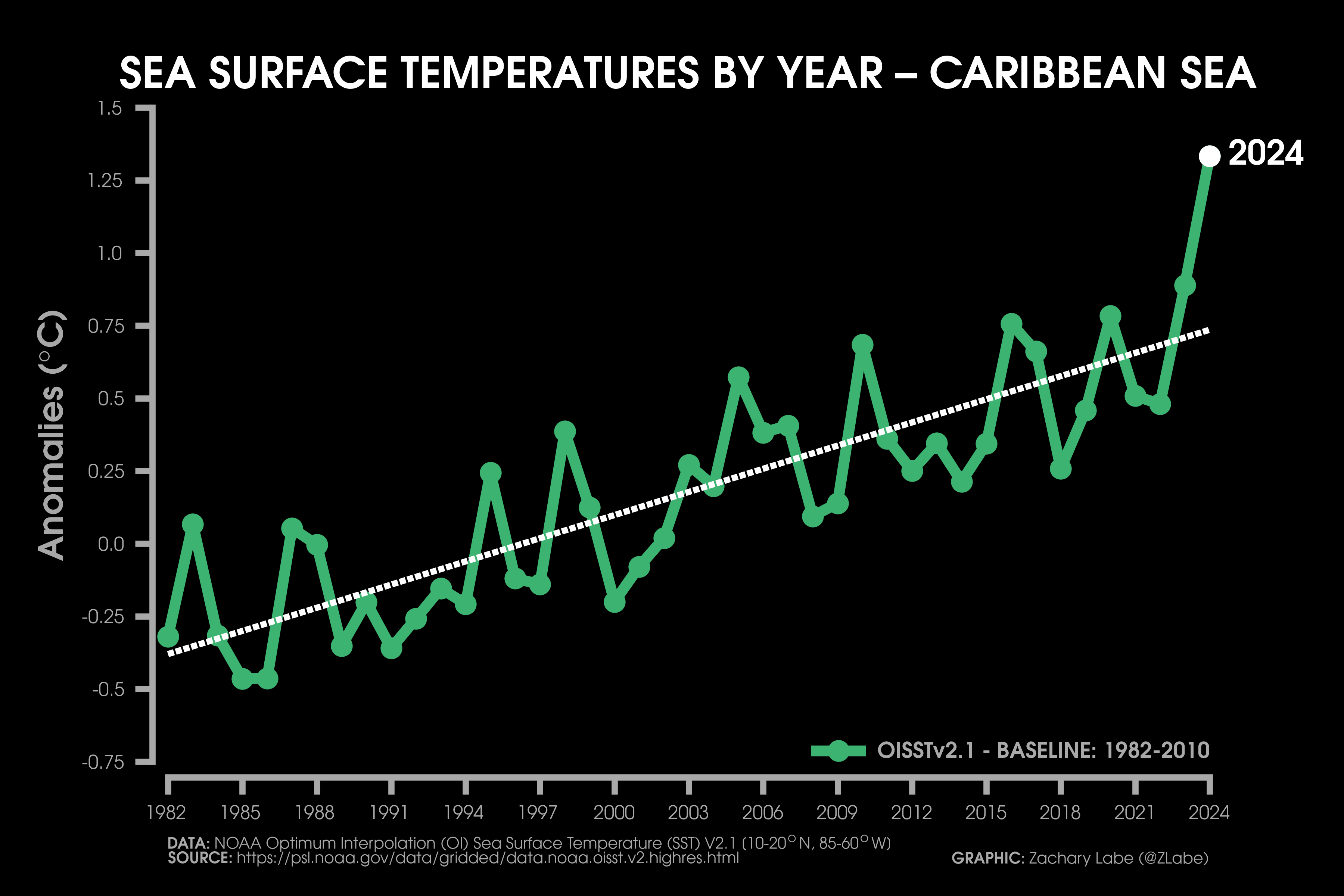 Sea Surface Temperature Time SeriesLine graph showing the annual mean sea surface temperature anomaly for each year from 1982 to 2024 for the Gulf of Mexico. Anomalies are calculated relative to a 1982-2010 reference period. Data is from NOAA Optimum Interpolation Sea Surface Temperature (V2.1; OISSTv21; https://psl.noaa.gov/data/gridded/data.noaa.oisst.v2.highres.html). The linear least squares trend line is also displayed over this period. Graphic was updated on 7/11/2025.Line graph showing the annual mean sea surface temperature anomaly for each year from 1982 to 2024 for the Caribbean Sea. Anomalies are calculated relative to a 1982-2010 reference period. Data is from NOAA Optimum Interpolation Sea Surface Temperature (V2.1; OISSTv21; https://psl.noaa.gov/data/gridded/data.noaa.oisst.v2.highres.html). The linear least squares trend line is also displayed over this period. Graphic was updated on 7/15/2025.Line graph showing the annual mean sea surface temperature anomaly for each year from 1982 to 2024 for around the East Coast of the contiguous United States (CONUS). Anomalies are calculated relative to a 1982-2010 reference period. Data is from NOAA Optimum Interpolation Sea Surface Temperature (V2.1; OISSTv21; https://psl.noaa.gov/data/gridded/data.noaa.oisst.v2.highres.html). The linear least squares trend line is also displayed over this period. Graphic was updated on 7/13/2025.Line graph showing the annual mean sea surface temperature anomaly for each year from 1982 to 2024 for around the West Coast of the contiguous United States (CONUS). Anomalies are calculated relative to a 1982-2010 reference period. Data is from NOAA Optimum Interpolation Sea Surface Temperature (V2.1; OISSTv21; https://psl.noaa.gov/data/gridded/data.noaa.oisst.v2.highres.html). The linear least squares trend line is also displayed over this period. Graphic was updated on 7/14/2025.Line graph showing the annual mean sea surface temperature anomaly for each year from 1982 to 2024 for the Gulf of Maine. Anomalies are calculated relative to a 1982-2010 reference period. Data is from NOAA Optimum Interpolation Sea Surface Temperature (V2.1; OISSTv21; https://psl.noaa.gov/data/gridded/data.noaa.oisst.v2.highres.html). The linear least squares trend line is also displayed over this period. Graphic was updated on 7/12/2025.Line graph showing the annual mean sea surface temperature anomaly for each year from 1982 to 2024 for the Gulf of Alaska. Anomalies are calculated relative to a 1982-2010 reference period. Data is from NOAA Optimum Interpolation Sea Surface Temperature (V2.1; OISSTv21; https://psl.noaa.gov/data/gridded/data.noaa.oisst.v2.highres.html). The linear least squares trend line is also displayed over this period. Graphic was updated on 7/12/2025.Line graph showing the annual mean sea surface temperature anomaly for each year from 1982 to 2024 for the Bering Sea. Anomalies are calculated relative to a 1982-2010 reference period. Data is from NOAA Optimum Interpolation Sea Surface Temperature (V2.1; OISSTv21; https://psl.noaa.gov/data/gridded/data.noaa.oisst.v2.highres.html). The linear least squares trend line is also displayed over this period. Graphic was updated on 7/12/2025.