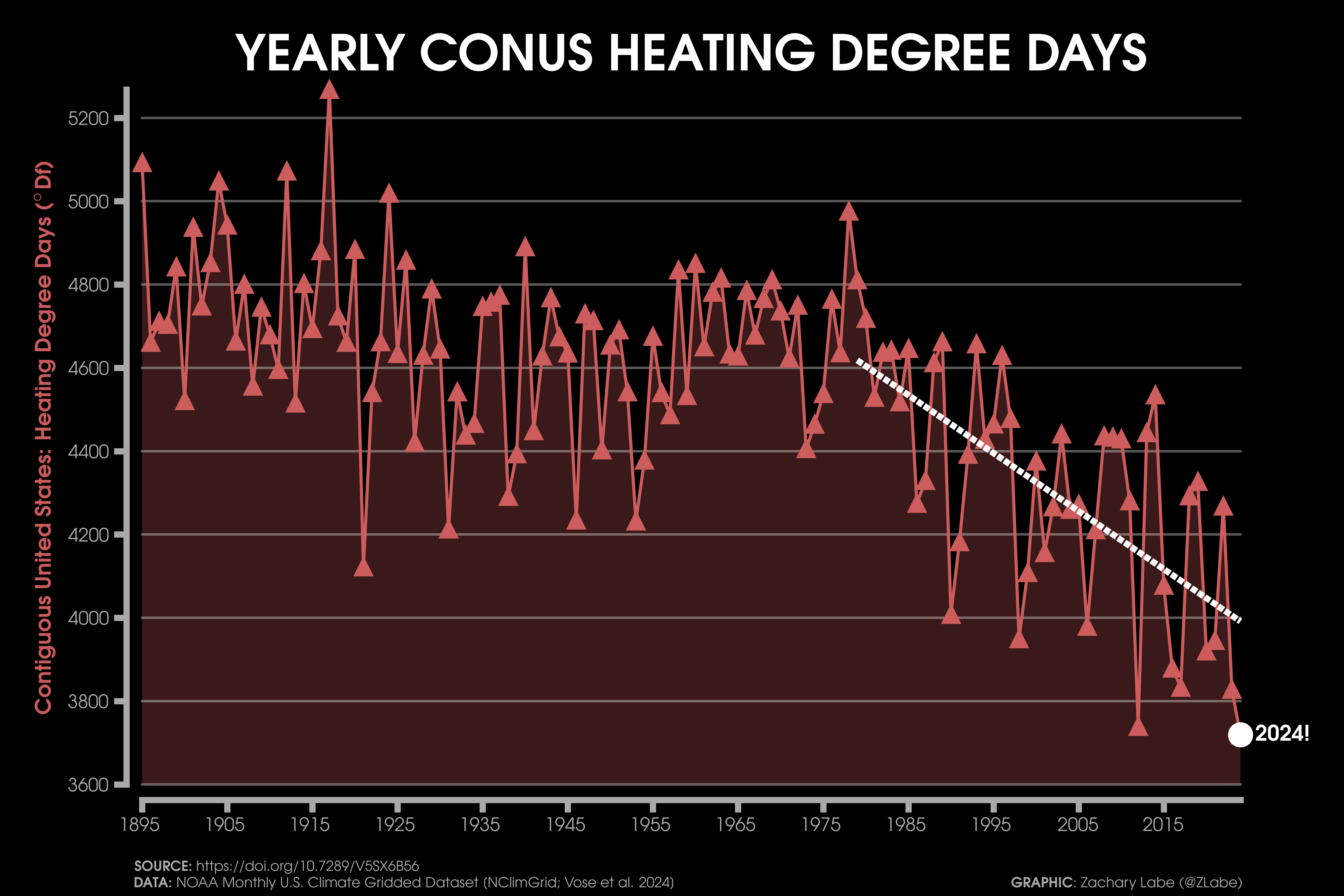 Energy SectorCooling degree days (CDD) calculated for the contiguous United States (CONUS) and averaged by each year from 1895 to 2024. 2024 was the highest on record. A CDD is a helpful metric for monitoring energy usage (e.g., air conditioning) and is calculated based on how much warmer the average temperature is relative to 65°F. A linear (least squares) trend line is also annotated over the period from 1979 to 2024. Data is provided by NOAA’s Climate at a Glance (https://www.ncei.noaa.gov/access/monitoring/climate-at-a-glance/). Graphic was updated on 7/6/2025.Heating degree days (HDD) calculated for the contiguous United States (CONUS) and averaged by each year from 1895 to 2024. 2024 was the lowest on record. A HDD is a helpful metric for monitoring energy usage (e.g., heating needs) and is calculated based on how much colder the average temperature is relative to 65°F. A linear (least squares) trend line is also annotated over the period from 1979 to 2024. Data is provided by NOAA’s Climate at a Glance (https://www.ncei.noaa.gov/access/monitoring/climate-at-a-glance/). Graphic was updated on 7/7/2025.