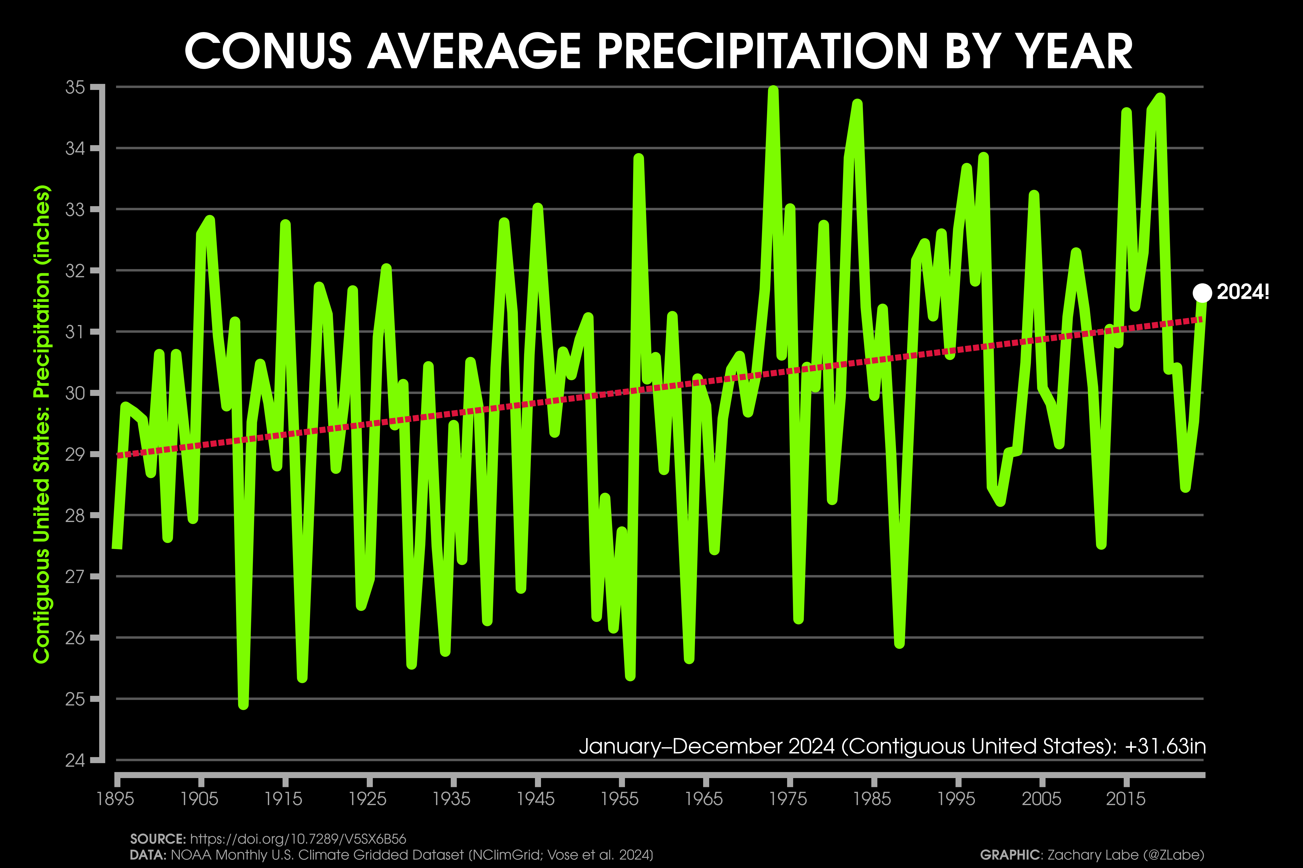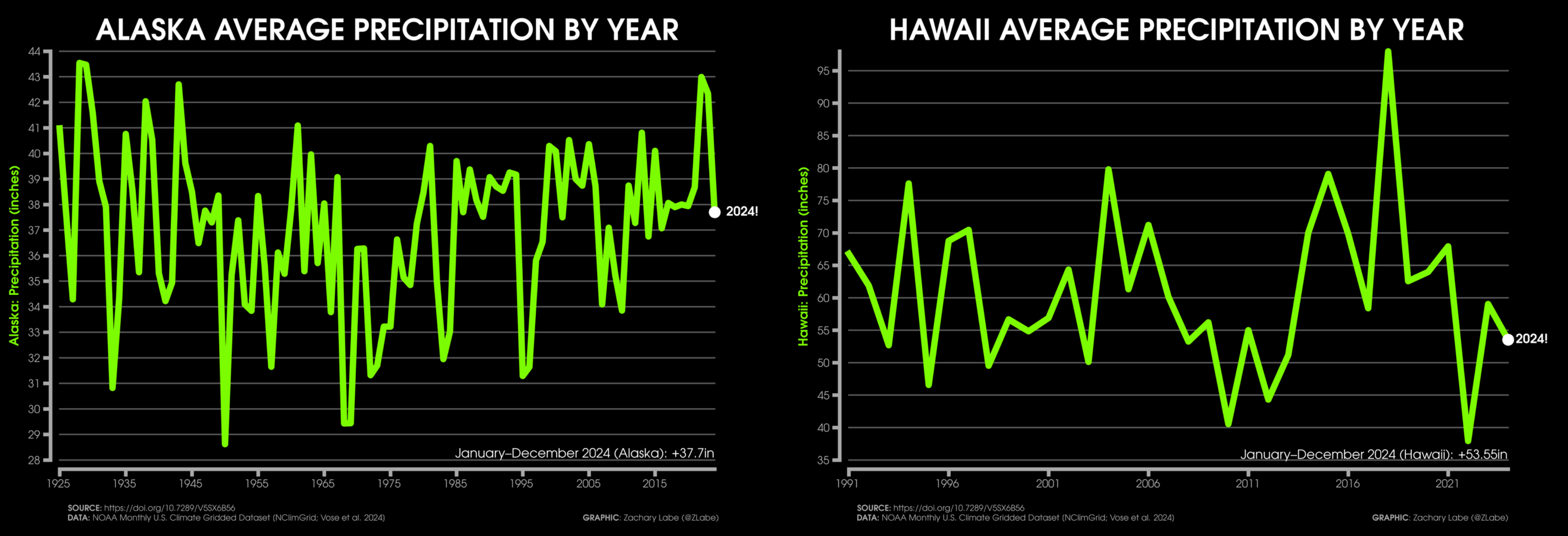 Precipitation Time SeriesGraph showing the mean precipitation (inches) across the contiguous United States (CONUS) and averaged for each year from 1895 to 2024. The actual mean CONUS precipitation average in 2024 was 31.63 inches. Data is provided by NOAA/NCEI NClimGrid (https://doi.org/10.7289/V5SX6B56). Graphic was updated on 7/6/2025.Graph showing the mean precipitation (inches) across Alaska (left) and Hawaii (right). The time series for each state is averaged for each year. Differences in the length of the record is due to data availability. Data is provided by NOAA/NCEI NClimGrid (https://doi.org/10.7289/V5SX6B56). Graphic was updated on 7/7/2025.