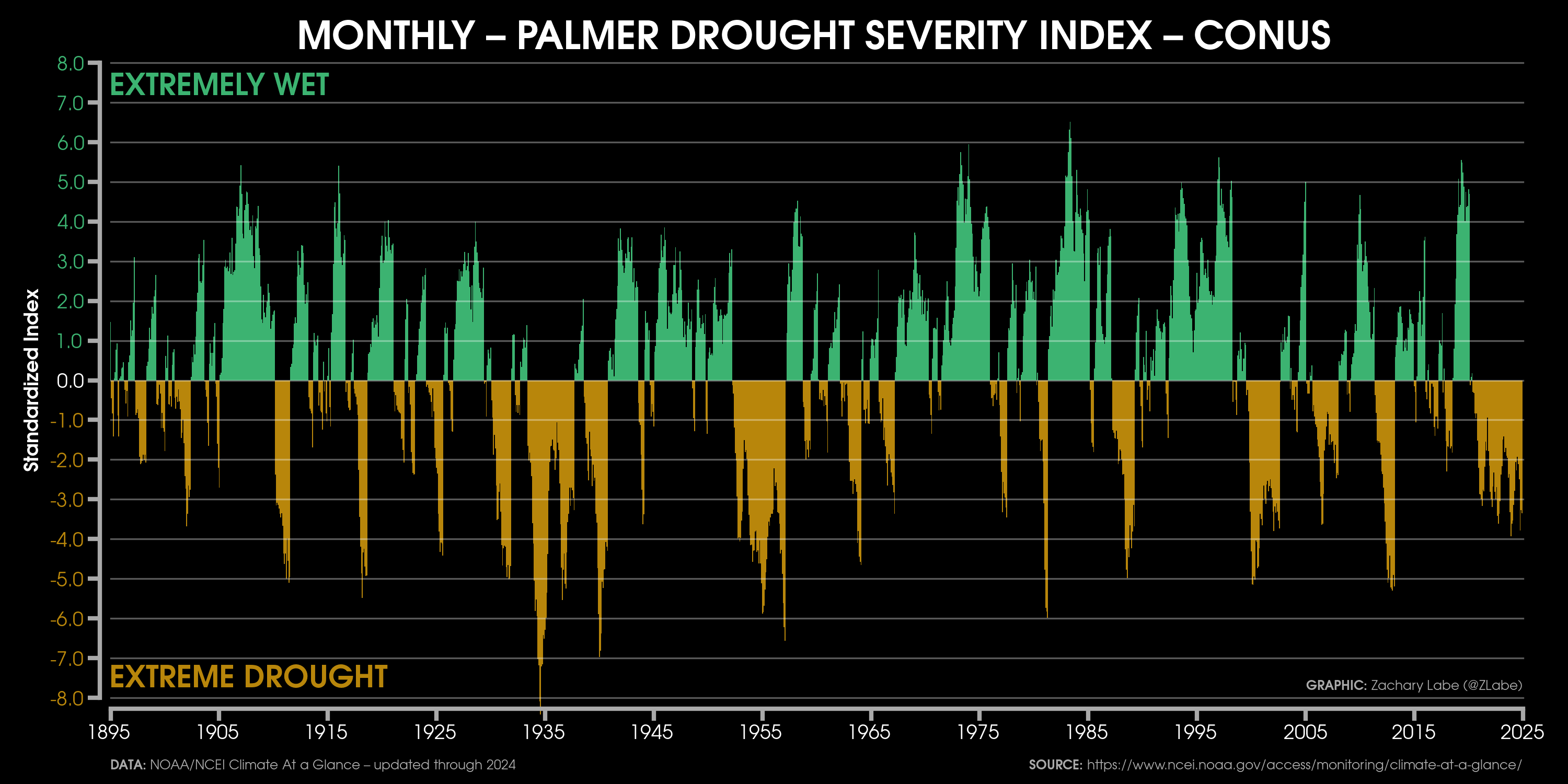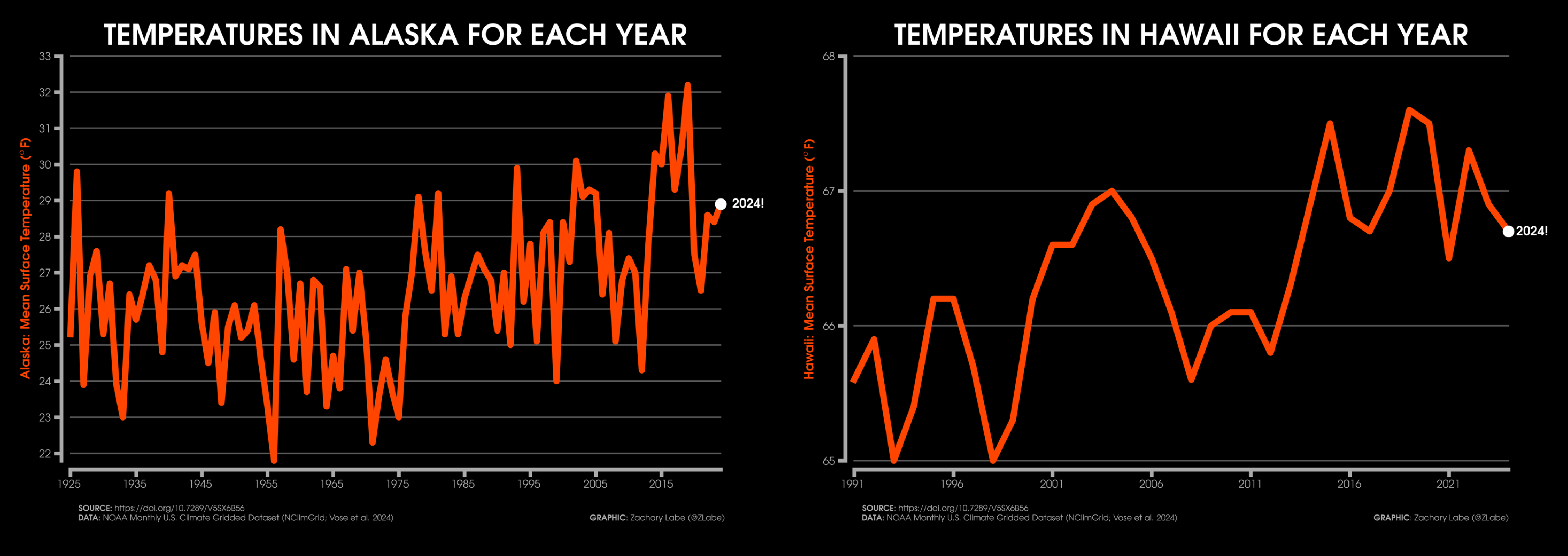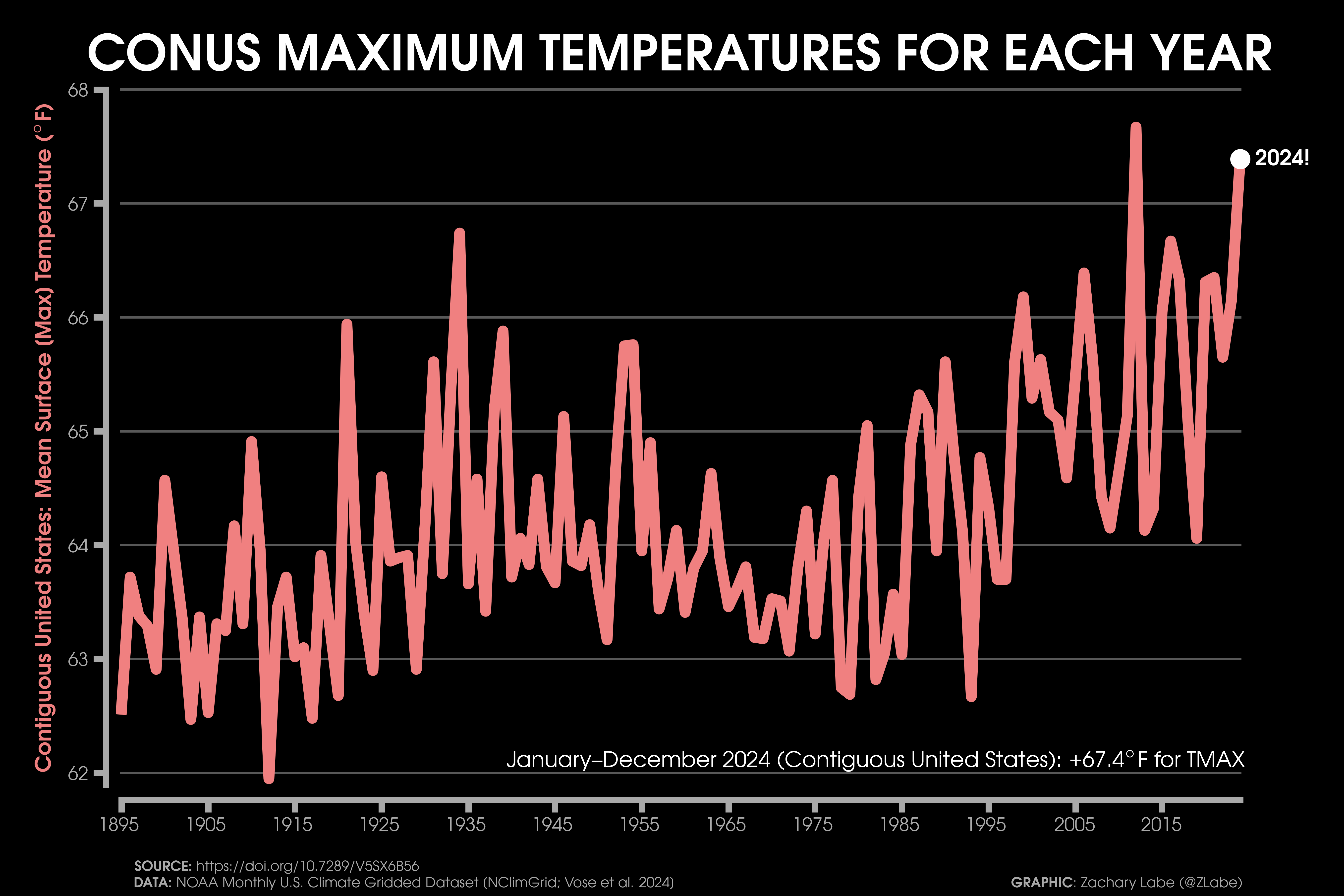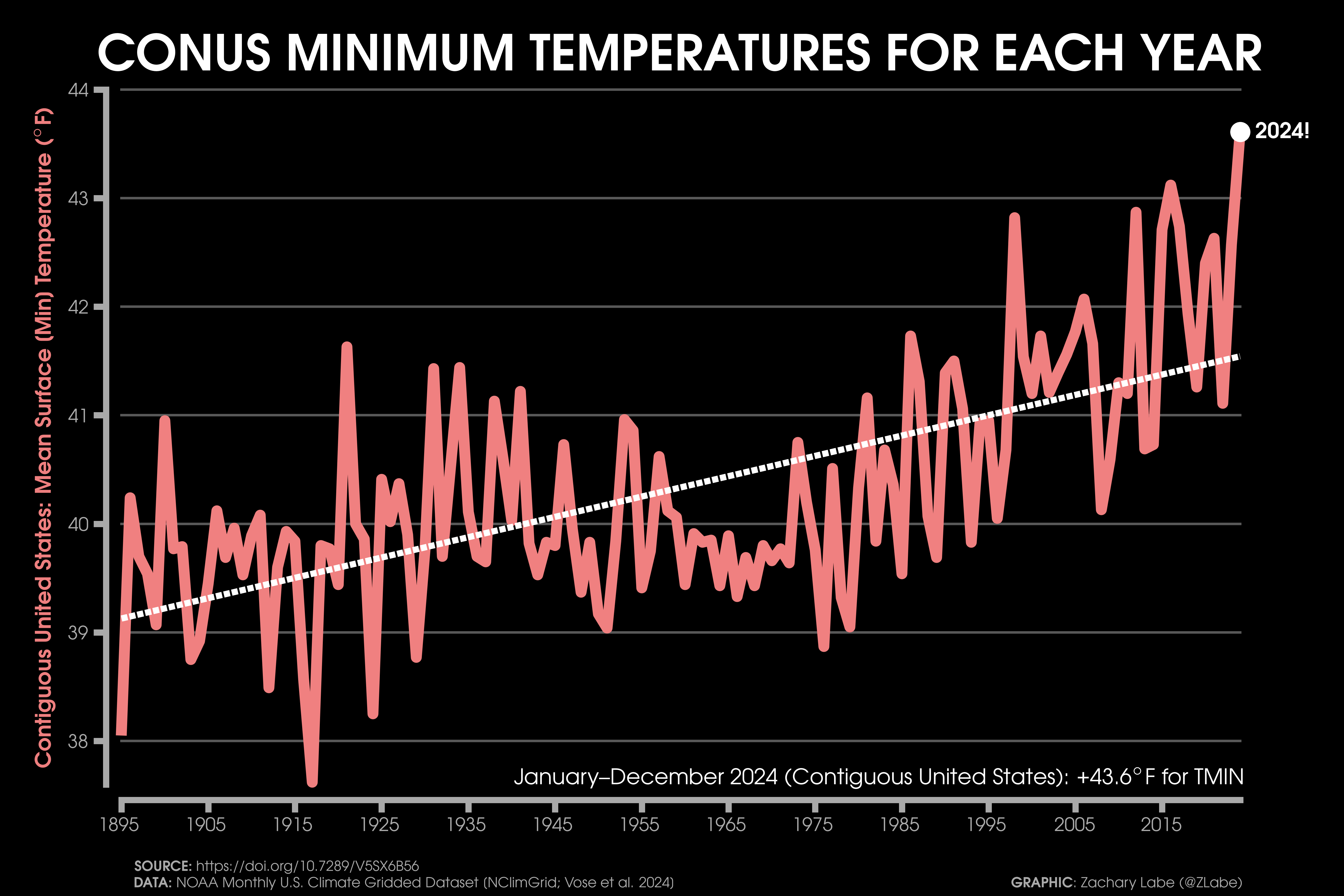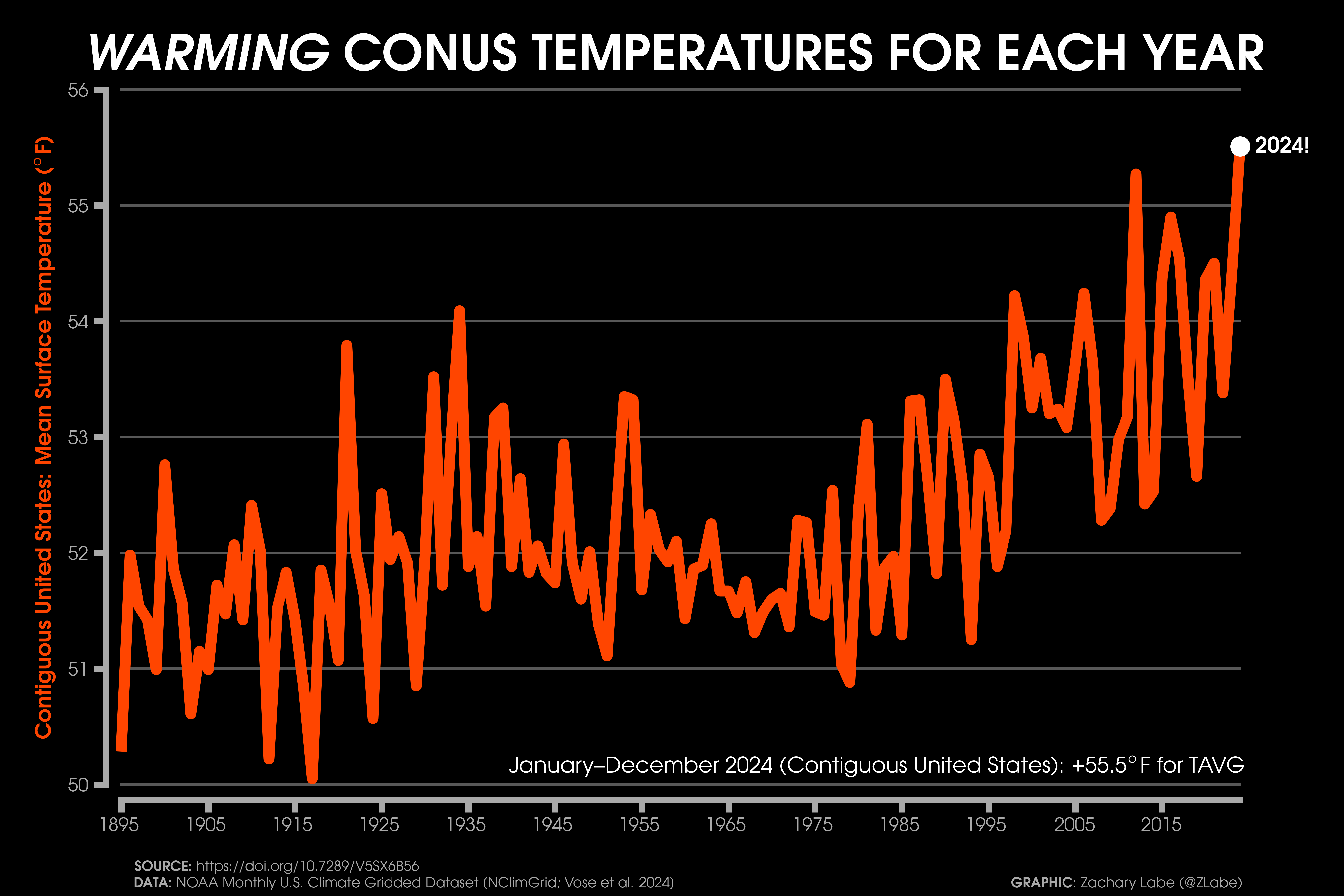 Temperature Time SeriesGraph showing the mean temperature (°F) across the contiguous United States (CONUS) and averaged for each year from 1895 to 2024. The actual mean CONUS temperature in 2024 was 55.51°F, which is the warmest year on record. Data is provided by NOAA/NCEI NClimGrid (https://doi.org/10.7289/V5SX6B56). Graphic was updated on 7/6/2025.A comparison of the seasonally-averaged maximum (left) and minimum (right) temperature anomalies (°F) for December-February (top) and June through August (bottom) across the contiguous United States (CONUS). Anomalies are calculated relative to the 1981-2010 reference period. Data is provided by NOAA/NCEI NClimGrid (https://doi.org/10.7289/V5SX6B56). Graphic was updated on 7/13/2025.Graph showing the mean temperature (°F) across Alaska (left) and Hawaii (right). The time series for each state is averaged for each year. Differences in the length of the record is due to data availability. Data is provided by NOAA/NCEI NClimGrid (https://doi.org/10.7289/V5SX6B56). Graphic was updated on 7/6/2025.Graph showing the mean maximum temperature (°F; TMAX) across the contiguous United States (CONUS) and averaged for each year from 1895 to 2024. Data is provided by NOAA/NCEI NClimGrid (https://doi.org/10.7289/V5SX6B56). Graphic was updated on 7/6/2025.Graph showing the mean minimum temperature (°F; TMIN) across the contiguous United States (CONUS) and averaged for each year from 1895 to 2024. The actual mean minimum CONUS temperature in 2024 was 43.6°F, which is the warmest year on record. The linear least squares trend line is also displayed over this period. Data is provided by NOAA/NCEI NClimGrid (https://doi.org/10.7289/V5SX6B56). Graphic was updated on 7/6/2025.