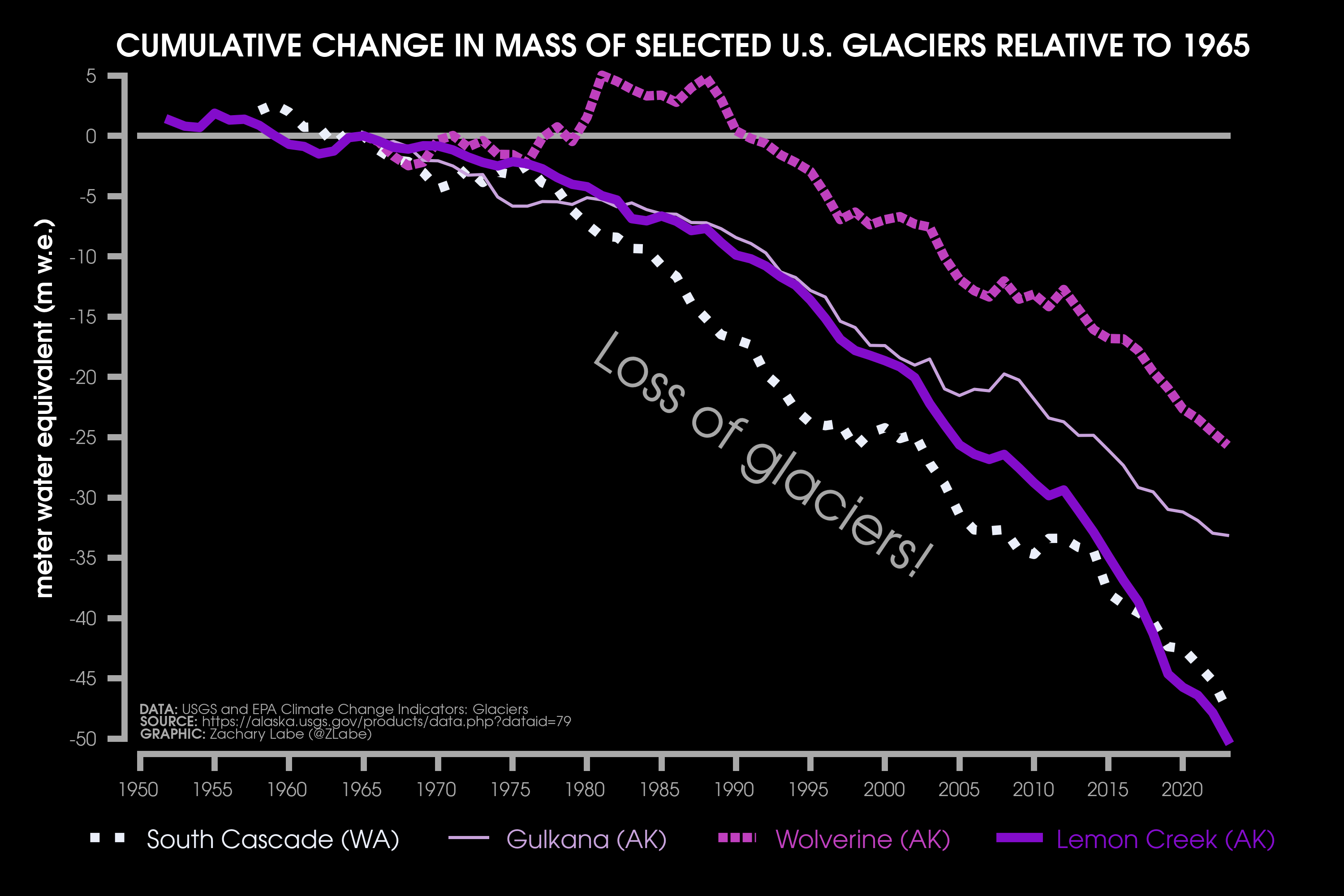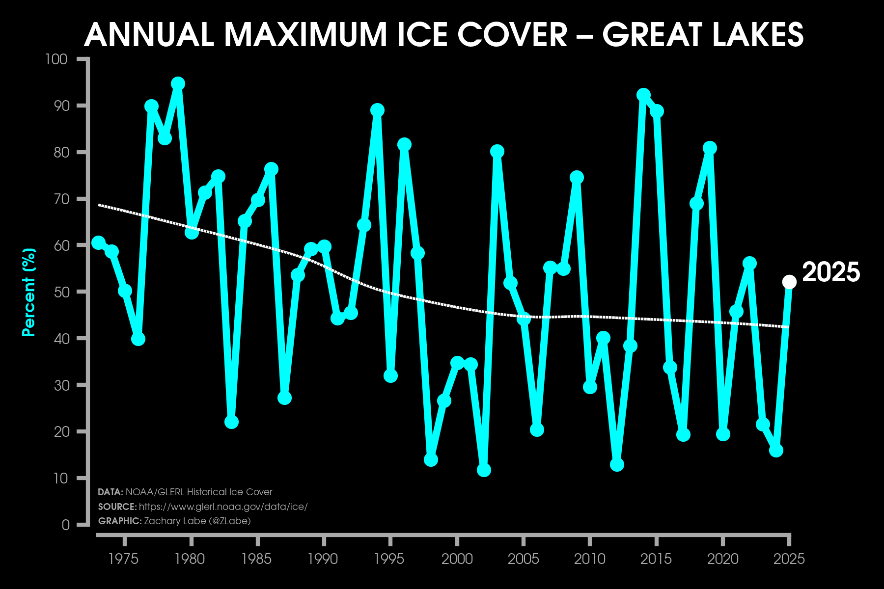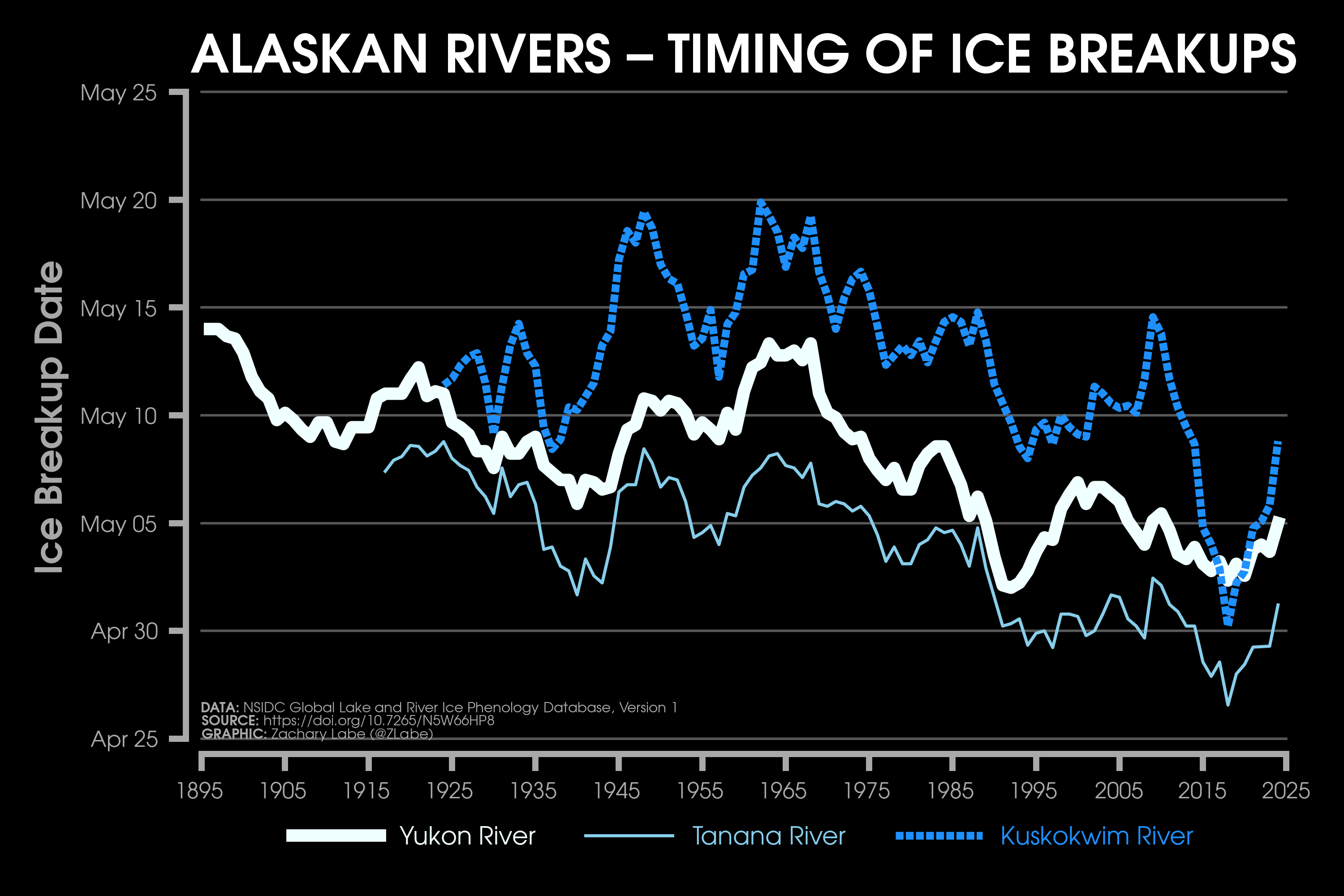 Ice Cover MetricsLine graph showing changes in the timing of the river ice breakup in Alaska for the Yukon, Tanana, and Kuskokwim Rivers from 1895 to 2024. Data and more background information is provided at https://www.epa.gov/climate-indicators/alaskan-rivers. Graphic updated on 8/10/2025.Line graph showing the net loss of ice mass for four different reference glaciers in the United States since the 1950s/1960s (states of Alaska and Washington). The change in mass in standardized in units of meters of water equivalent relative to the year 1965. Data and more background information is provided at https://www.epa.gov/climate-indicators/climate-change-indicators-glaciers.Line graph showing the annual percent of maximum ice cover across the Great Lakes from 1973 through 2025. Data is provided by the NOAA Great Lakes Environmental Research Laboratory (GLERL; https://www.glerl.noaa.gov/data/ice/#historical). A lowess smoothing fit is also shown for this time series (thin dashed white line) .Graphic was updated on 7/8/2025.Line graph showing annual mean Arctic sea-ice extent in the Beaufort Sea during the satellite era (1979-2024). Plot updated 7/9/2025 using NSIDC Sea Ice Index v3 (DMSP SSM/I-SSMIS).Line graph showing annual mean Arctic sea-ice extent in the Bering Sea during the satellite era (1979-2024). Plot updated 7/9/2025 using NSIDC Sea Ice Index v3 (DMSP SSM/I-SSMIS).Line graph showing annual mean Arctic sea-ice extent in the Chukchi Sea during the satellite era (1979-2024). Plot updated 7/9/2025 using NSIDC Sea Ice Index v3 (DMSP SSM/I-SSMIS).