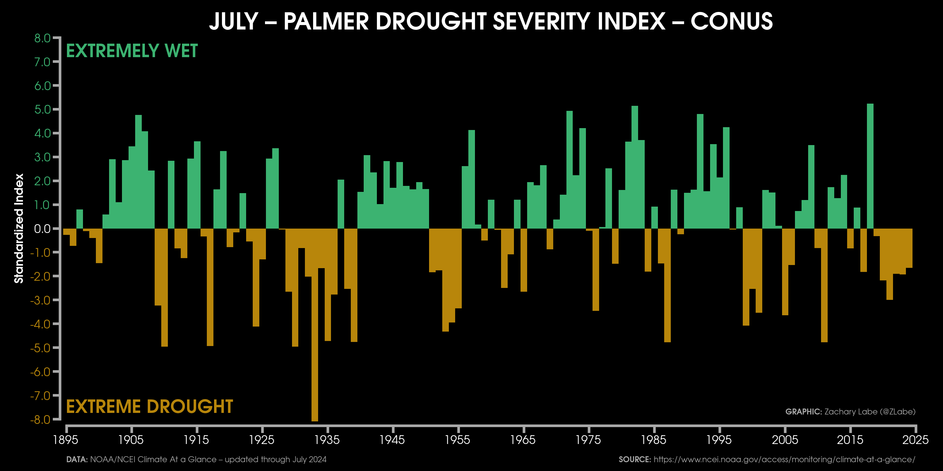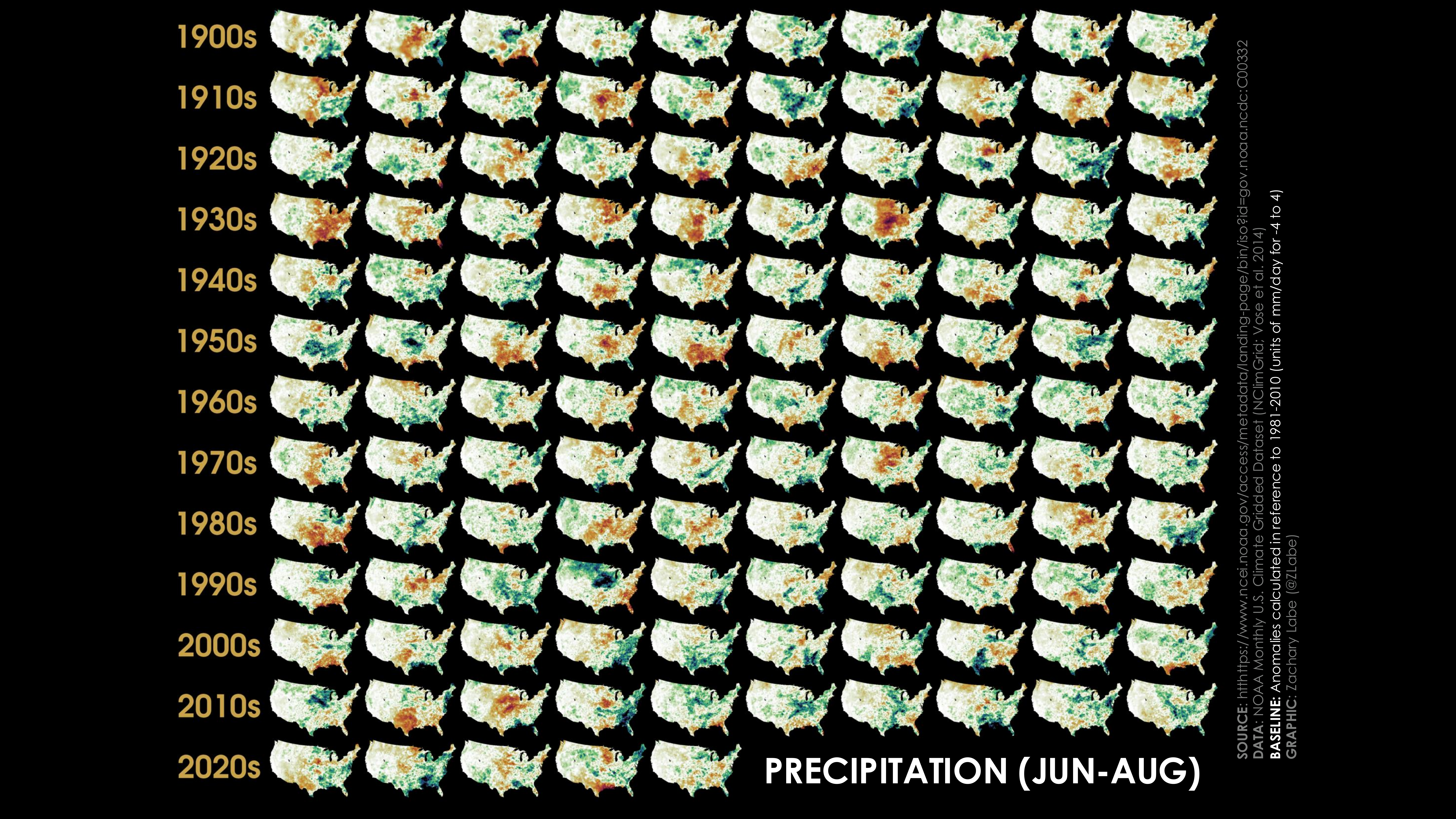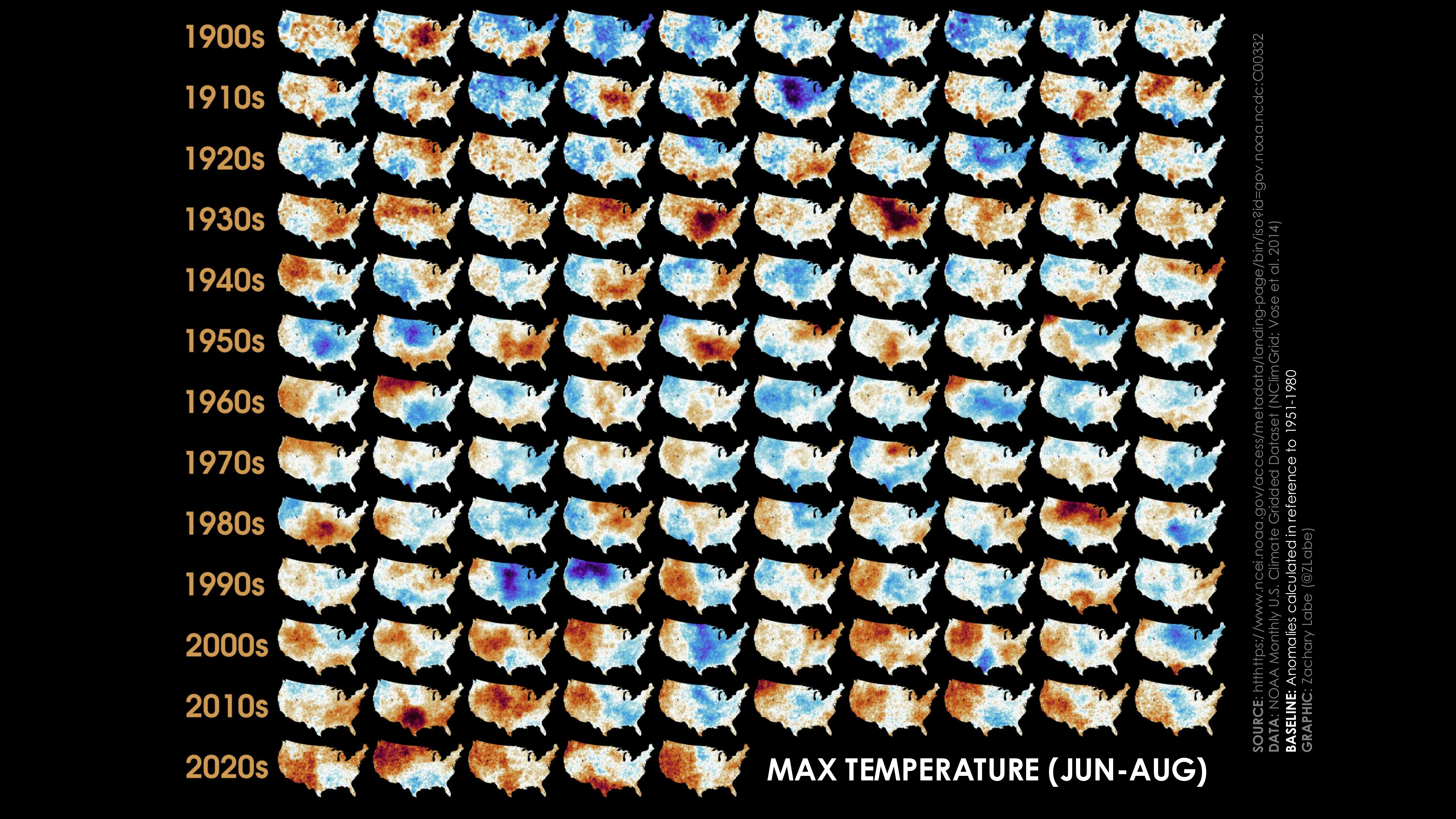 Storyline Figures: Climate Variability and ChangeCollection of maps showing average annual mean surface air temperature anomalies from 1900 to 2024. Anomalies are calculated in reference to a 1951 to 1980 climatological baseline. The temperature maps are organized by decade for each row and scaled between -5°C (purple shading) and +5°C (red shading). Data is from NClimGrid v1 (https://www.ncei.noaa.gov/access/metadata/landing-page/bin/iso?id=gov.noaa.ncdc:C00332). Created on 5 July 2025.Collection of maps showing average June-July-August maximum surface air temperature anomalies from 1900 to 2024. Anomalies are calculated in reference to a 1951 to 1980 climatological baseline. The temperature maps are organized by decade for each row and scaled between -5°C (purple shading) and +5°C (red shading). Data is from NClimGrid v1 (https://www.ncei.noaa.gov/access/metadata/landing-page/bin/iso?id=gov.noaa.ncdc:C00332). Created on 5 July 2025.Collection of maps showing average June-July-August precipitation rate anomalies from 1900 to 2024. Anomalies are calculated in reference to a 1981 to 2010 climatological baseline. The precipitation maps are organized by decade for each row and scaled between -4 mm/day (brown shading) and +4 mm/day (green shading). Data is from NClimGrid v1 (https://www.ncei.noaa.gov/access/metadata/landing-page/bin/iso?id=gov.noaa.ncdc:C00332). Created on 6 July 2025.