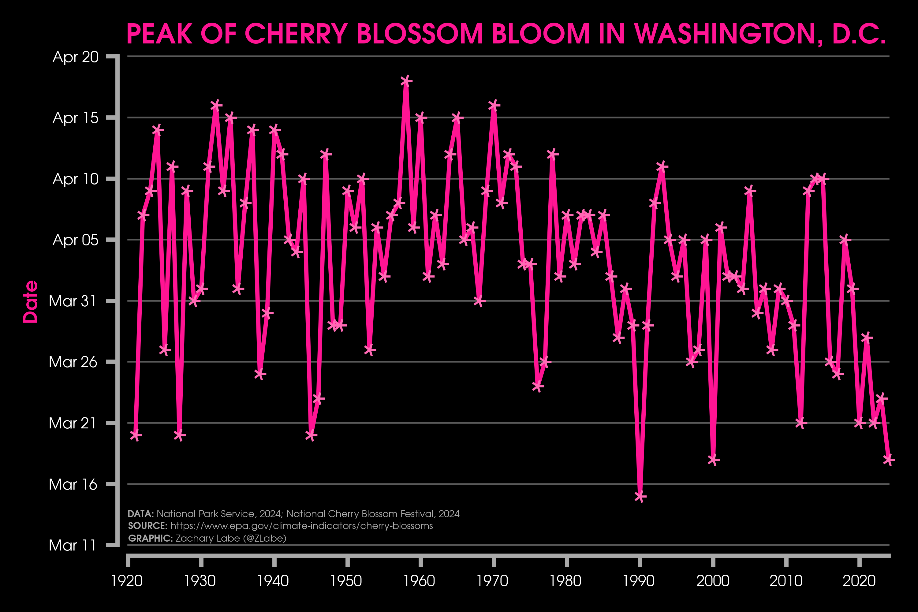 Ecological MetricsLine graph showing the timing of the peak bloom date of the cherry trees around Washington’s Tidal Basin (Yoshino variety, associated with the National Cherry Blossom Festival). Data from 1921 to 2024 provided by the National Park Service, and more background information is available at https://www.epa.gov/climate-indicators/cherry-blossoms. Graphic updated on 8/10/2025.