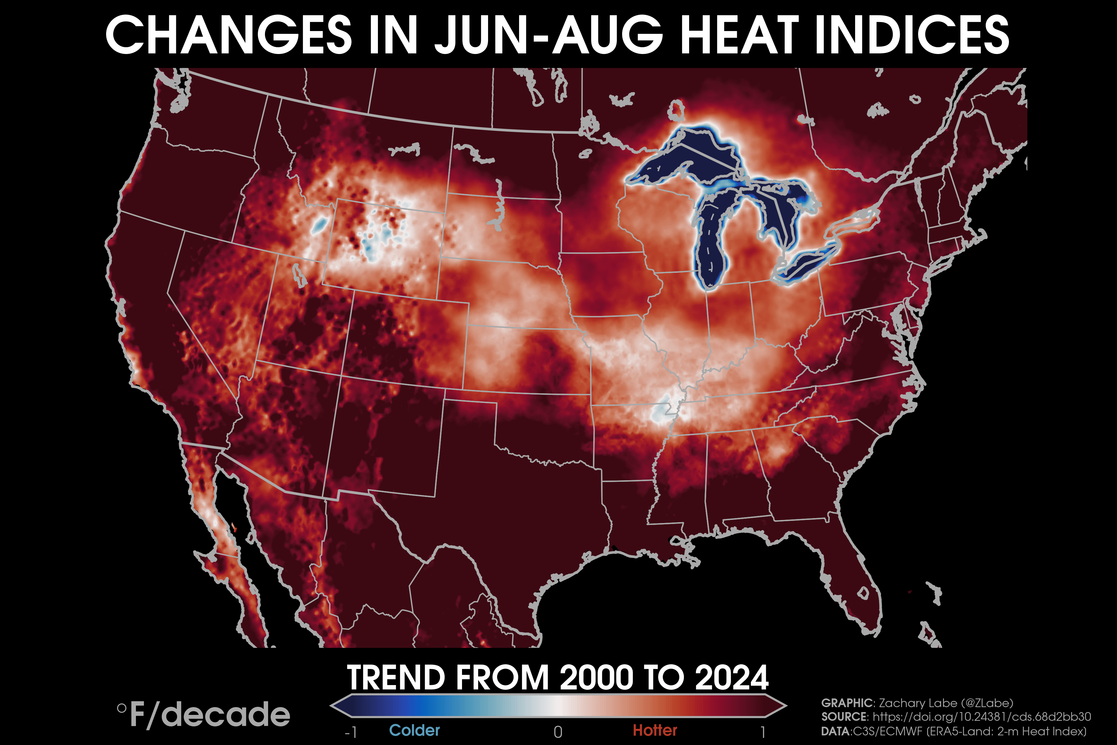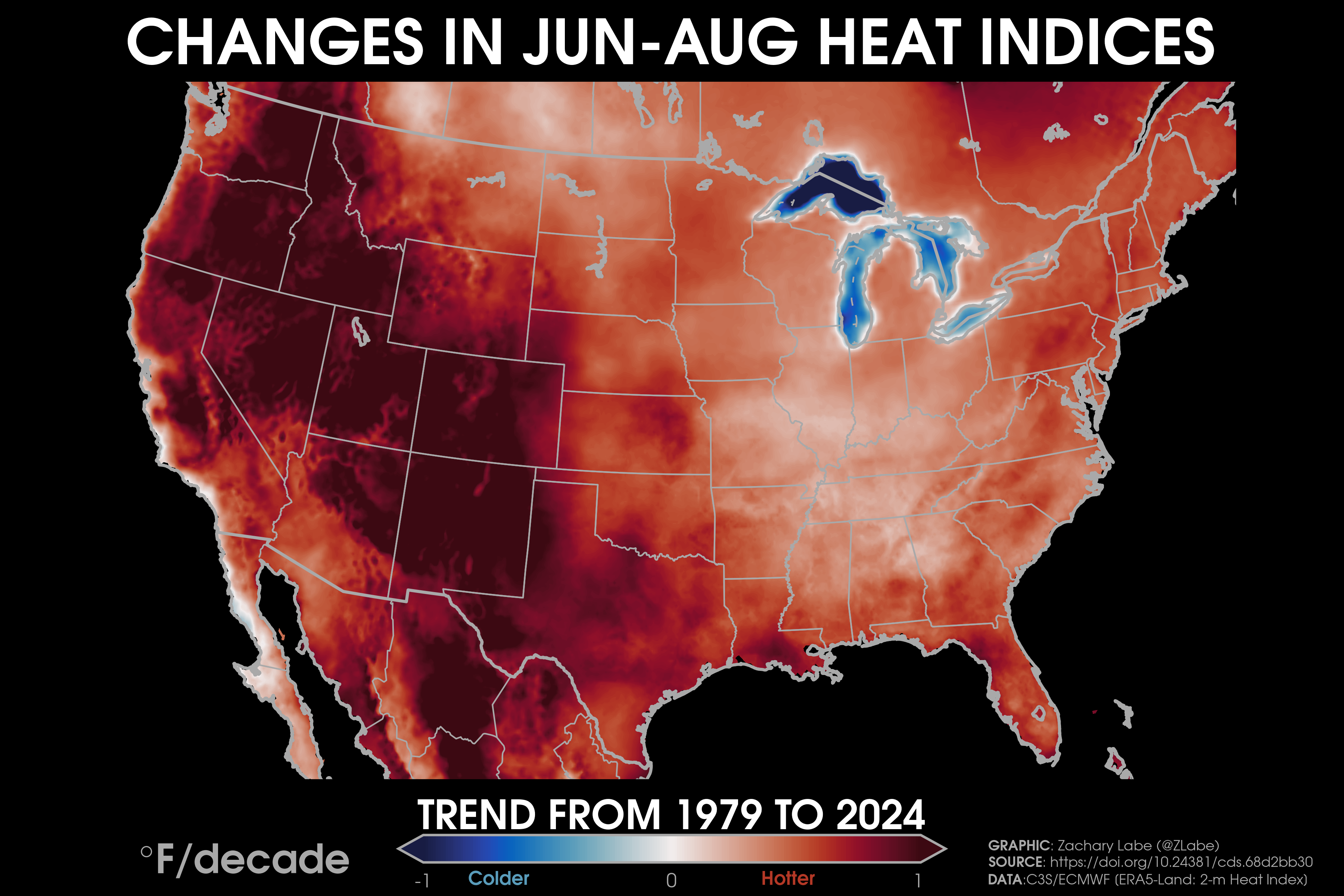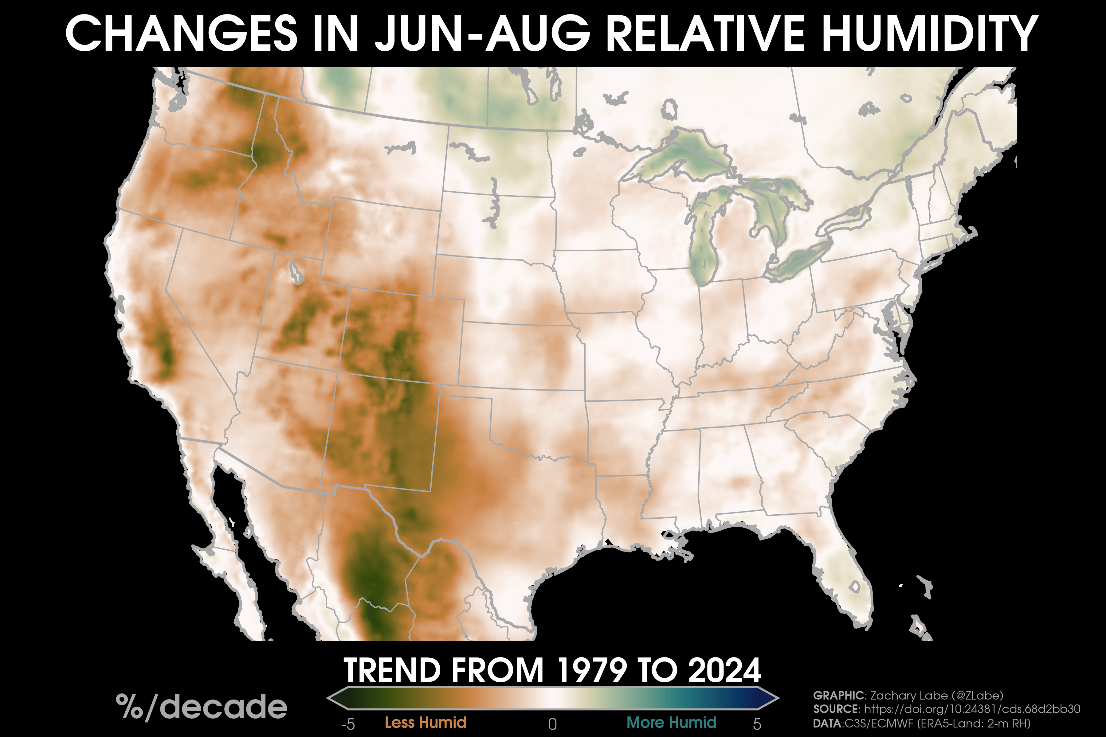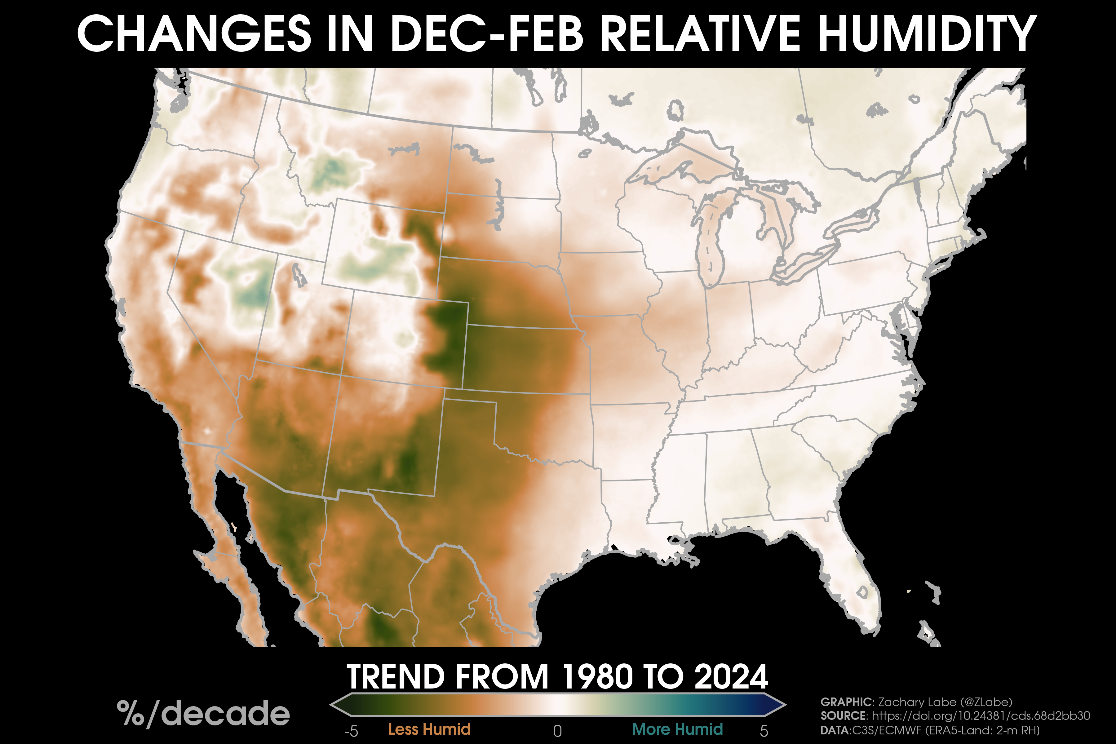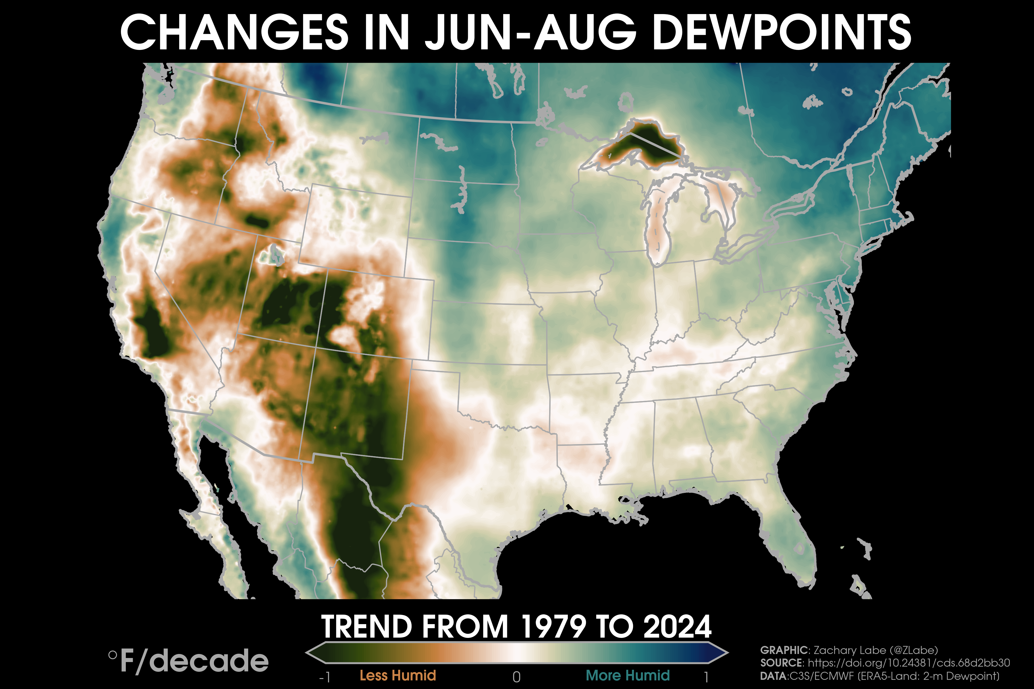Humidity TrendsTrends (°F per decade) in near-surface dewpoints over land areas from 1979 to 2024 during June-July-August (JJA). Data is provided by ECMWF ERA5-Land Reanalysis (https://doi.org/10.24381/cds.68d2bb30). Graphic was updated on 8/16/2025.Trends (°F per decade) in near-surface monthly-averaged heat indices over land areas from 2000 to 2024 during June-July-August (JJA). Data is derived from ECMWF ERA5-Land Reanalysis (https://doi.org/10.24381/cds.68d2bb30) using the NOAA/NWS formula (https://www.wpc.ncep.noaa.gov/html/heatindex_equation.shtml). Graphic was updated on 8/17/2025.Trends (°F per decade) in near-surface monthly-averaged heat indices over land areas from 1979 to 2024 during June-July-August (JJA). Data is derived from ECMWF ERA5-Land Reanalysis (https://doi.org/10.24381/cds.68d2bb30) using the NOAA/NWS formula (https://www.wpc.ncep.noaa.gov/html/heatindex_equation.shtml). Graphic was updated on 8/17/2025.Trends (°F per decade) in near-surface monthly-averaged heat indices over land areas from 1950 to 2024 during June-July-August (JJA). Data is derived from ECMWF ERA5-Land Reanalysis (https://doi.org/10.24381/cds.68d2bb30) using the NOAA/NWS formula (https://www.wpc.ncep.noaa.gov/html/heatindex_equation.shtml). Graphic was updated on 8/17/2025.Trends (°F per decade) in near-surface relative humidity over land areas from 1979 to 2024 during June-July-August (JJA). Data derived from ECMWF ERA5-Land Reanalysis (https://doi.org/10.24381/cds.68d2bb30). Graphic was updated on 8/17/2025.Trends (°F per decade) in near-surface dewpoints over land areas from 1979 to 2024 during December-January-February (DJF). Data is provided by ECMWF ERA5-Land Reanalysis (https://doi.org/10.24381/cds.68d2bb30). Graphic was updated on 8/16/2025.Trends (°F per decade) in near-surface relative humidity over land areas from 1979 to 2024 during December-January-February (DJF). Data derived from ECMWF ERA5-Land Reanalysis (https://doi.org/10.24381/cds.68d2bb30). Graphic was updated on 8/17/2025.